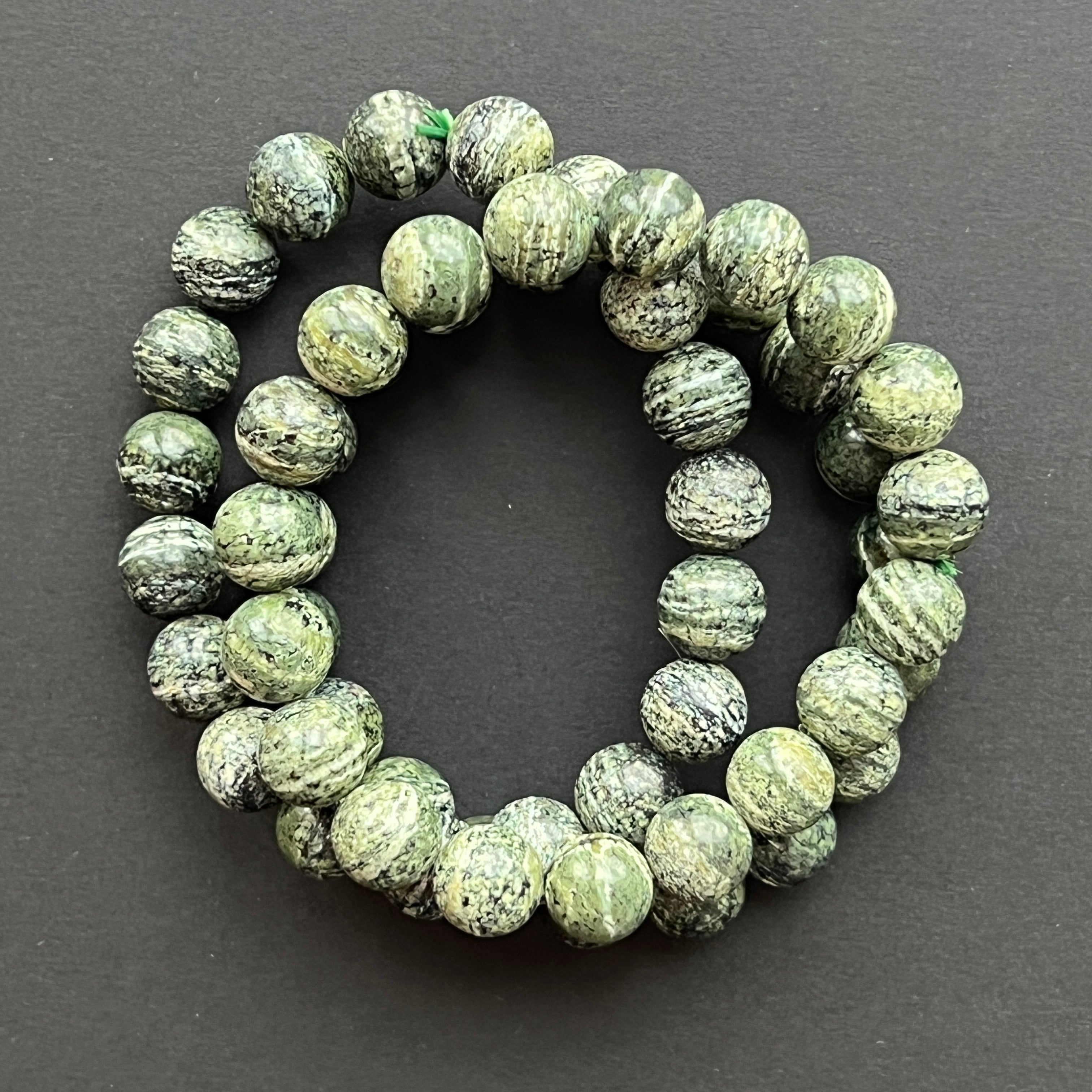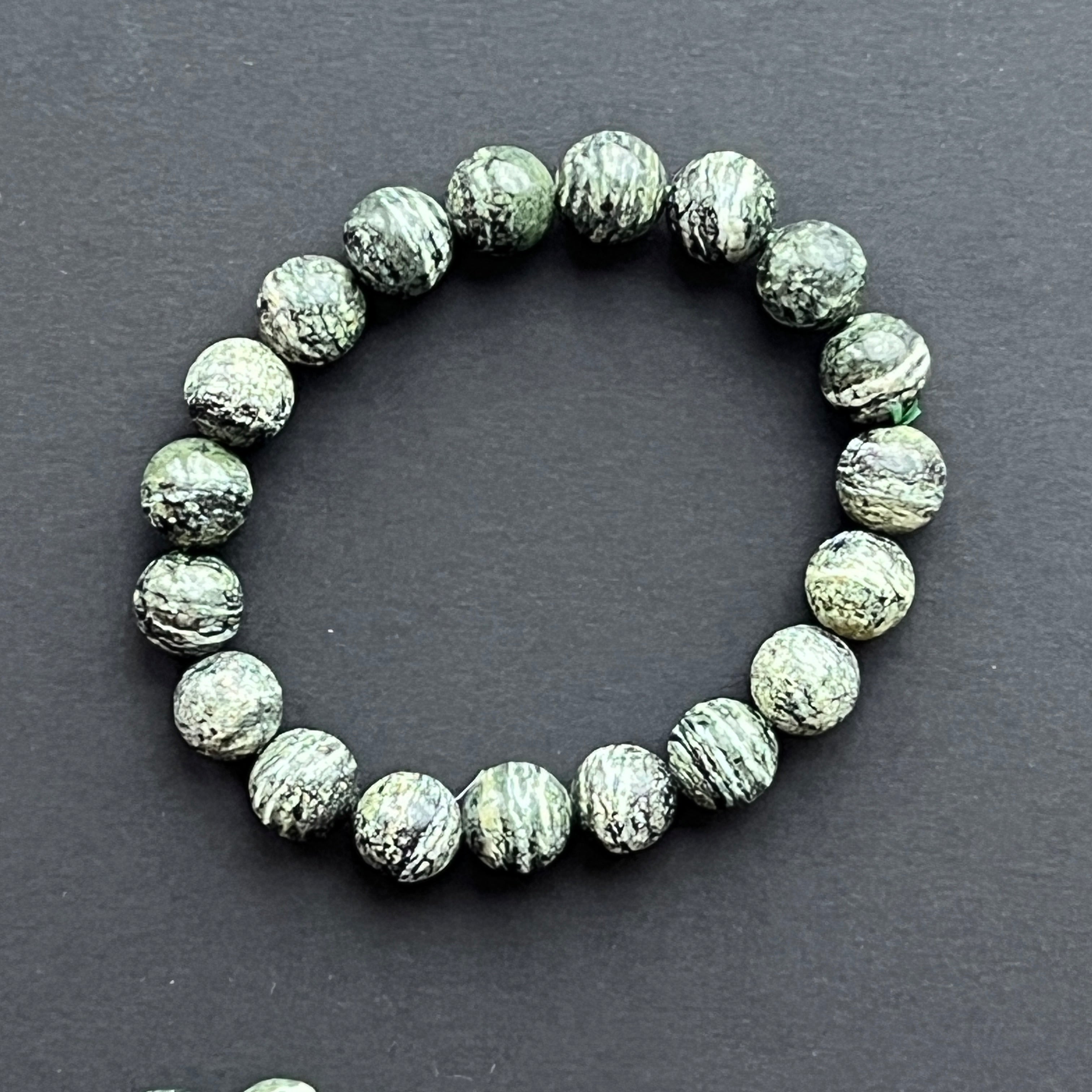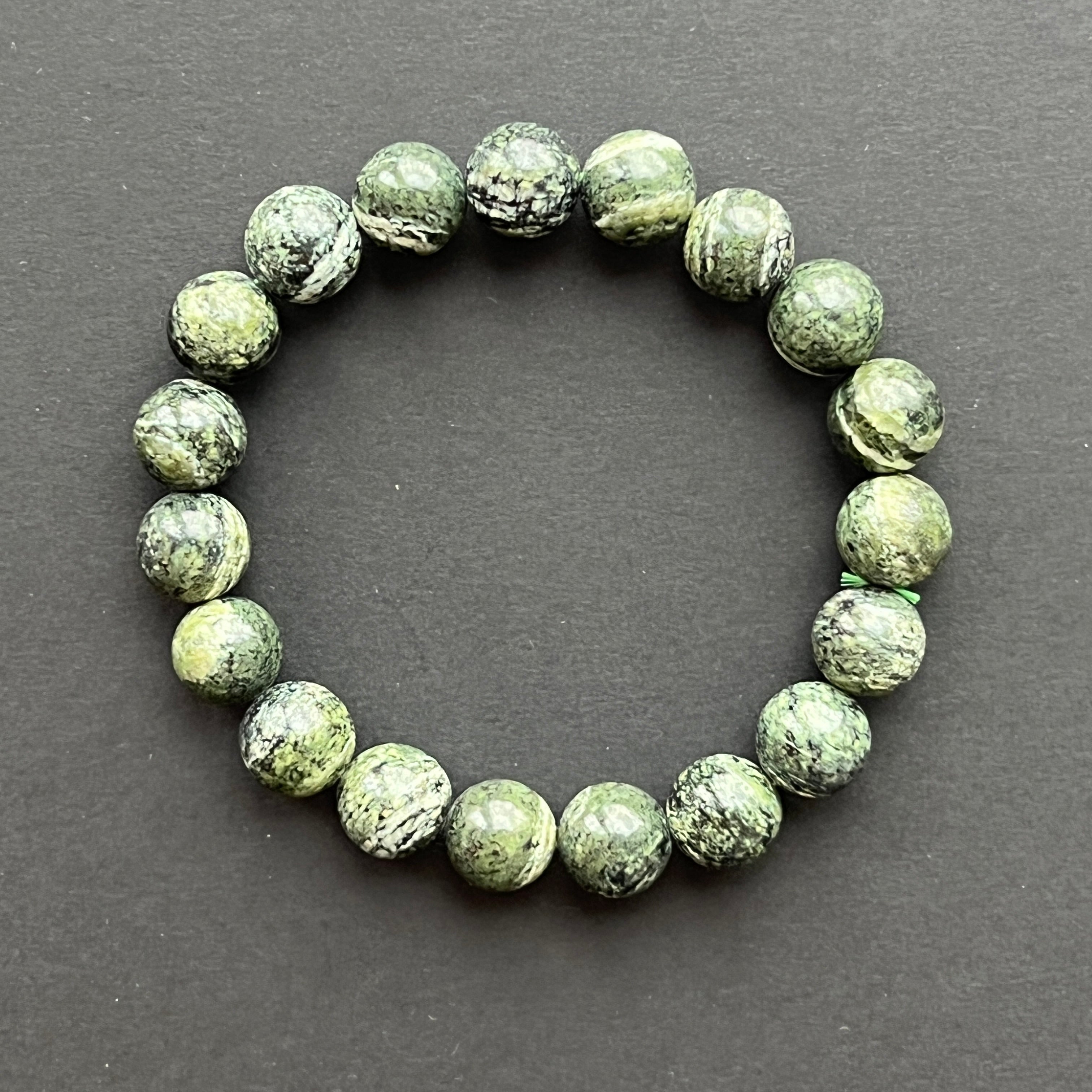 Ez a 10 mm-es gömbökkel készült szerpentin karkötő a zöld természetes árnyalatainak szépségét mutatja be, a halvány zöldtől az intenzív olívazöldig. Az organikus textúrák és a jellegzetes zárványok minden karkötőt egyedivé tesznek.