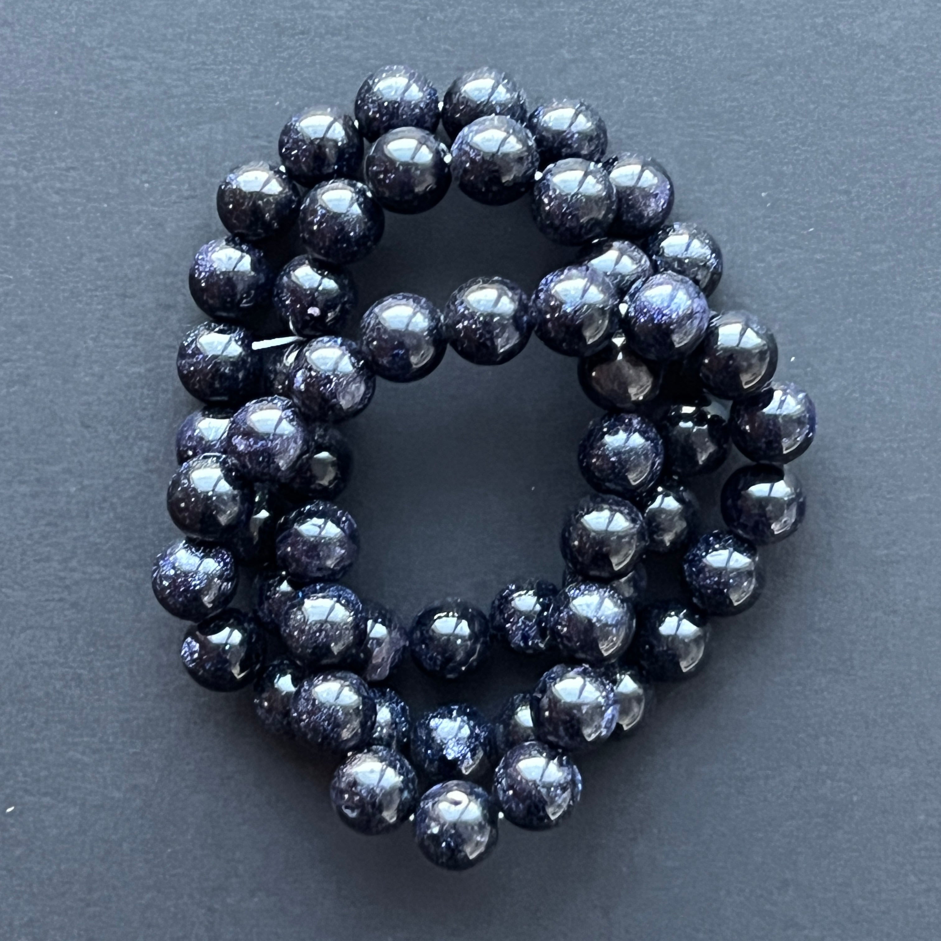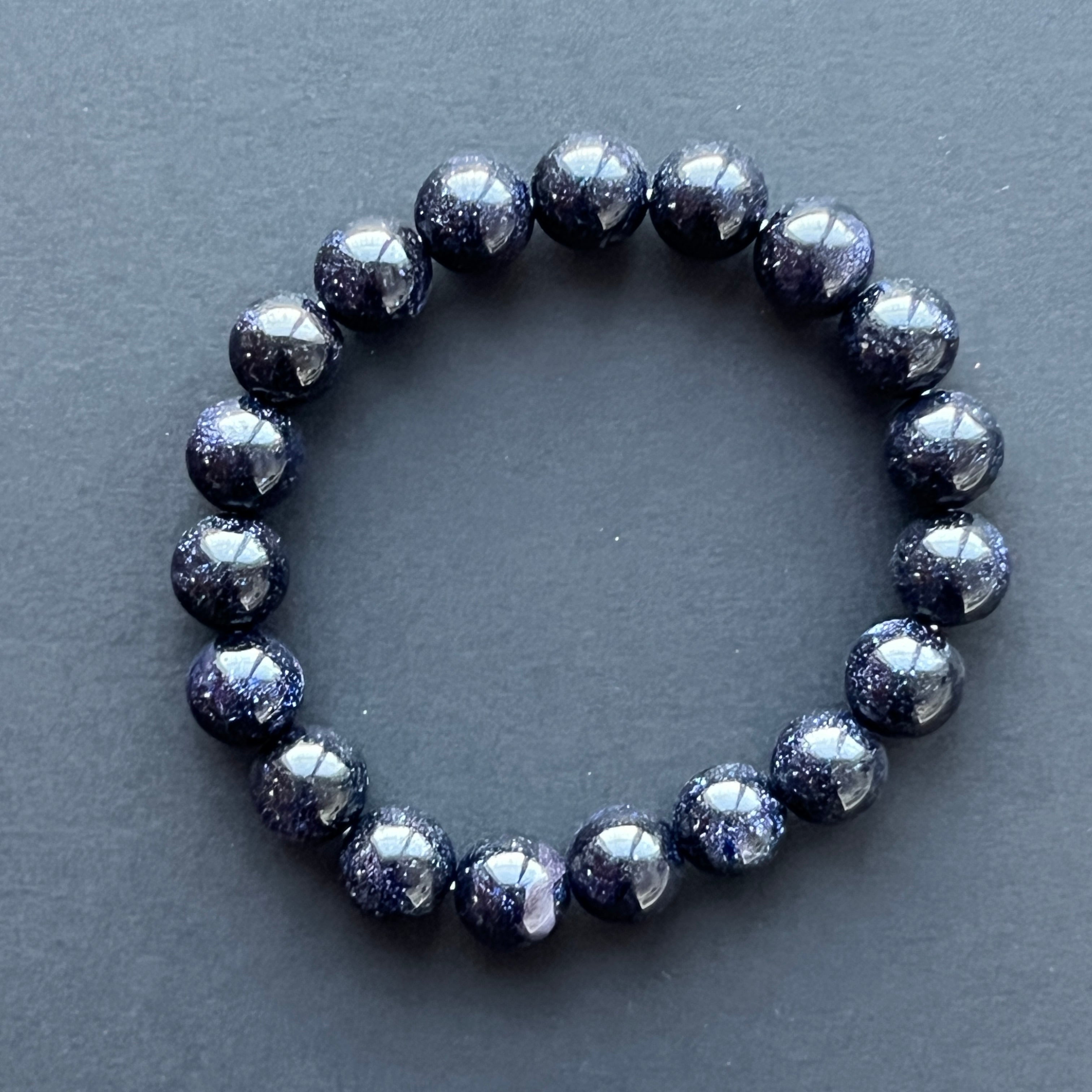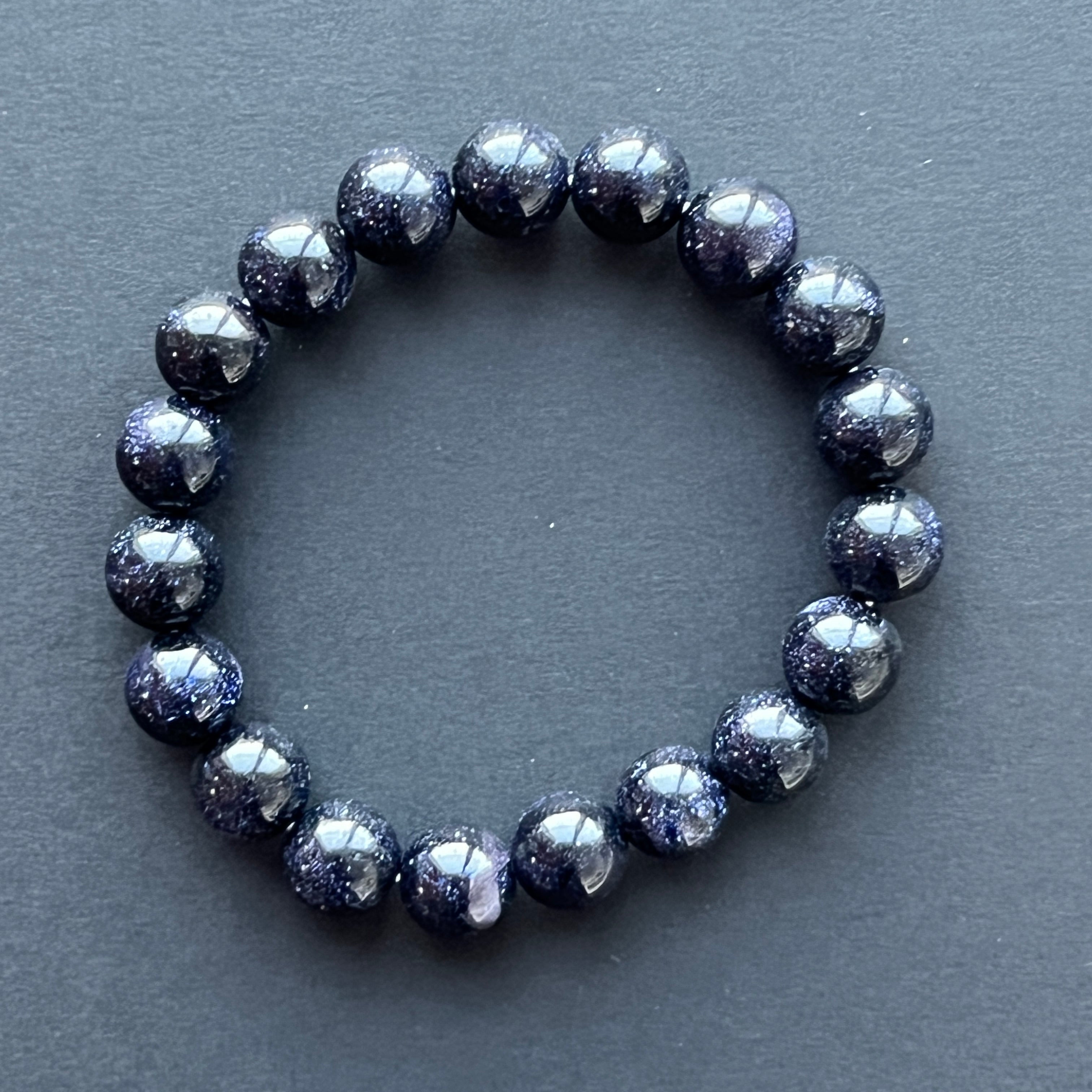 Ez a kék homok köves karkötő, 10 mm-es gömb alakú gyöngyökből áll, különleges szépségével bűvöl el. Az intenzív kék árnyalatok, milliónyi csillogó részecskék között, a varázslatos csillagos égi illúzióját keltik.