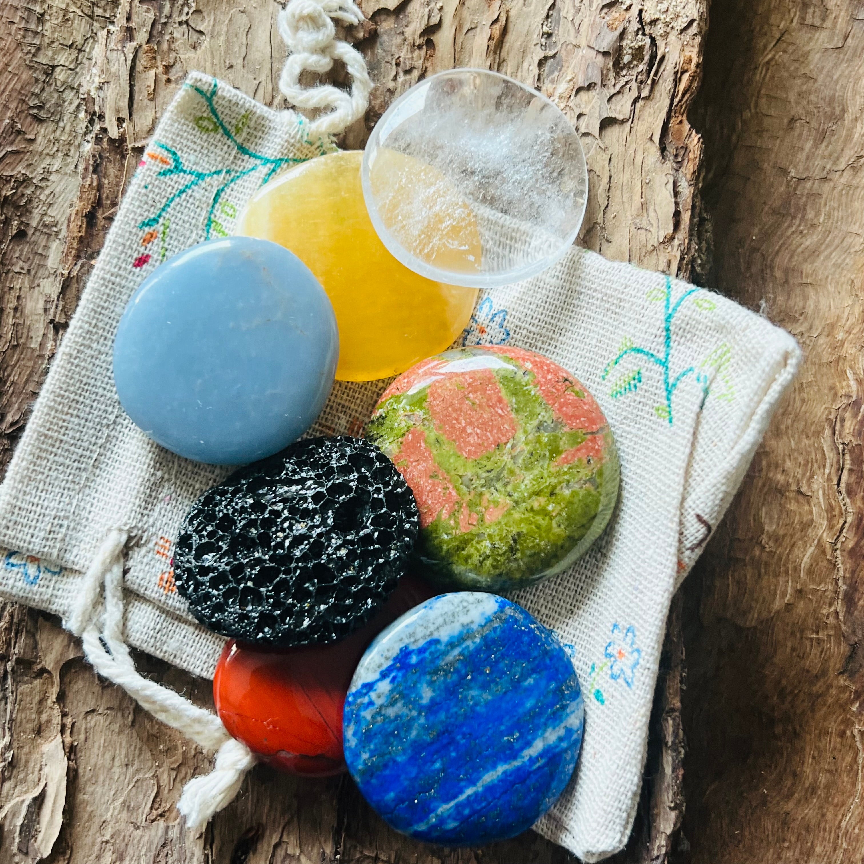 Descriere - 7 csakra kézkő meditációs kövek készlet m1