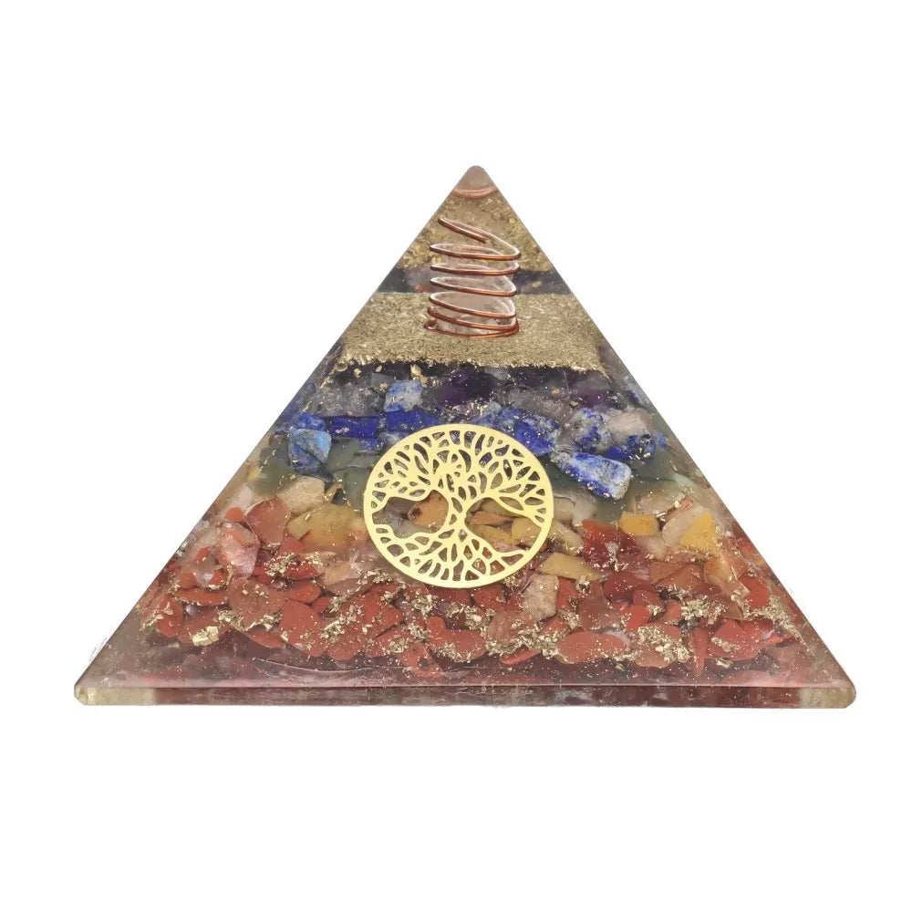 A gyantában található 7 csakrából álló piramis, az Életfa szent szimbólumával, a test energiaközpontjaihoz kapcsolódó hét féldrágakő harmóniáját egyesíti.