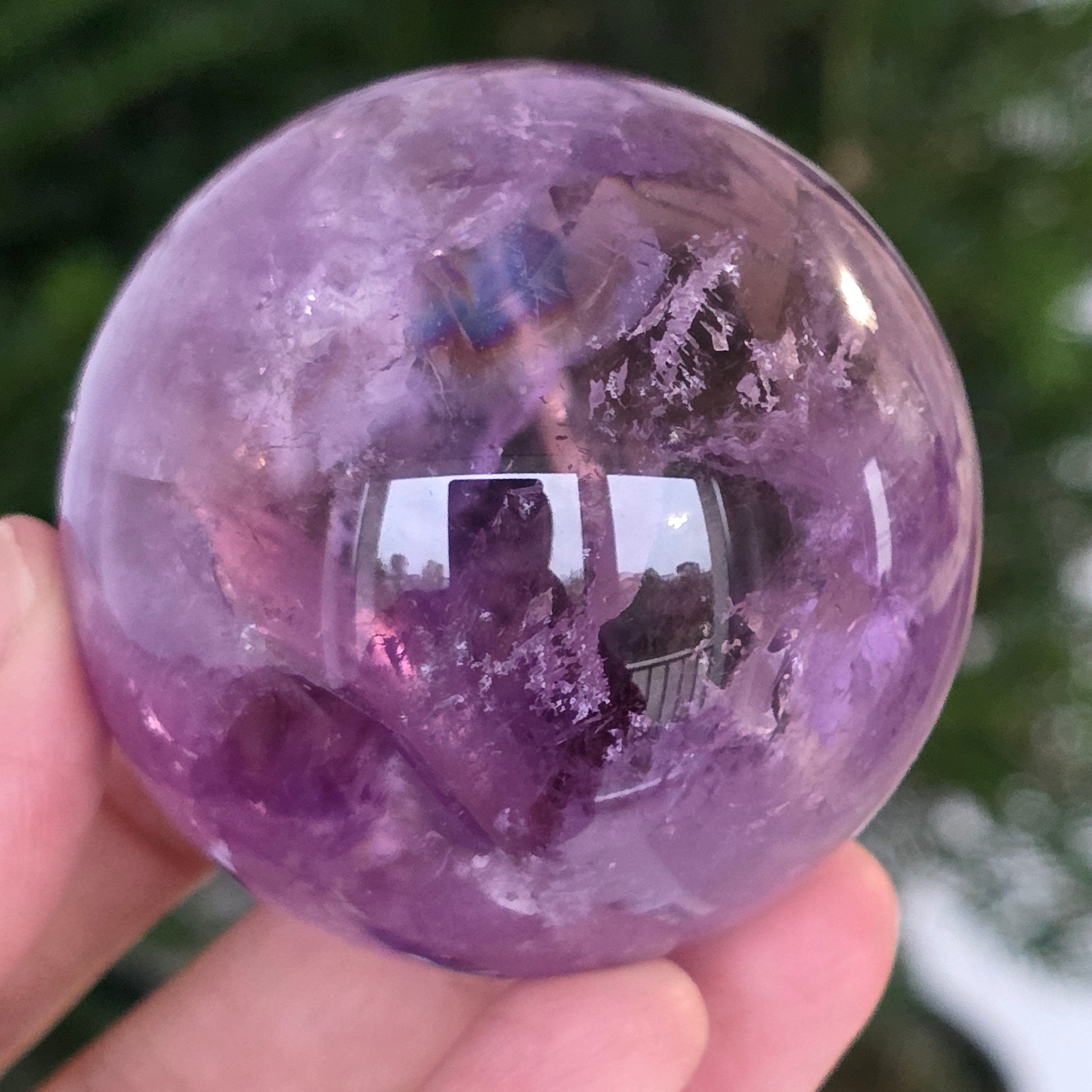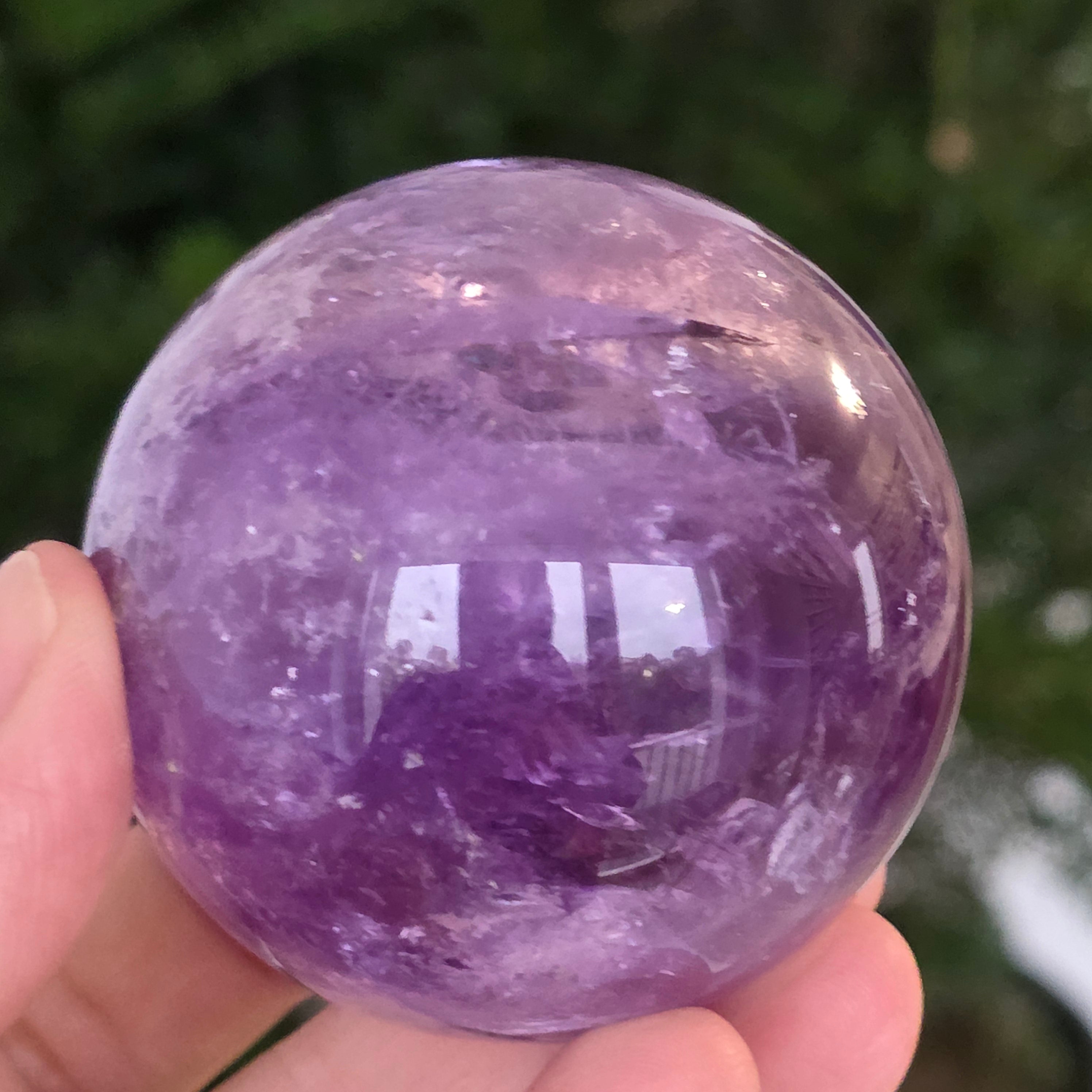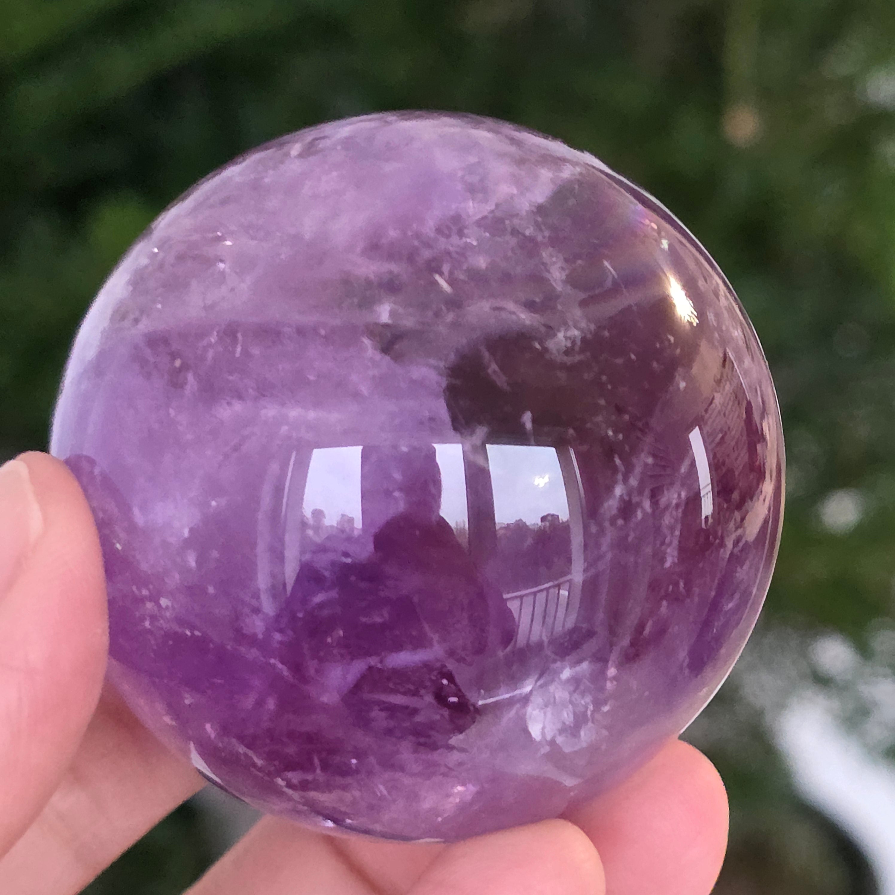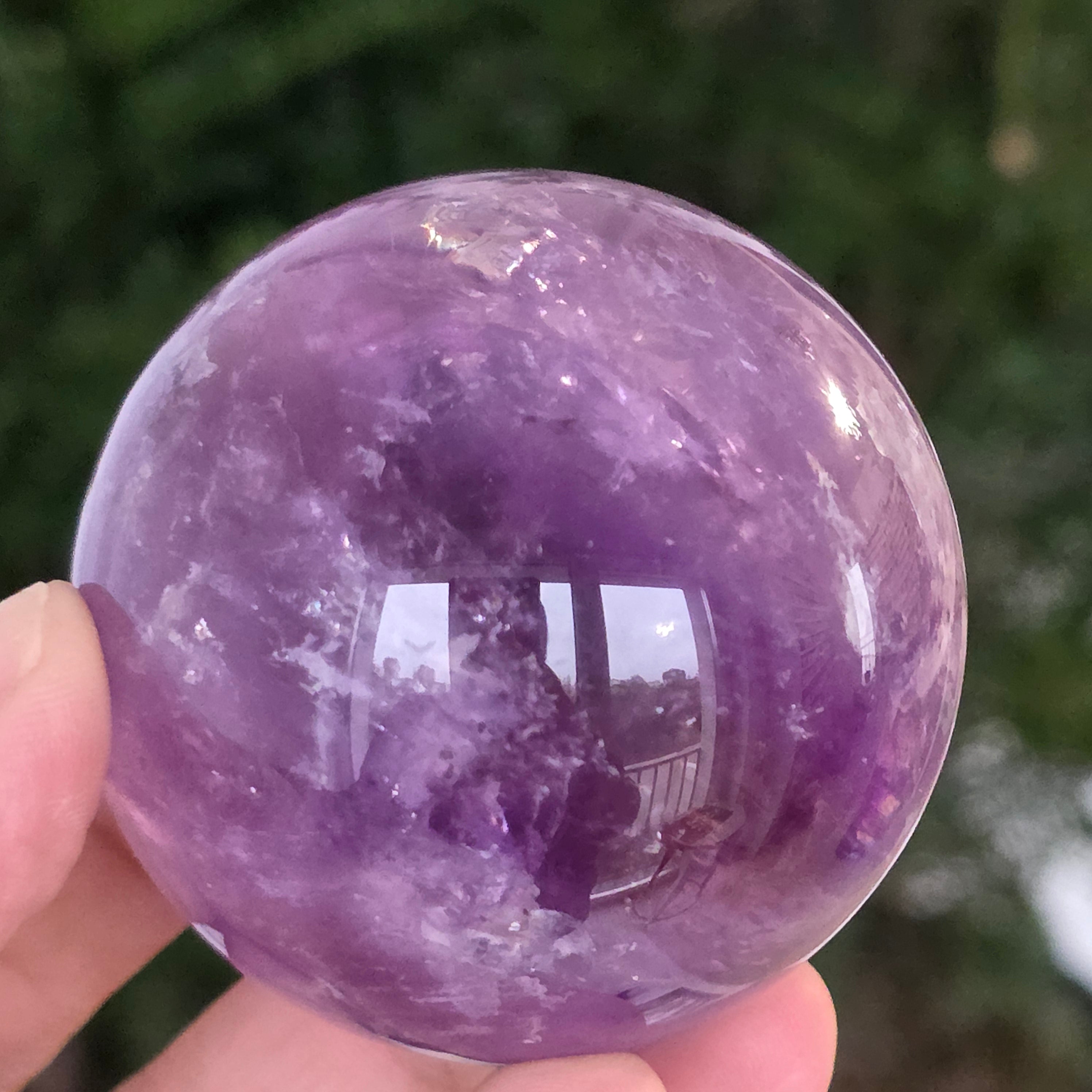 Egy gömb, amely mintha megragadta volna a naplemente égbolt lényegét. Ezt egyedülálló darab AA természetes ametiszt Brazíliából, mély, áttetsző fényt áraszt, a fényben játszó királylila, lila és levendula árnyalataival. A tökéletesen csiszolt felület kiemeli a kristály tisztaságát és természetes textúrájának finomságát – a klasszikus és kiegyensúlyozott szépségű ásványi gyöngyszem.