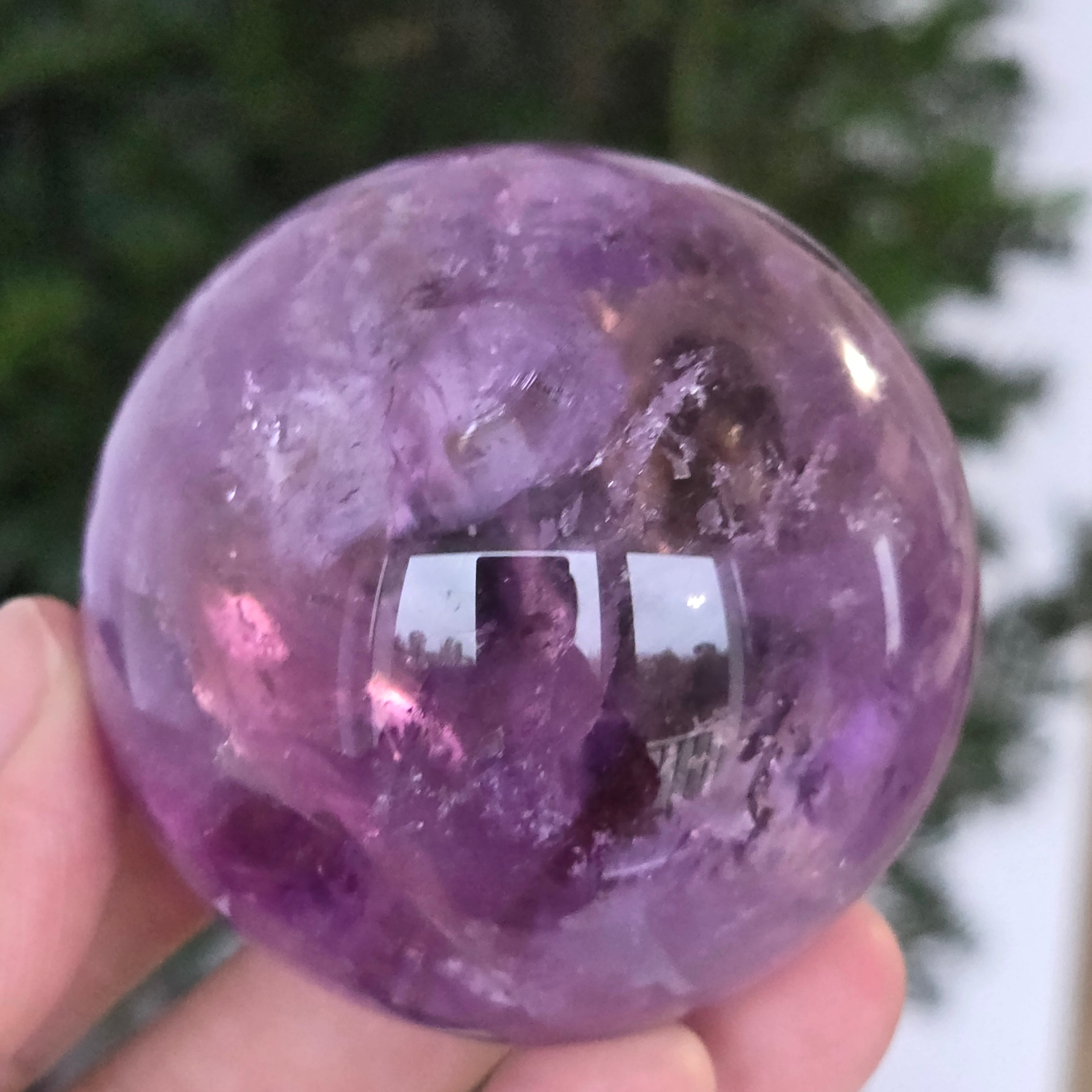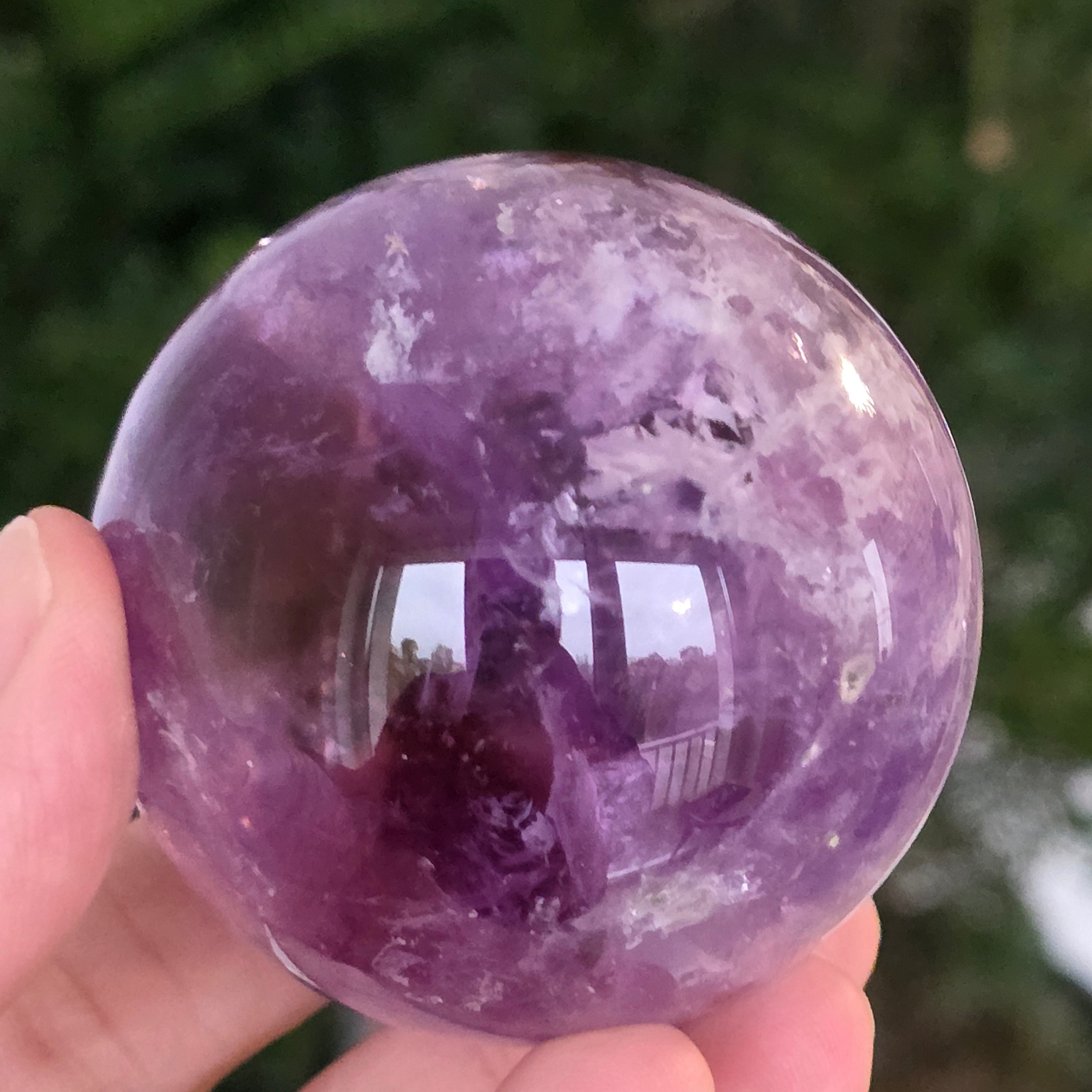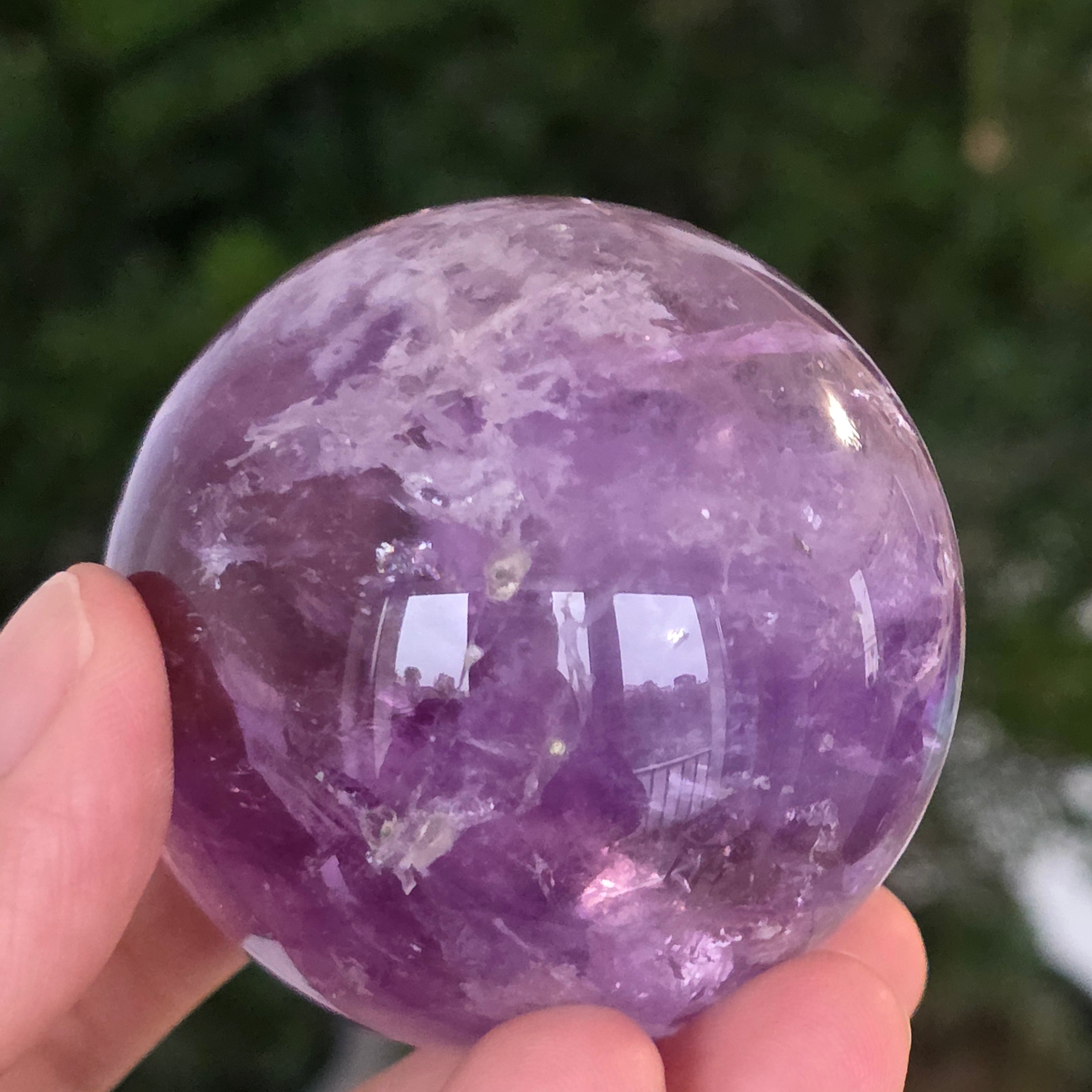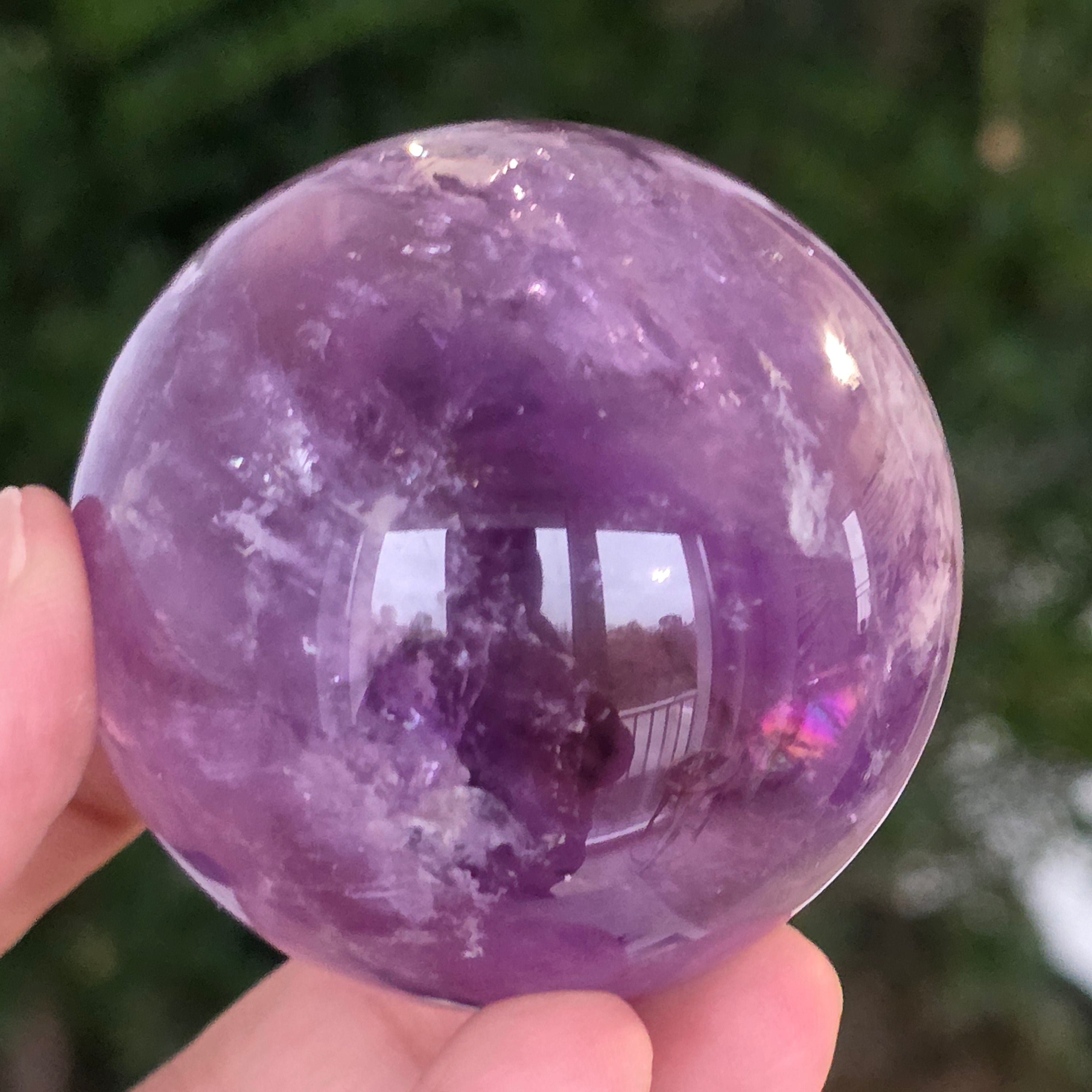 Egy gömb, amely mintha megragadta volna a naplemente égbolt lényegét. Ezt egyedülálló darab AA természetes ametiszt Brazíliából, mély, áttetsző fényt áraszt, a fényben játszó királylila, lila és levendula árnyalataival. A tökéletesen csiszolt felület kiemeli a kristály tisztaságát és természetes textúrájának finomságát – a klasszikus és kiegyensúlyozott szépségű ásványi gyöngyszem.