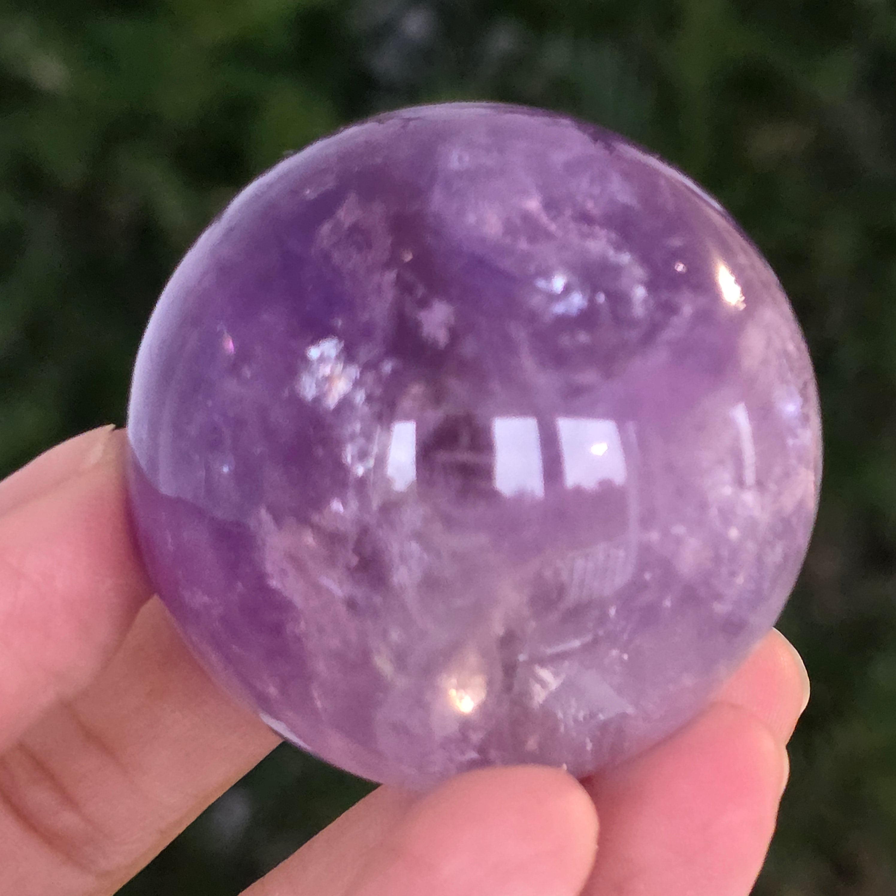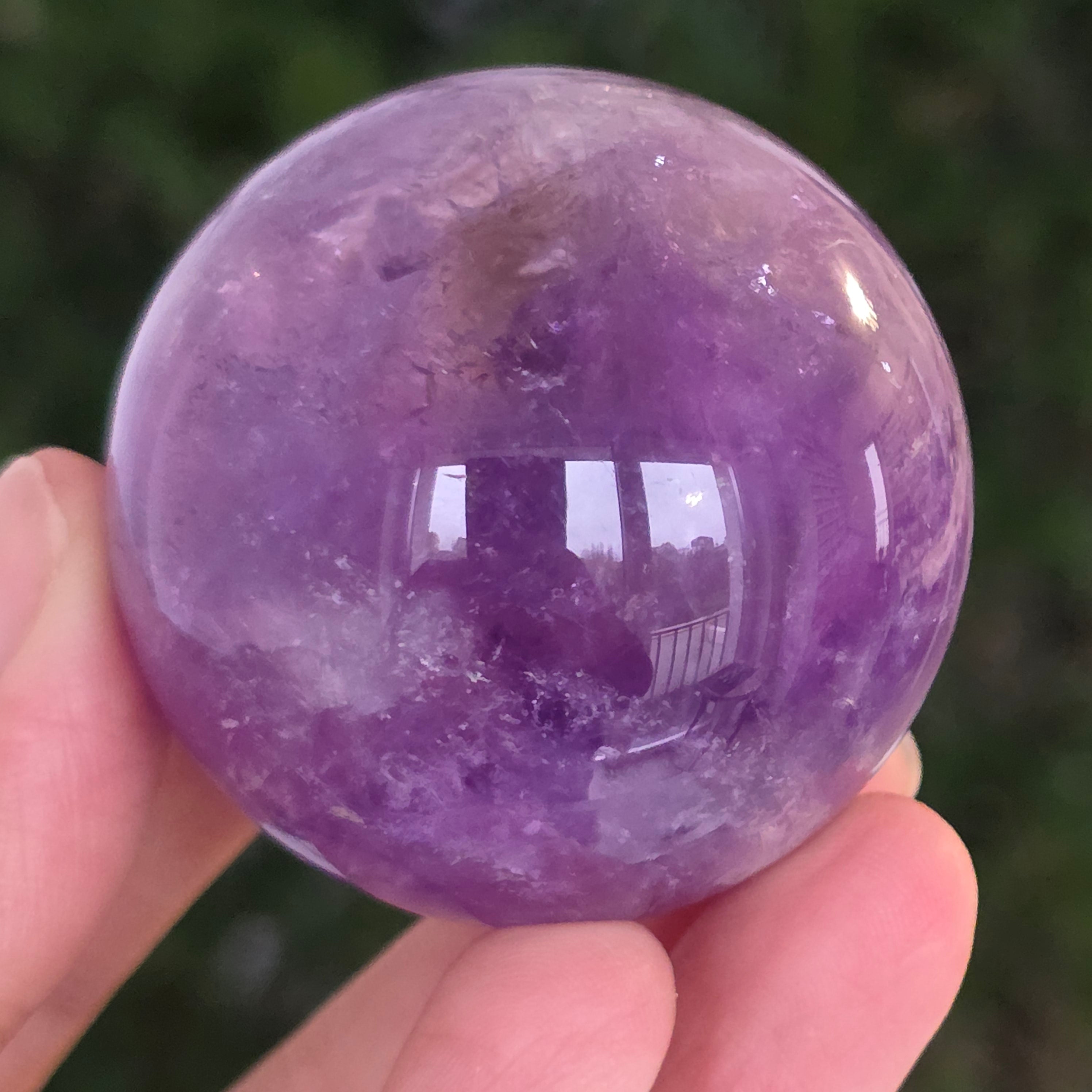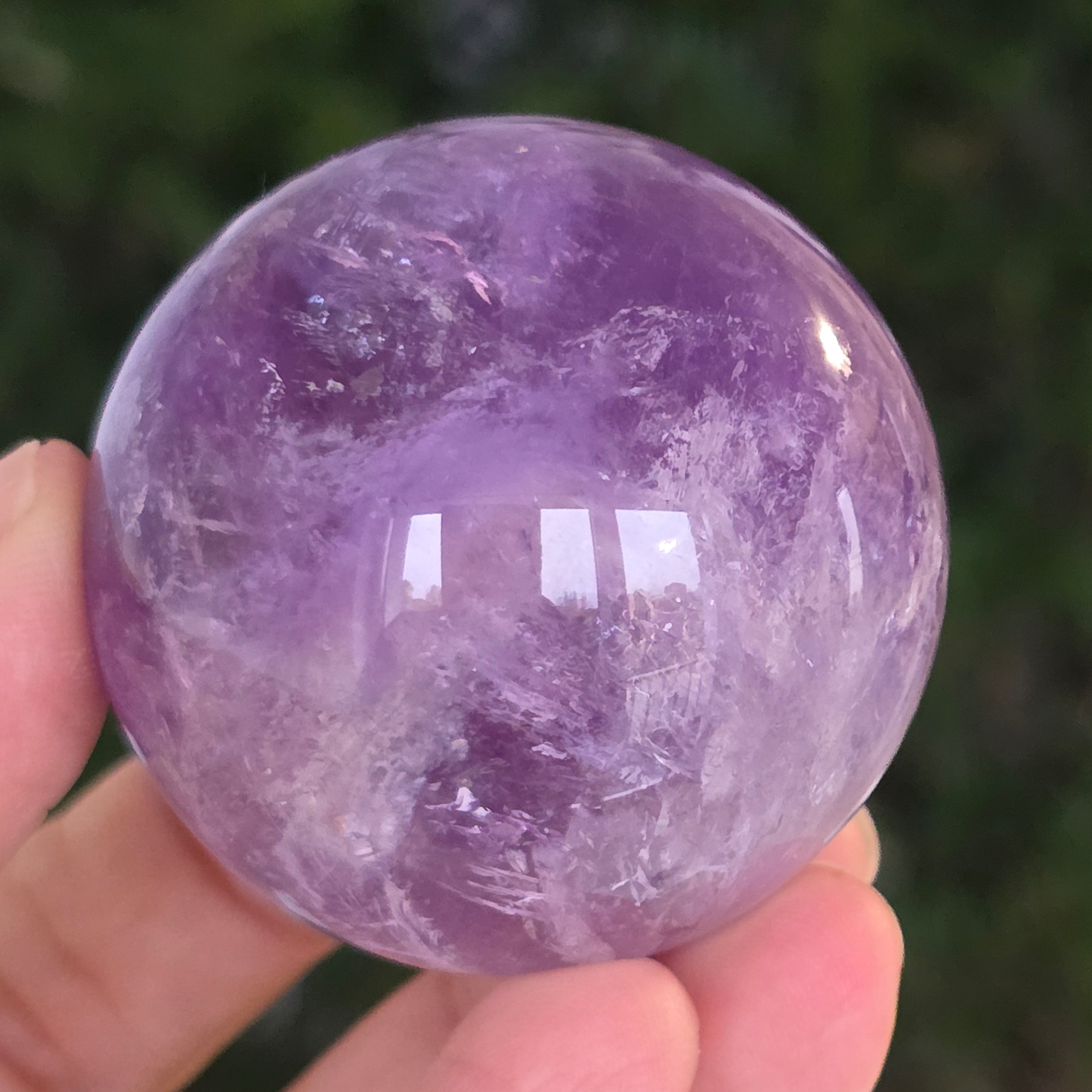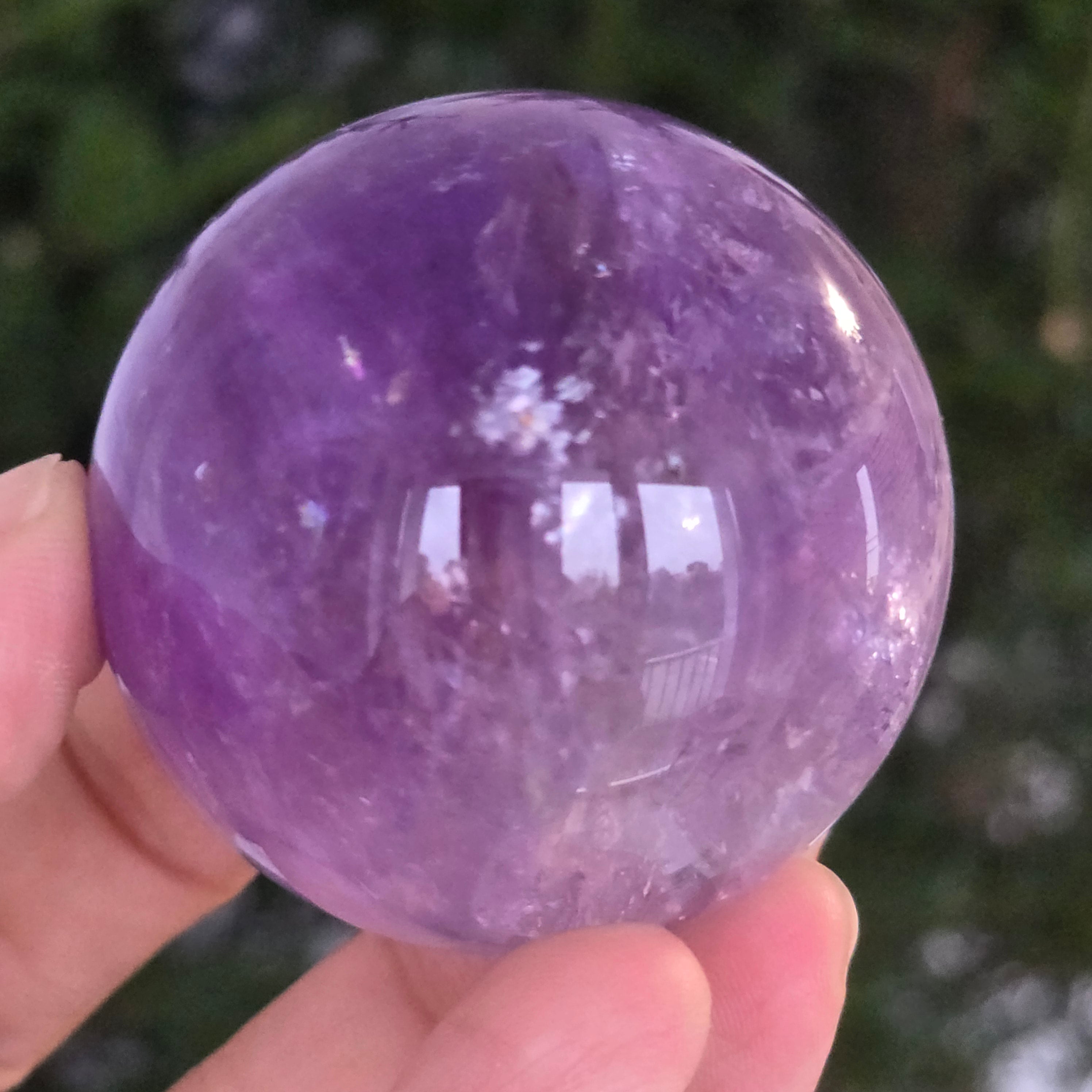 Egy gömb, amely mintha megragadta volna a naplemente égbolt lényegét. Ezt egyedülálló darab AA természetes ametiszt Brazíliából, mély, áttetsző fényt áraszt, a fényben játszó királylila, lila és levendula árnyalataival. A tökéletesen csiszolt felület kiemeli a kristály tisztaságát és természetes textúrájának finomságát – a klasszikus és kiegyensúlyozott szépségű ásványi gyöngyszem.