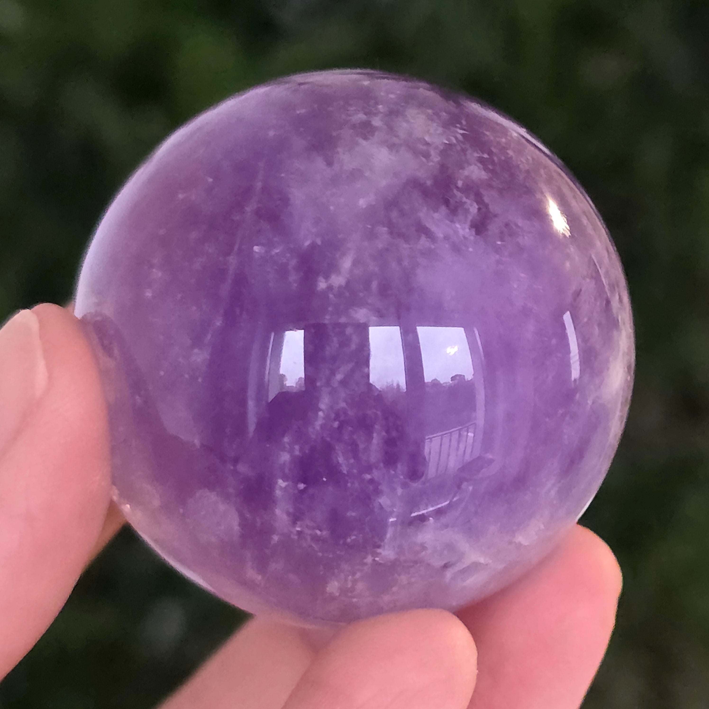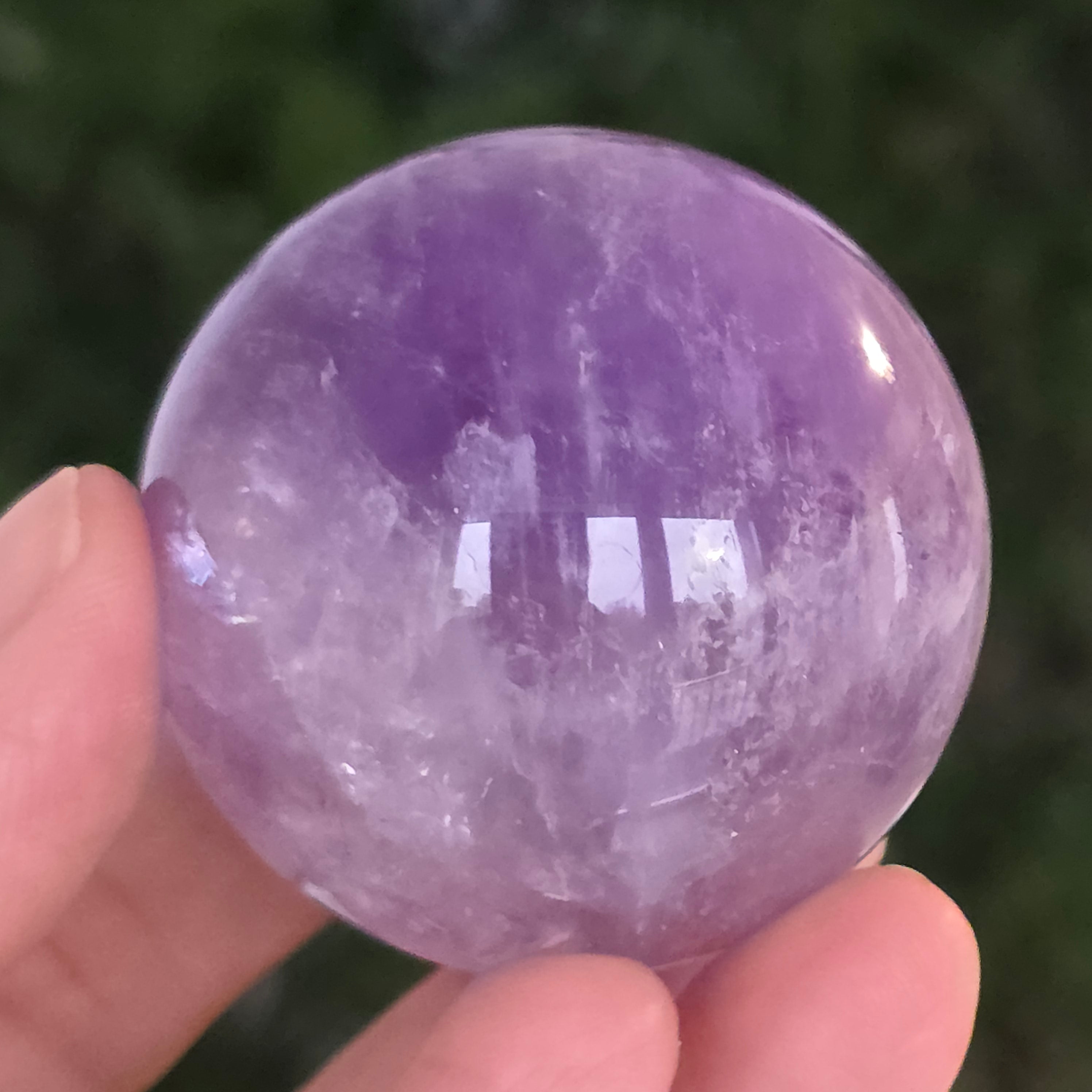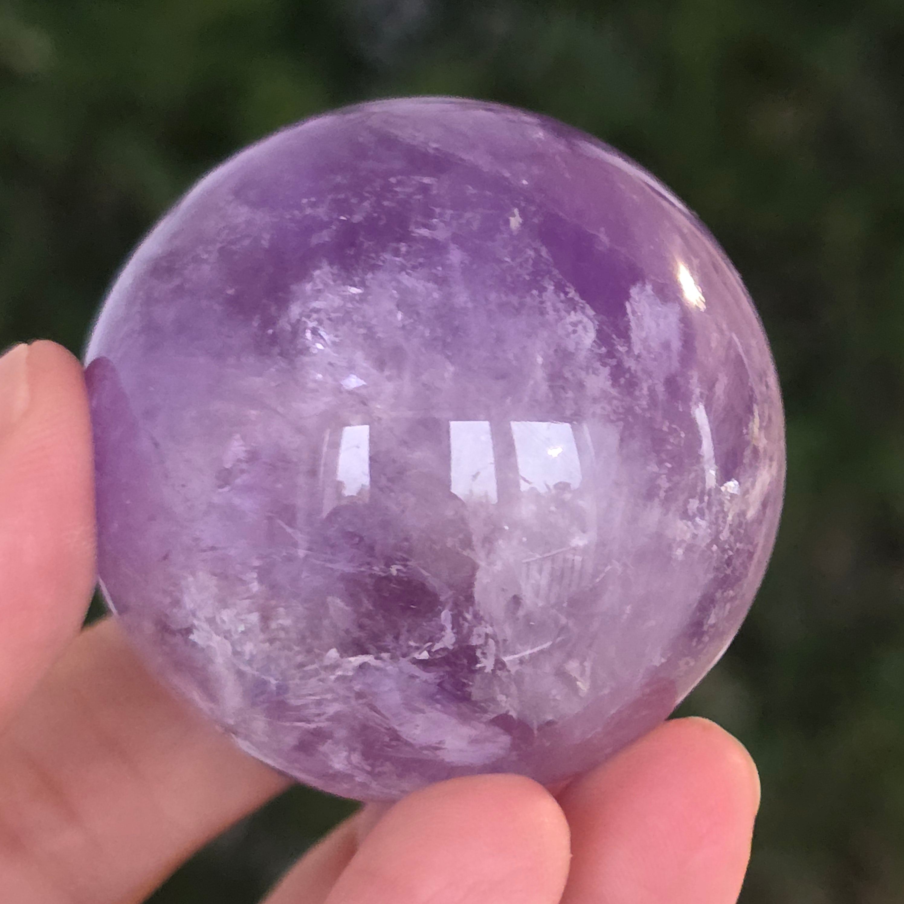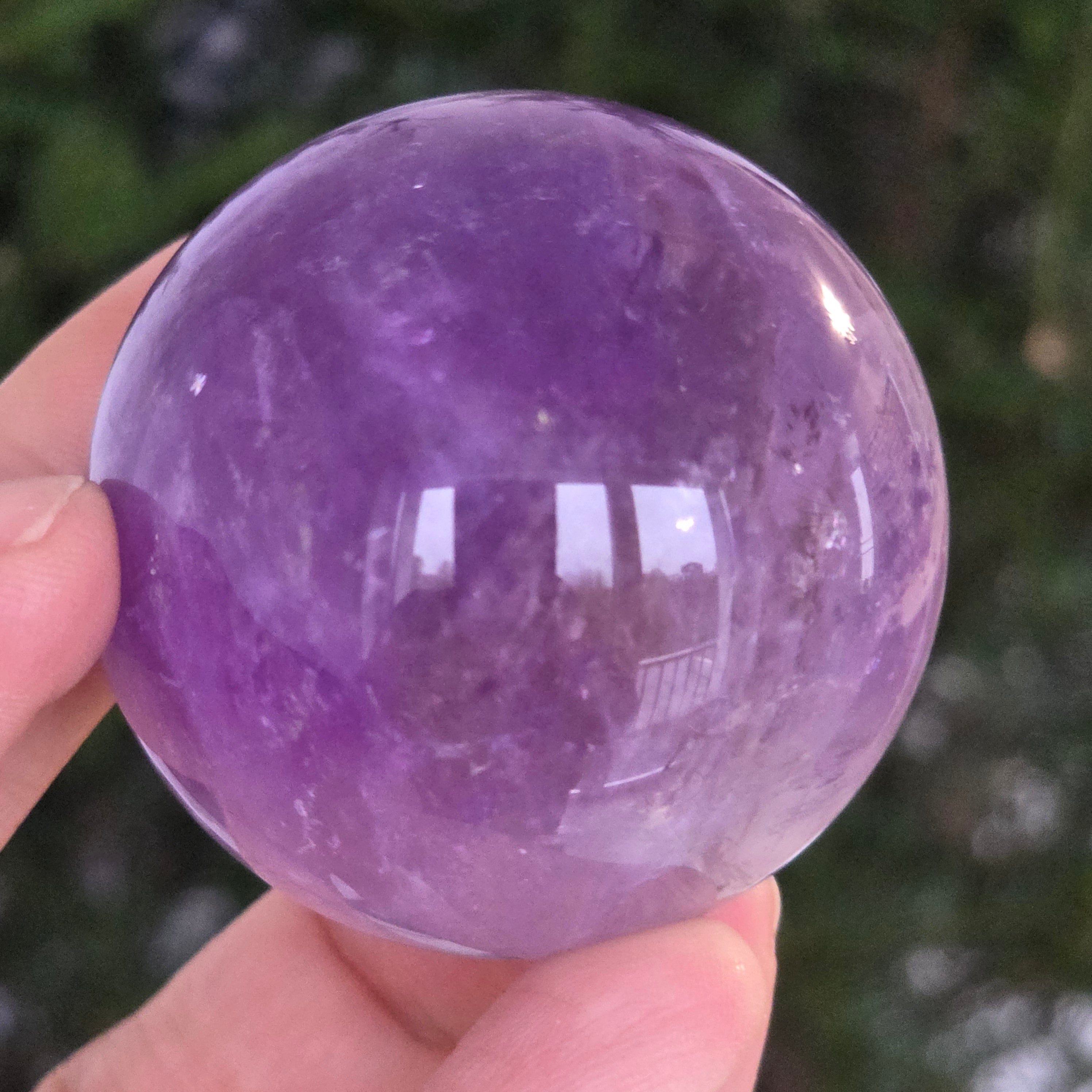 Egy gömb, amely mintha megragadta volna a naplemente égbolt lényegét. Ezt egyedülálló darab AA természetes ametiszt Brazíliából, mély, áttetsző fényt áraszt, a fényben játszó királylila, lila és levendula árnyalataival. A tökéletesen csiszolt felület kiemeli a kristály tisztaságát és természetes textúrájának finomságát – a klasszikus és kiegyensúlyozott szépségű ásványi gyöngyszem.