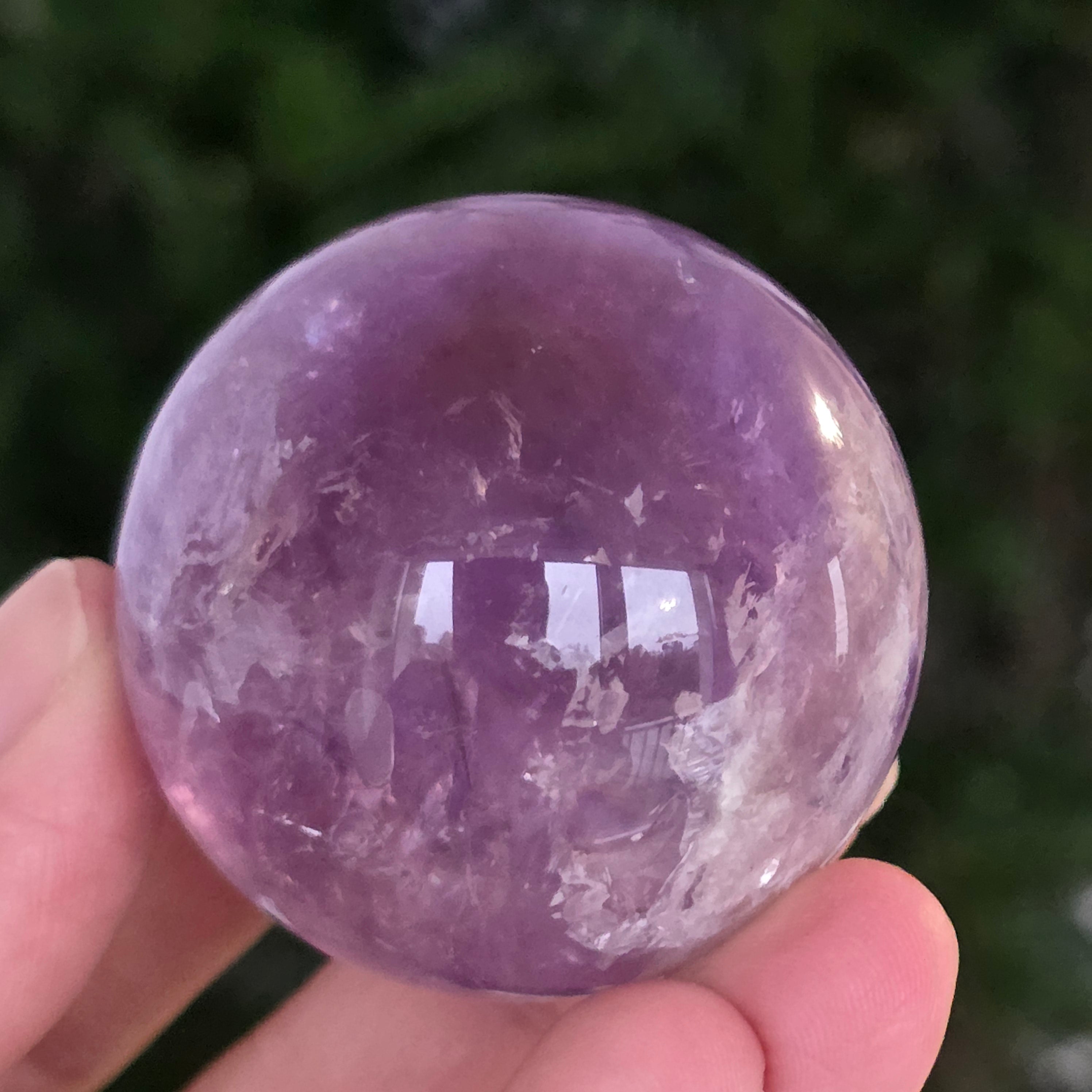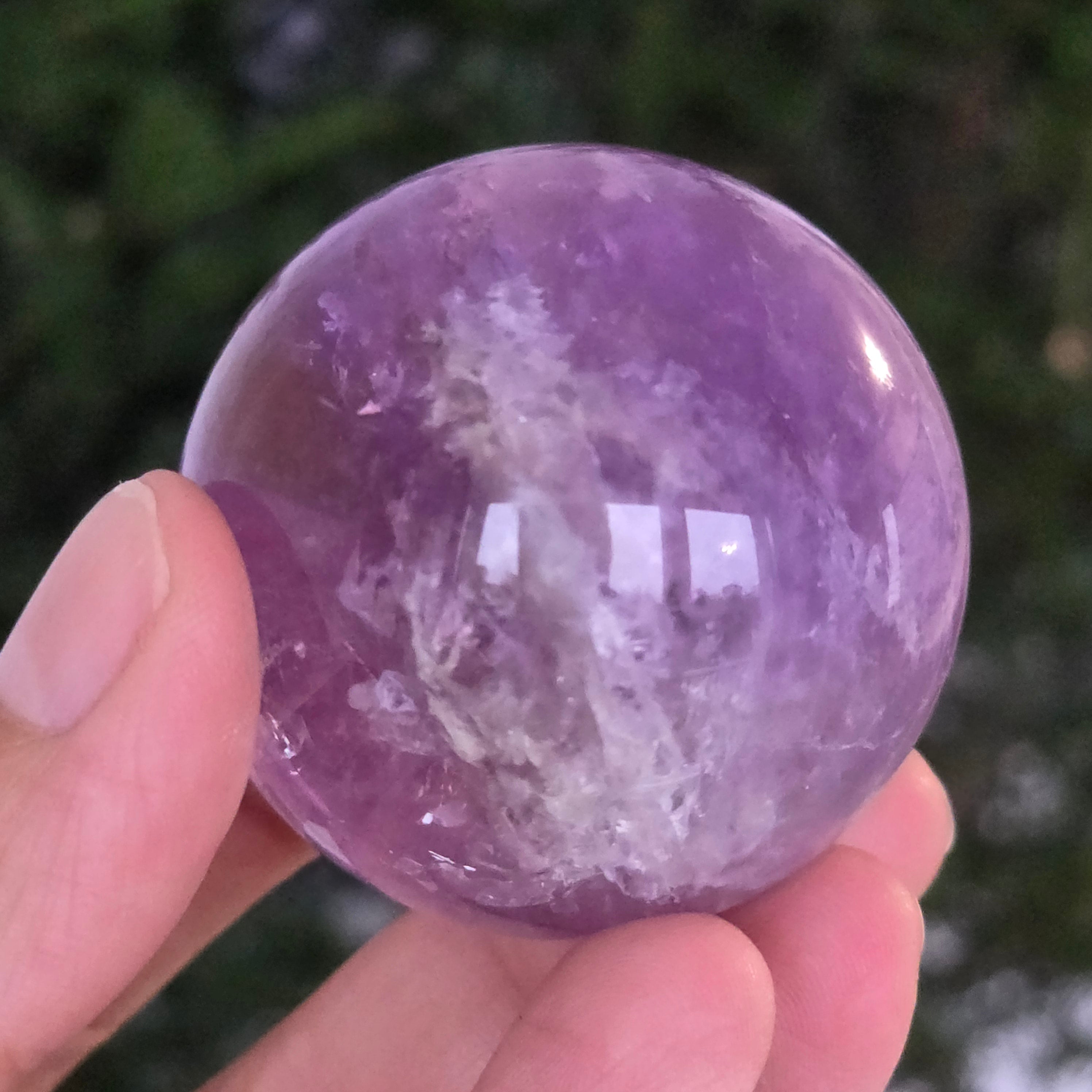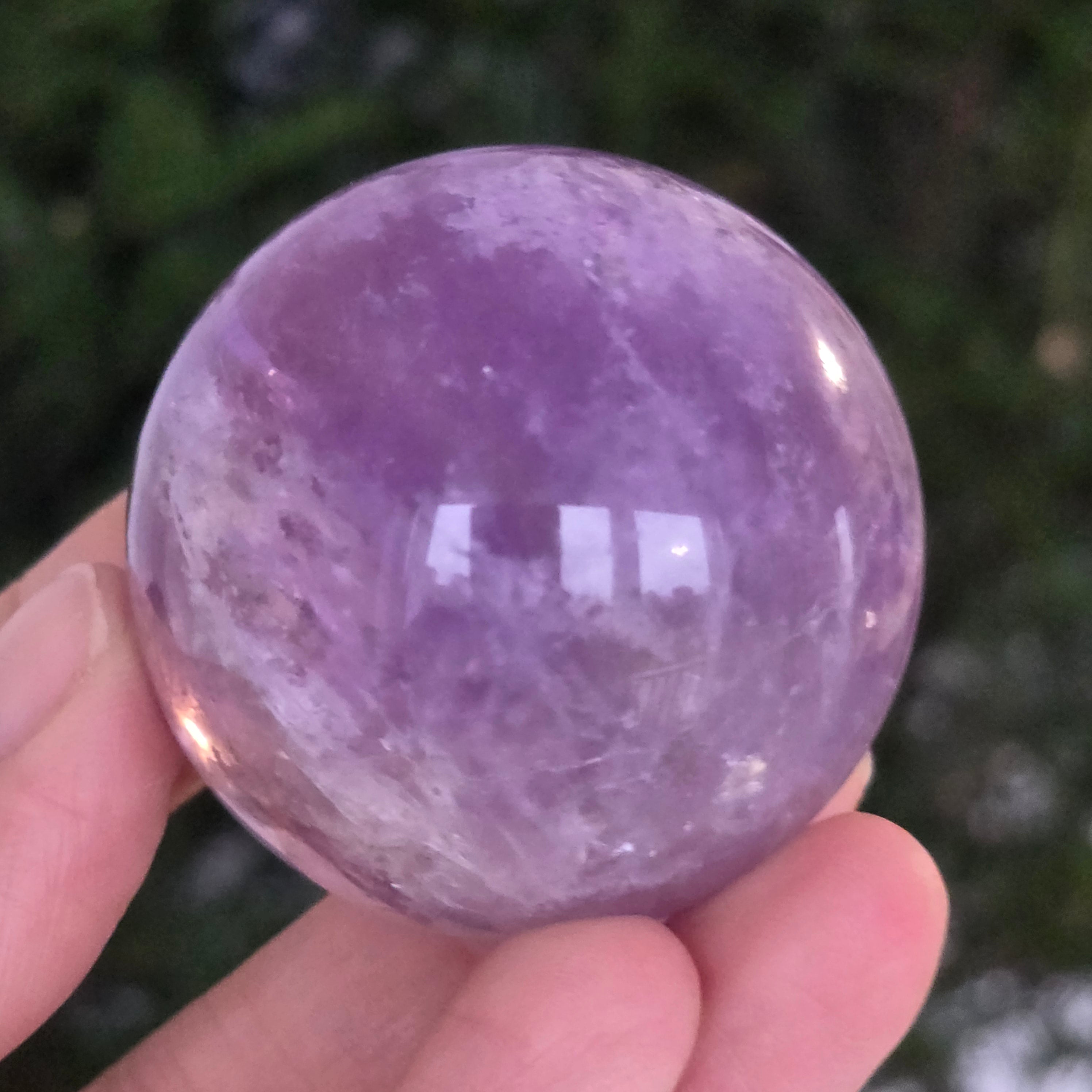 Egy gömb, amely mintha megragadta volna a naplemente égbolt lényegét. Ezt egyedülálló darab AA természetes ametiszt Brazíliából, mély, áttetsző fényt áraszt, a fényben játszó királylila, lila és levendula árnyalataival. A tökéletesen csiszolt felület kiemeli a kristály tisztaságát és természetes textúrájának finomságát – a klasszikus és kiegyensúlyozott szépségű ásványi gyöngyszem.