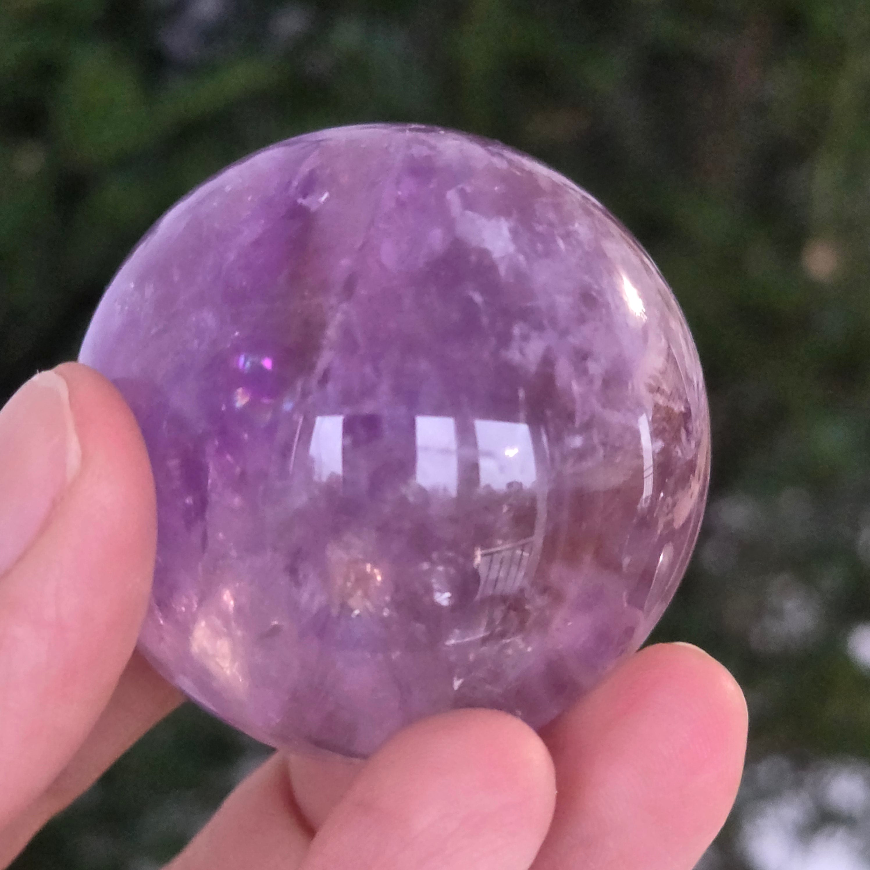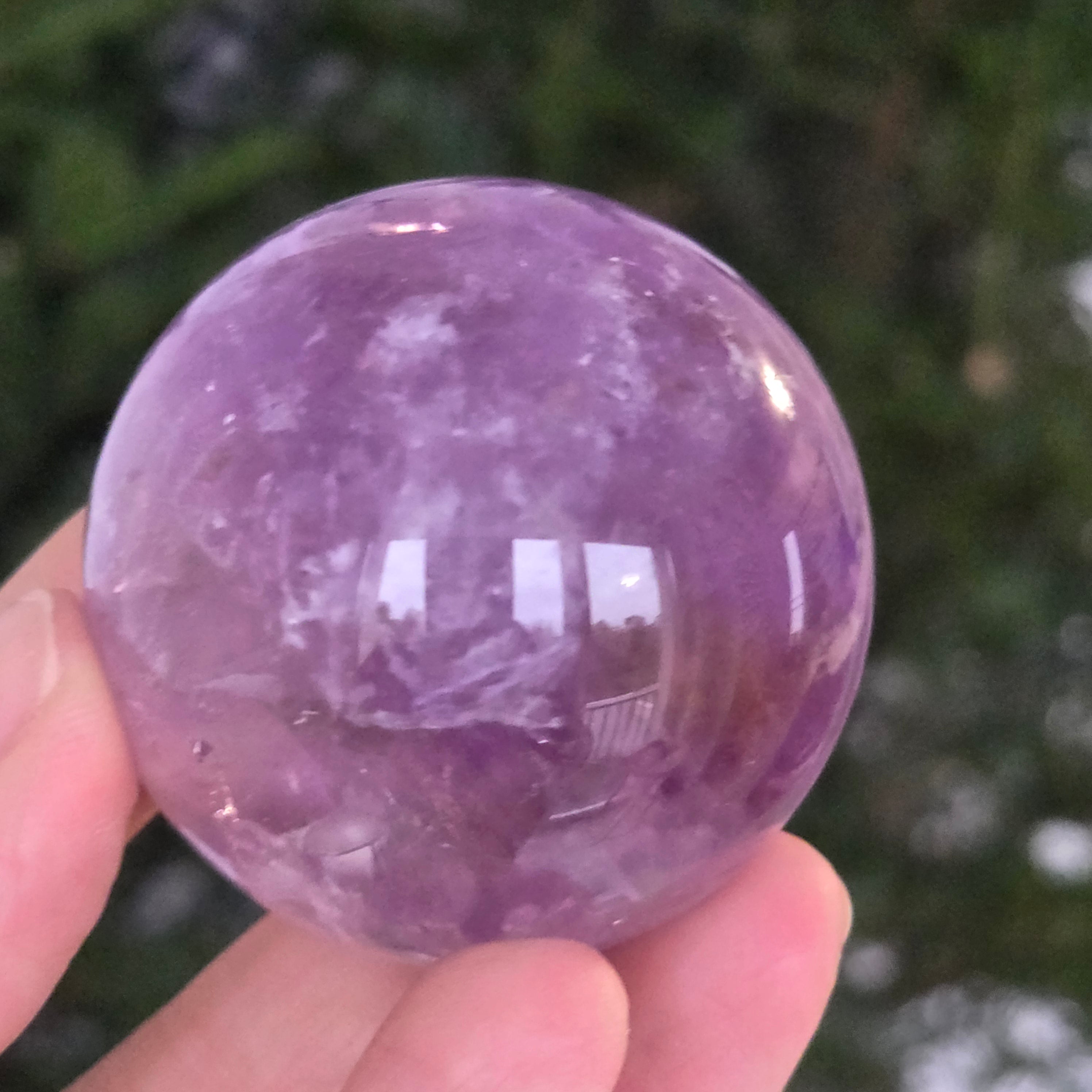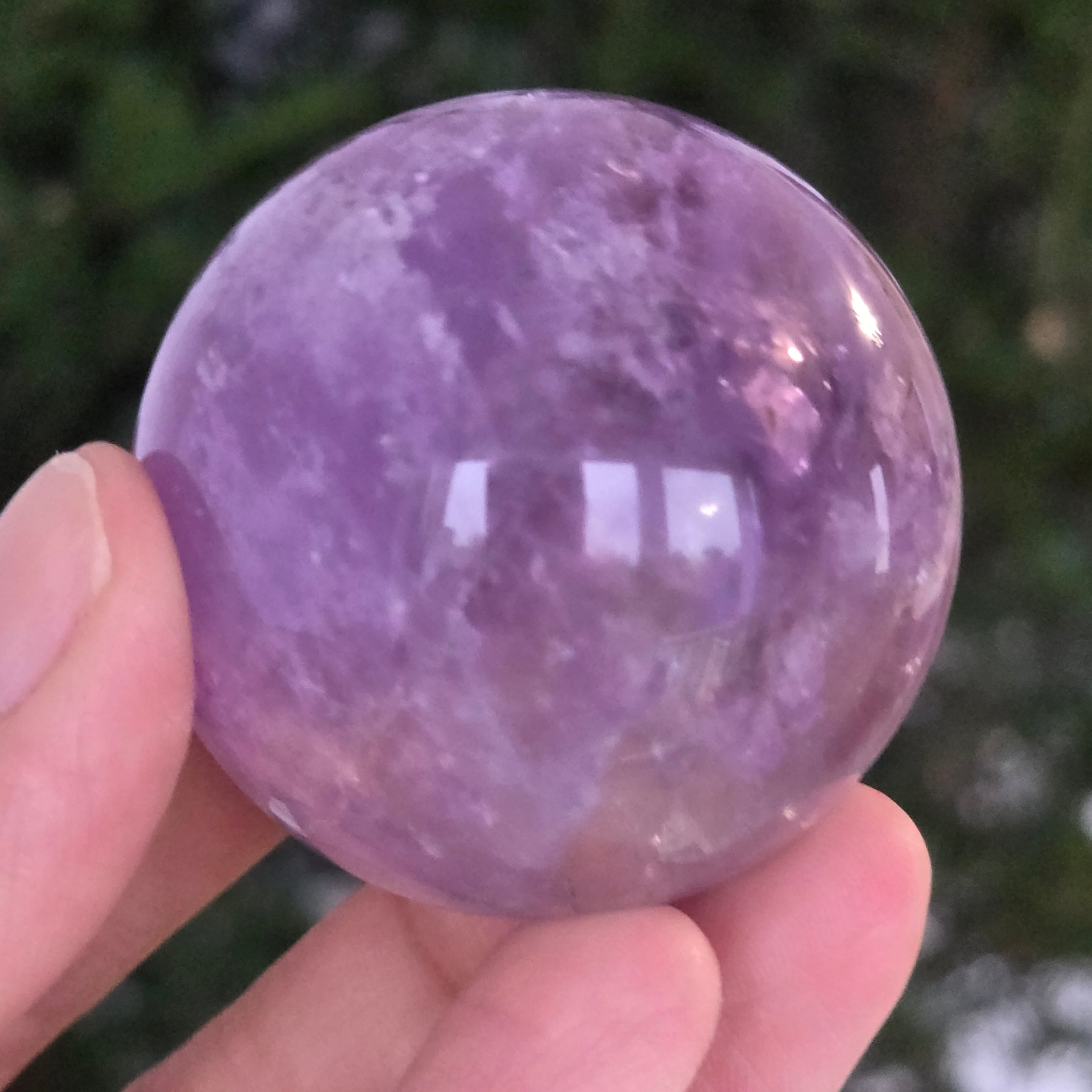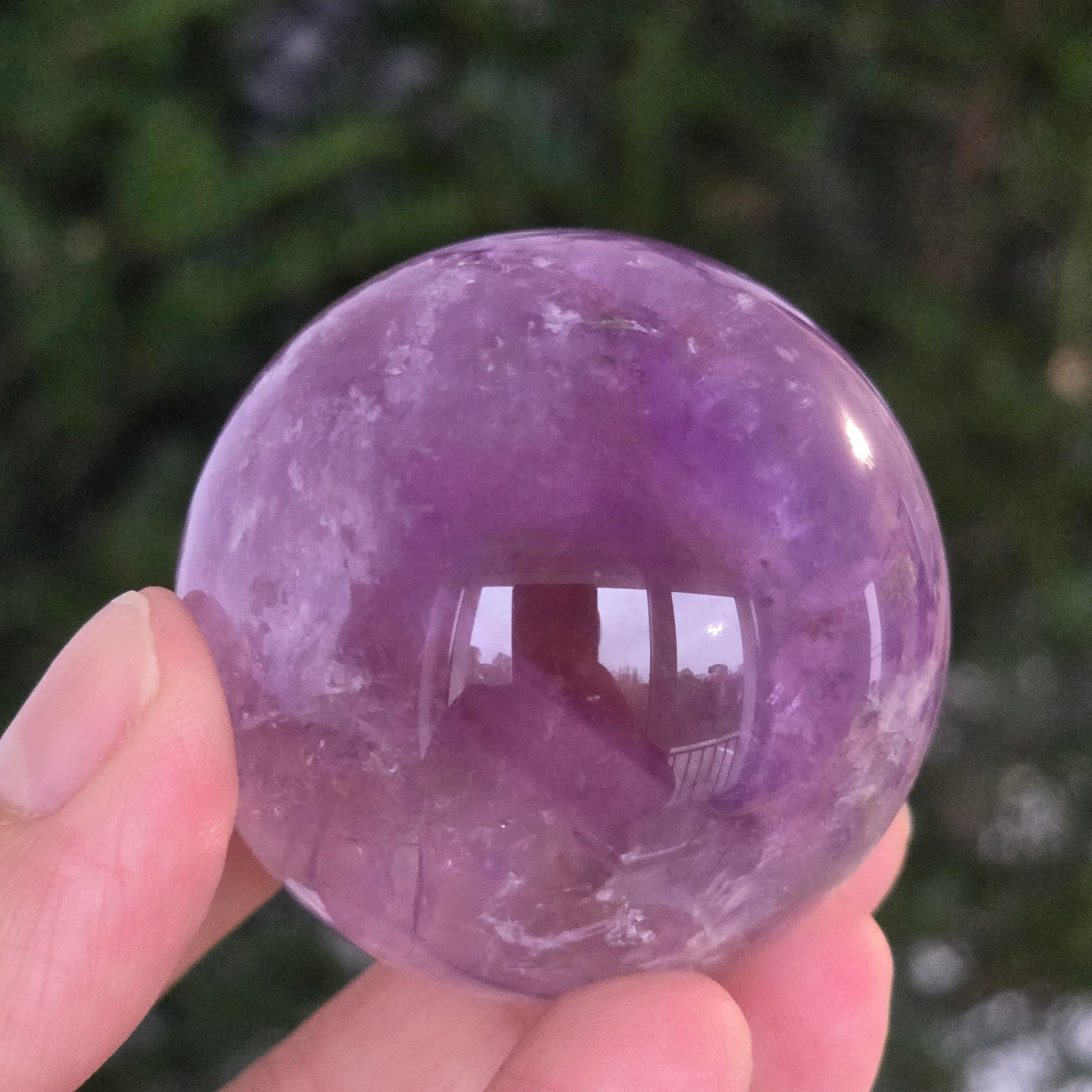 Egy gömb, amely mintha megragadta volna a naplemente égbolt lényegét. Ezt egyedülálló darab AA természetes ametiszt Brazíliából, mély, áttetsző fényt áraszt, a fényben játszó királylila, lila és levendula árnyalataival. A tökéletesen csiszolt felület kiemeli a kristály tisztaságát és természetes textúrájának finomságát – a klasszikus és kiegyensúlyozott szépségű ásványi gyöngyszem.