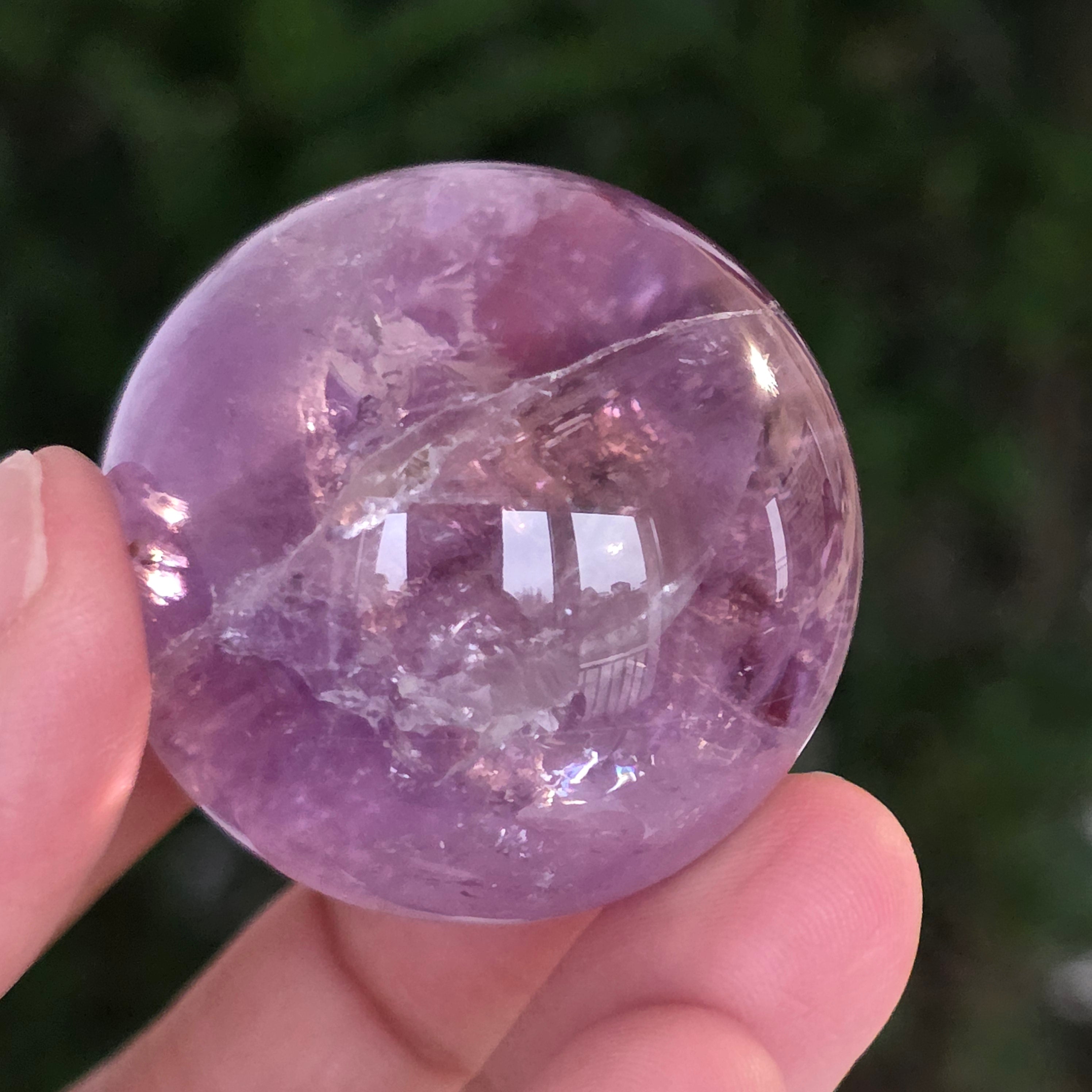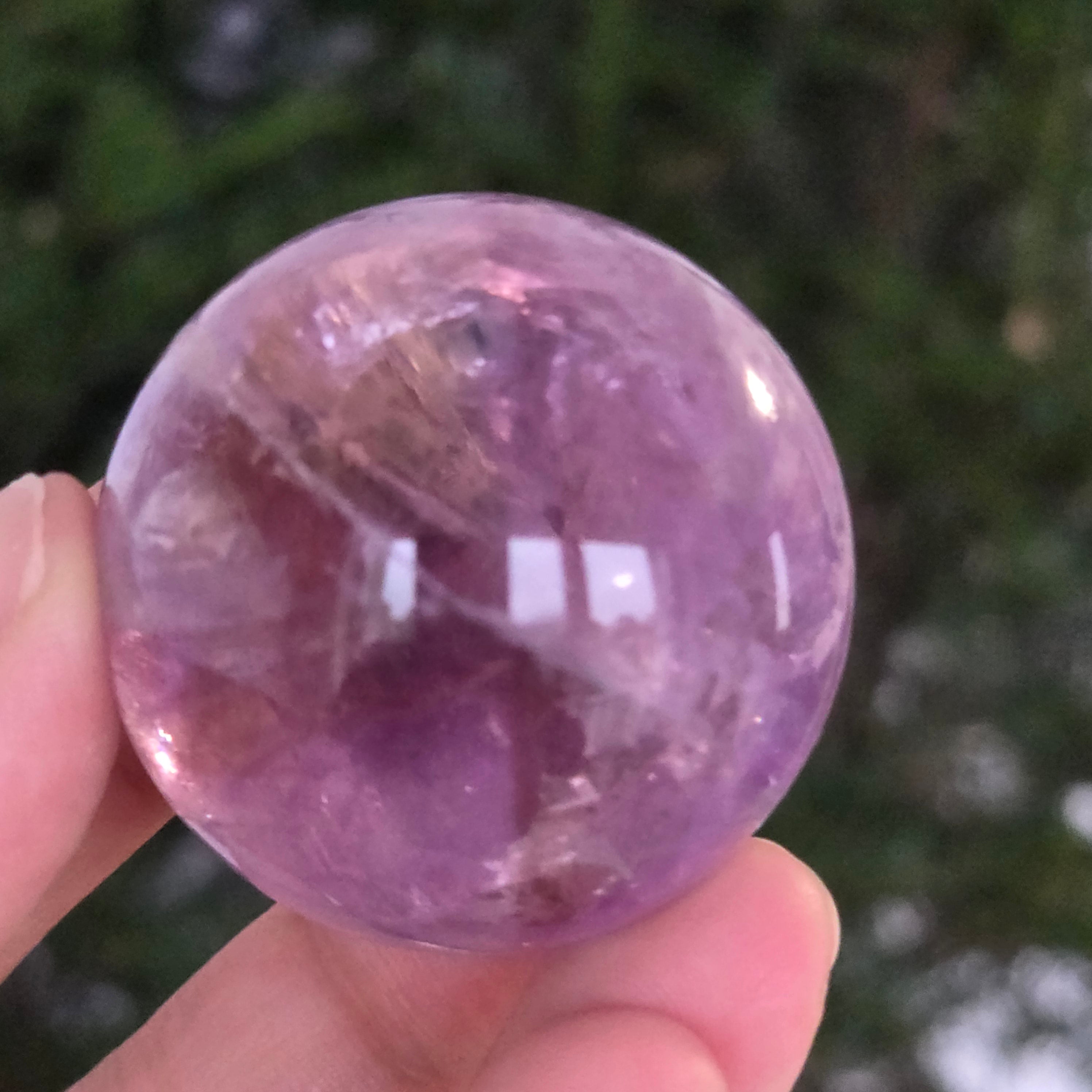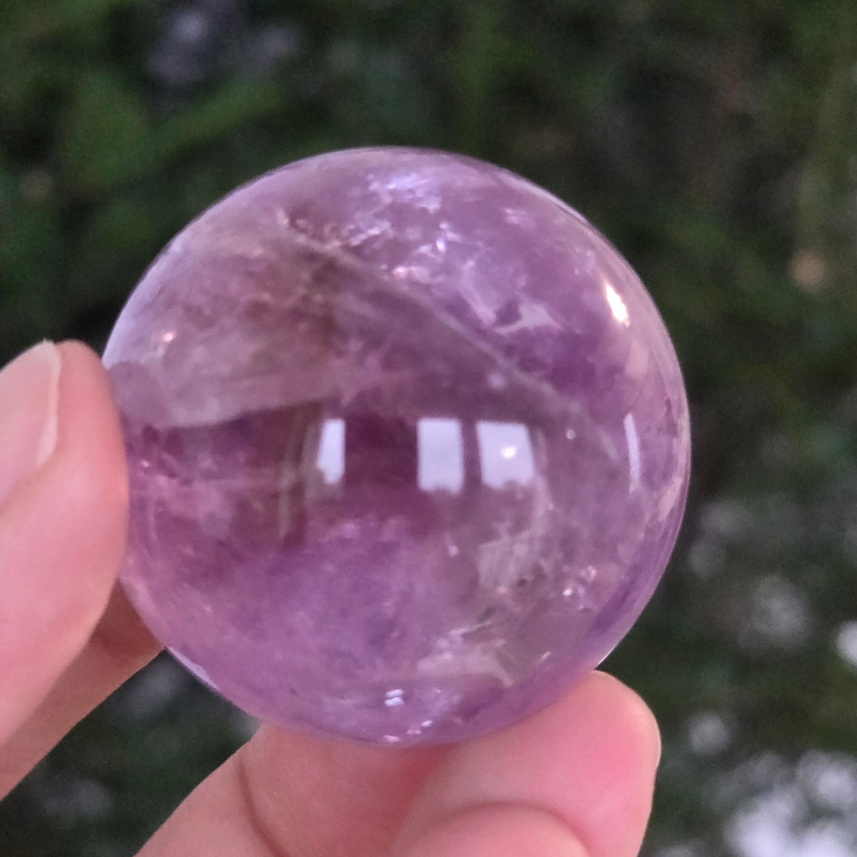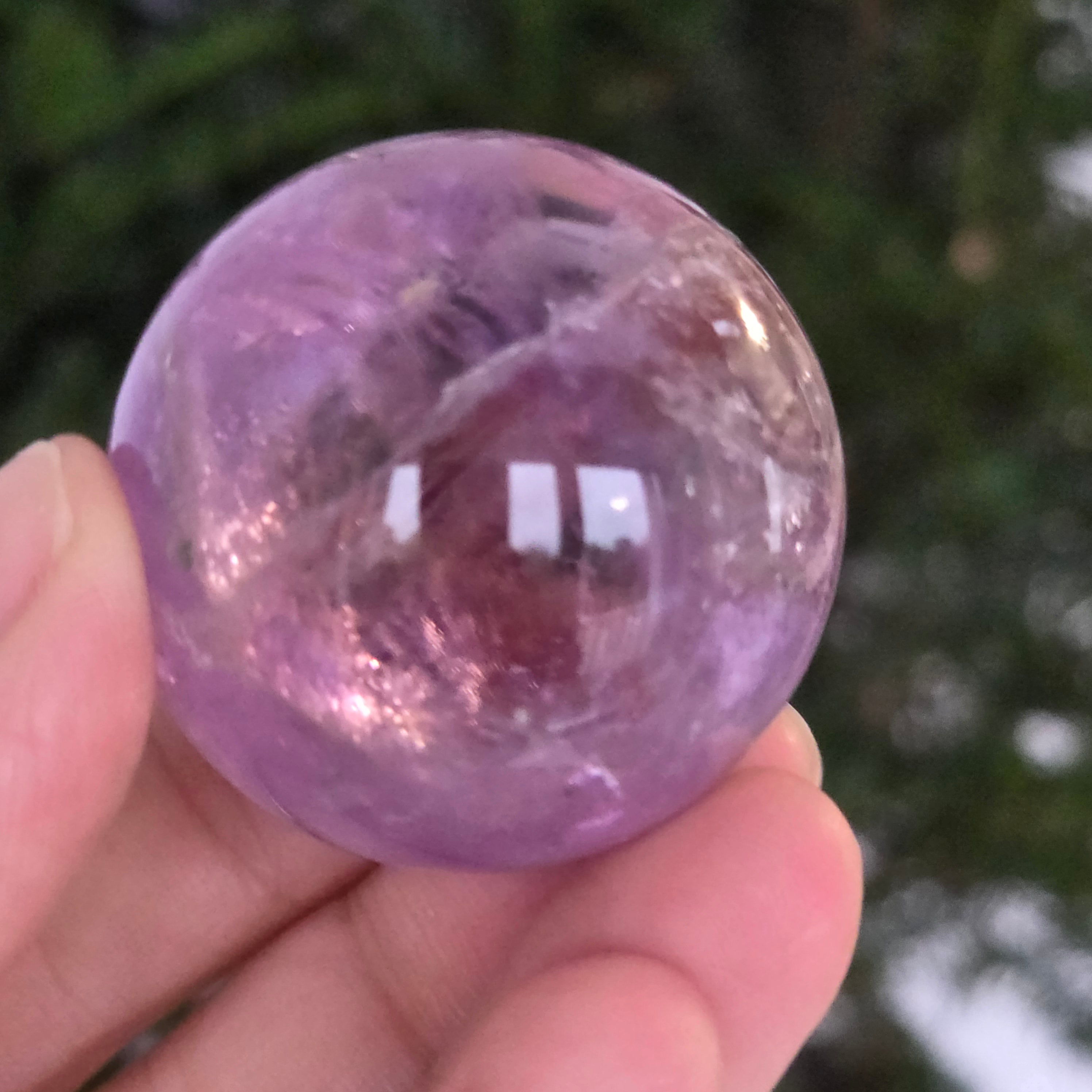 Egy gömb, amely mintha megragadta volna a naplemente égbolt lényegét. Ezt egyedülálló darab AA természetes ametiszt Brazíliából, mély, áttetsző fényt áraszt, a fényben játszó királylila, lila és levendula árnyalataival. A tökéletesen csiszolt felület kiemeli a kristály tisztaságát és természetes textúrájának finomságát – a klasszikus és kiegyensúlyozott szépségű ásványi gyöngyszem.