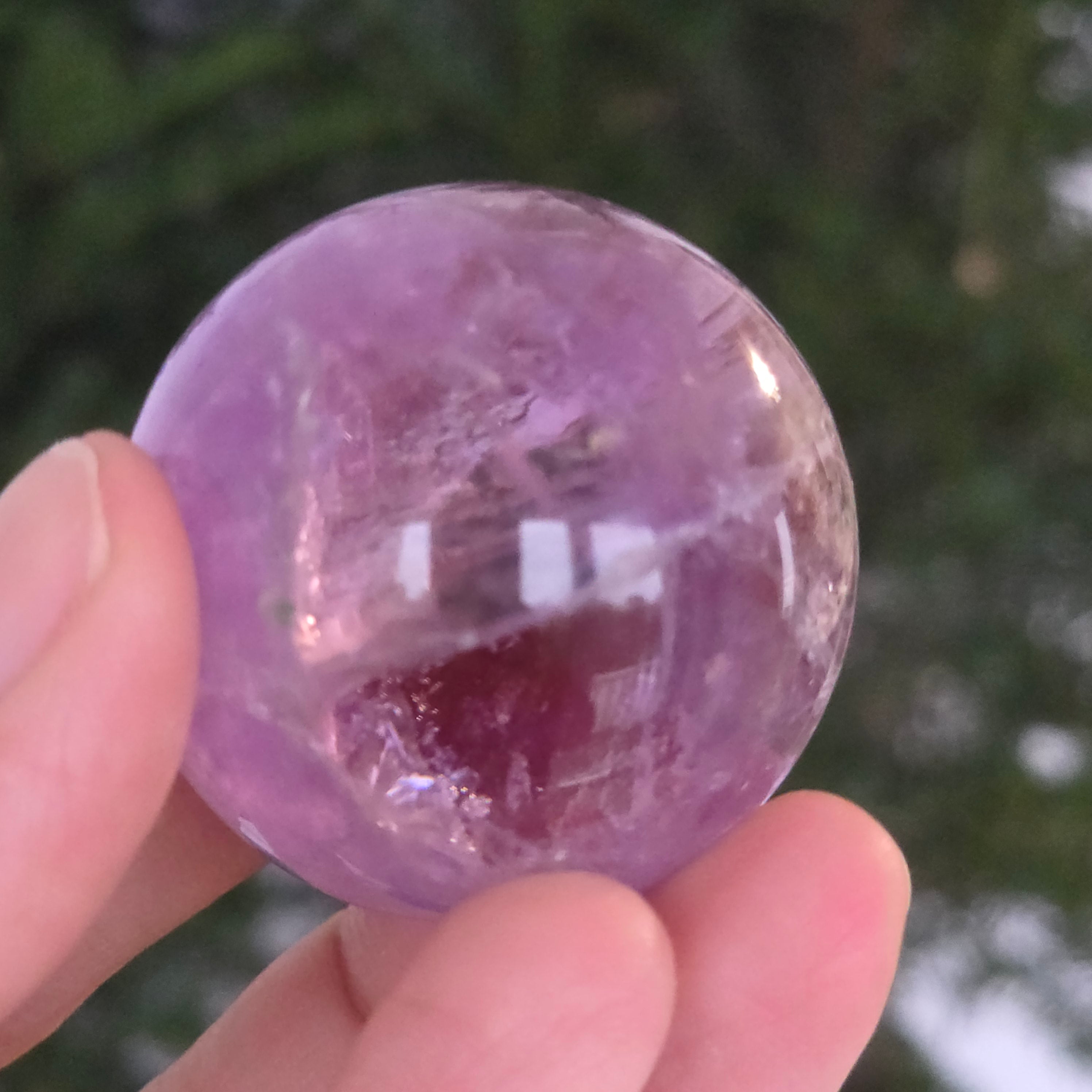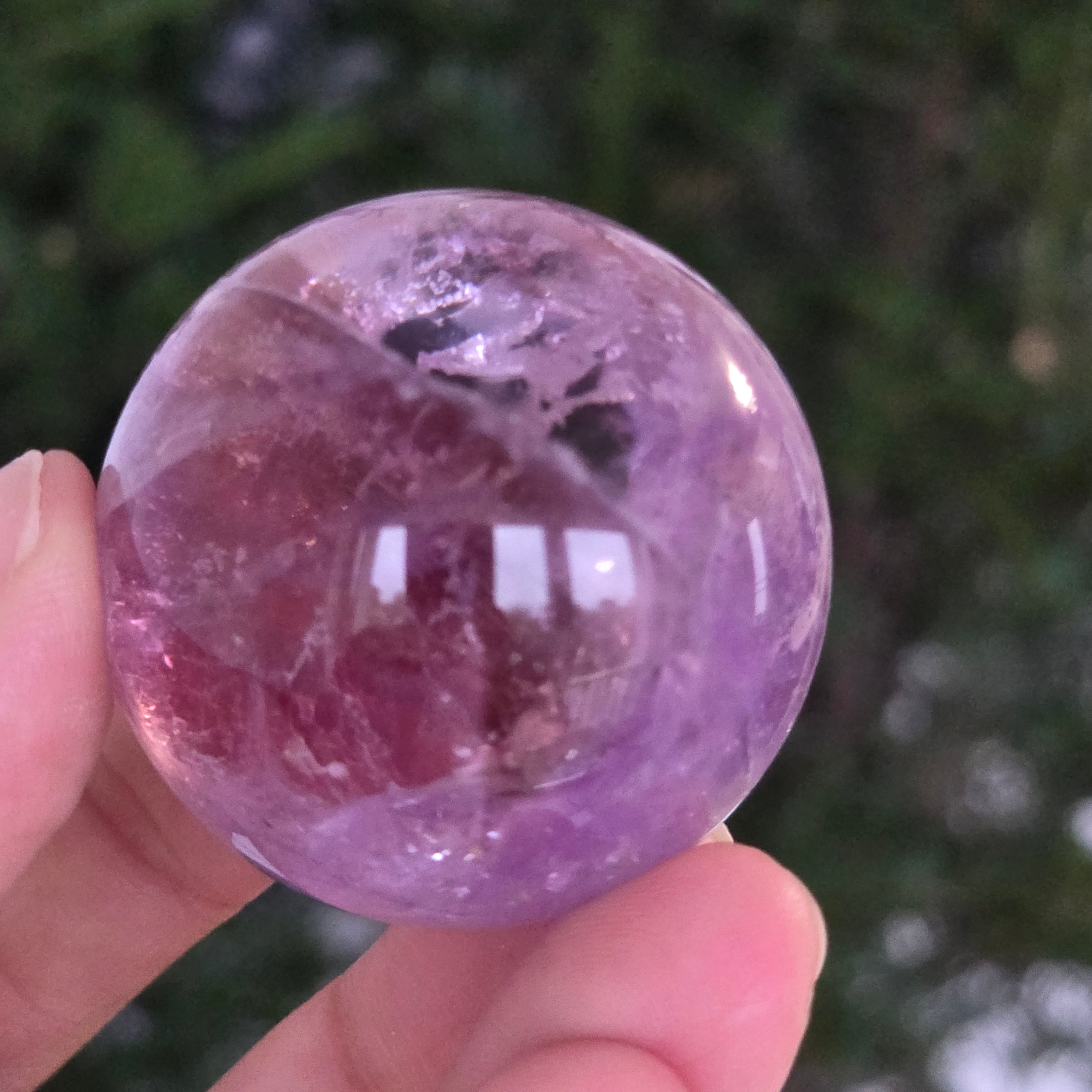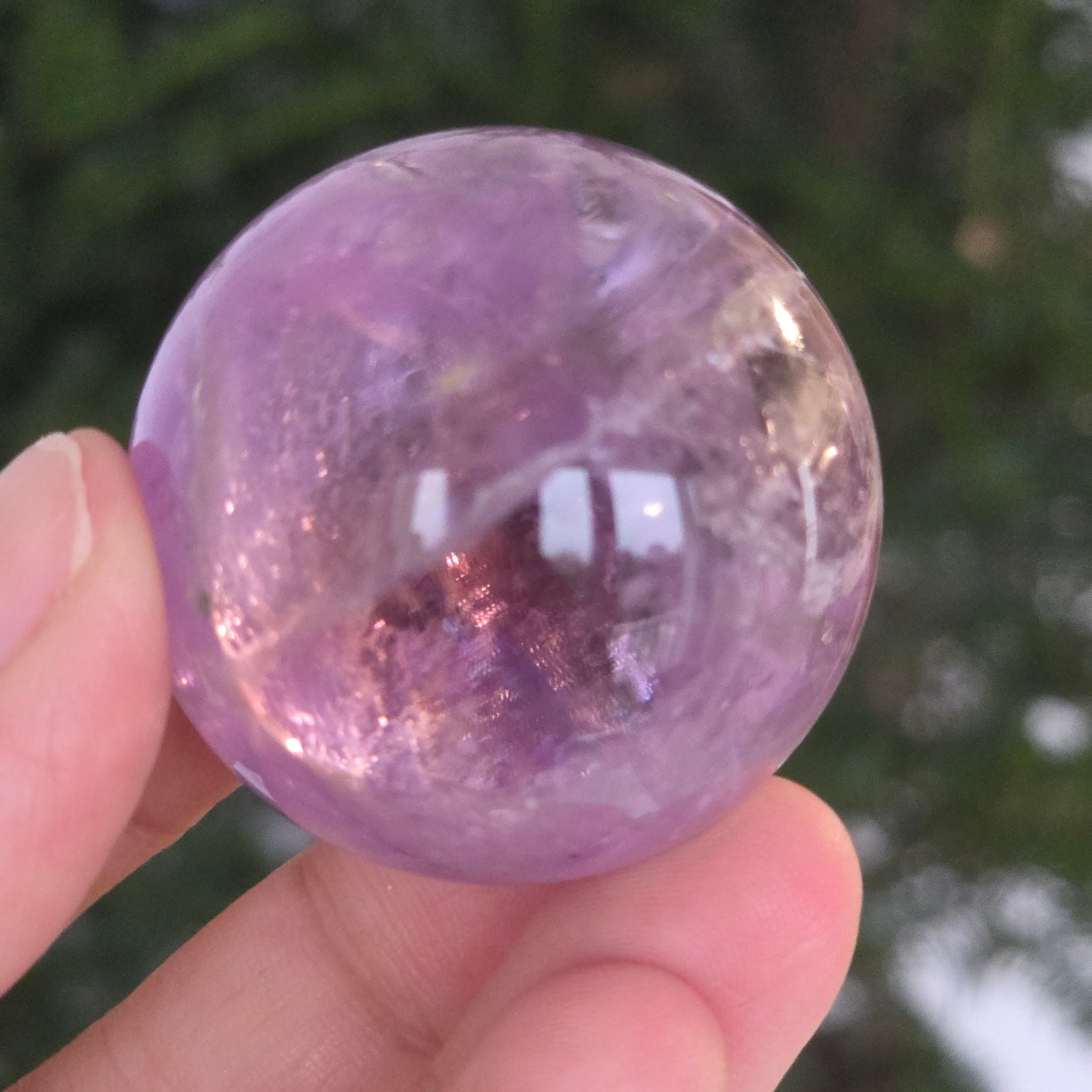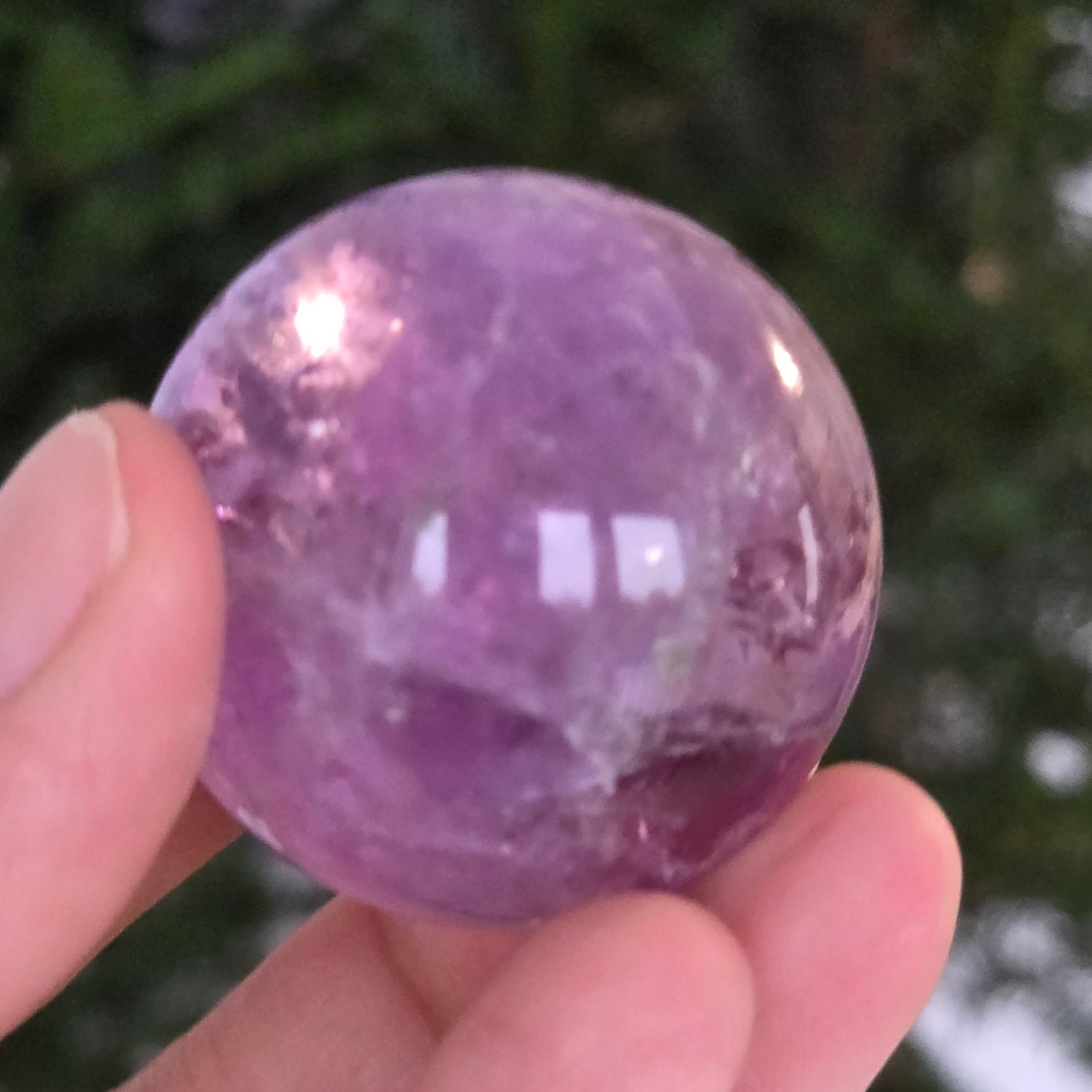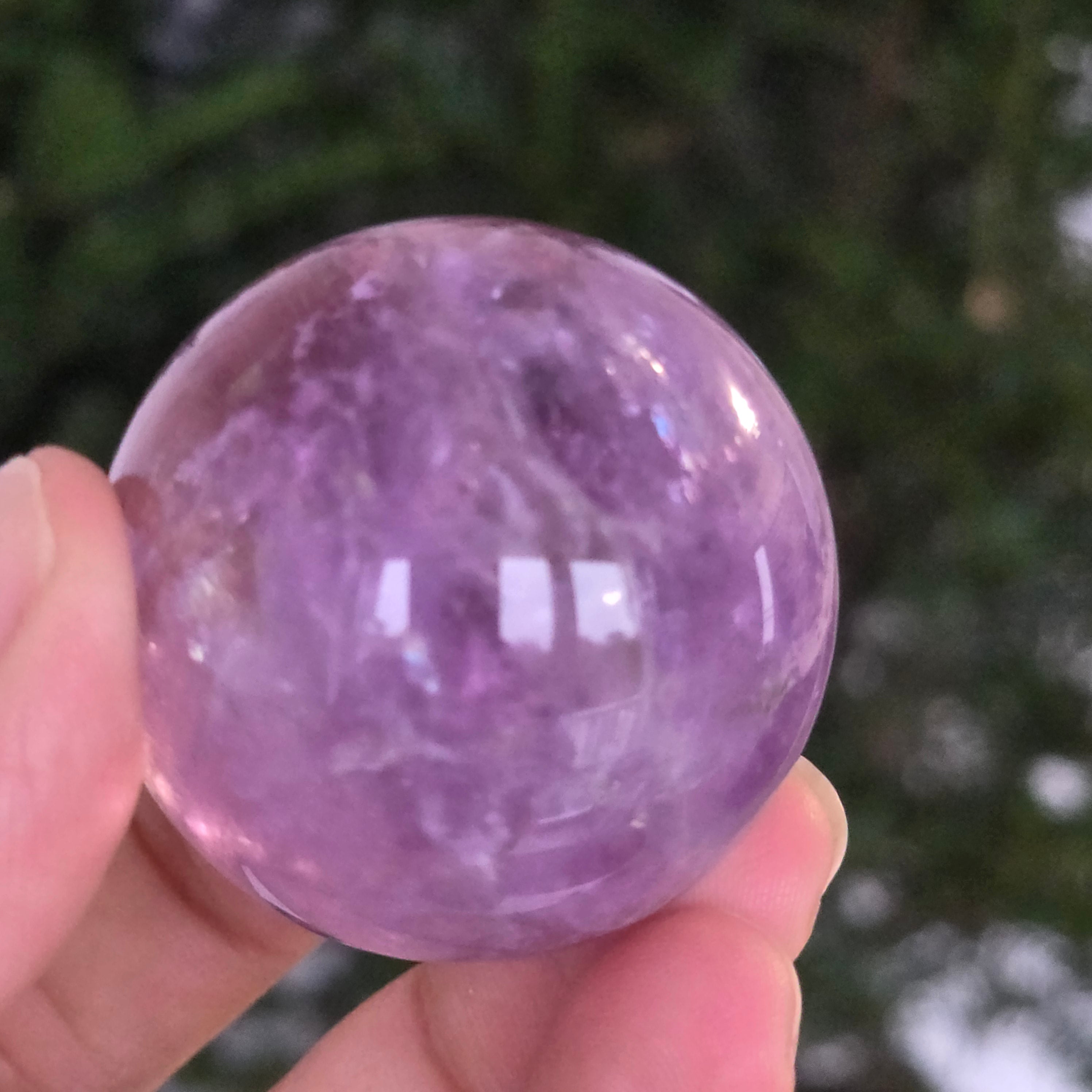 Egy gömb, amely mintha megragadta volna a naplemente égbolt lényegét. Ezt egyedülálló darab AA természetes ametiszt Brazíliából, mély, áttetsző fényt áraszt, a fényben játszó királylila, lila és levendula árnyalataival. A tökéletesen csiszolt felület kiemeli a kristály tisztaságát és természetes textúrájának finomságát – a klasszikus és kiegyensúlyozott szépségű ásványi gyöngyszem.