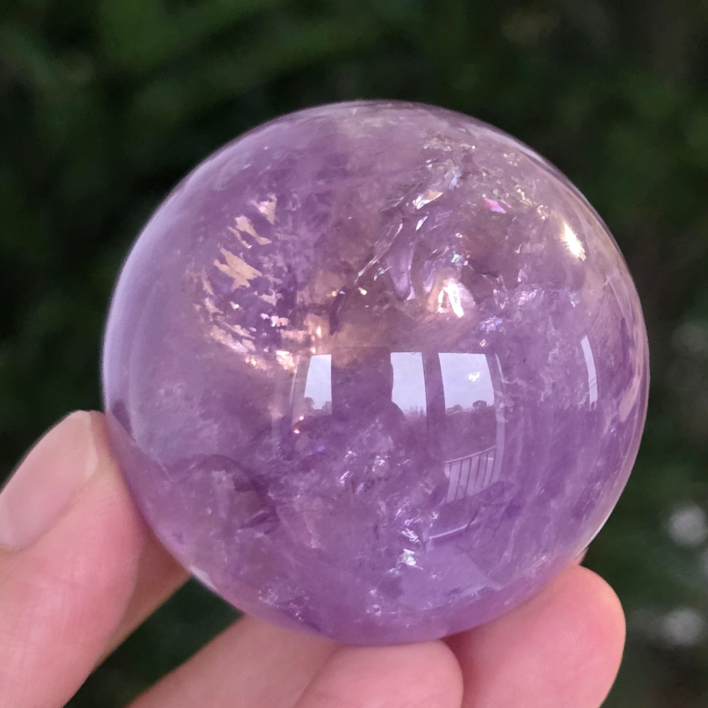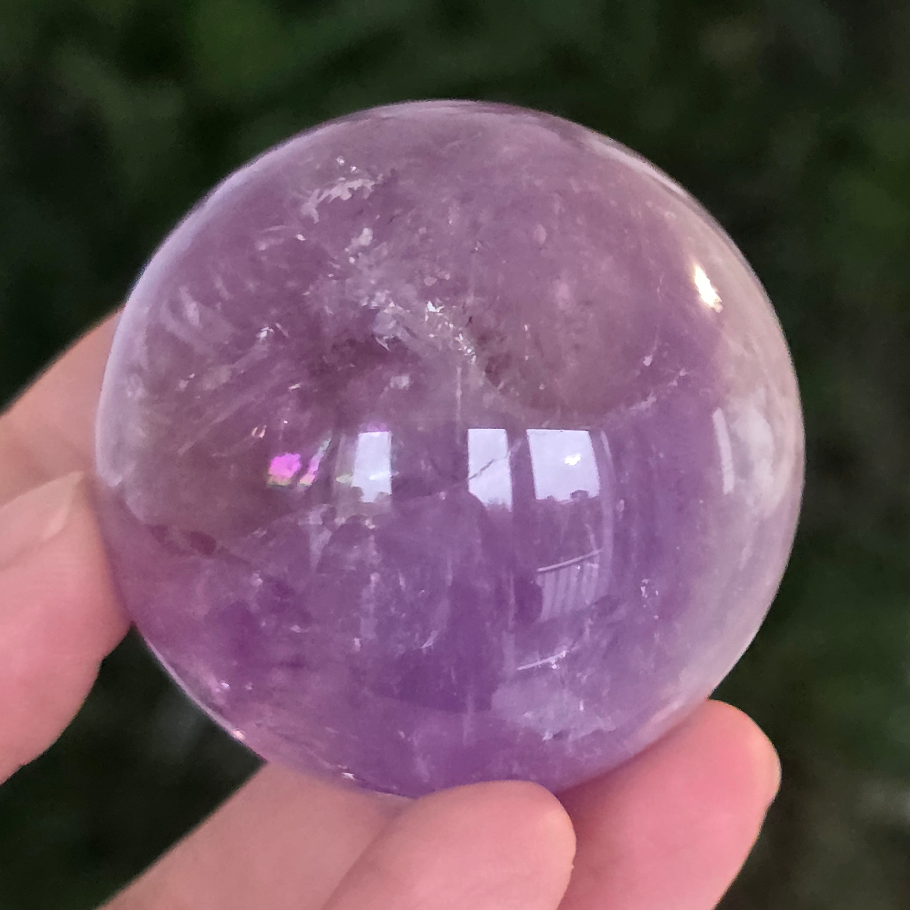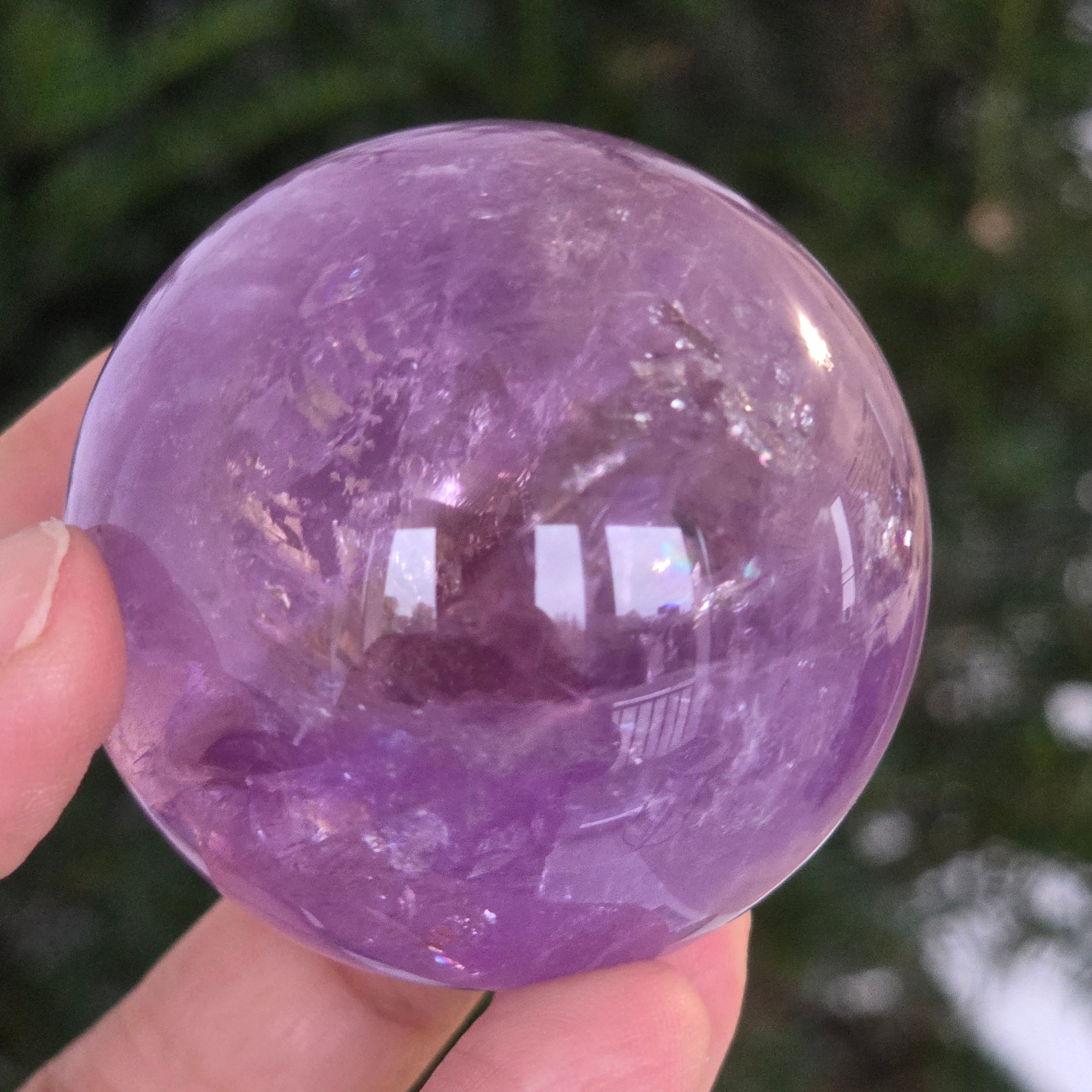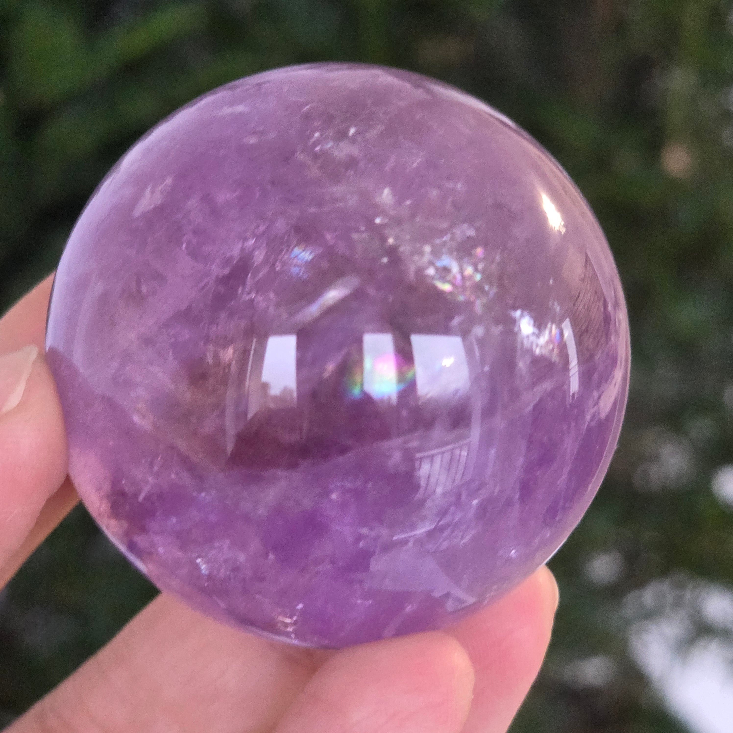 Egy gömb, amely mintha megragadta volna a naplemente égbolt lényegét. Ezt egyedülálló darab AA természetes ametiszt Brazíliából, mély, áttetsző fényt áraszt, a fényben játszó királylila, lila és levendula árnyalataival. A tökéletesen csiszolt felület kiemeli a kristály tisztaságát és természetes textúrájának finomságát – a klasszikus és kiegyensúlyozott szépségű ásványi gyöngyszem.