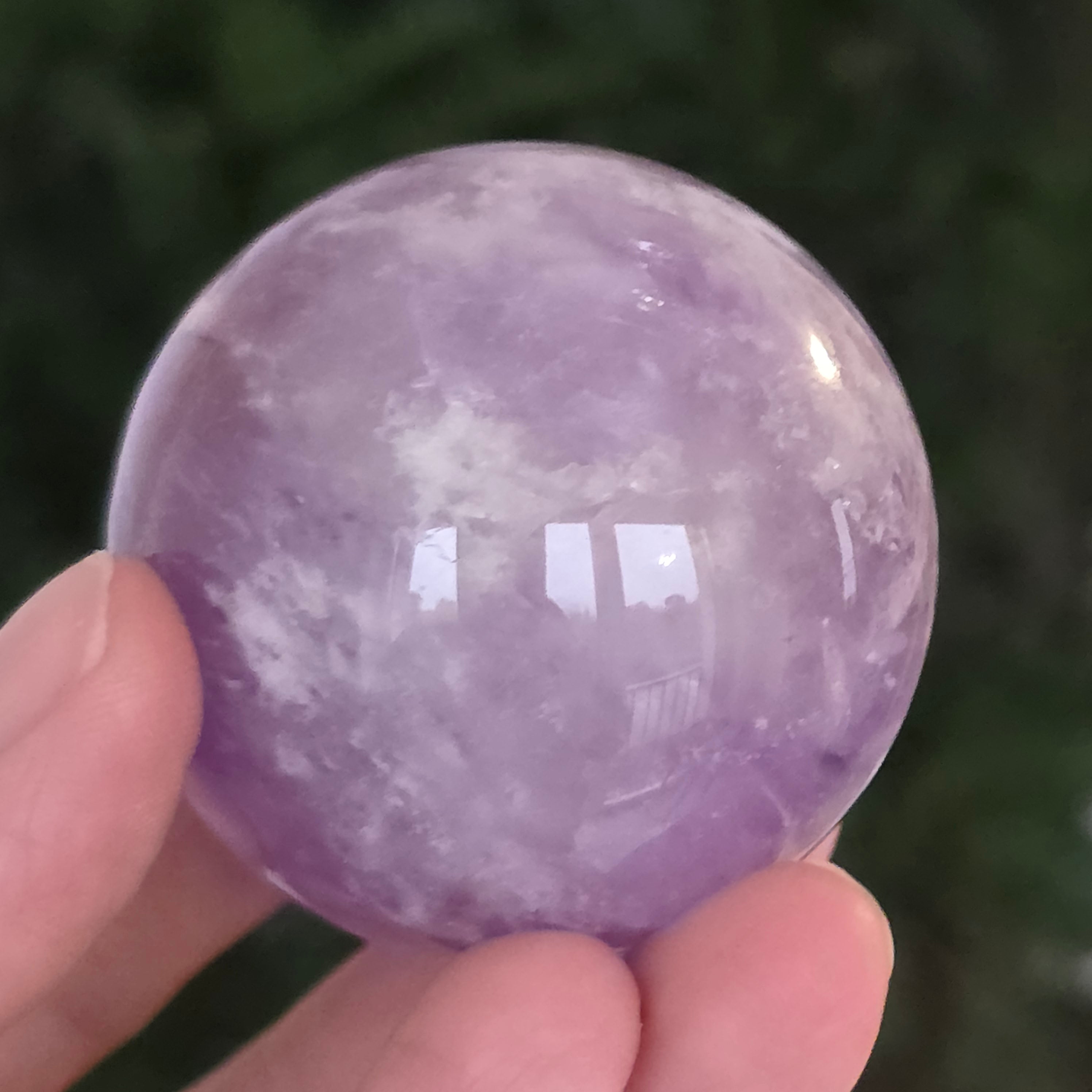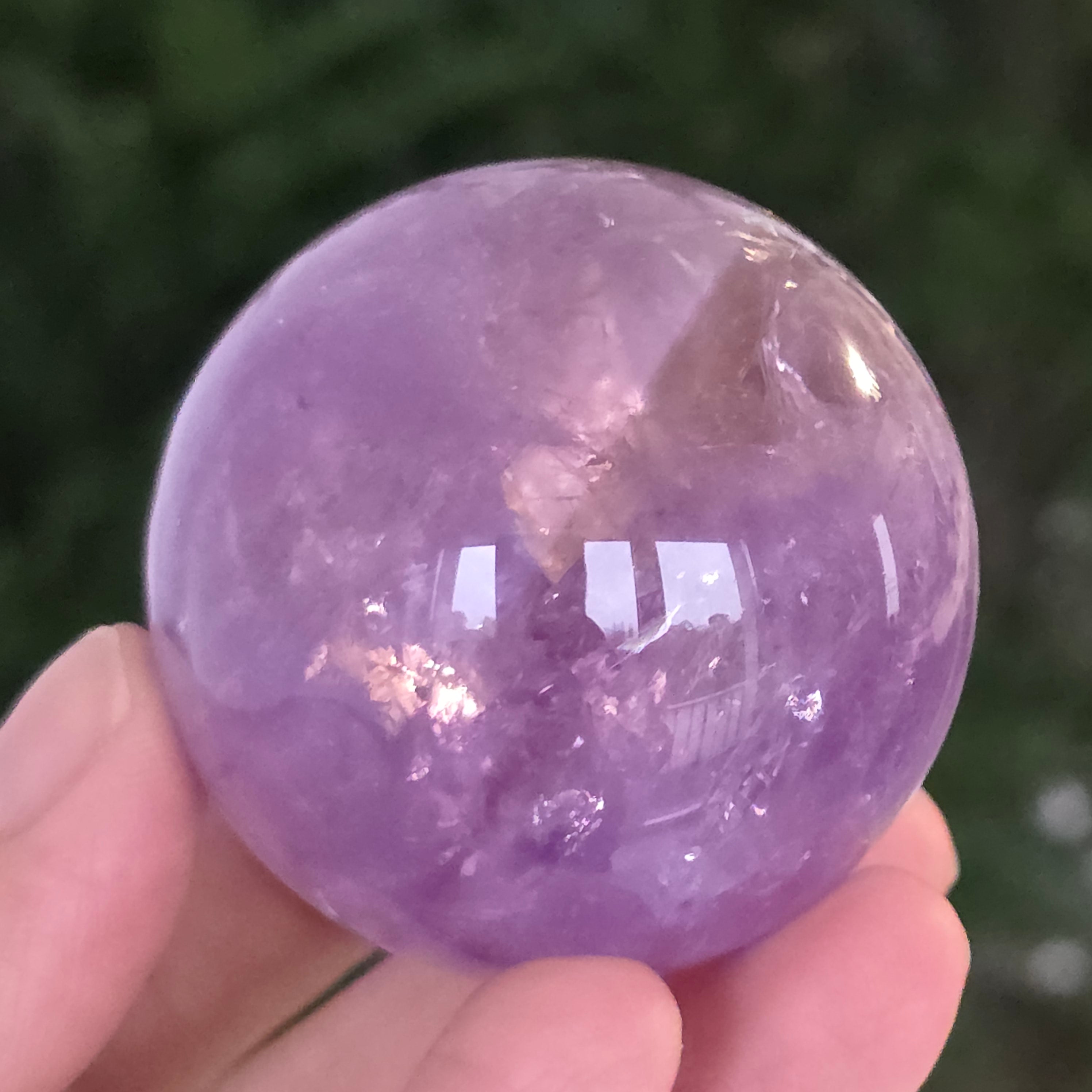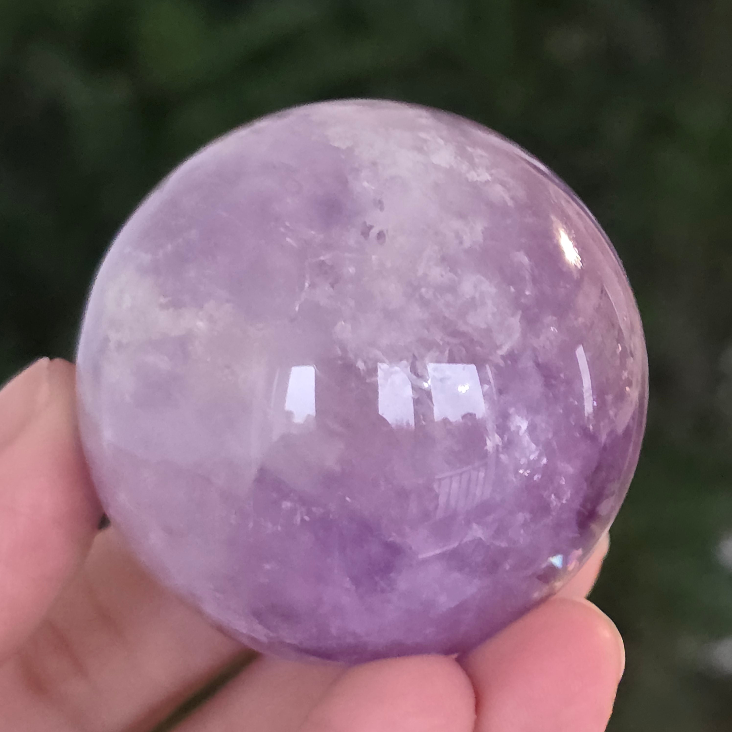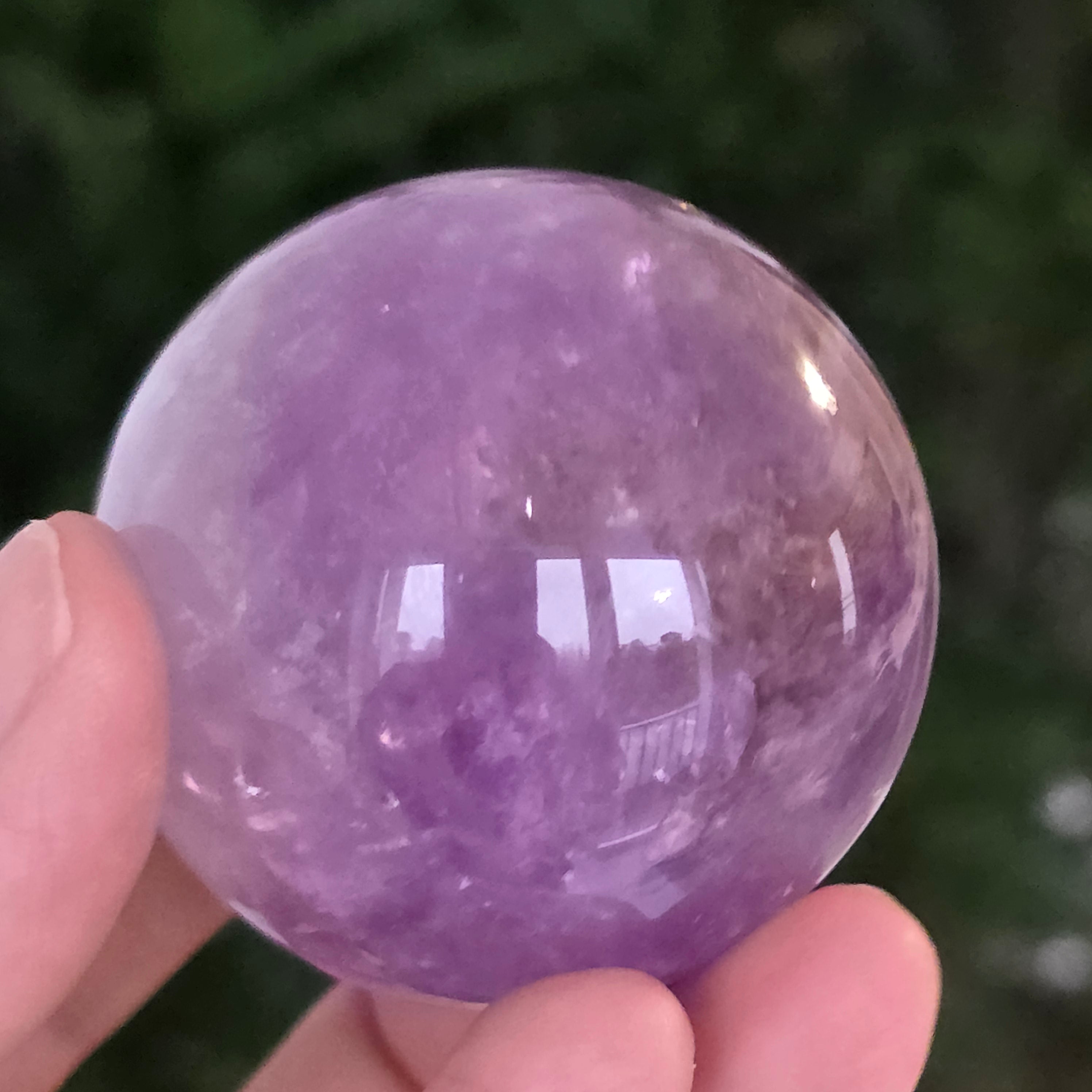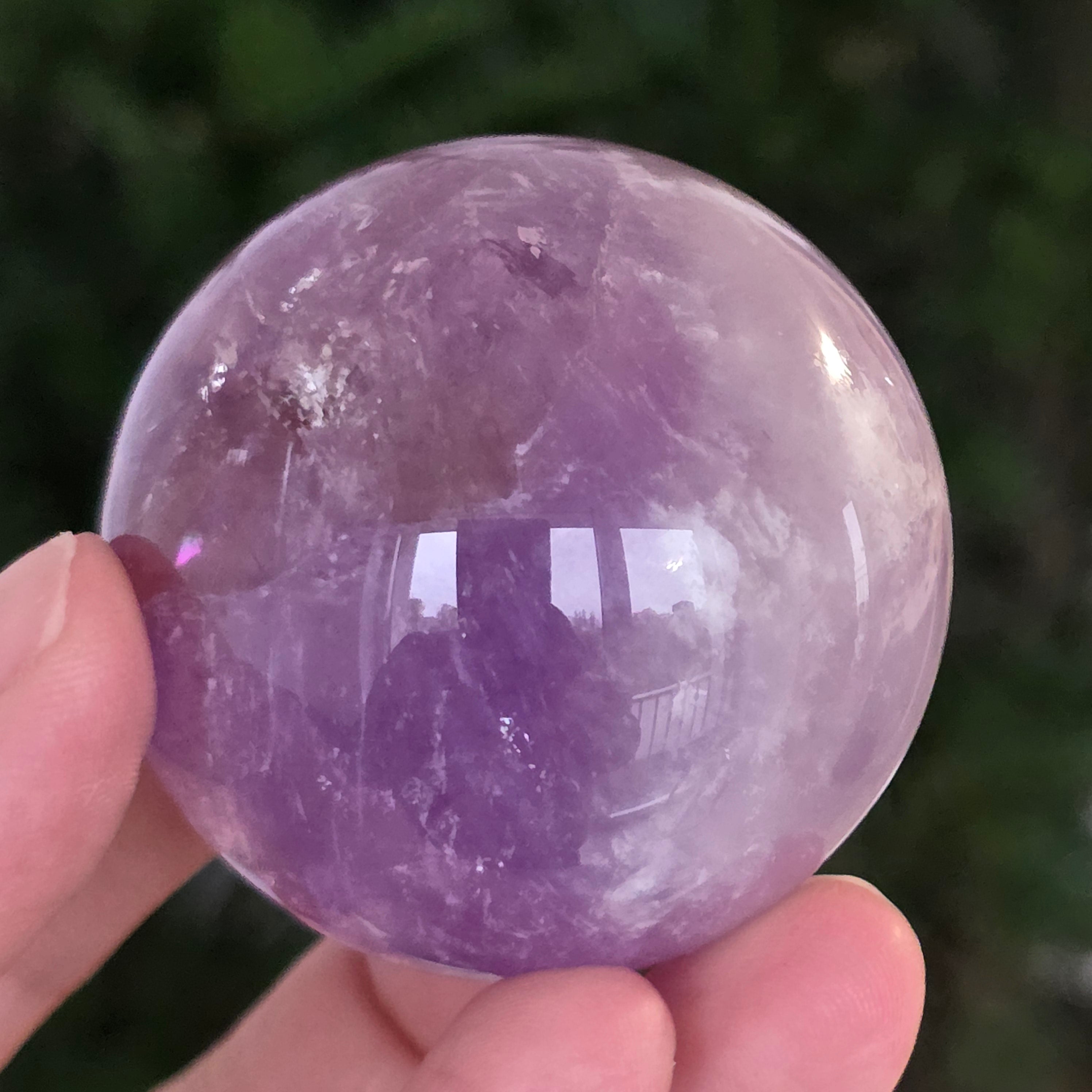 Egy gömb, amely mintha megragadta volna a naplemente égbolt lényegét. Ezt egyedülálló darab AA természetes ametiszt Brazíliából, mély, áttetsző fényt áraszt, a fényben játszó királylila, lila és levendula árnyalataival. A tökéletesen csiszolt felület kiemeli a kristály tisztaságát és természetes textúrájának finomságát – a klasszikus és kiegyensúlyozott szépségű ásványi gyöngyszem.