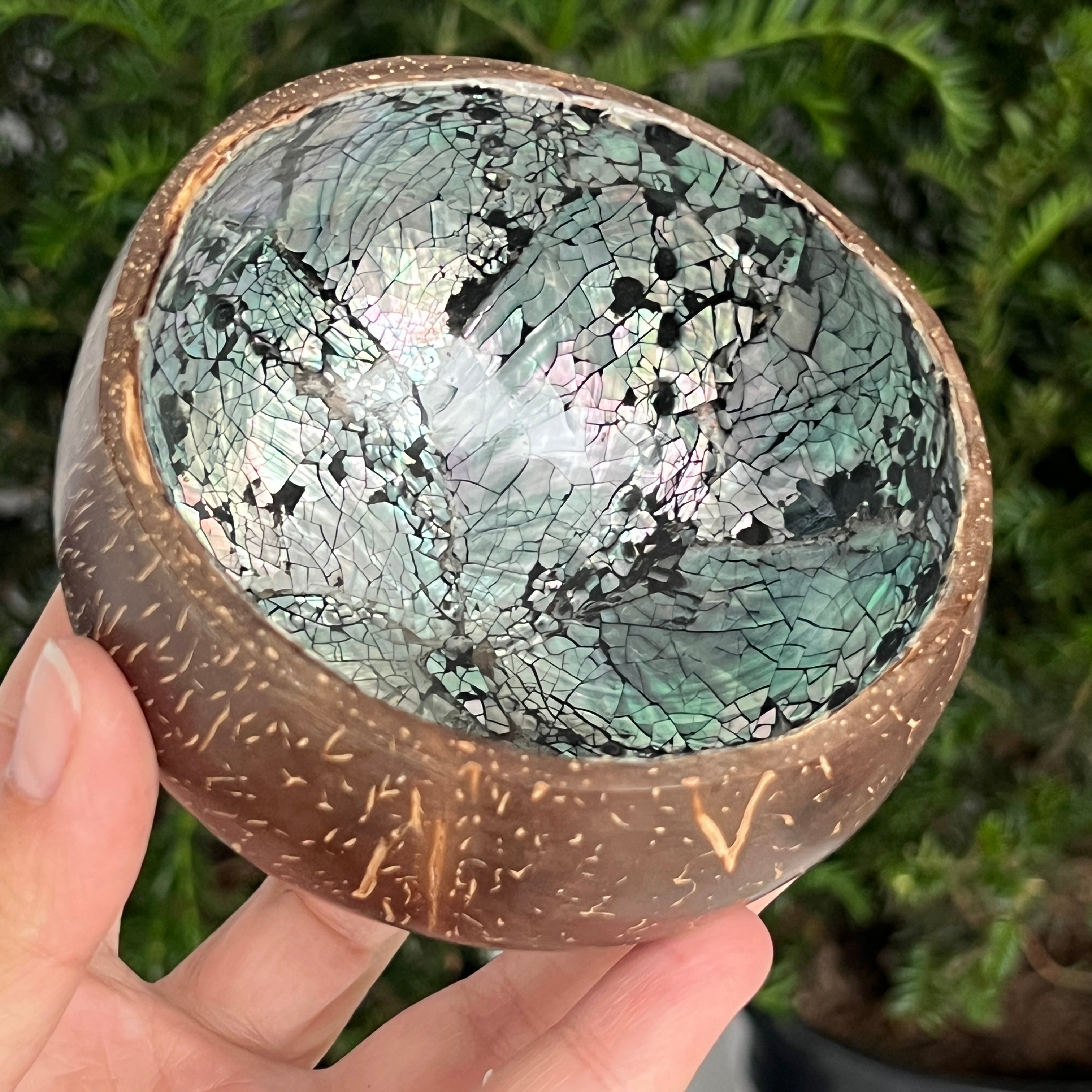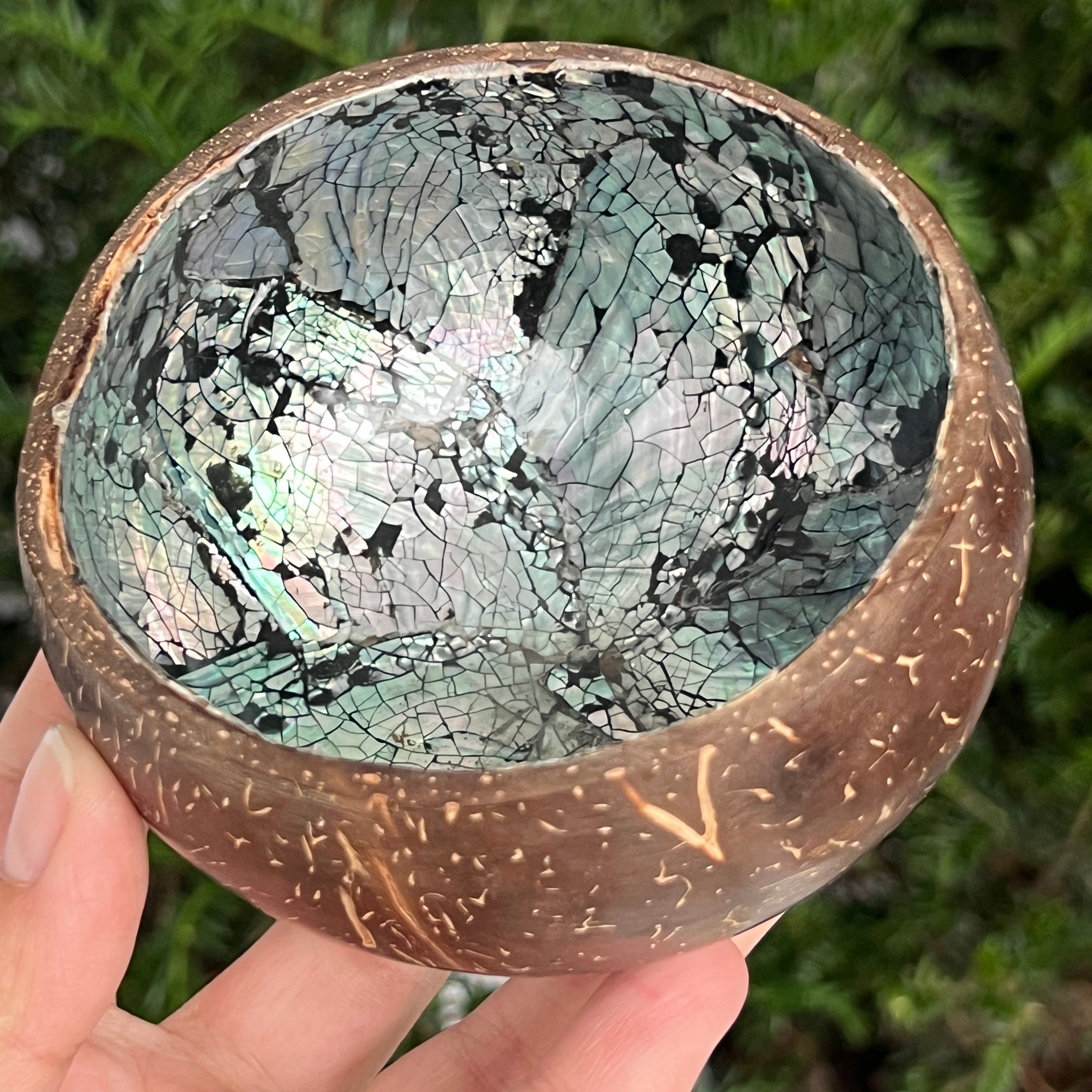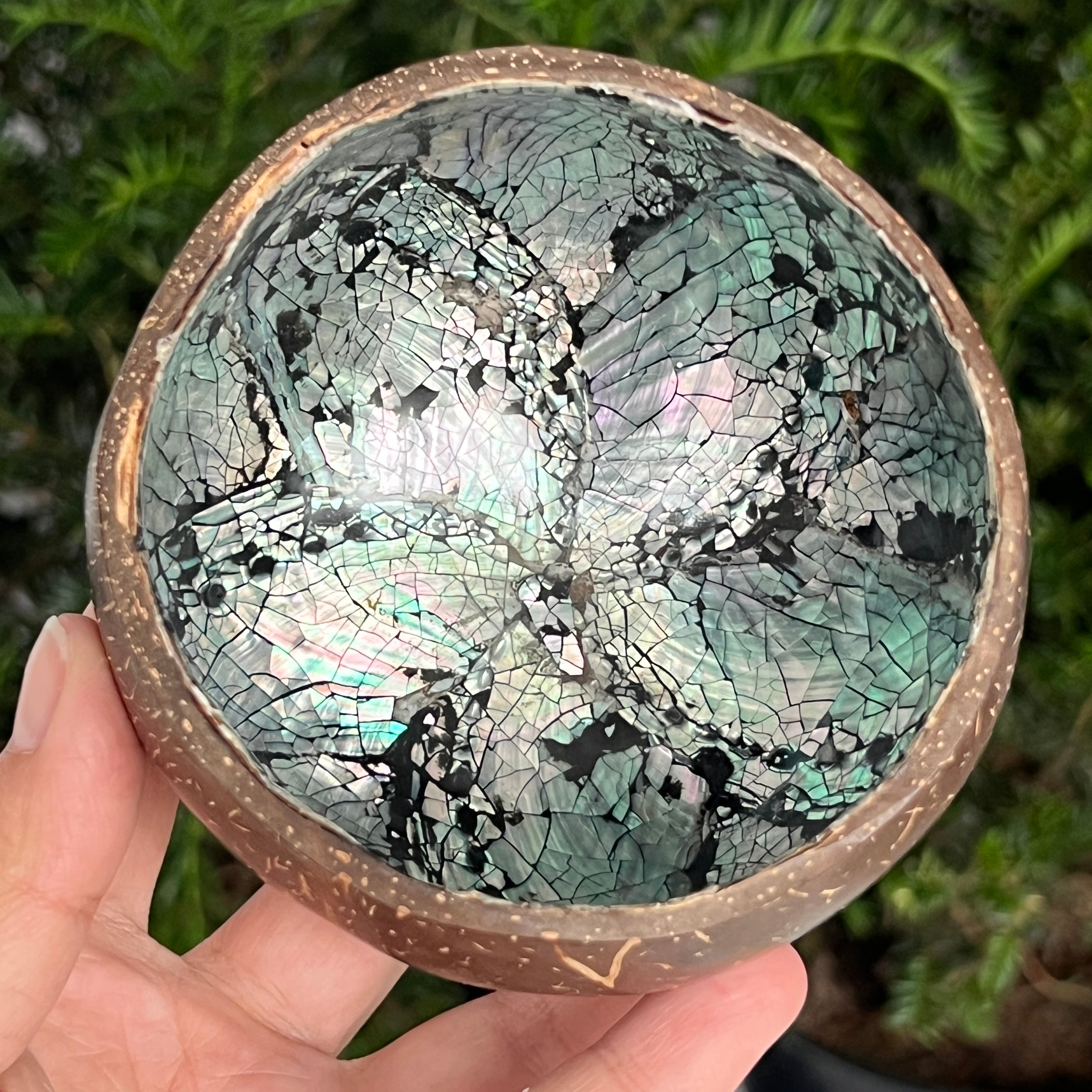 A tál abalone és kókuszkagyló ez egy természetes dekorációs darab, amely egyesíti a föld melegét a tenger ragyogásával. A gyöngyszemek az óceán mélyére emlékeztetnek, és elegáns megjelenést kölcsönöznek minden térnek. Ideális gyűjtőknek, személyes oltárdísznek vagy kristály- és ékszertartónak.