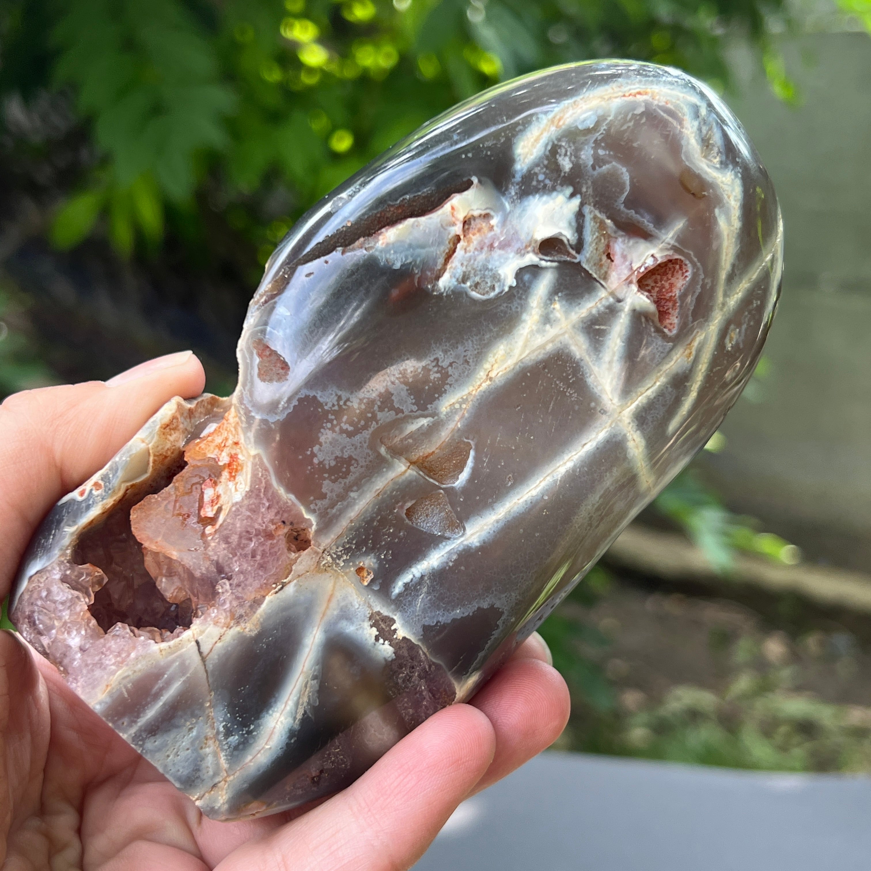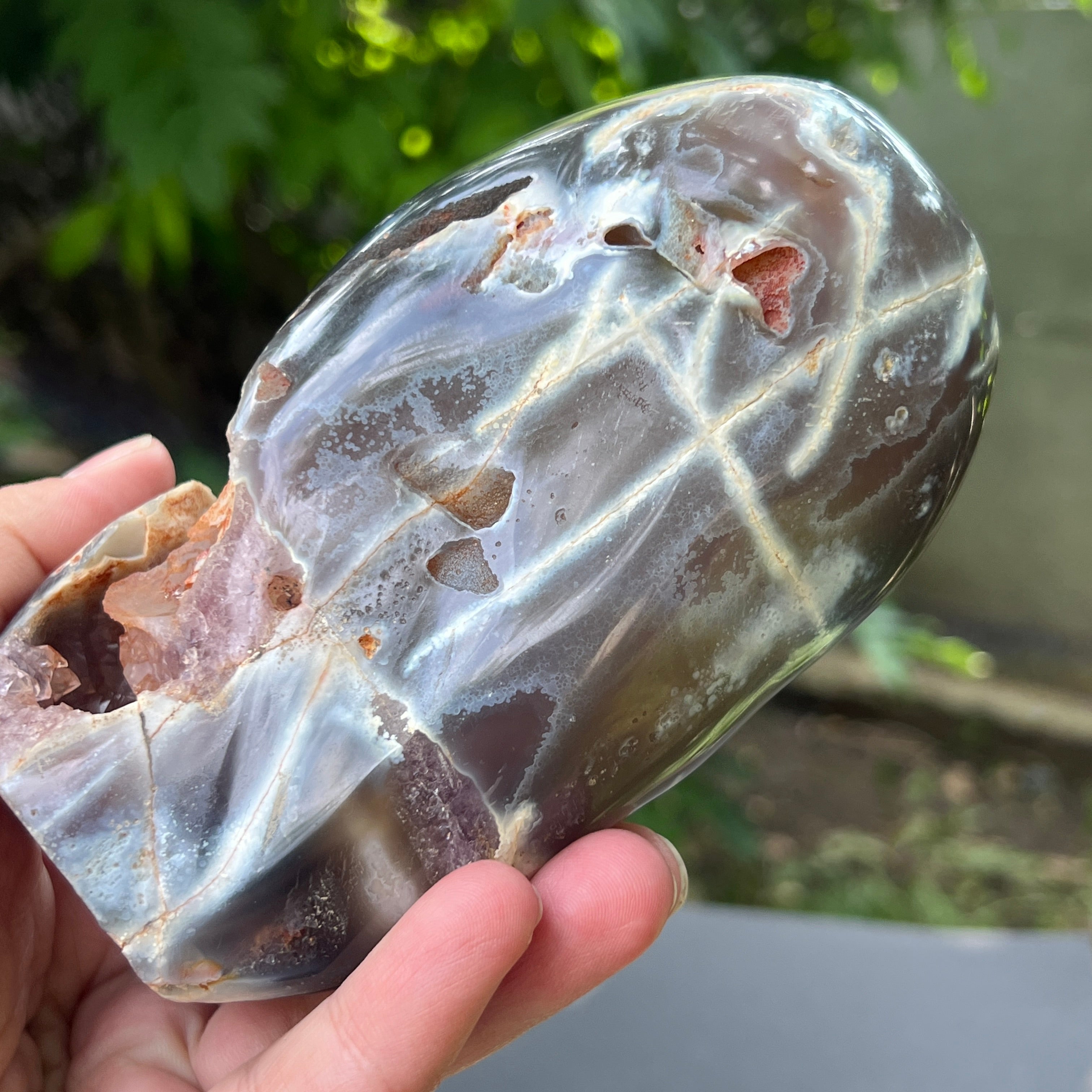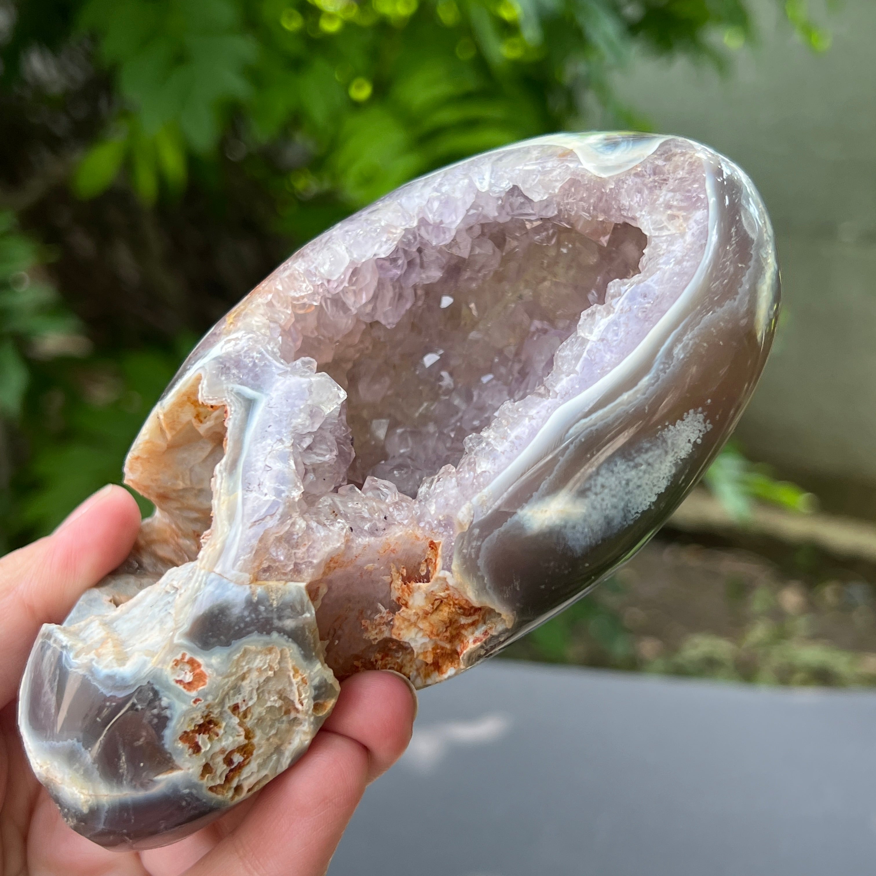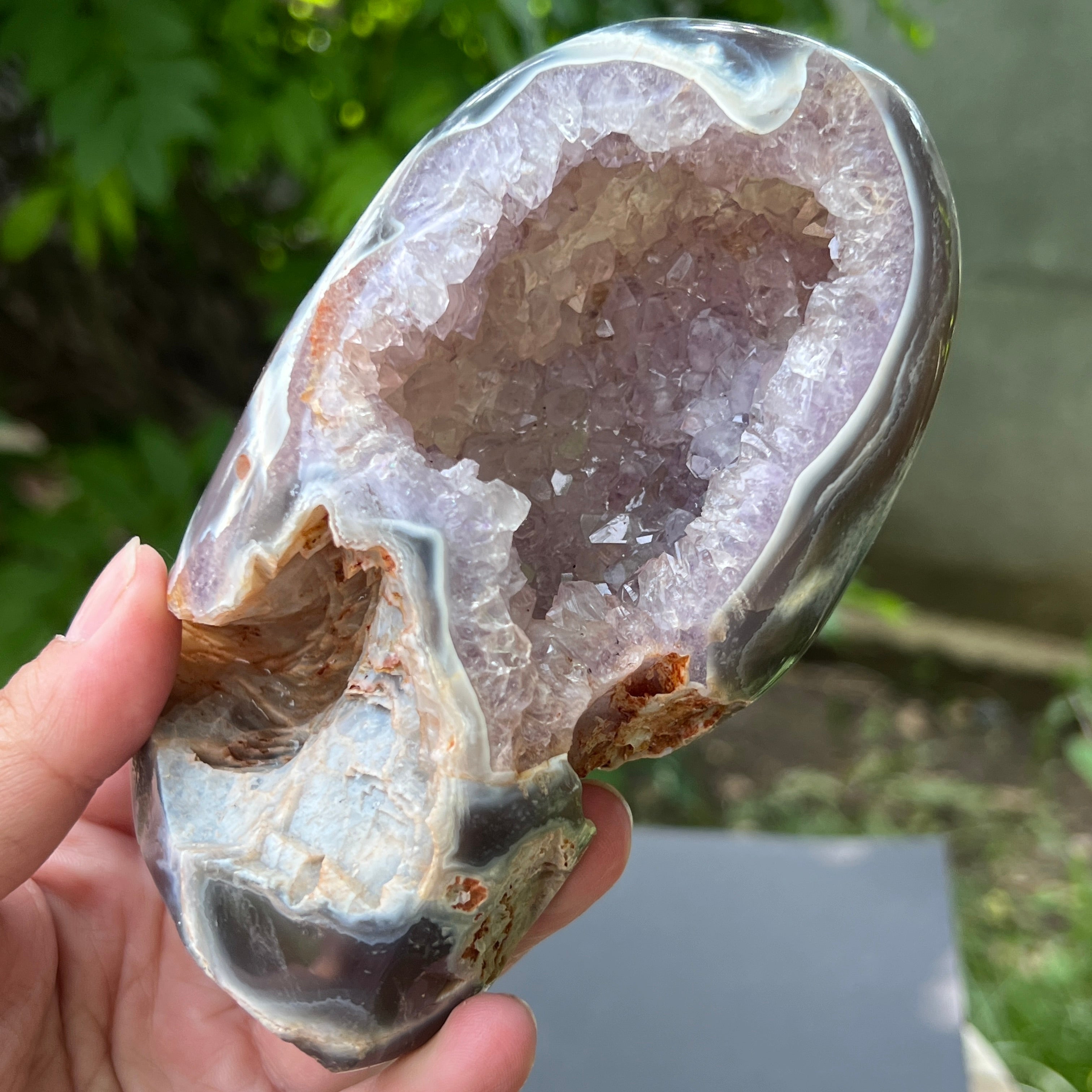 Ez a látványos geod ötvözi az ametiszt mély rejtélyét az achát réteges mozdulatlanságával, feltárva a természet kincsét, amelyet idő és energia faragott. Rejtett belső oldalának minden részlete – csillogó ametisztkristályok lila árnyalatokban – az achát finom és stabil kontúrja kiemeli, mint egy bölcsesség kérge által védett szív.