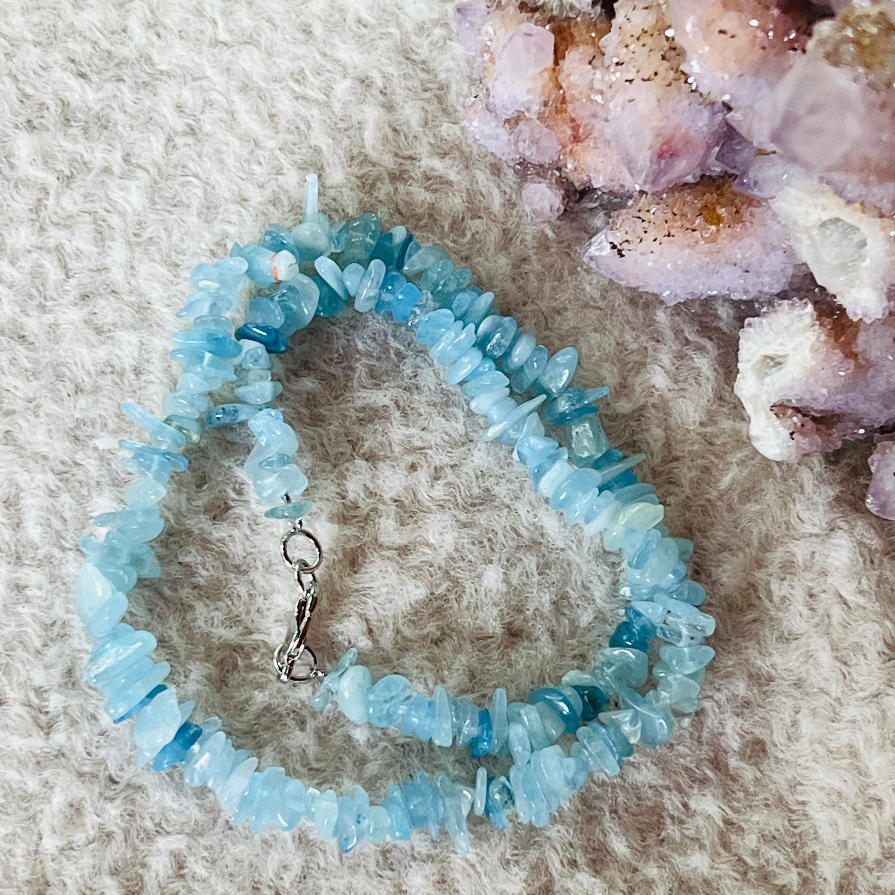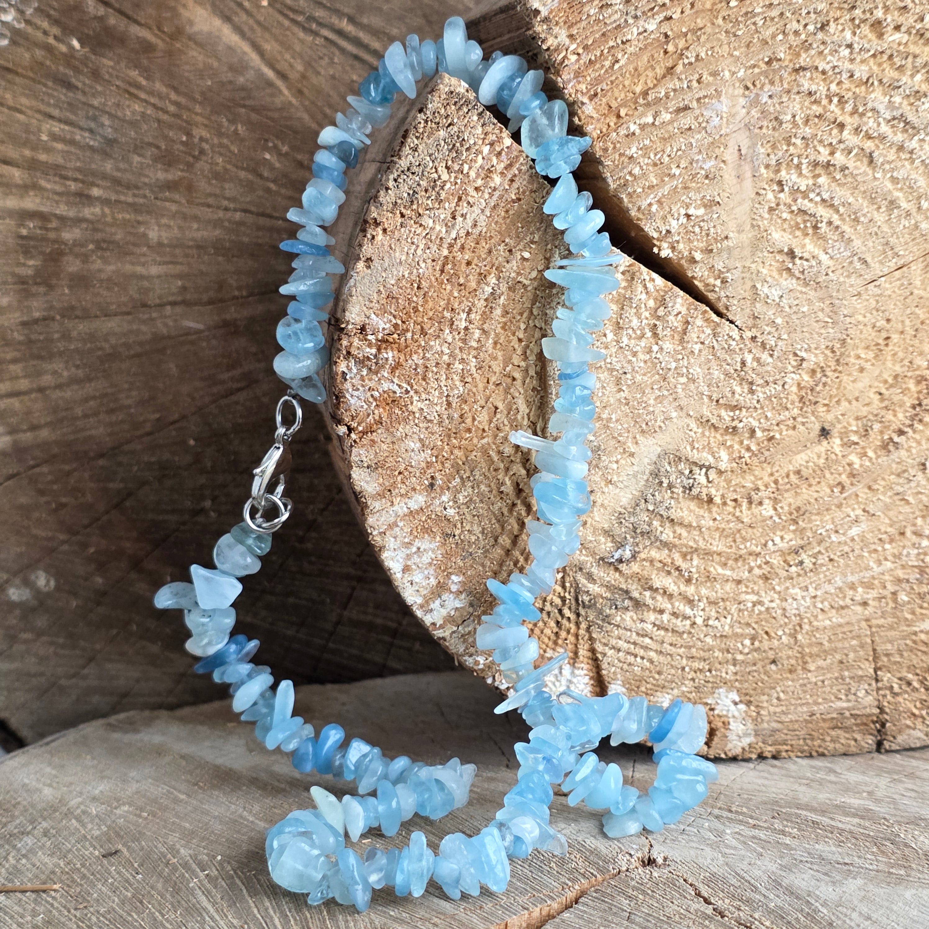 Hosszú akvamarin chips nyaklánc, körülbelül 45 cm hosszú