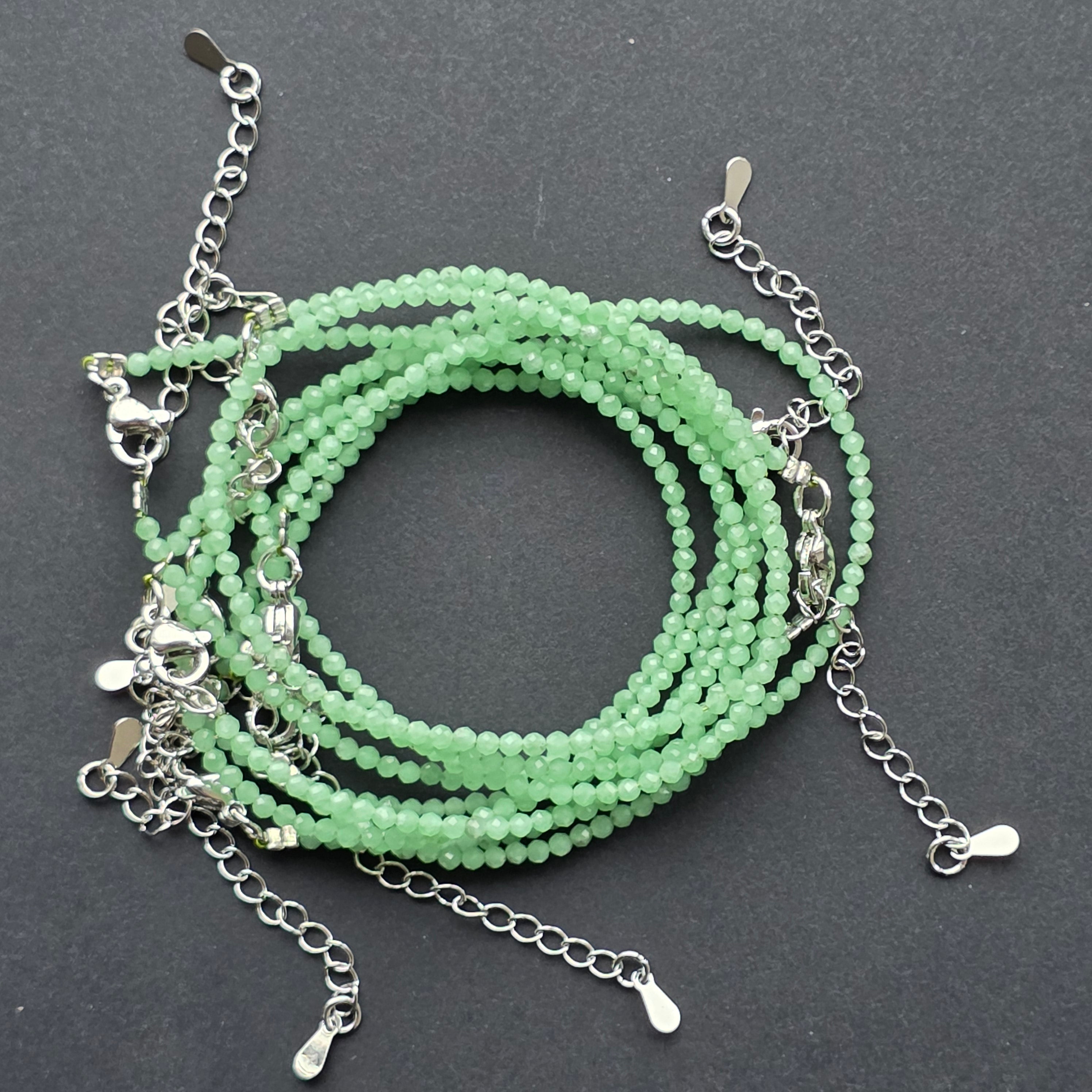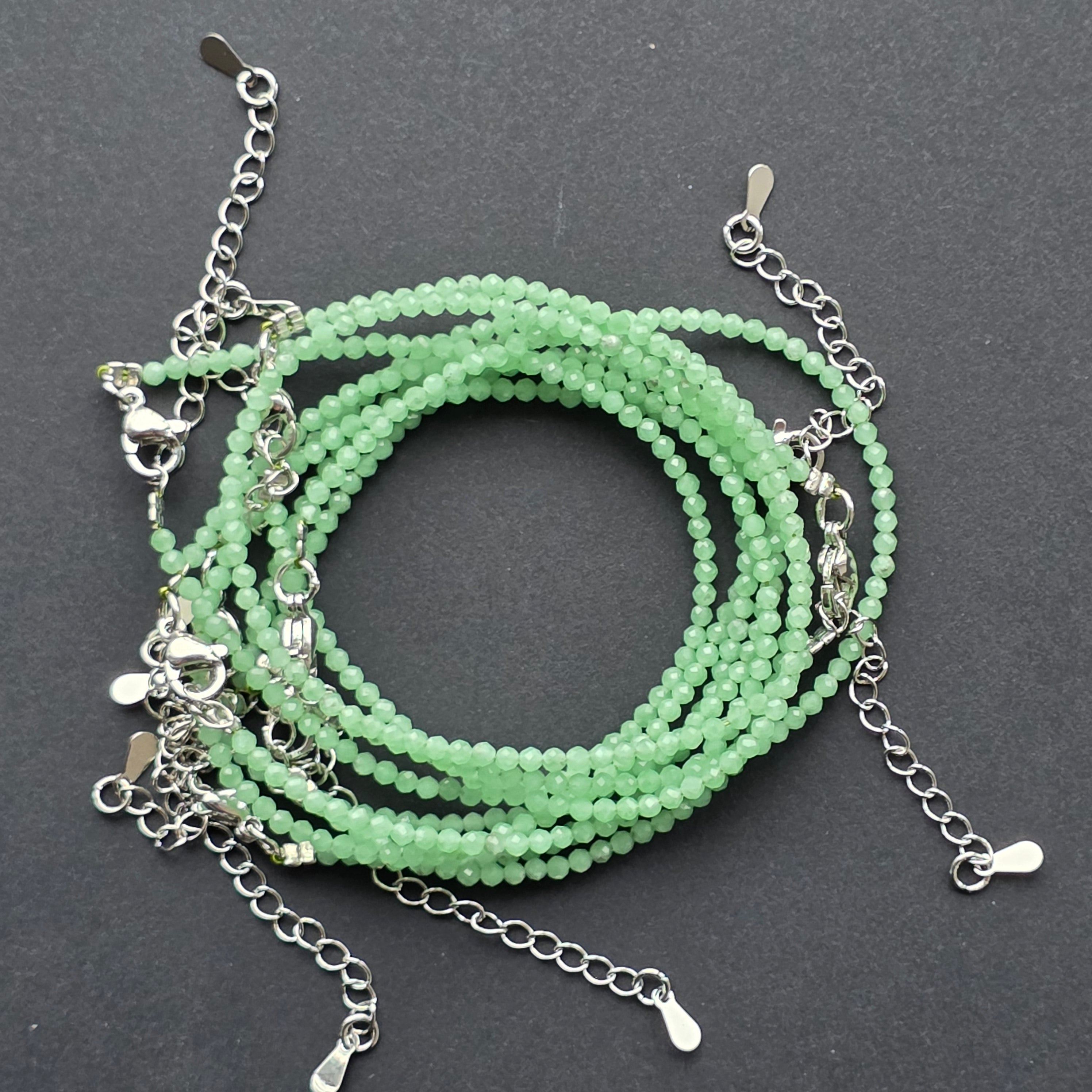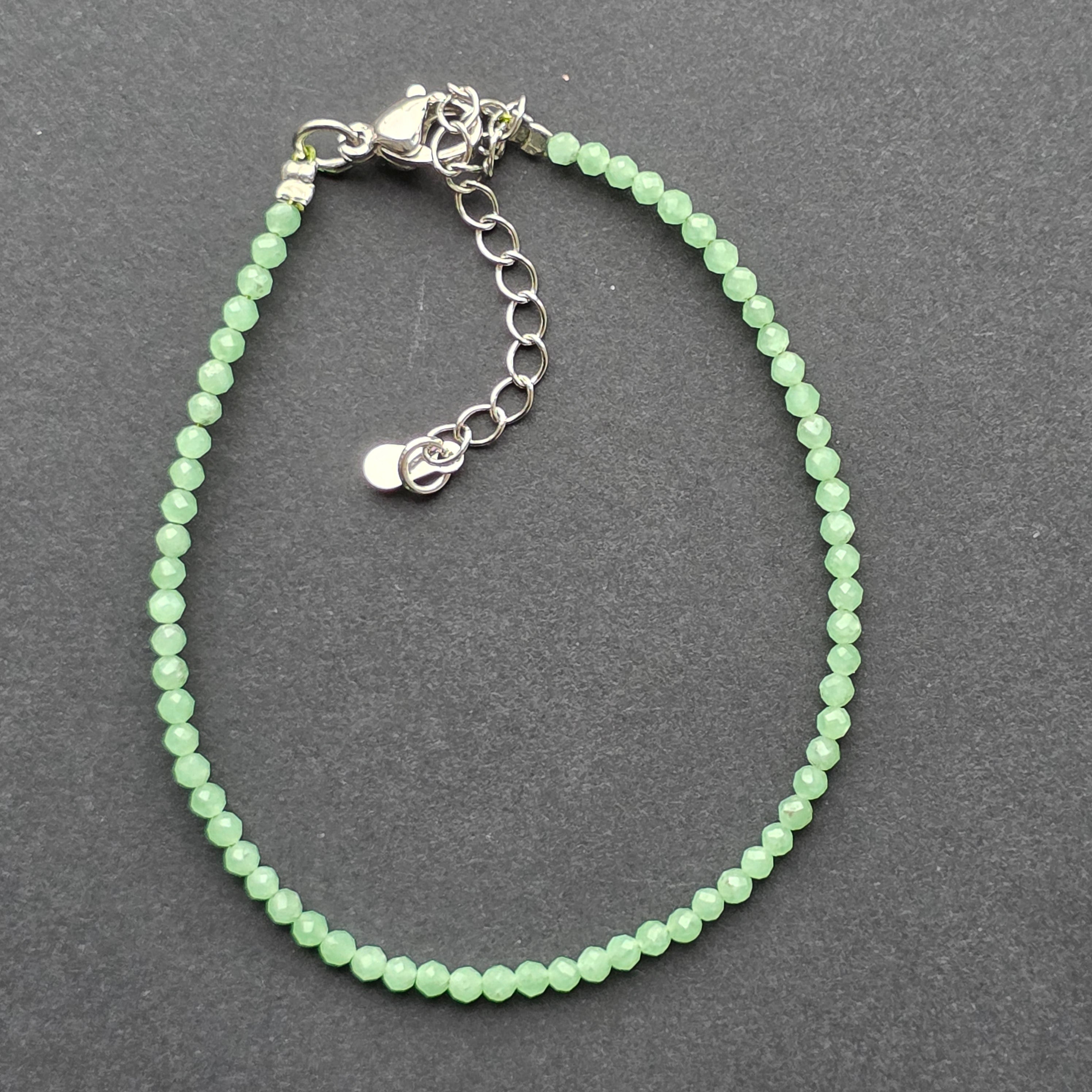 Egy finom, nyugodt karkötő, amely új jade apró gyöngyeiből áll — egy olyan kő, amely annyira ragyogó, mintha magában őrizné a tavasz leheletét. A 2 mm-es gyöngyök apró csiszolt felületei játékosan fogják a fényt, majdnem észrevehetetlenül, mint egy belső ragyogás, ami nem az elragadtatásra törekszik, hanem a megnyugtatásra.