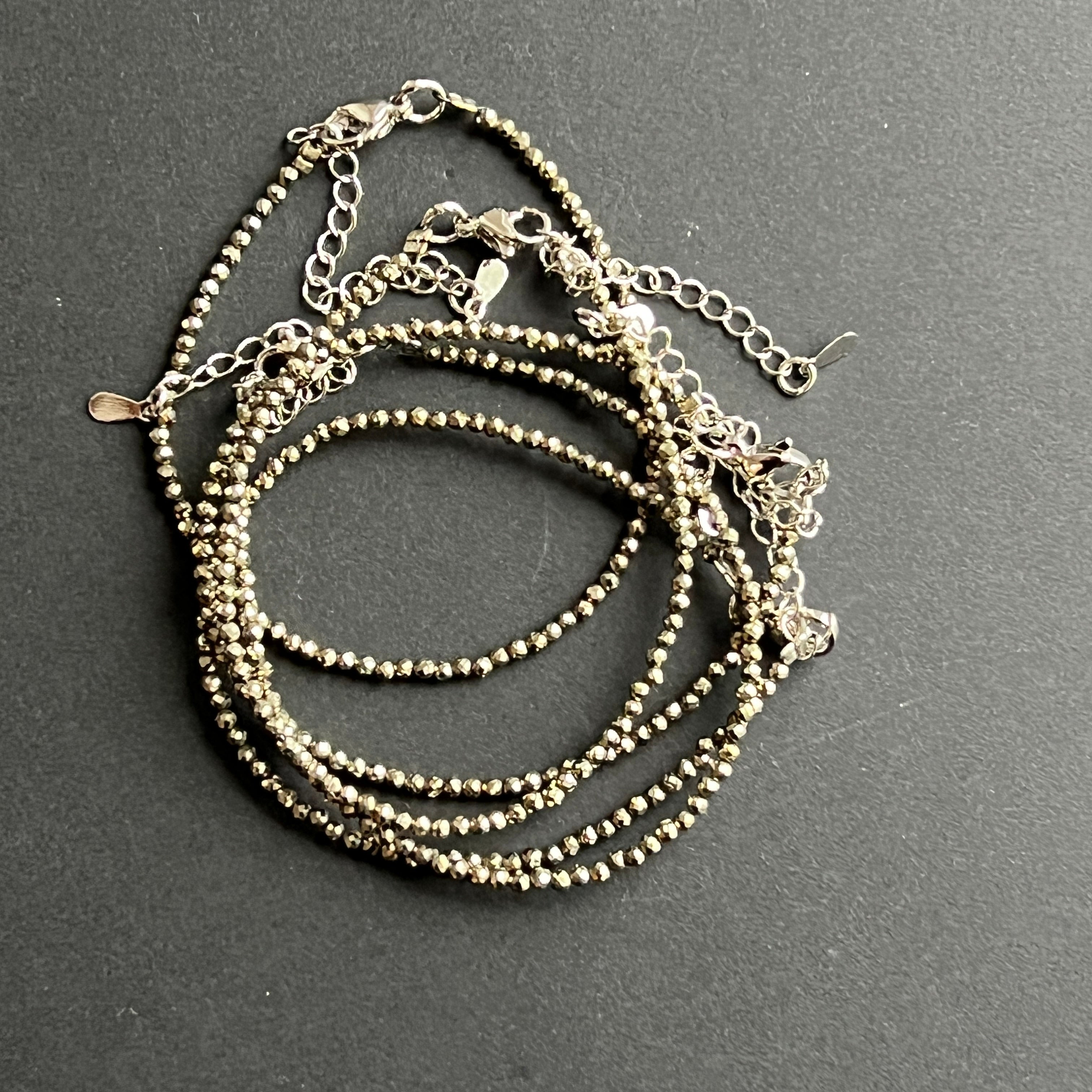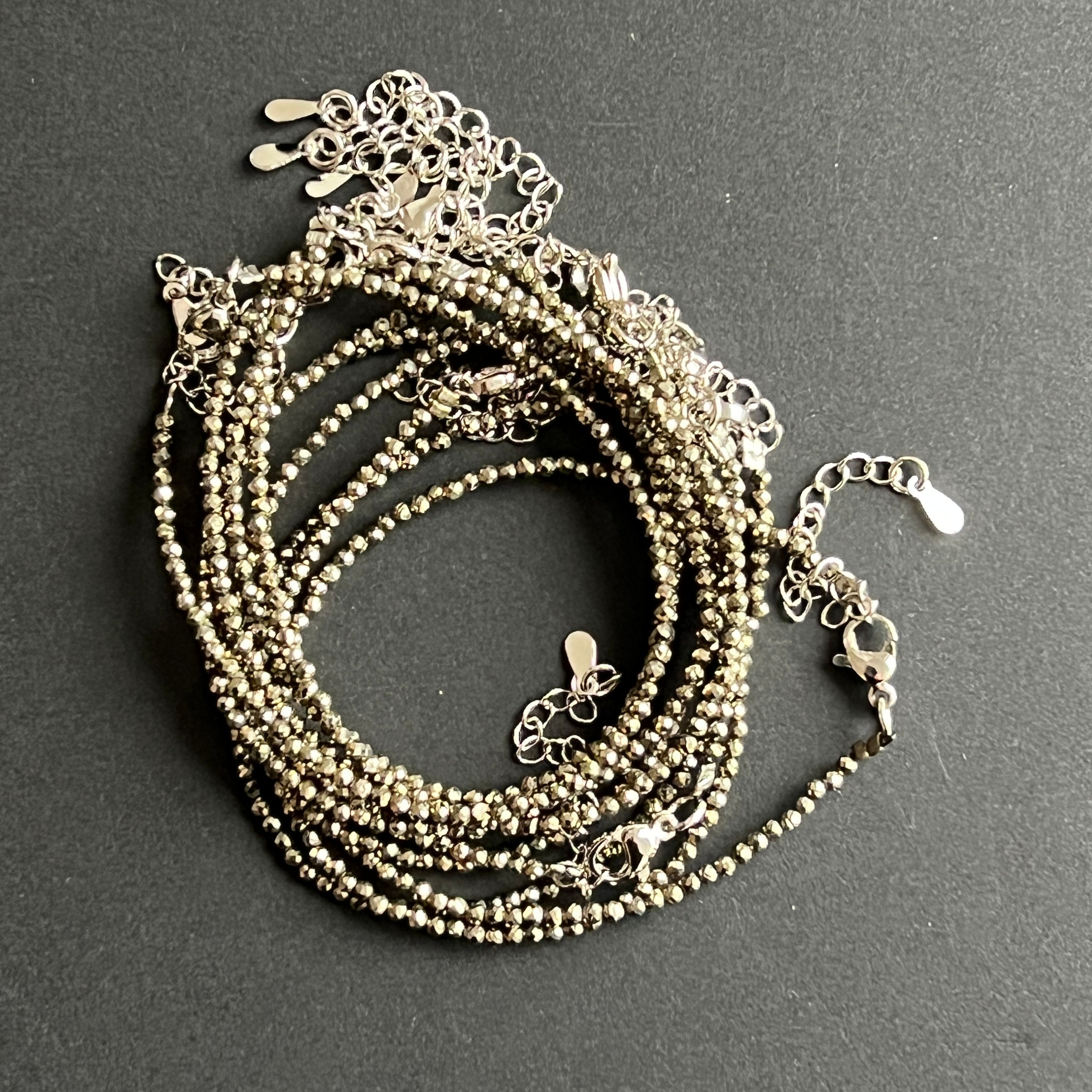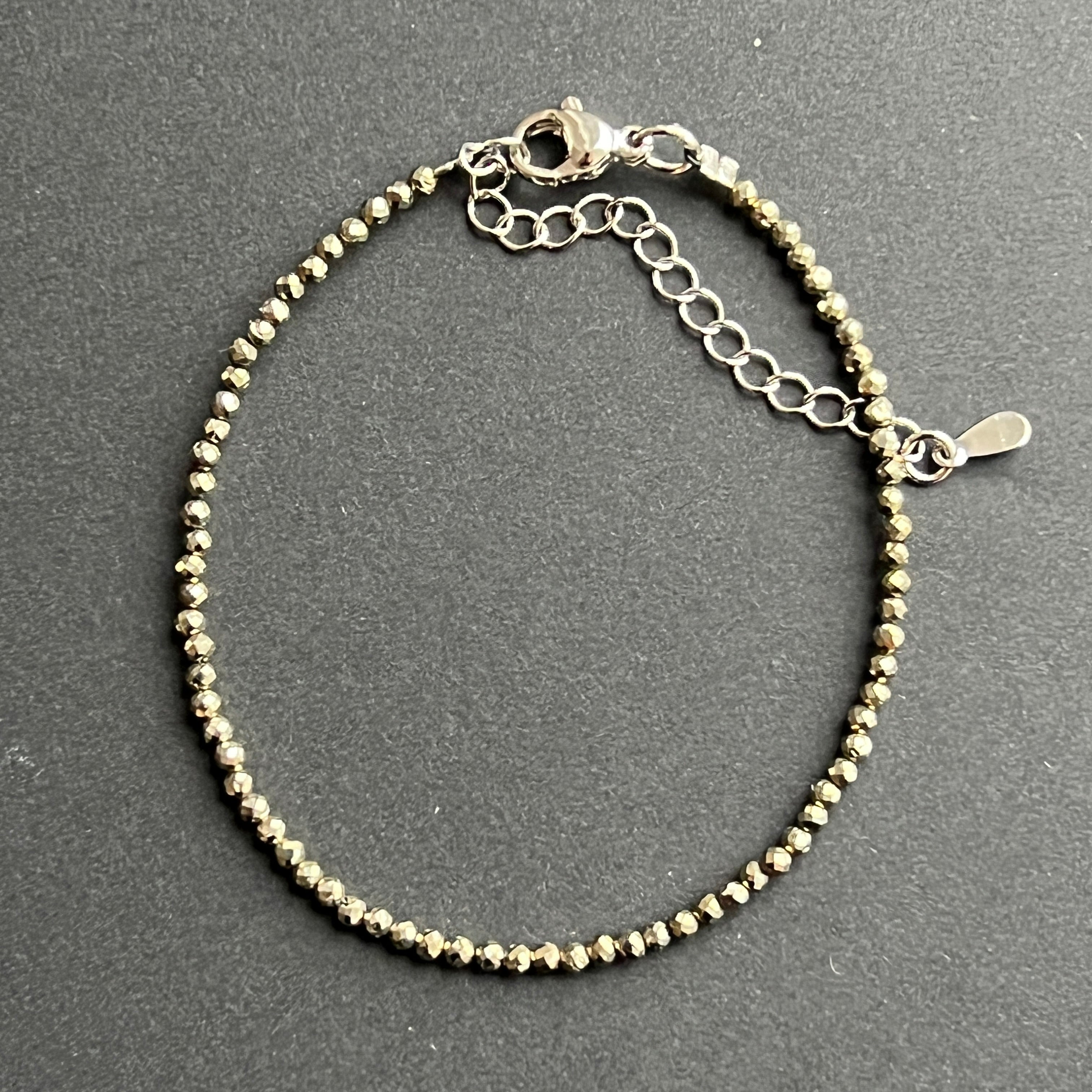Ebben a finom karkötőben a piritgyöngyök mintha megragadnák a fémes tűz lényegét: arany szikrák, hideg és meleg tükröződések egyszerre, belső fény, amely diszkréten pulzál a kéz minden mozdulatára. A 2 mm-es gyöngyök apró oldalai a piritet csillogó, elegáns és finom csipkévé alakítják.