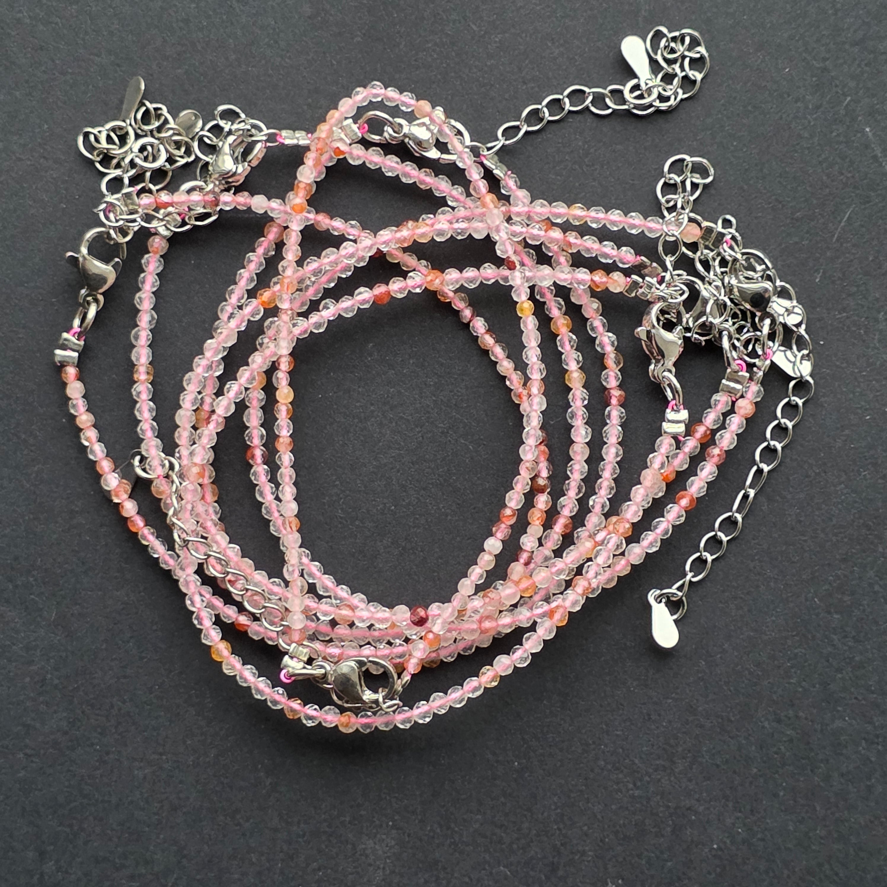 A rózsakvarc az egyik legkedveltebb kő az ásványok világában, amely finomságáról és meleg fényéről ismert. Ebben a „vegyes” változatban minden egyes gyöngy enyhén eltérő árnyalatot hordoz — a nagyon világos tejrózsaszíntől a púderes rózsaszínig vagy áttetszőig, mint egy nyugodt reggel tükröződései. A mindössze 2 mm-es finom méretű csiszolt gyöngyök visszafogottan ragyognak, mint a lágyan pulzáló cseppek.