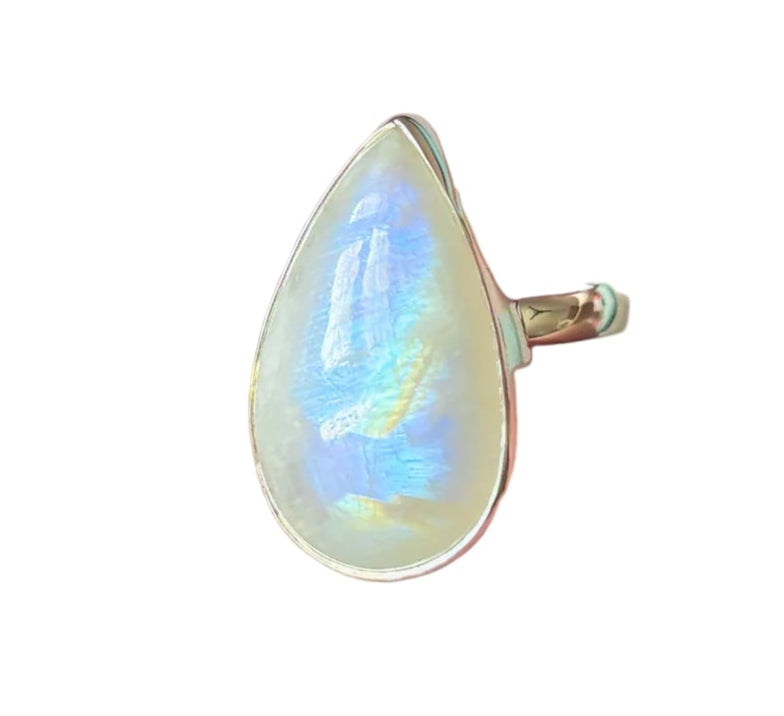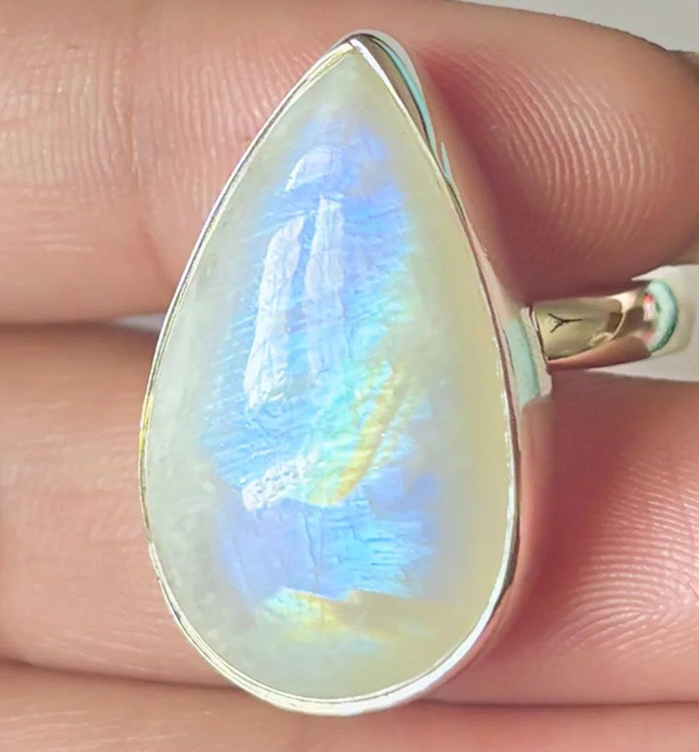 Egy egyedi gyűrű Szivárvány Holdkő, ami rejtélyt és kifinomultságot sugároz. A kék és arany visszatükröződések finom fényhullámokban tárulnak fel, mint egy napfogyatkozás, amely az árnyék és a fényesség között táncol.