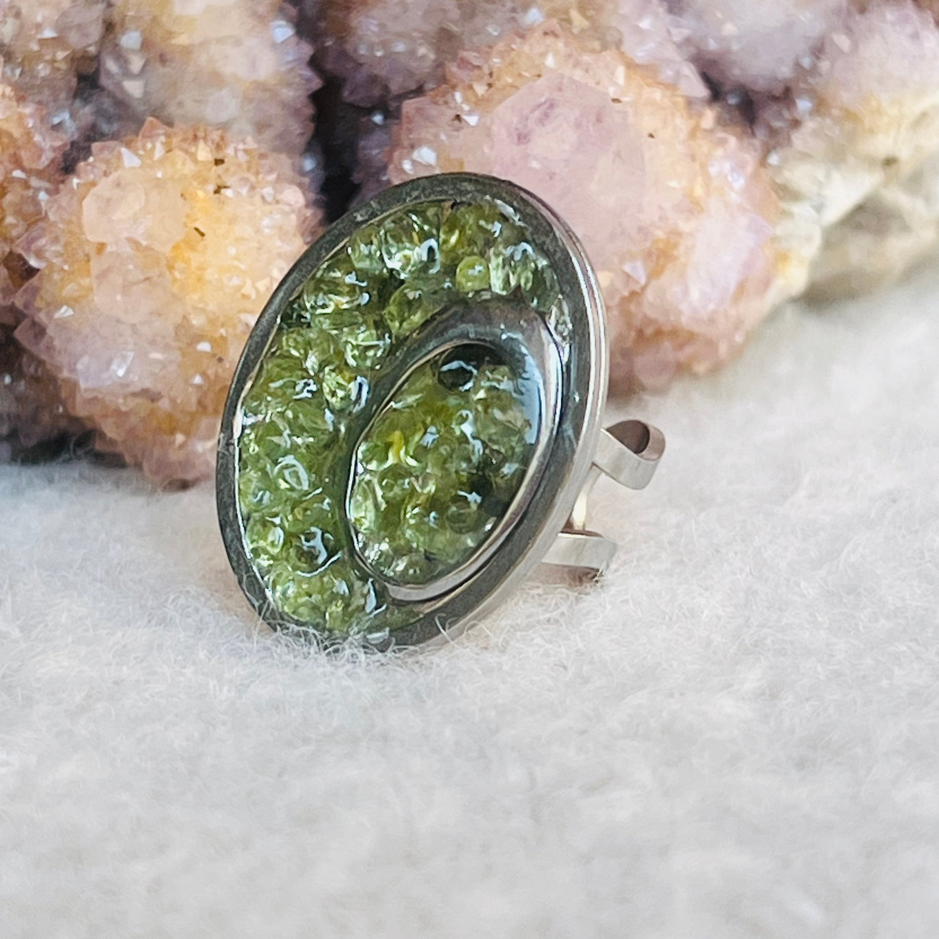 Anyagok: peridot, rozsdamentes acél, gyanta