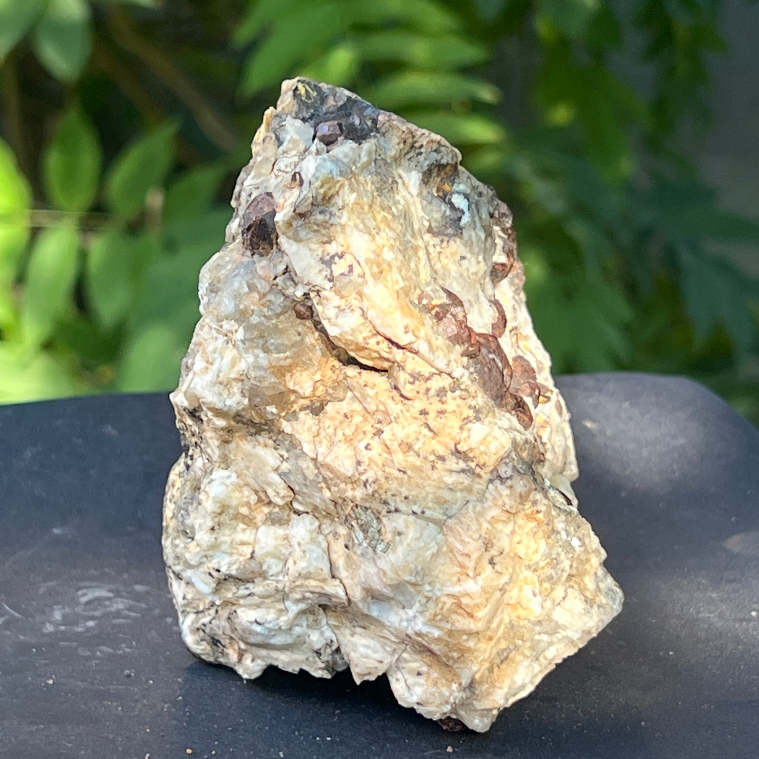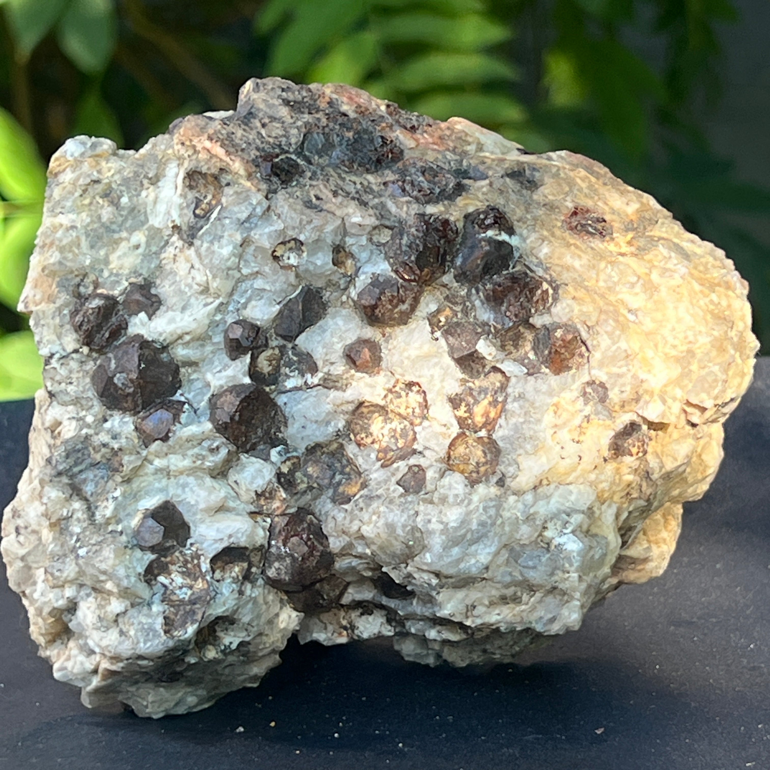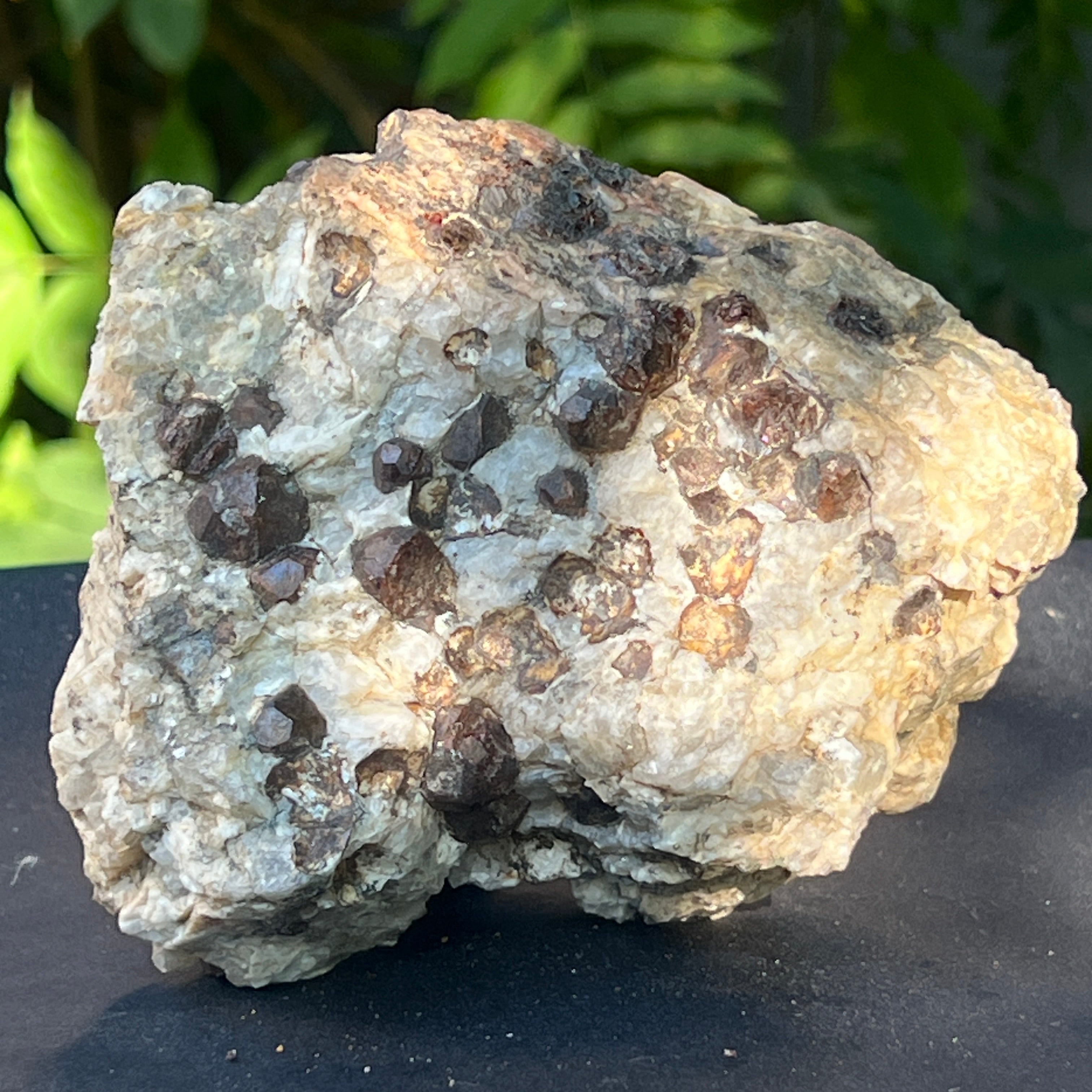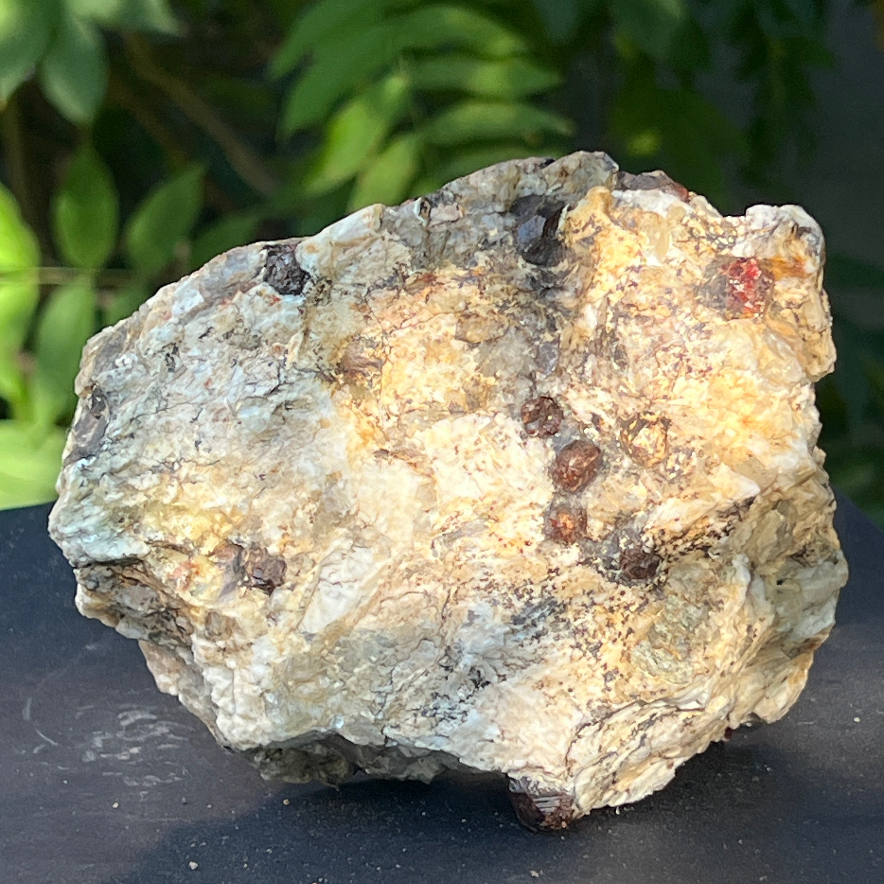 A barnás-vörös színű almandin gránát kristályok természetes módon ágyazódnak a kvarc és a földpát mátrixba, feltárva a geológiai folyamatot, amely során keletkeztek. A mélység alatti nyomás és hő hatására ezek az ásványok a föld átalakulásainak tanúivá váltak. A világos mátrix kiemeli az anya kő és a gránátok mély fényének kontrasztját.