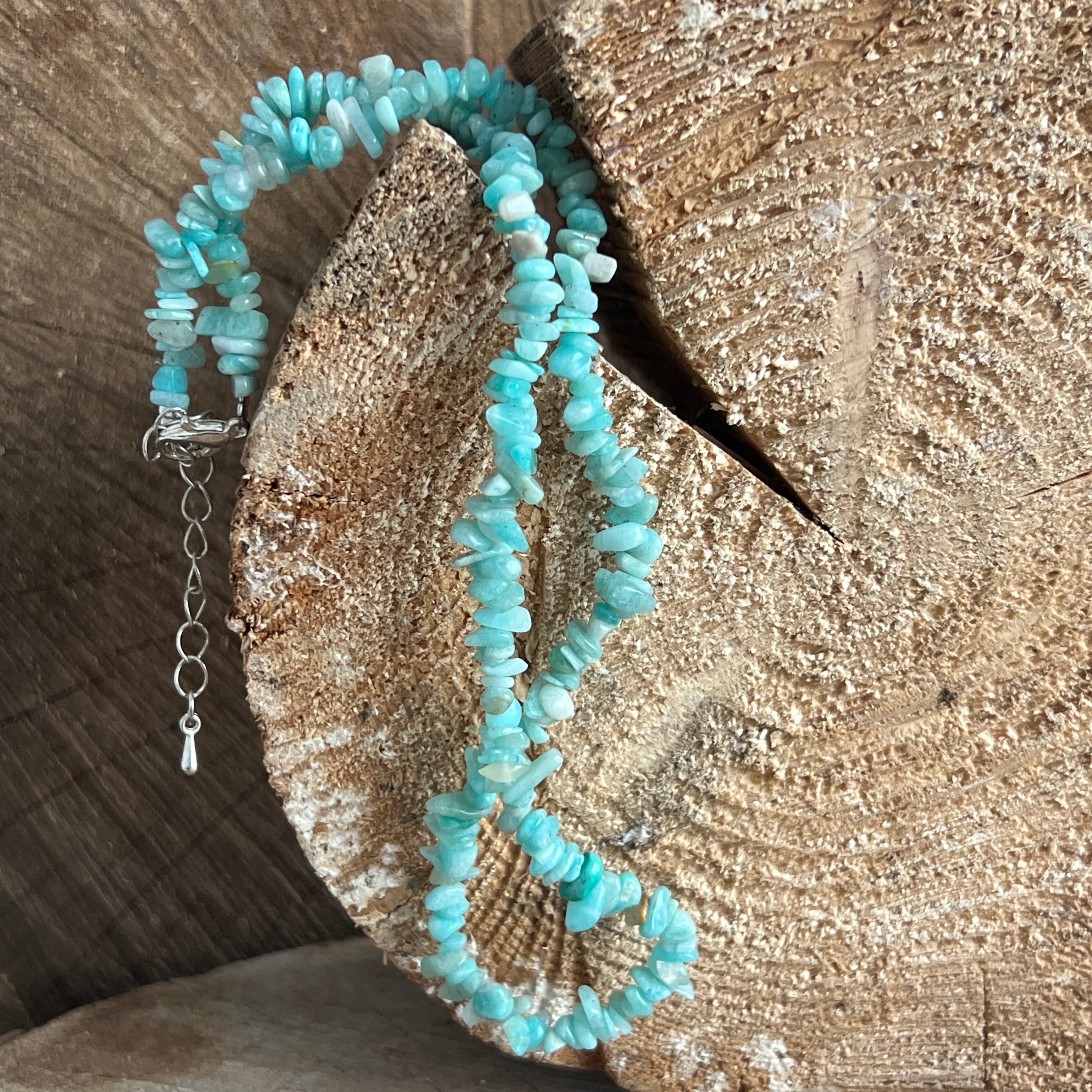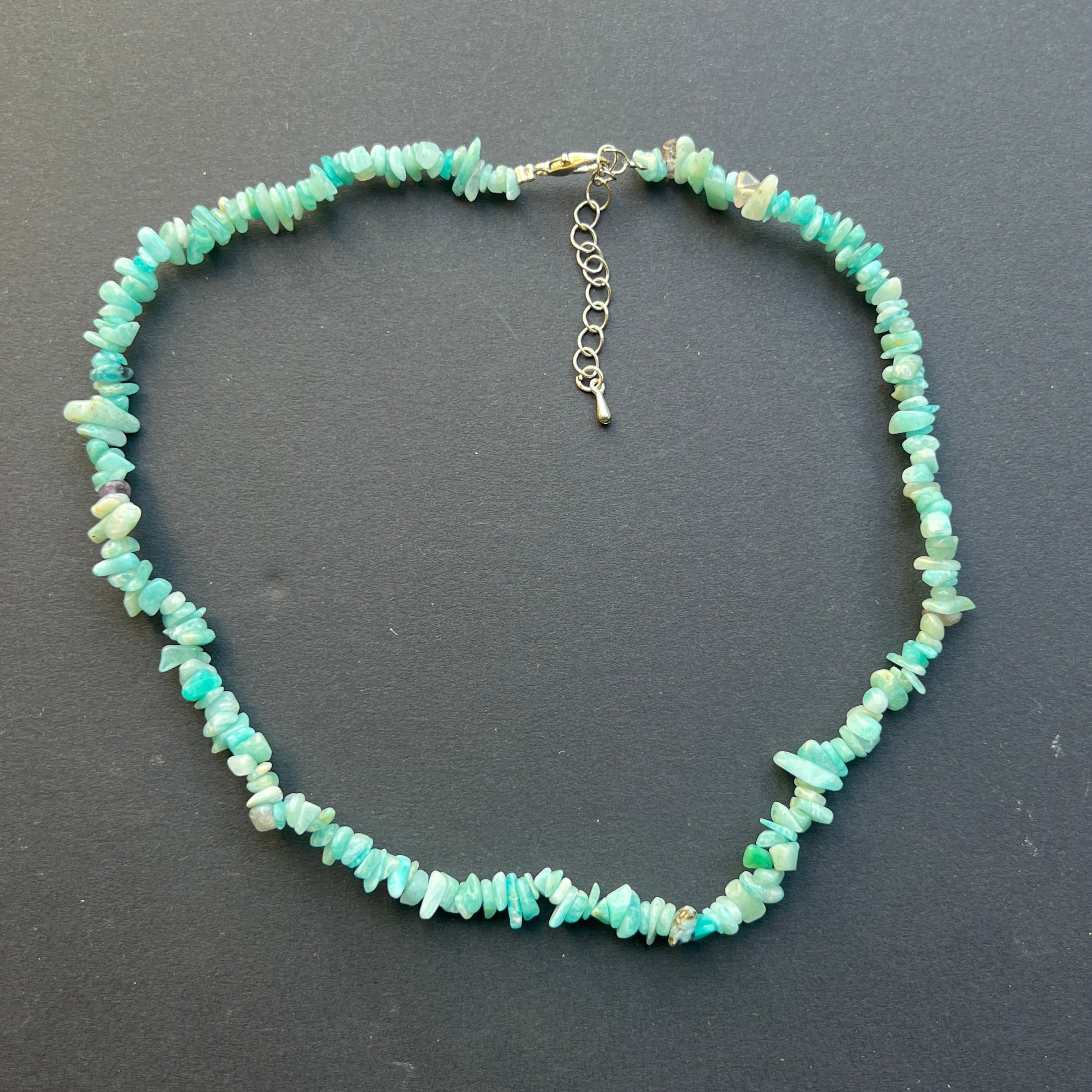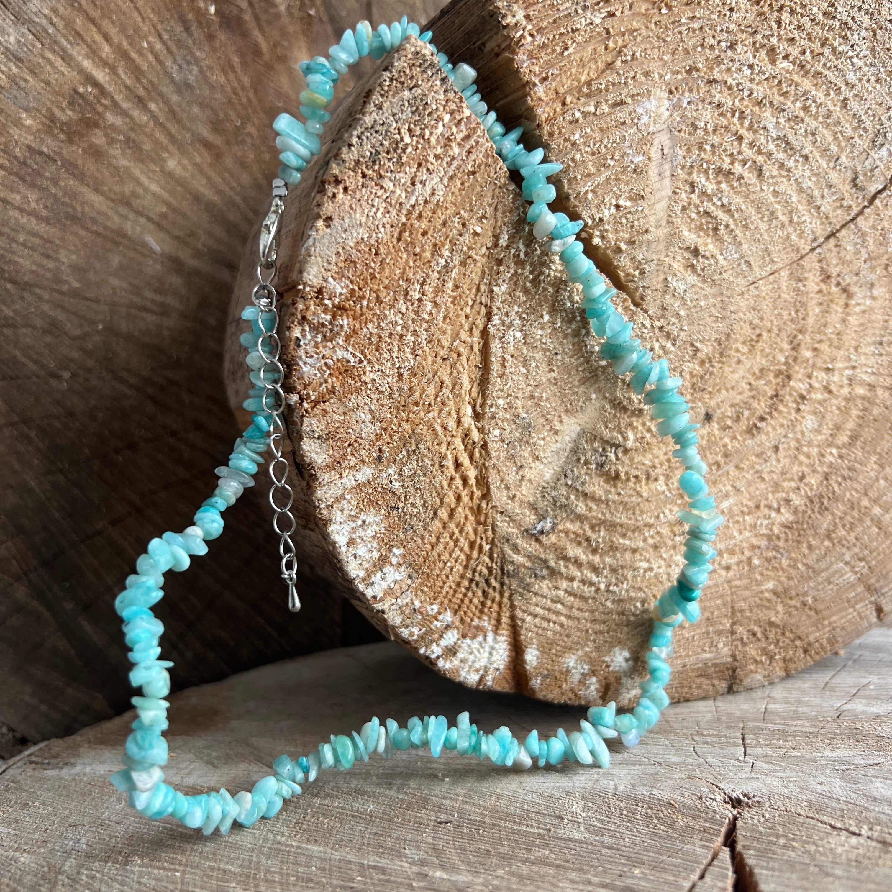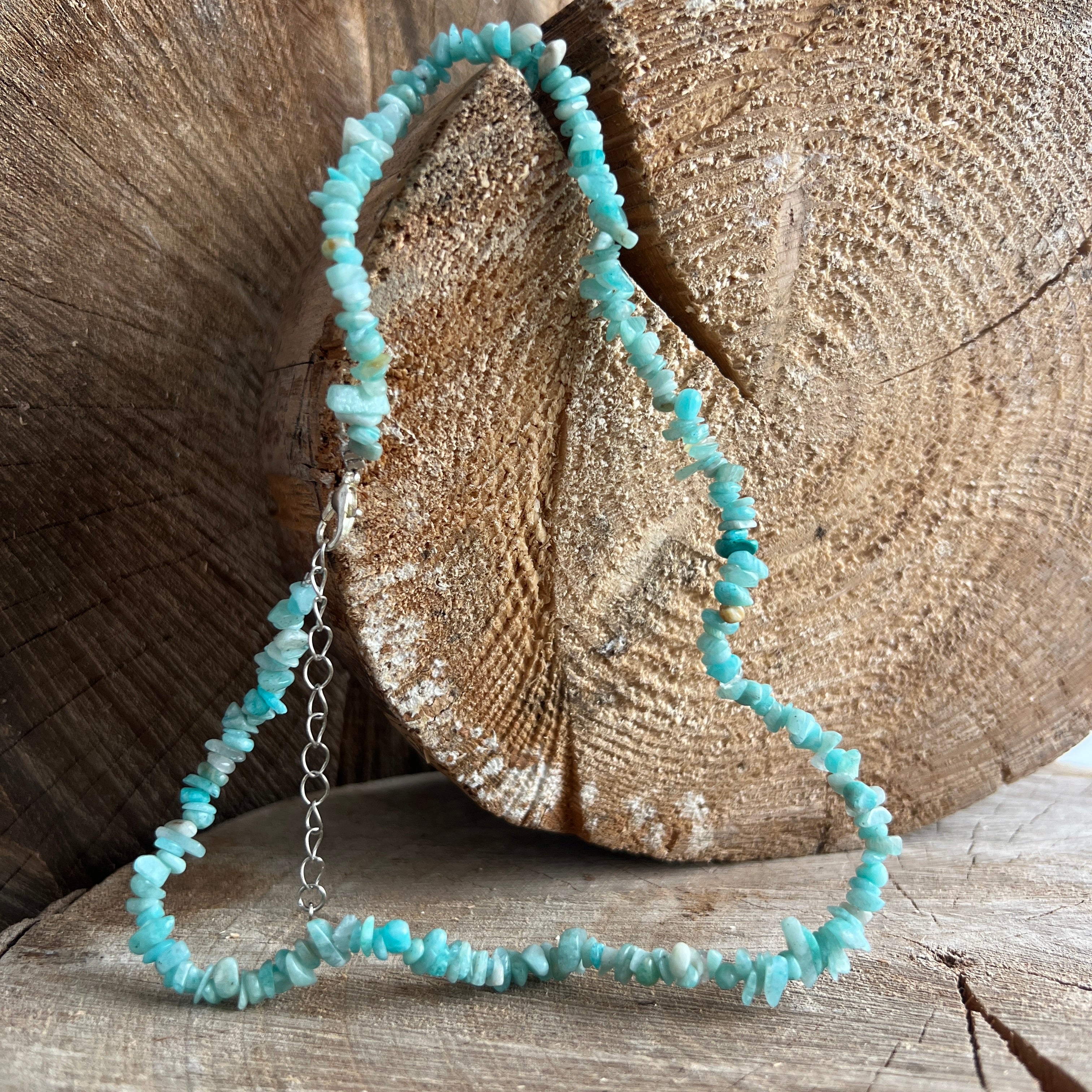Gazdagítsd ékszergyűjteményed ezzel a természetes amazonit chips-ekből készült nyaklánccal, amely egy 40 cm-es finom láncra van fűzve, 5 cm-es fém hosszabbítással a kényelmes beállításhoz.