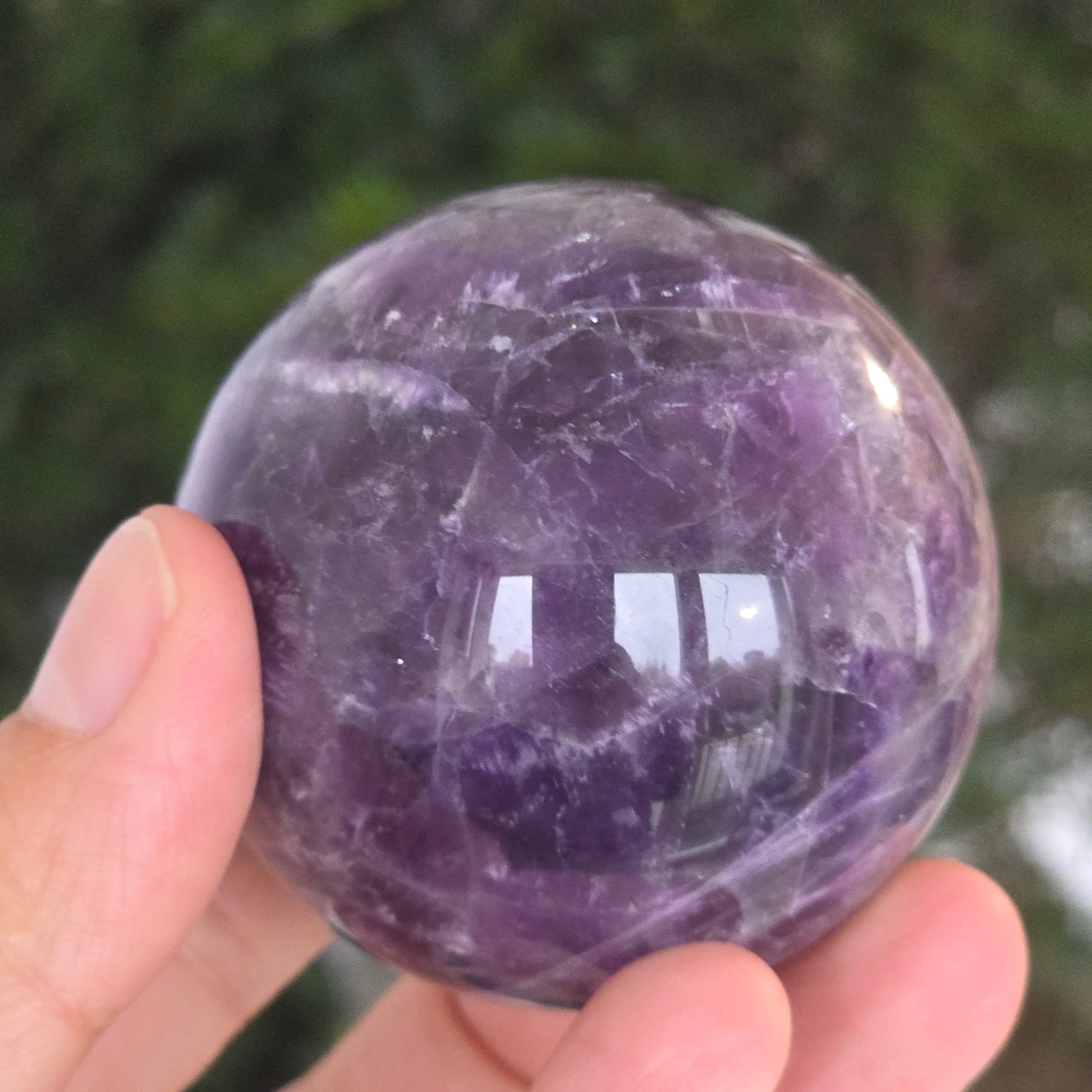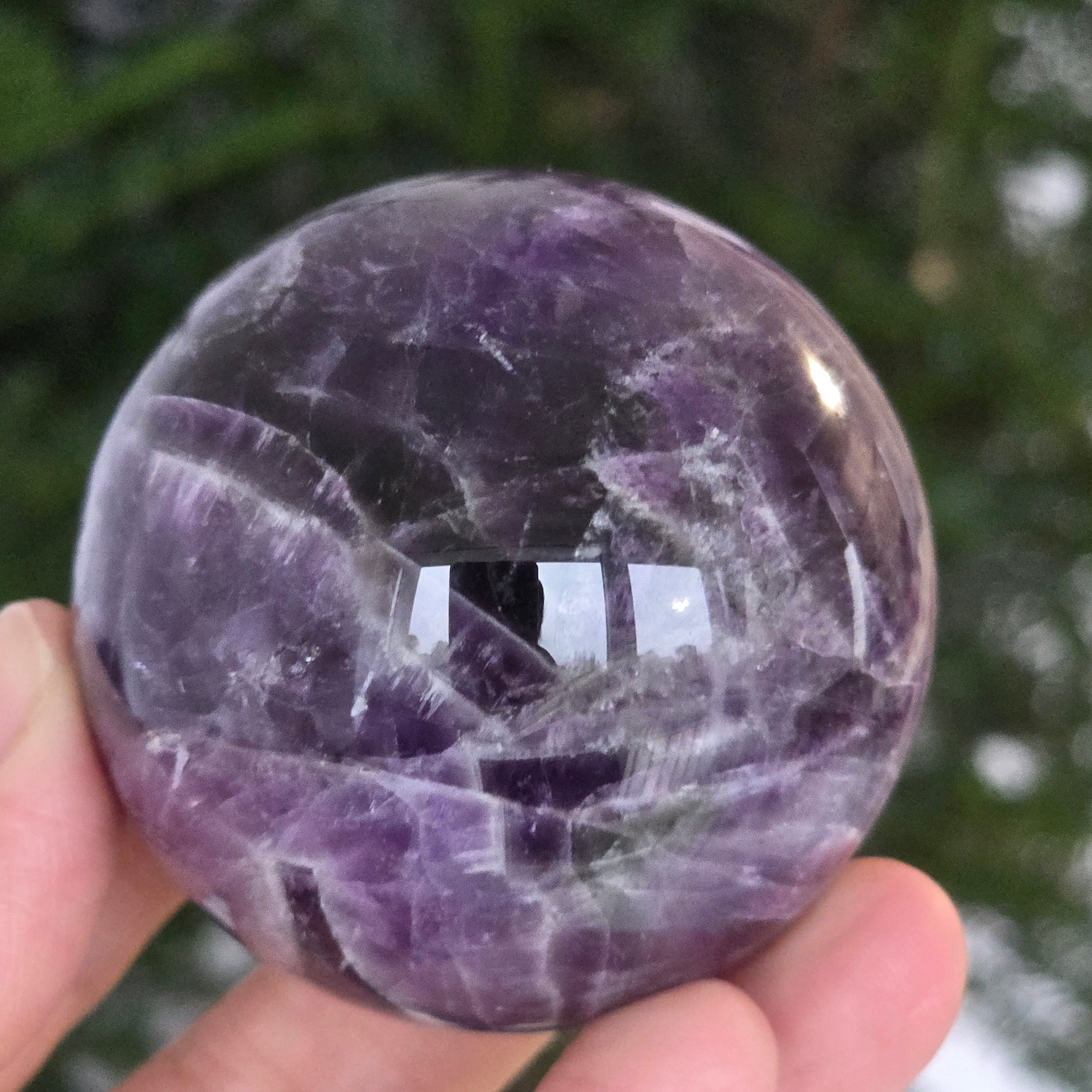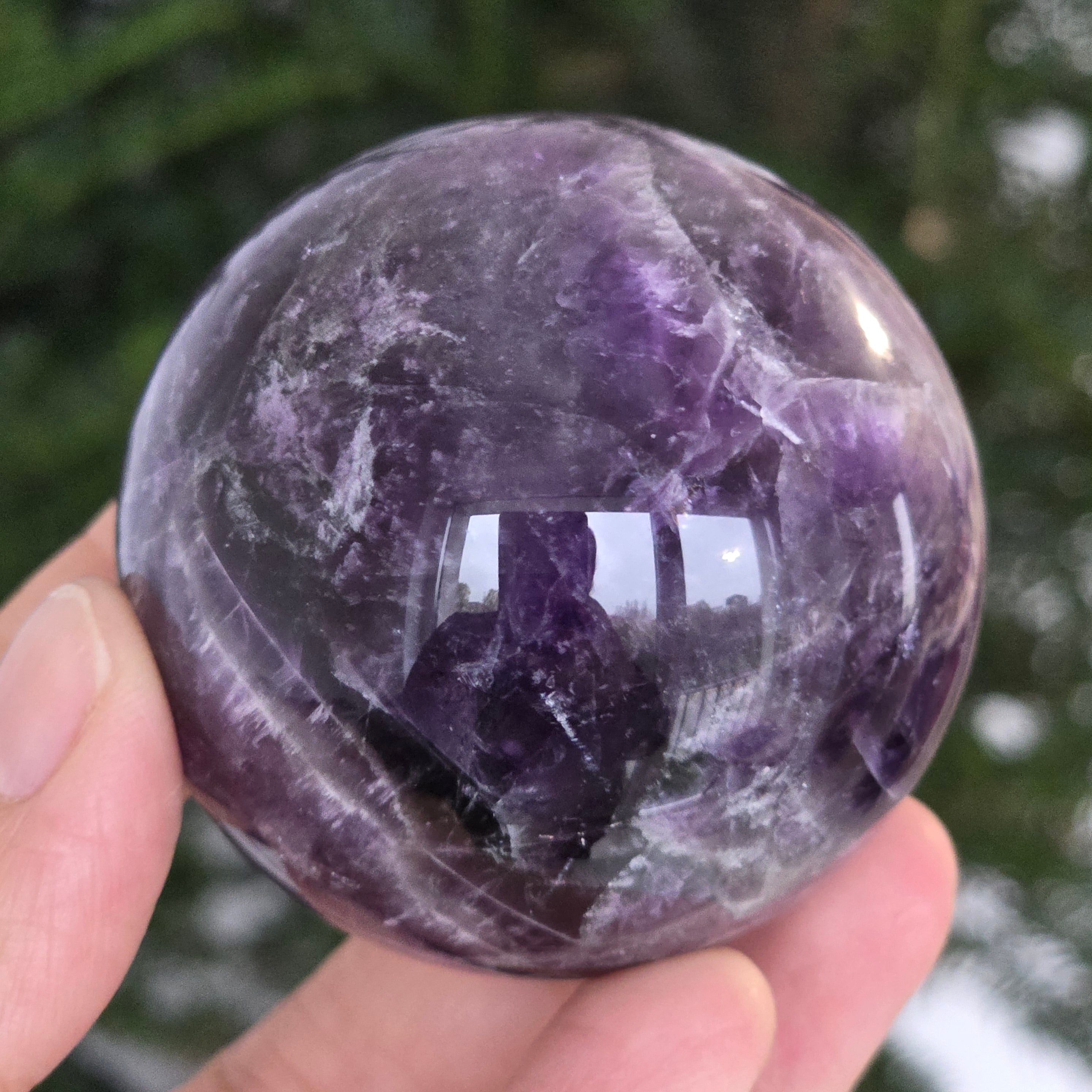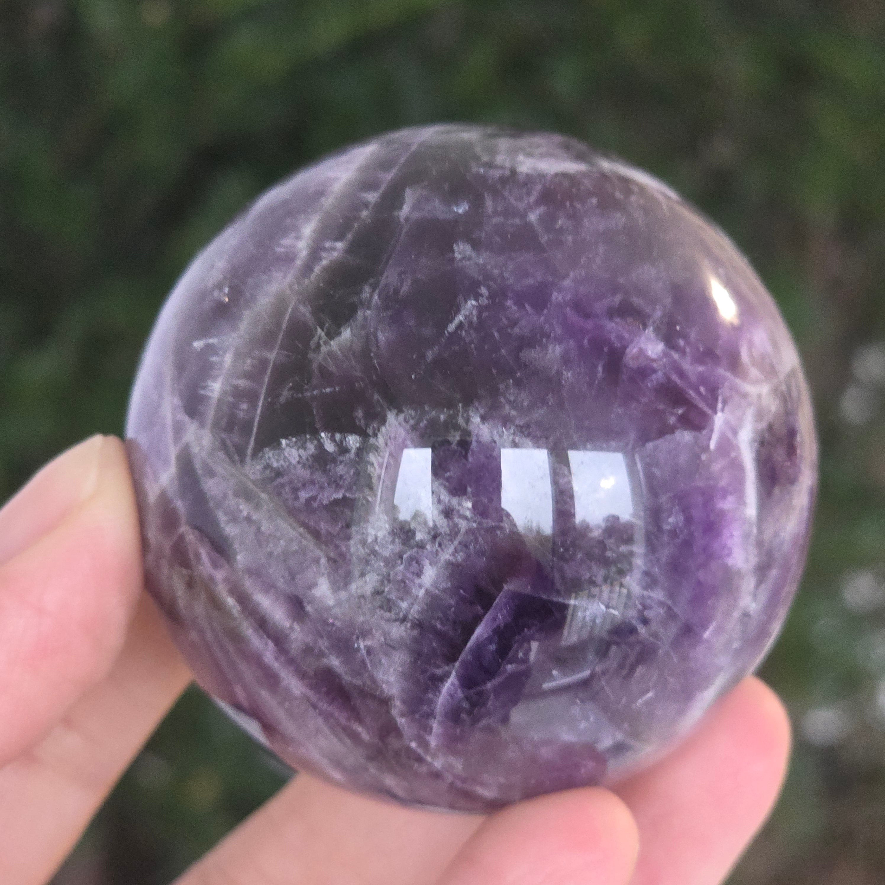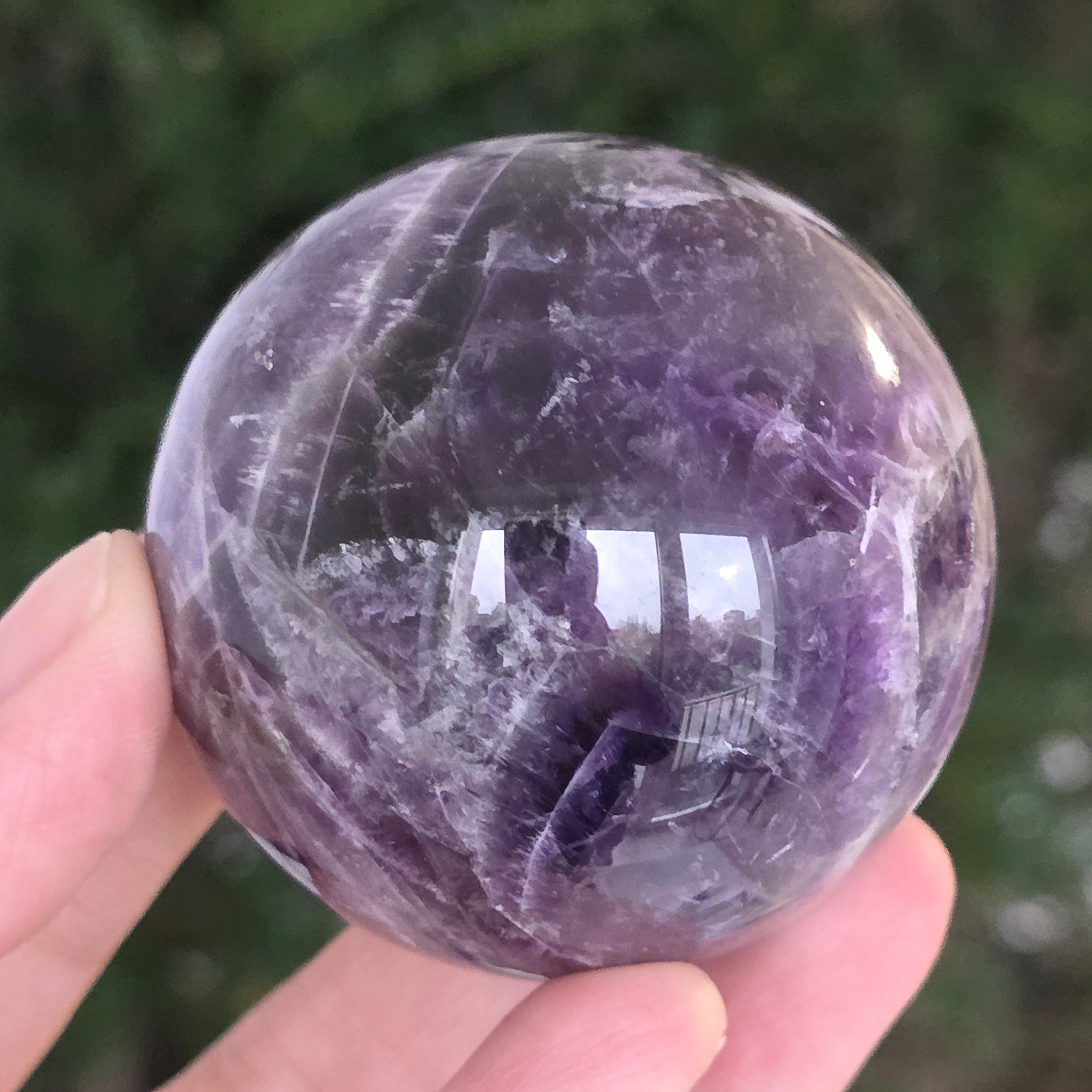 Egy gömb, amely úgy tűnik, hogy összegyűjti magában egy ibolyalila éj fényét. Ez az egyedi natúr chevron ametiszt darablenyűgöző lila, fehér és levendula rétegeket tár fel V formában – ennek a ritka ametisztfajtának jellegzetes jele. A tökéletesen csiszolt, tapintásra bársonyos felület hipnotikus finomsággal tükrözi a fényt, békét és kifinomultságot hozva bármely térbe.