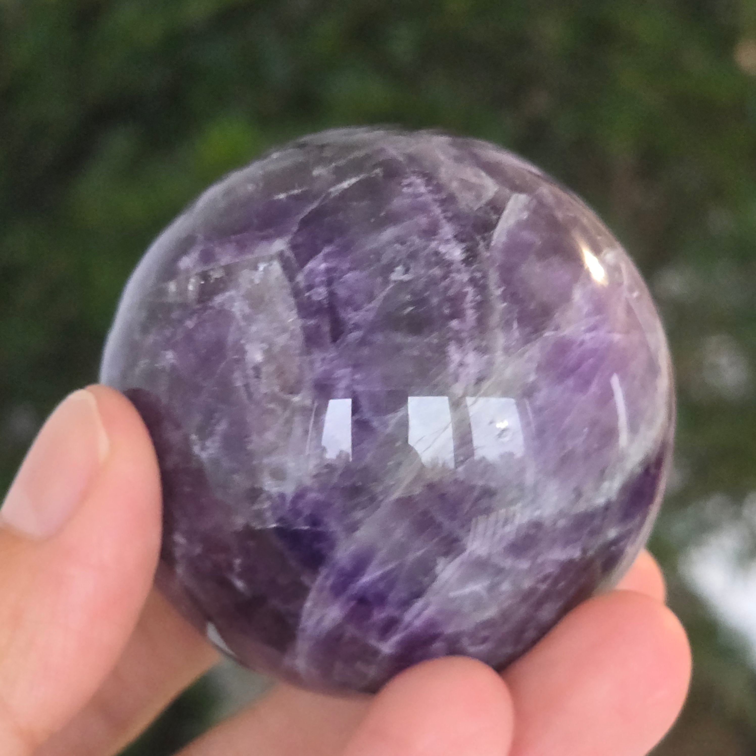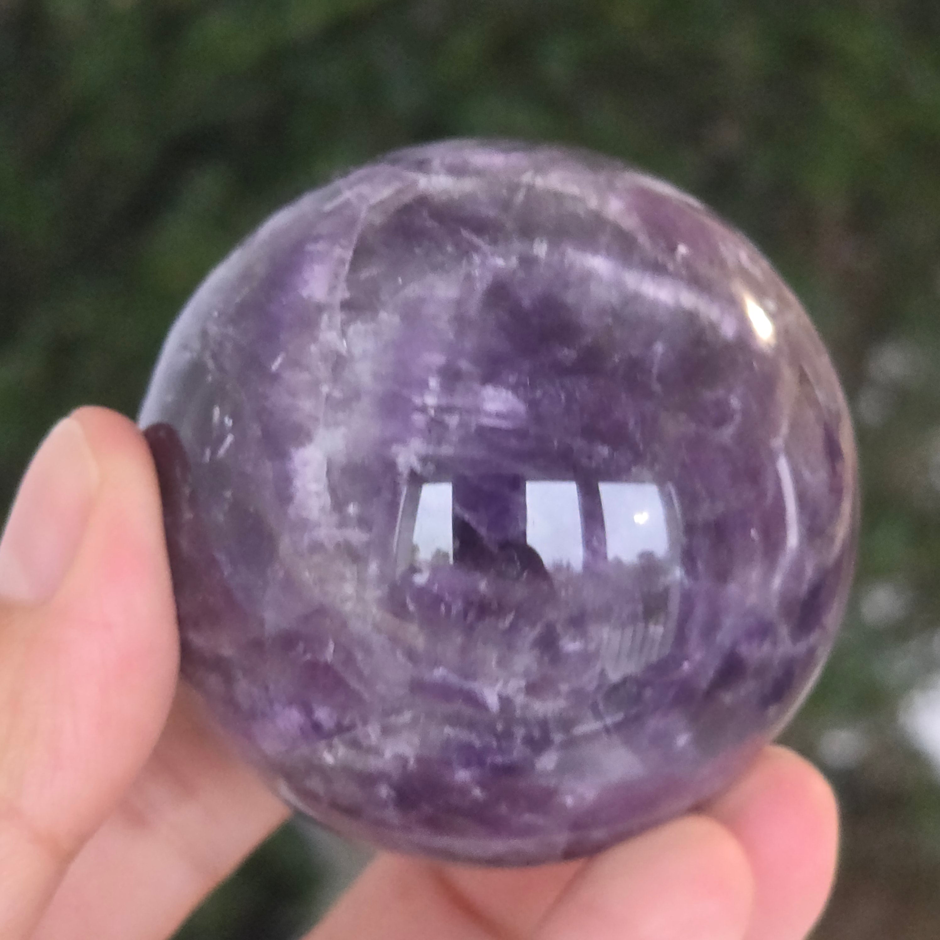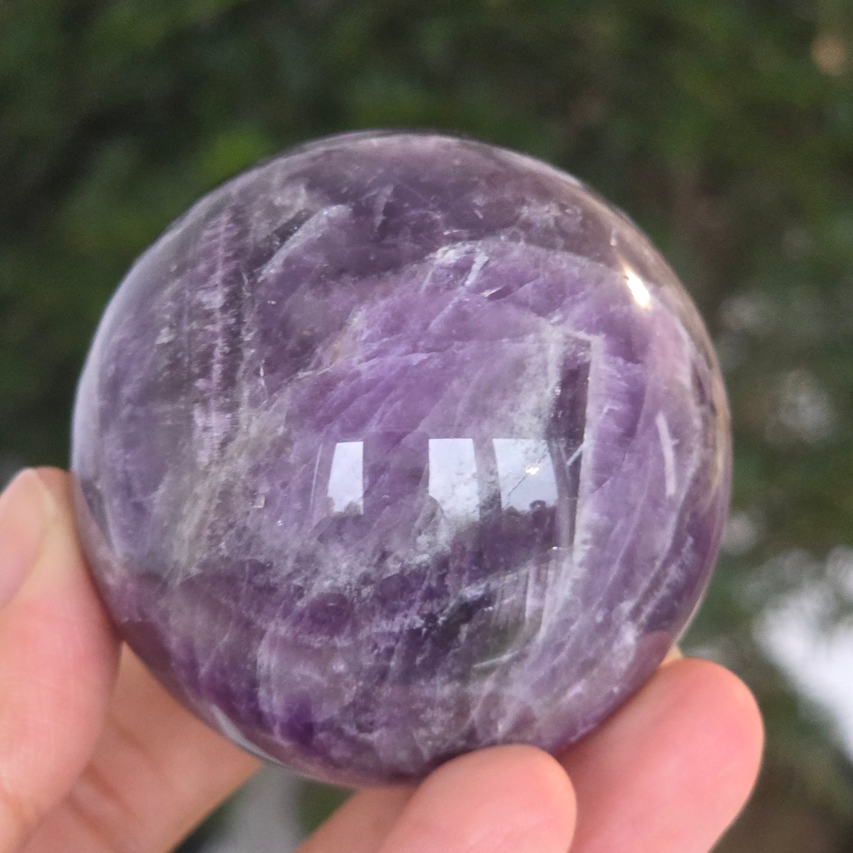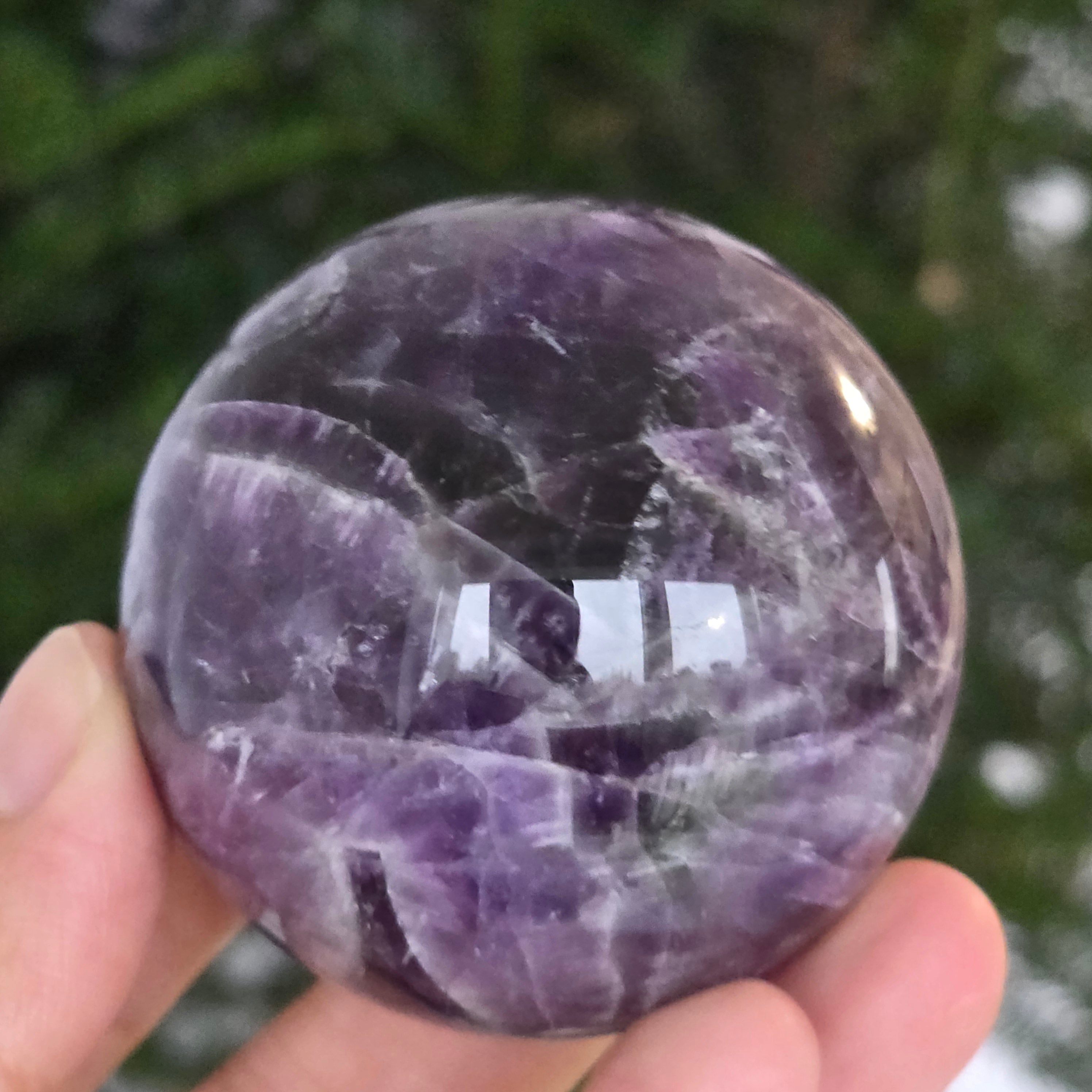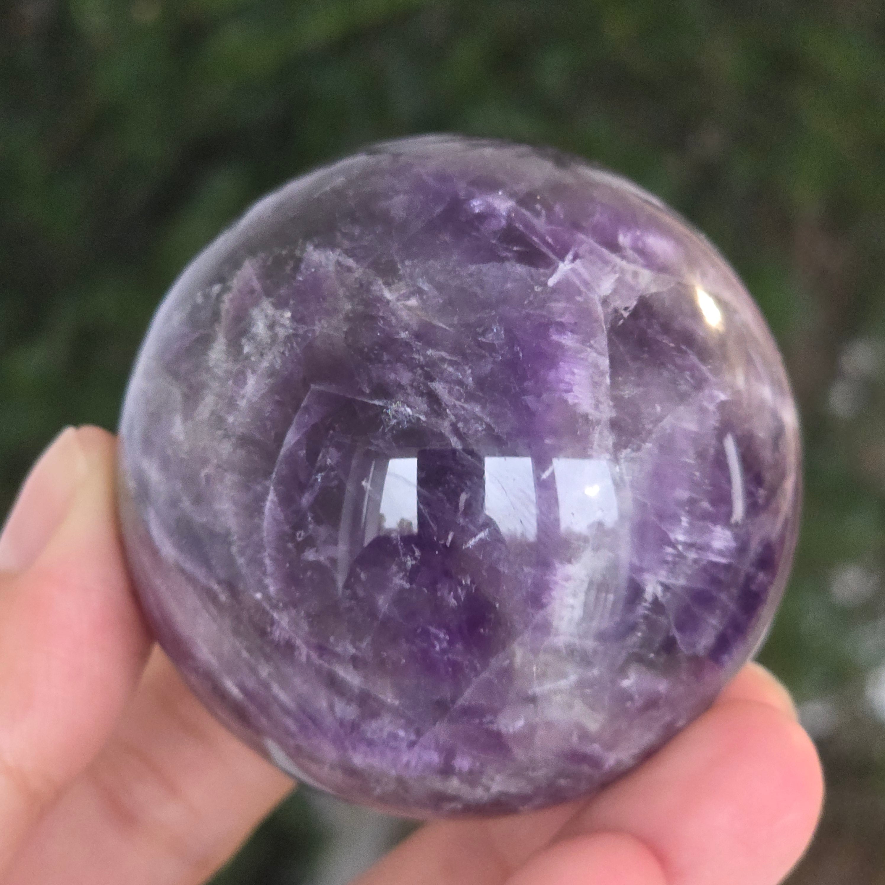 Egy gömb, amely úgy tűnik, hogy összegyűjti magában egy ibolyalila éj fényét. Ez az egyedi natúr chevron ametiszt darablenyűgöző lila, fehér és levendula rétegeket tár fel V formában – ennek a ritka ametisztfajtának jellegzetes jele. A tökéletesen csiszolt, tapintásra bársonyos felület hipnotikus finomsággal tükrözi a fényt, békét és kifinomultságot hozva bármely térbe.
