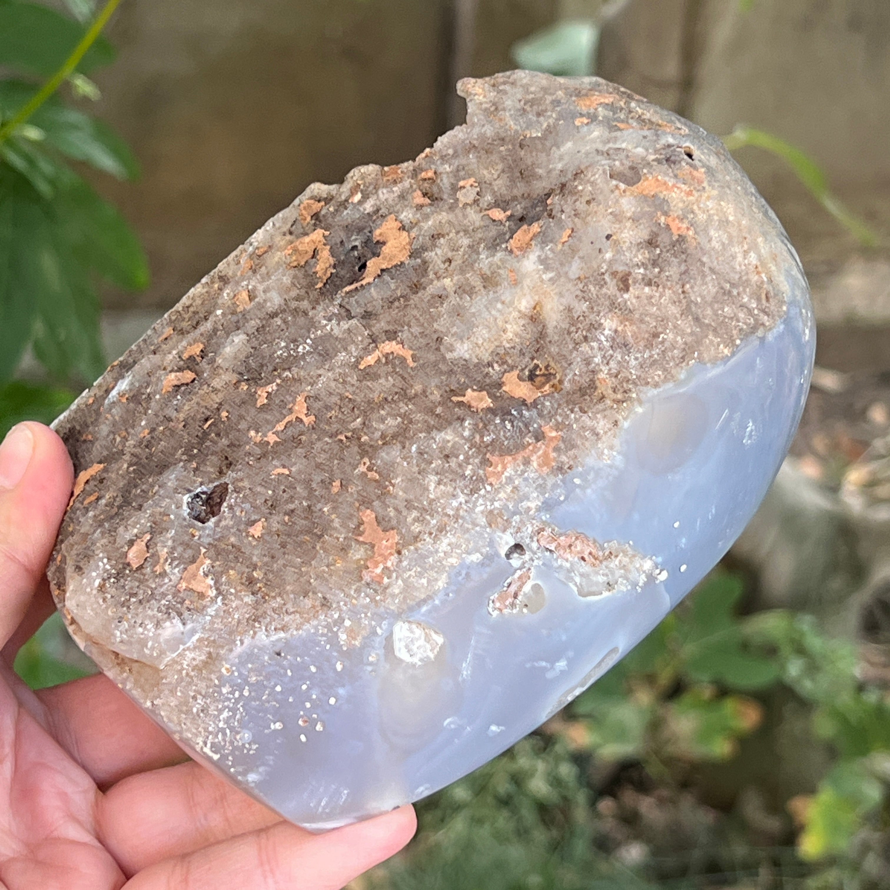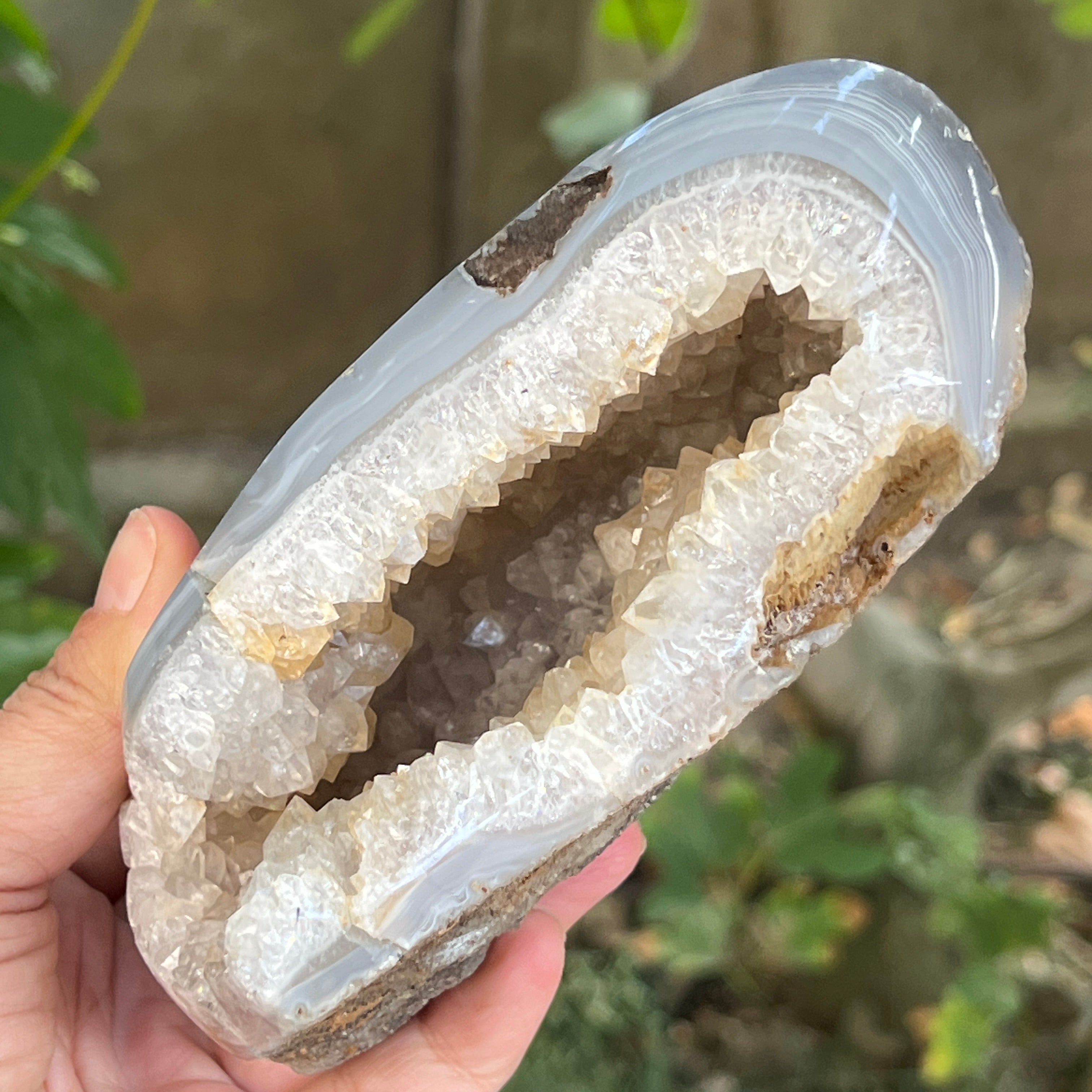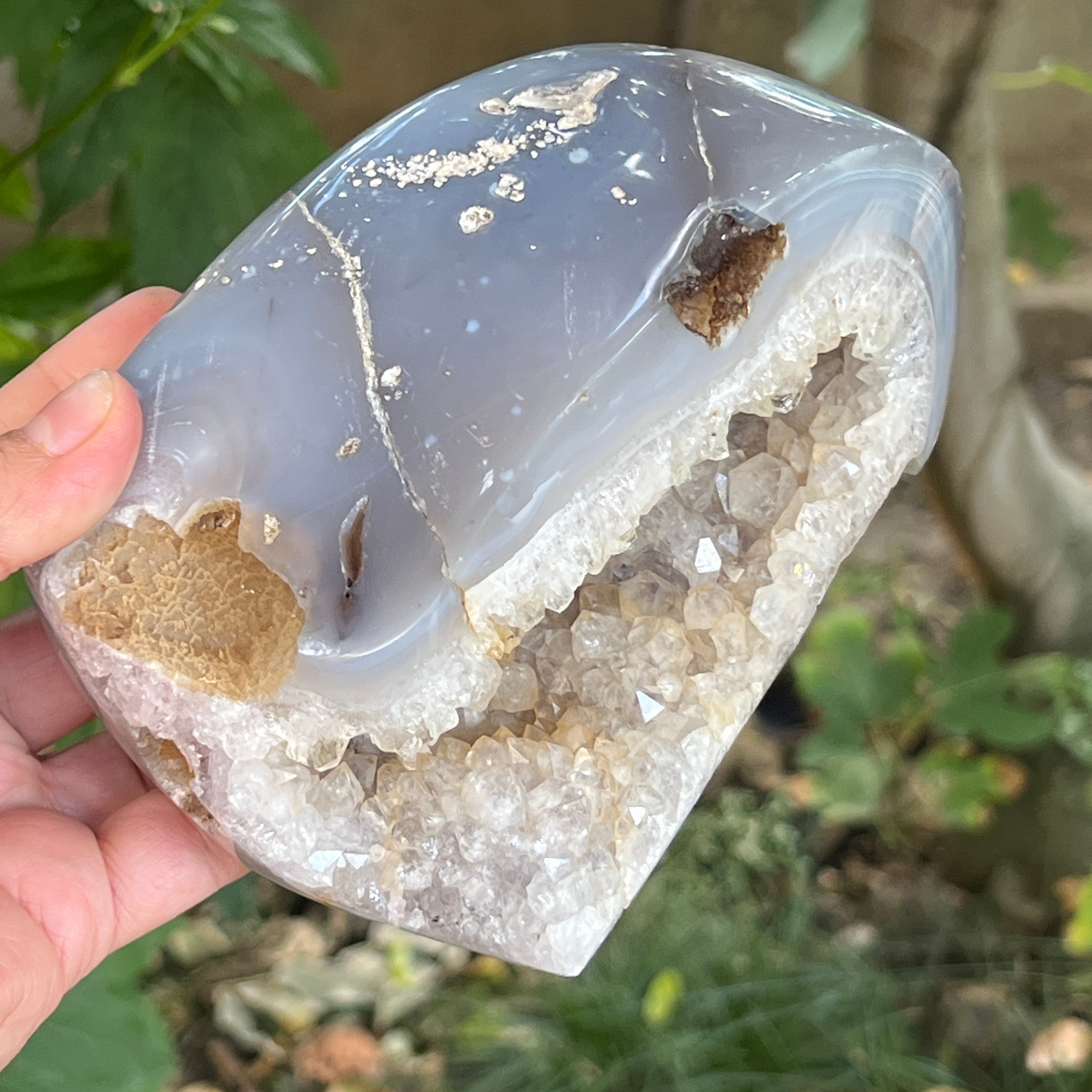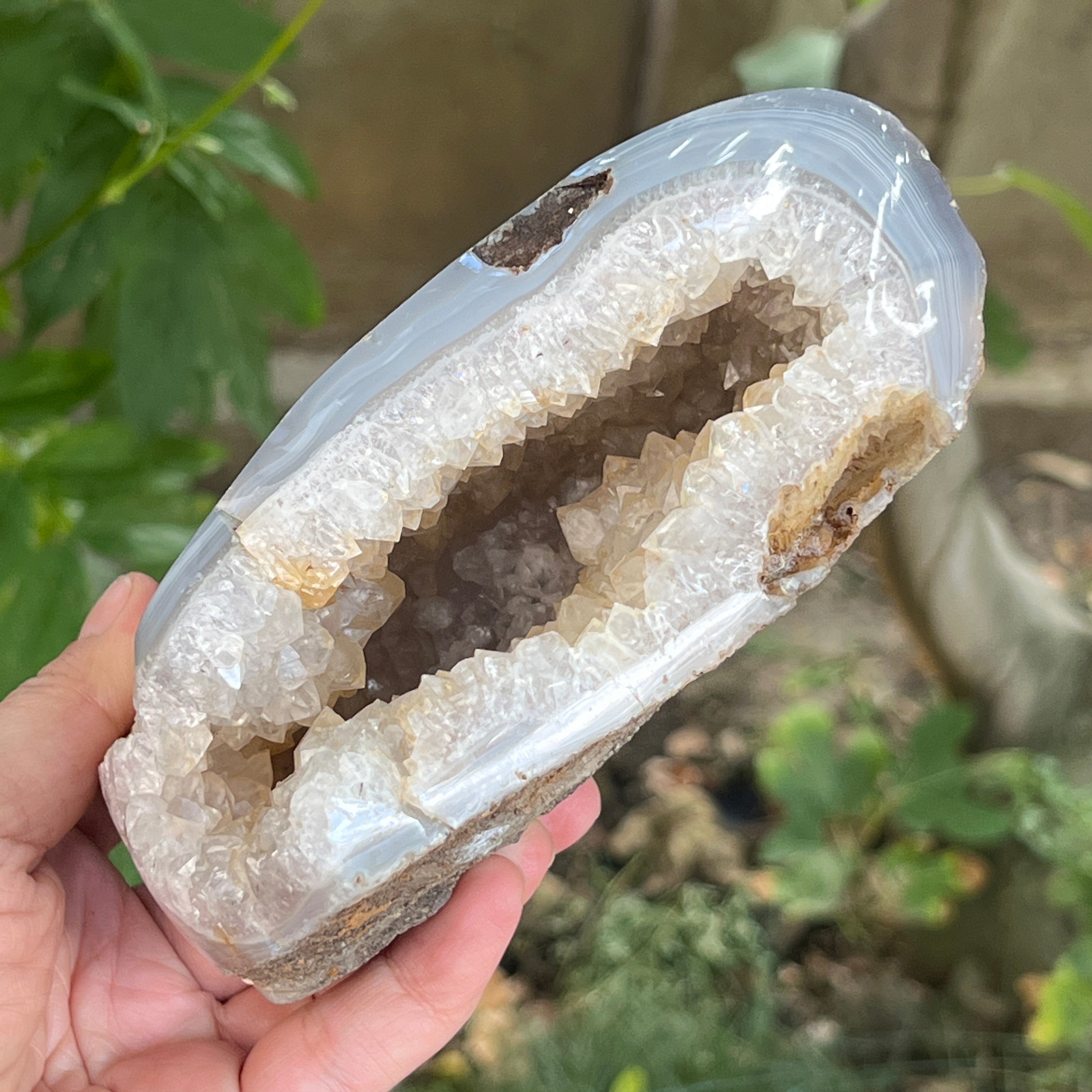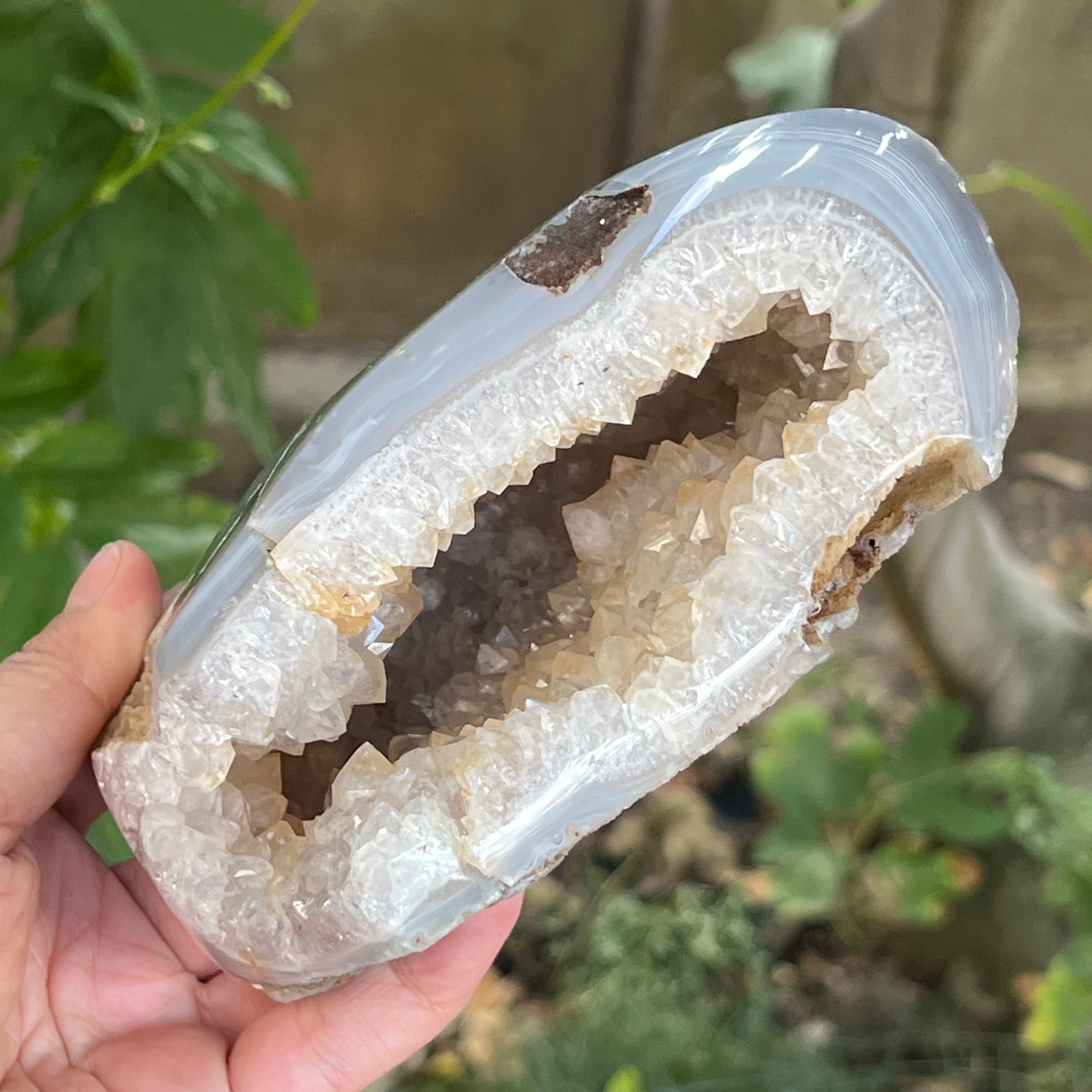Ez a látványos geoda ötvözi az ametiszt mély rejtélyét az achát rétegzett nyugalmával, feltárva a természet idő és energia által faragott kincsét. Rejtett belsejének minden részletét – csillogó, lila árnyalatú ametiszt kristályokat – az achát finom, stabil körvonala emeli ki, mint a bölcsesség kéregétől védett szív.