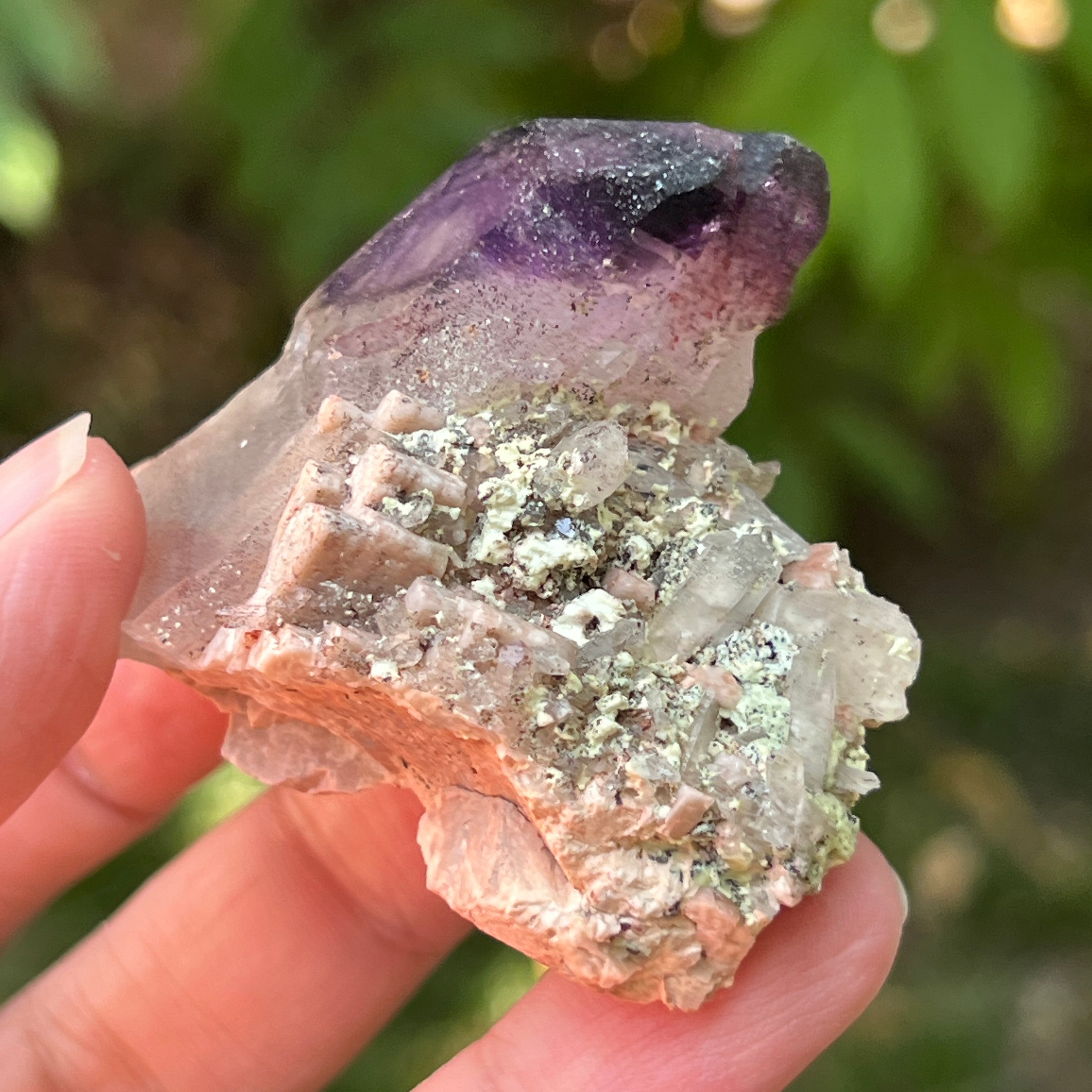 A trigonális rendszerben kristályosodva ez a példány SiO₂ (szilícium-dioxid) kiváló átlátszóságával és természetes, hatszögletű formáival tűnik ki. Egyes darabok „szellemeket” tartalmaznak – a növekedés korábbi szakaszait tükröző belső körvonalakat –, vagy hidrotermikus folyadék, hematit vagy goethit mozgó buborékait mutatják be, amelyek mindegyike a kristály belsejében évmilliókkal ezelőtt rögzített.