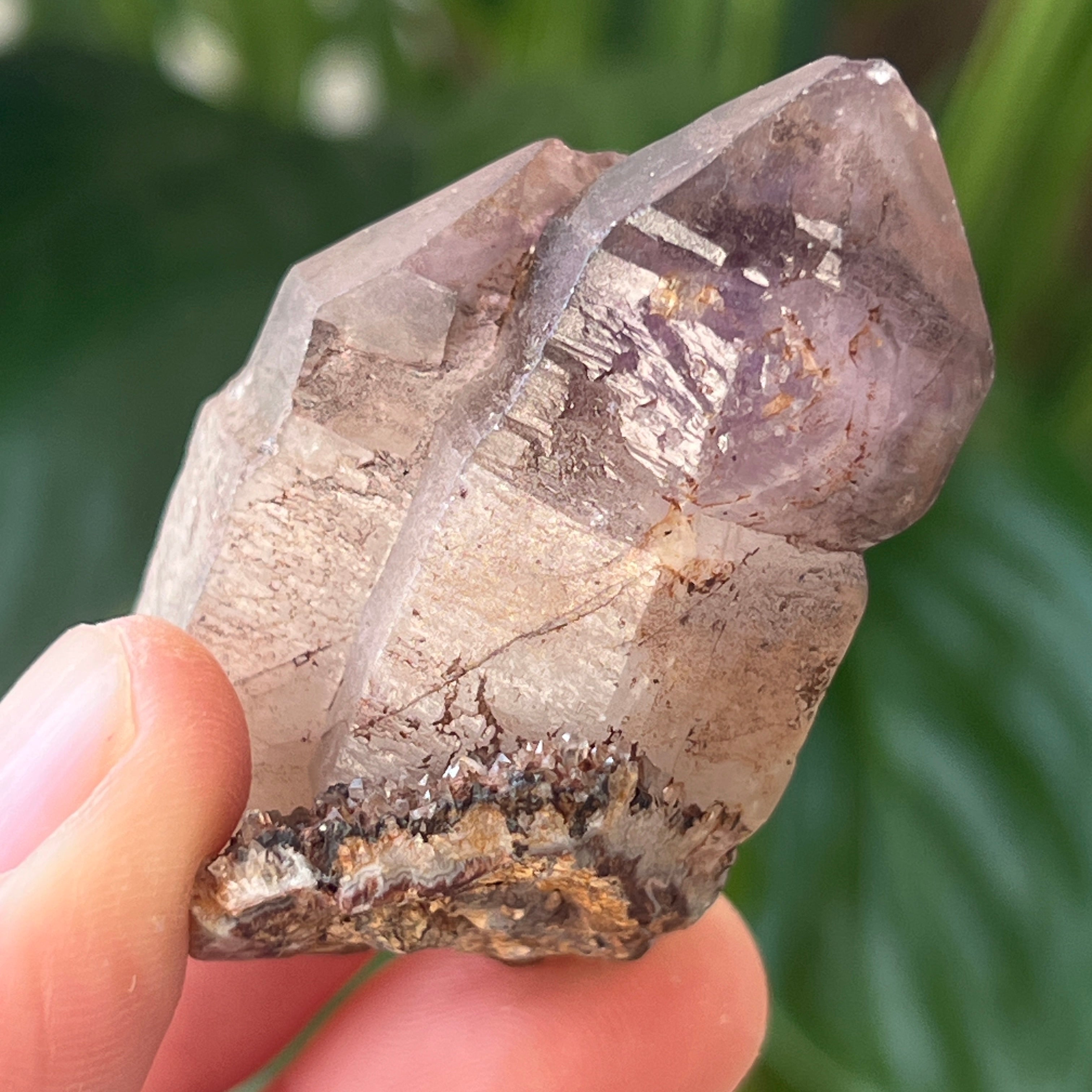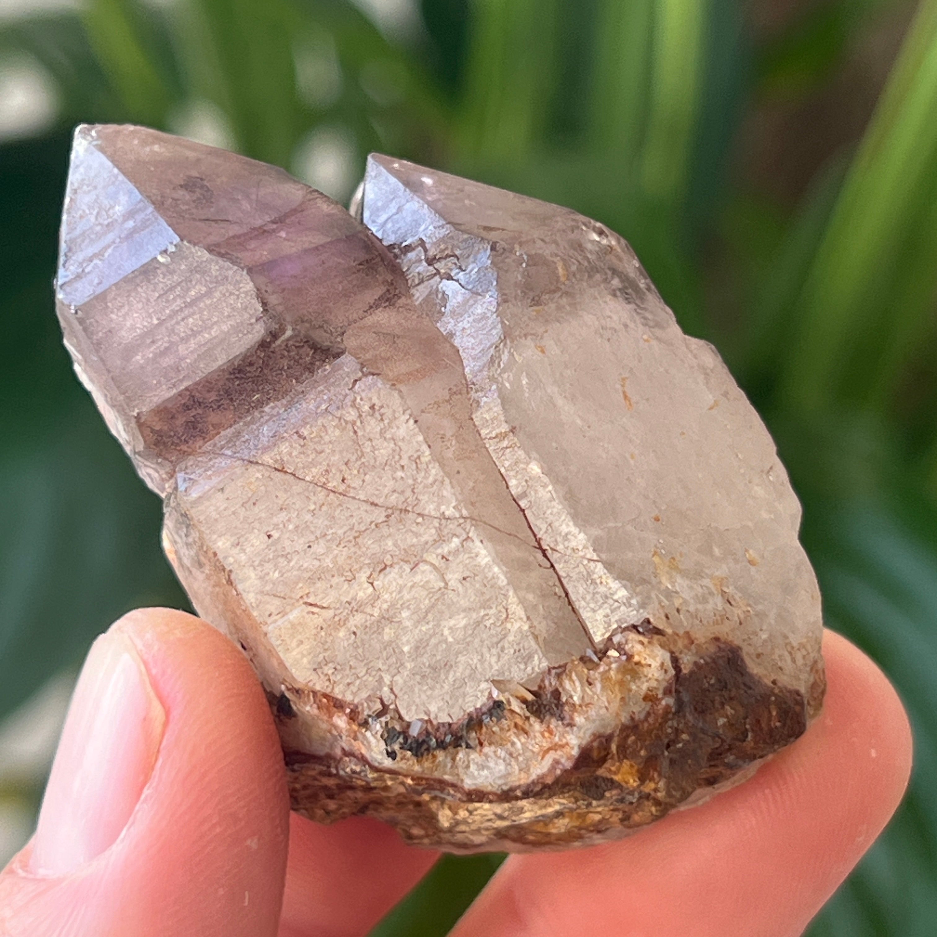 A trigonális rendszerben kristályosodva ez a példány SiO₂ (szilícium-dioxid) kiváló átlátszóságával és természetes, hatszögletű formáival tűnik ki. Egyes darabok „szellemeket” tartalmaznak – a növekedés korábbi szakaszait tükröző belső körvonalakat –, vagy hidrotermikus folyadék, hematit vagy goethit mozgó buborékait mutatják be, amelyek mindegyike a kristály belsejében évmilliókkal ezelőtt rögzített.