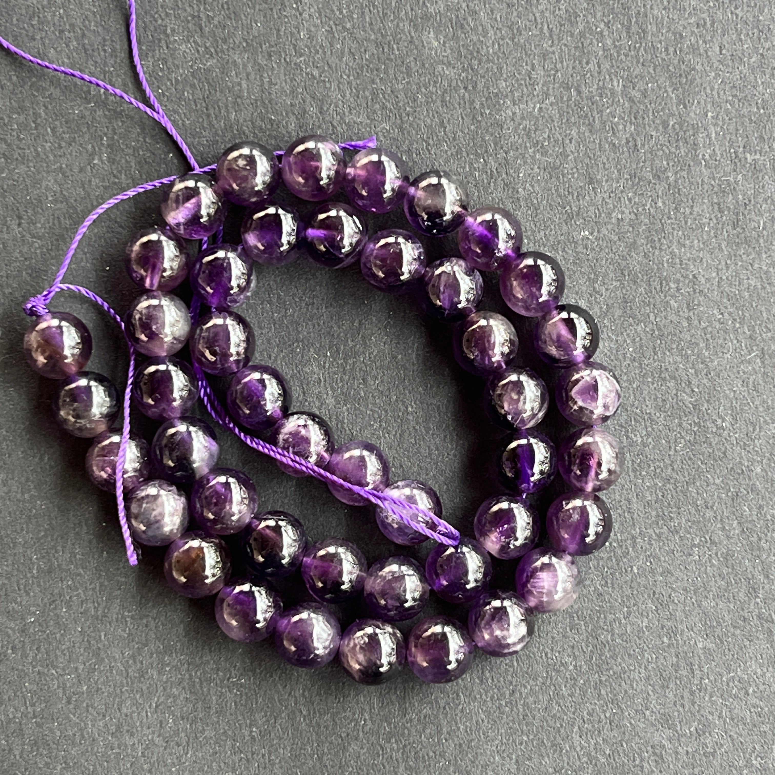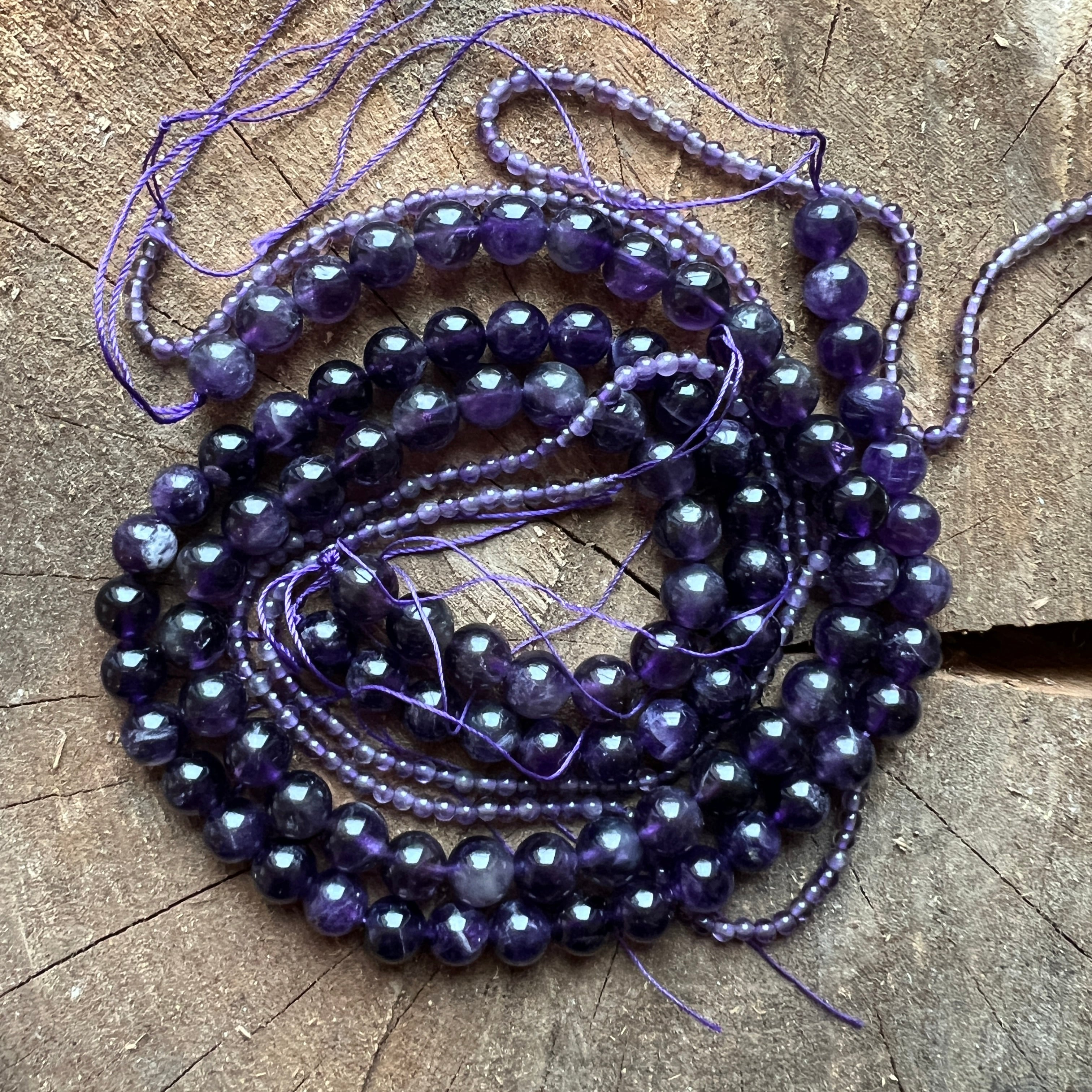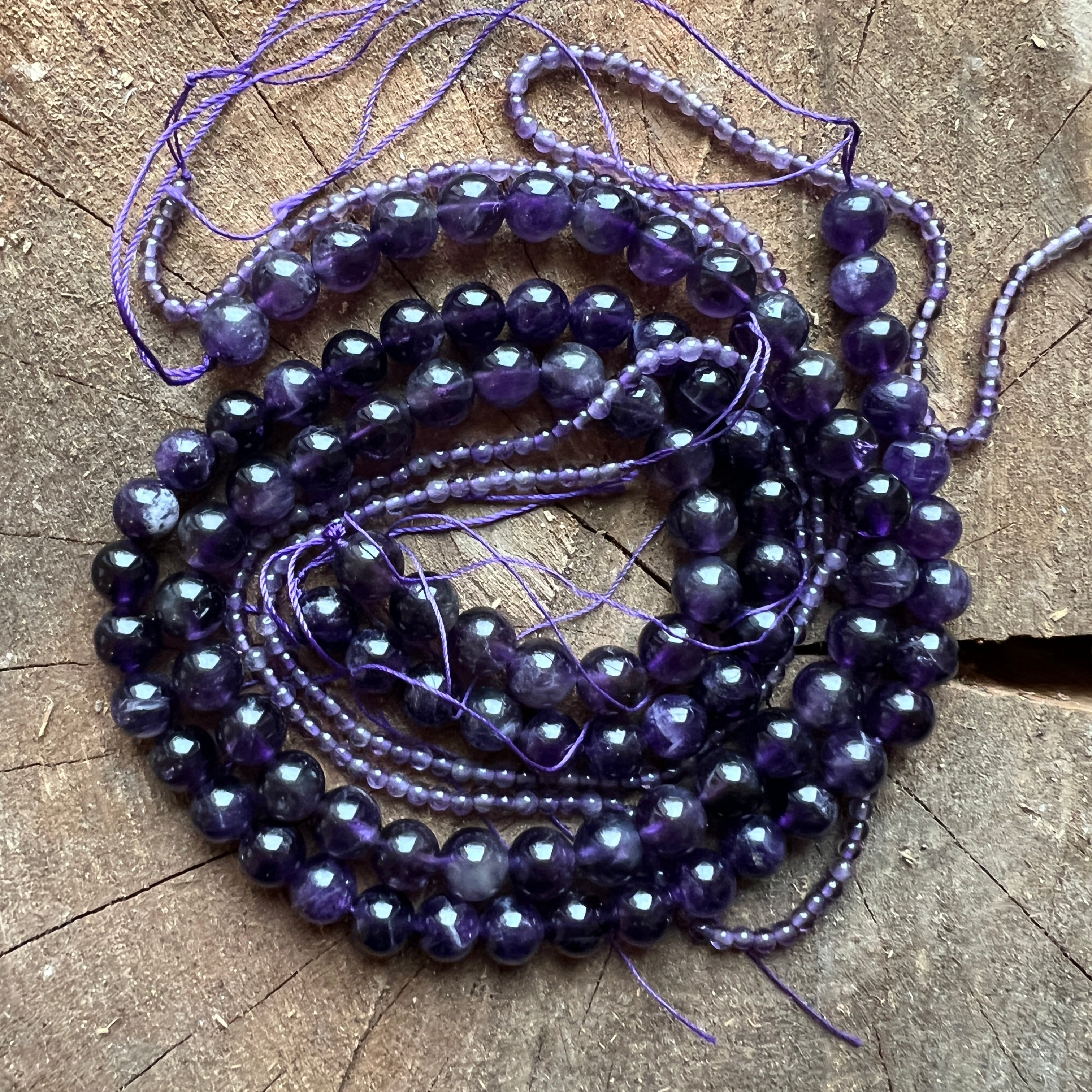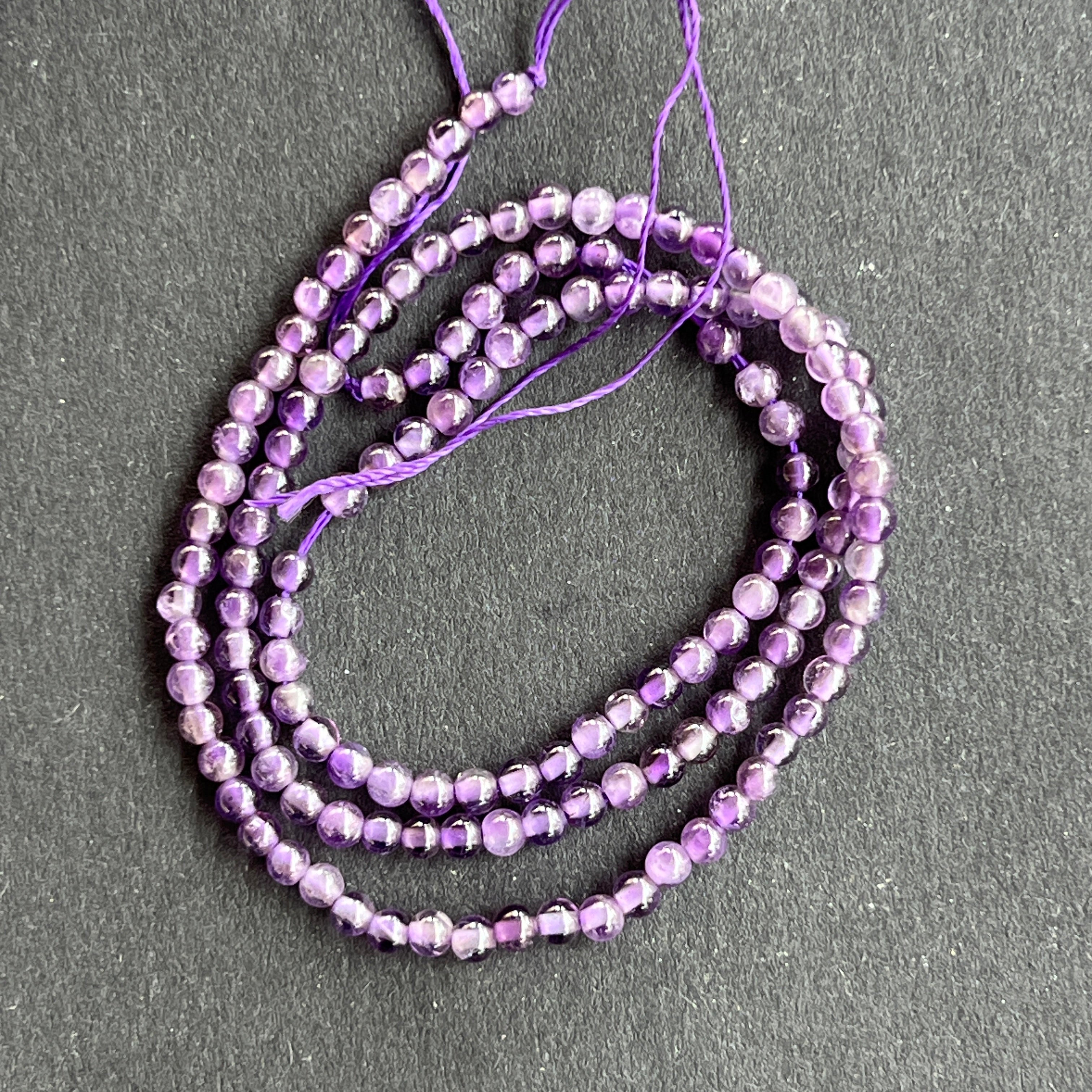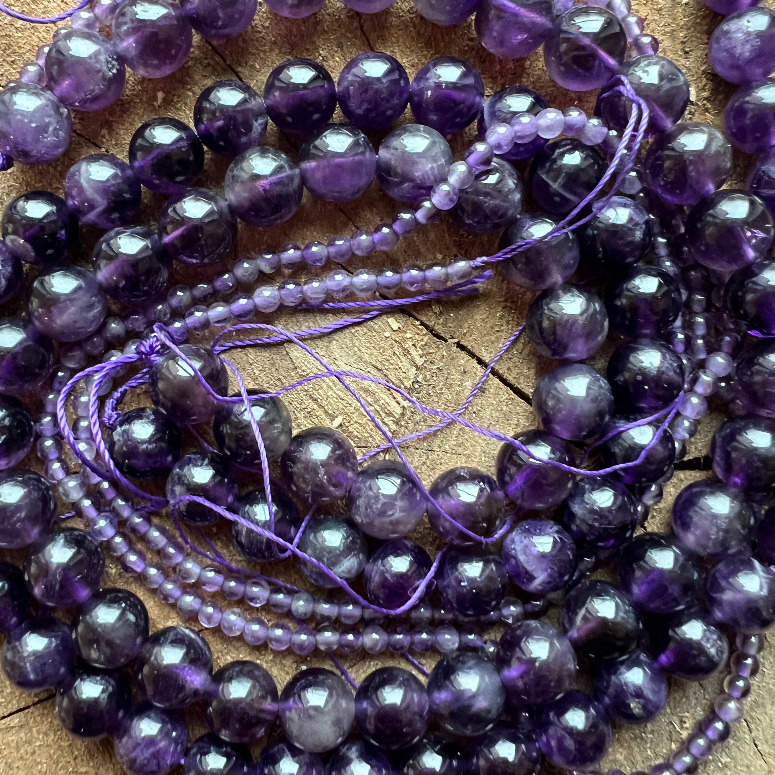 Ametiszt gyöngysor, természetes gömbölyű gyöngyökből áll, tökéletes nyakláncokhoz, karkötőkhöz vagy más kézműves ékszerekhez.