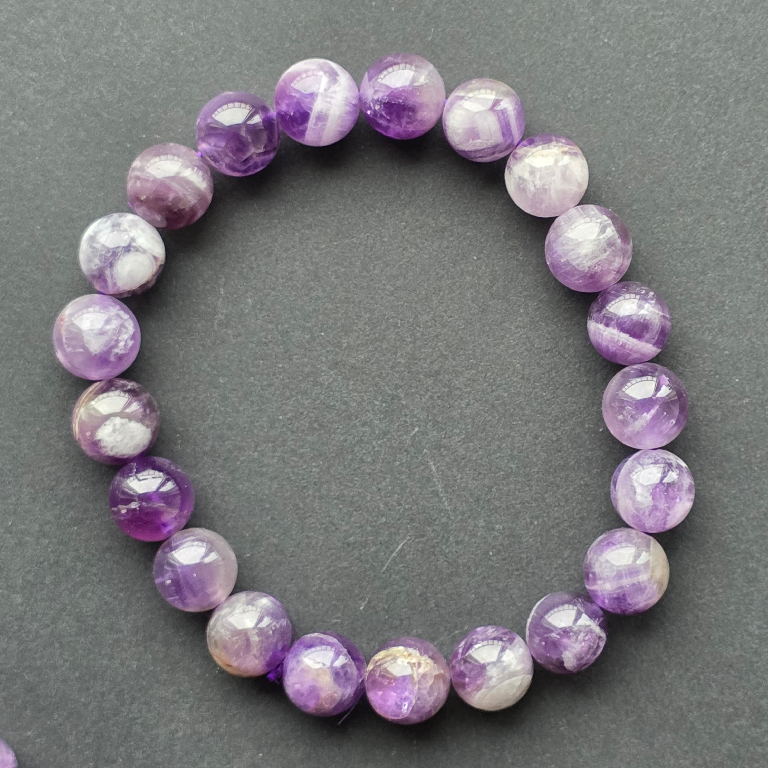 Minden gyöngy apró fényvisszaverődéseket játszik, és a lila különböző tónusai — a mélyebb árnyalatoktól a áttetszőbb kiemelésekig — az ékszert elegáns, nyugodt és harmonikus darabbá varázsolják. Könnyen viselhető, finoman simul a csuklóra, és alkalmas mind a hétköznapi, mind az elegánsabb öltözékhez.