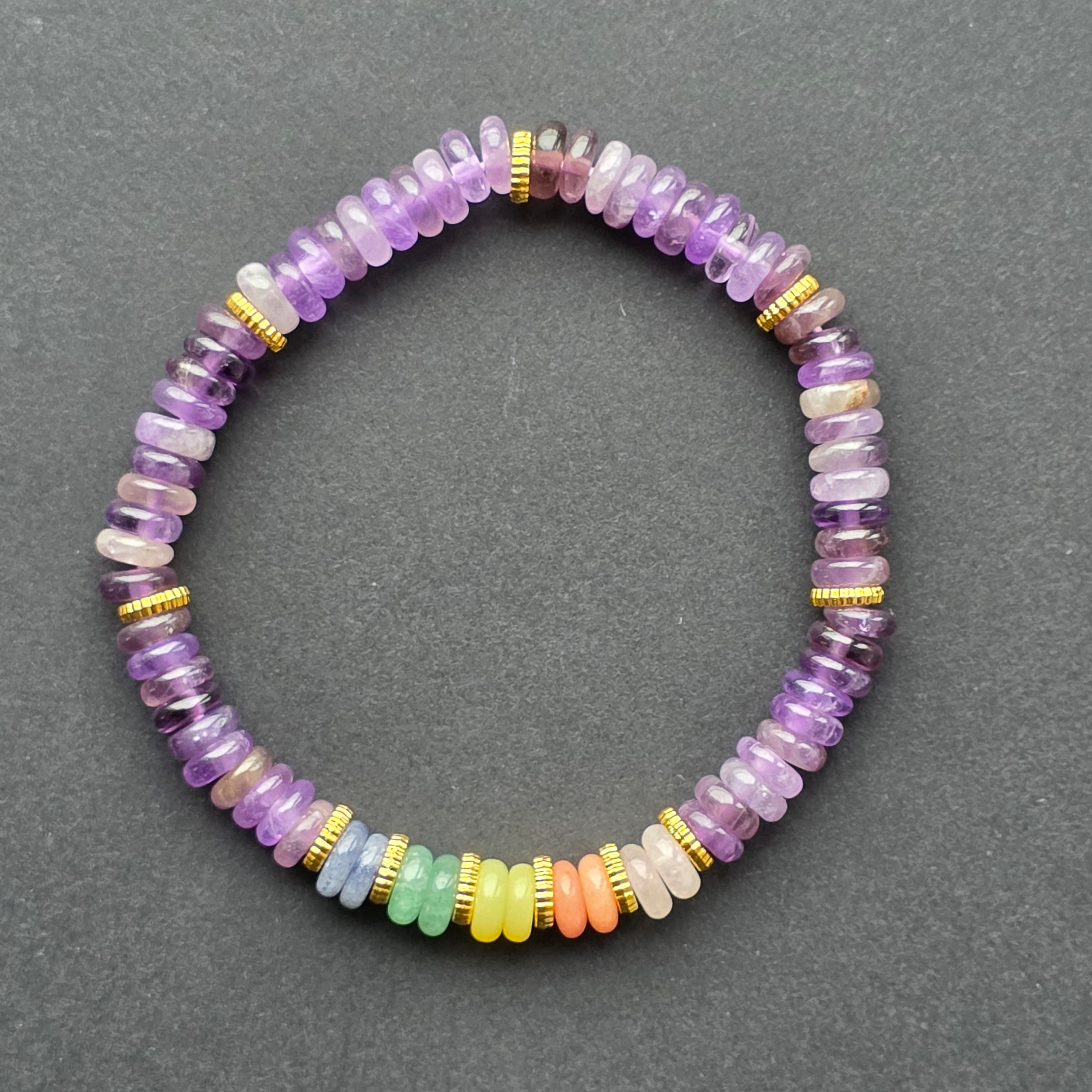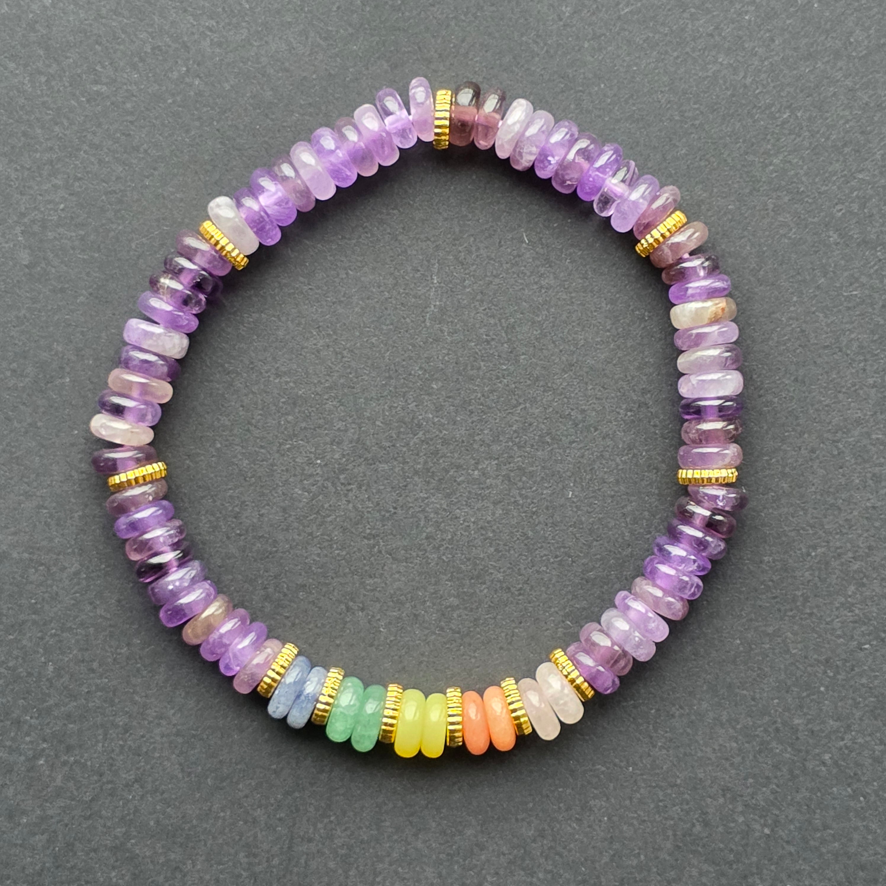 A szegmens 7 csakra egy színrobbanást hoz be, amely gyönyörűen kontrasztál az ametiszt finom lilájával. Ezek a meleg és vibráló árnyalatok egy finom, mégis karakteres hangsúlyt teremtenek, szimbolizálva az elme, a test és a lélek harmóniáját. A karkötő így nemcsak esztétikai kiegészítővé válik, hanem szimbolikus darabbá is — az belső egyensúly és az energetikai harmónia emlékeztetőjévé.