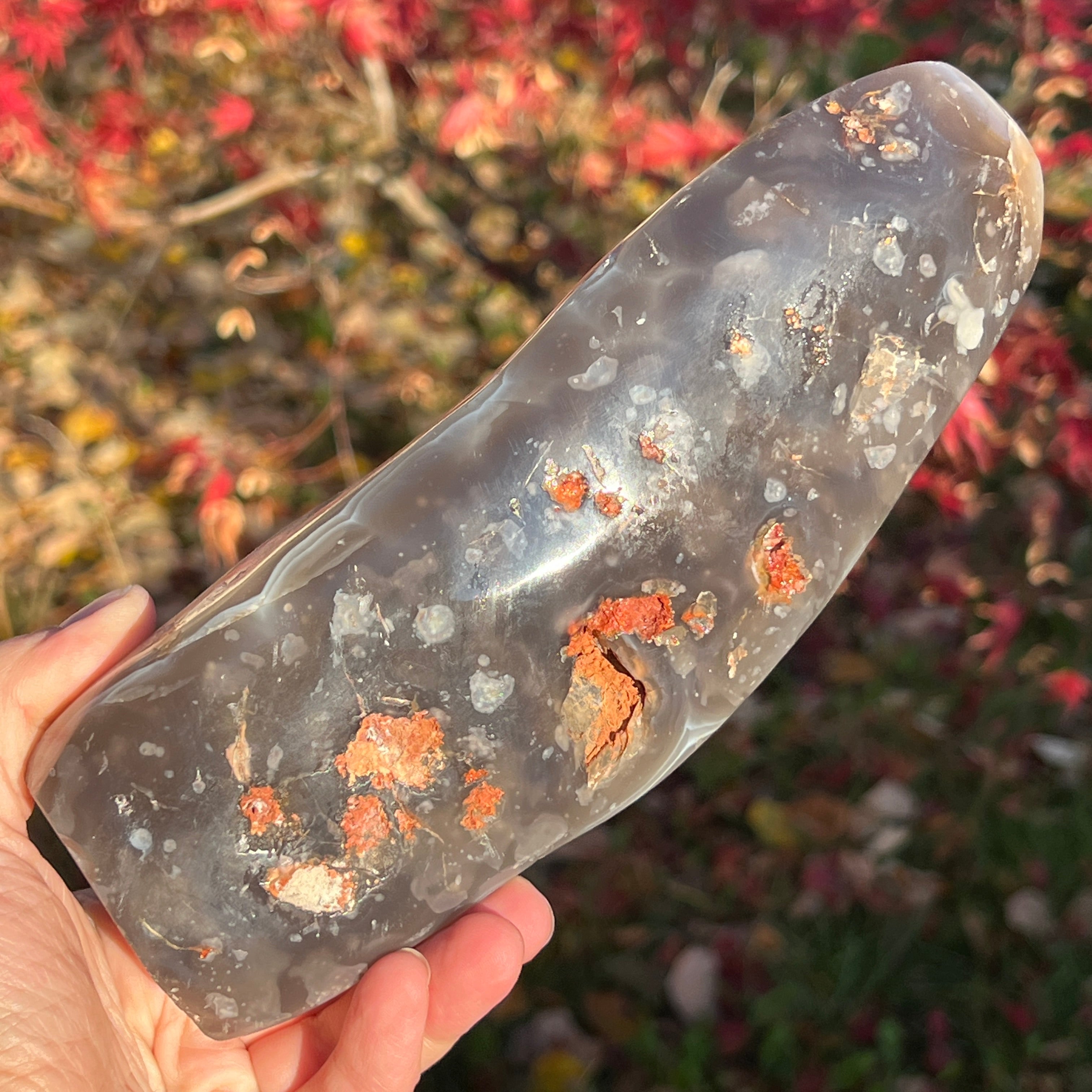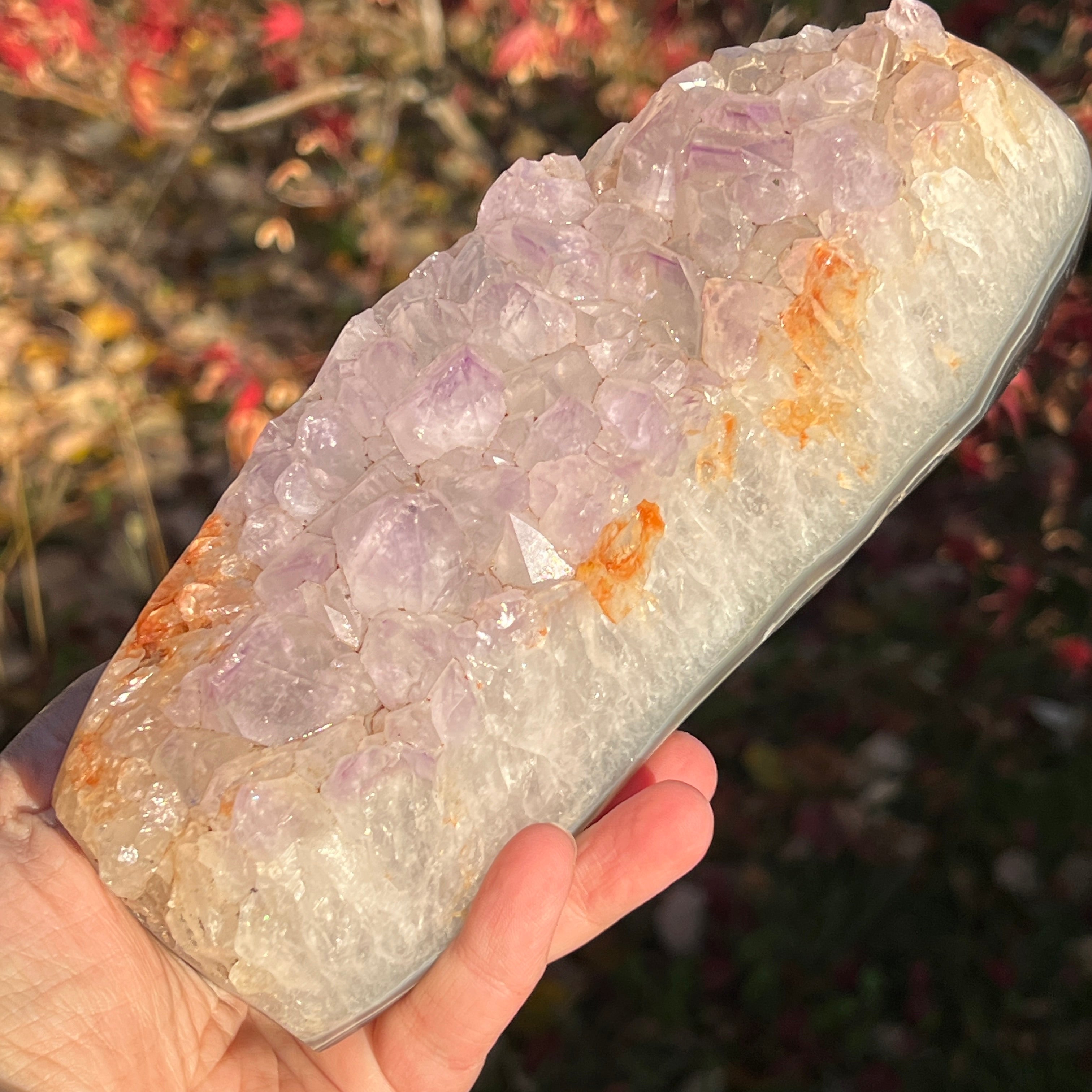 Ez a achátból és ametiszt kristályokkal készült bányavirág egy ritka természetes darab, amely a Föld mélyén alakult ki ott, ahol az achát lágy vonalai találkoznak az ametiszt misztikus csillogásával.