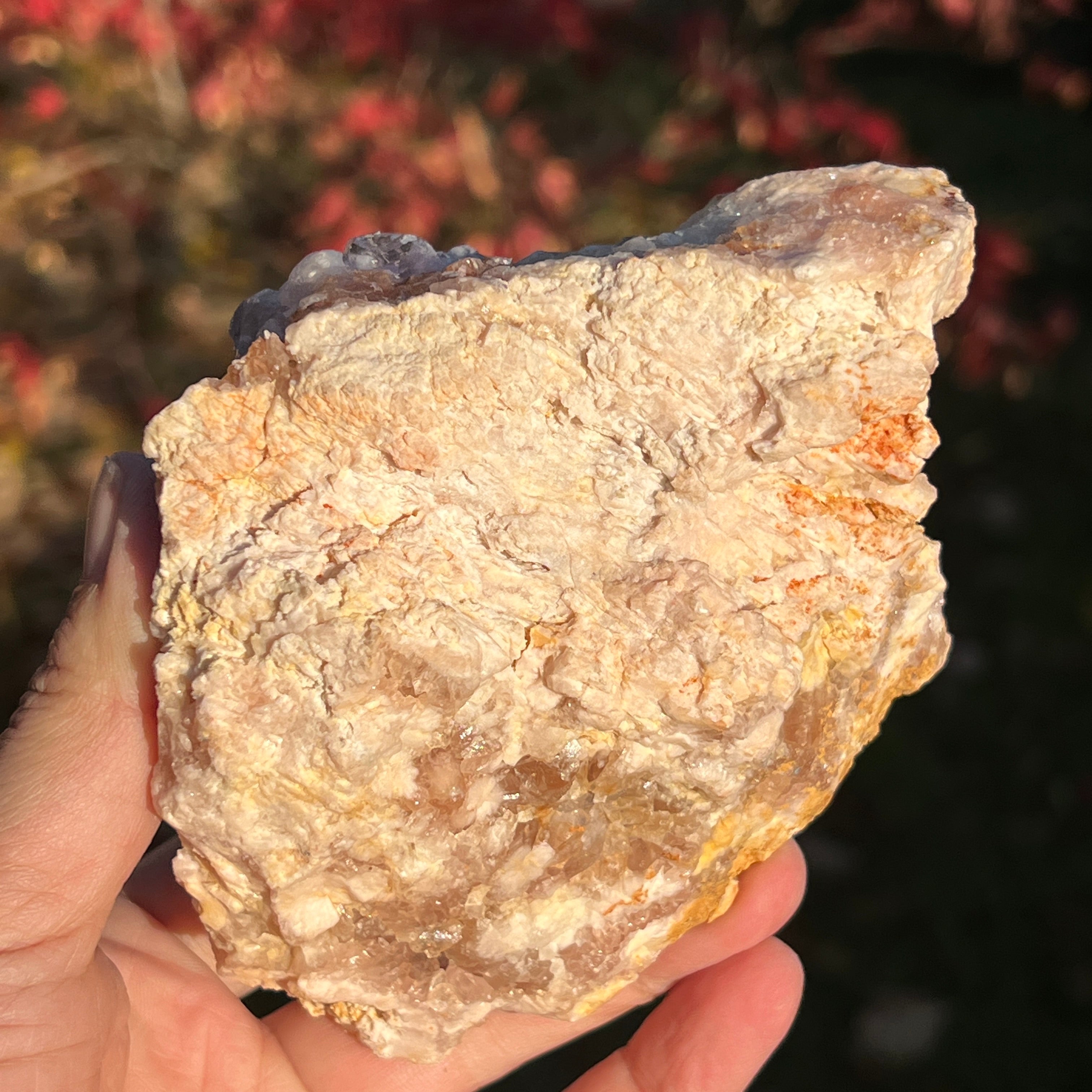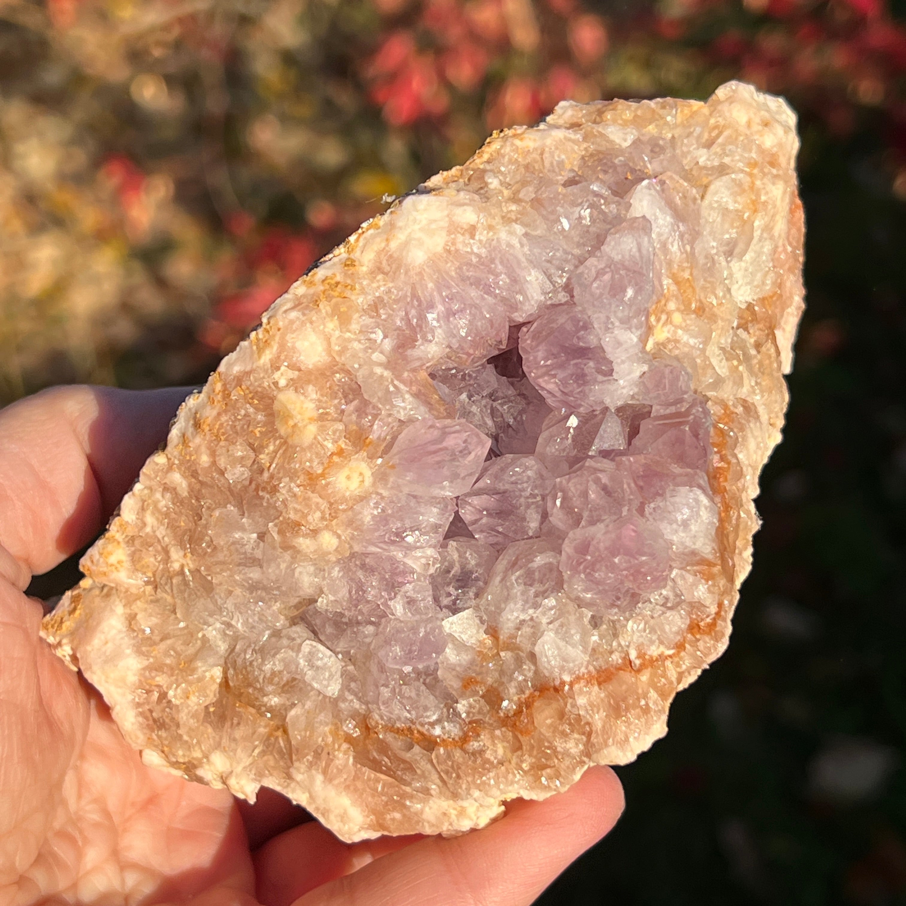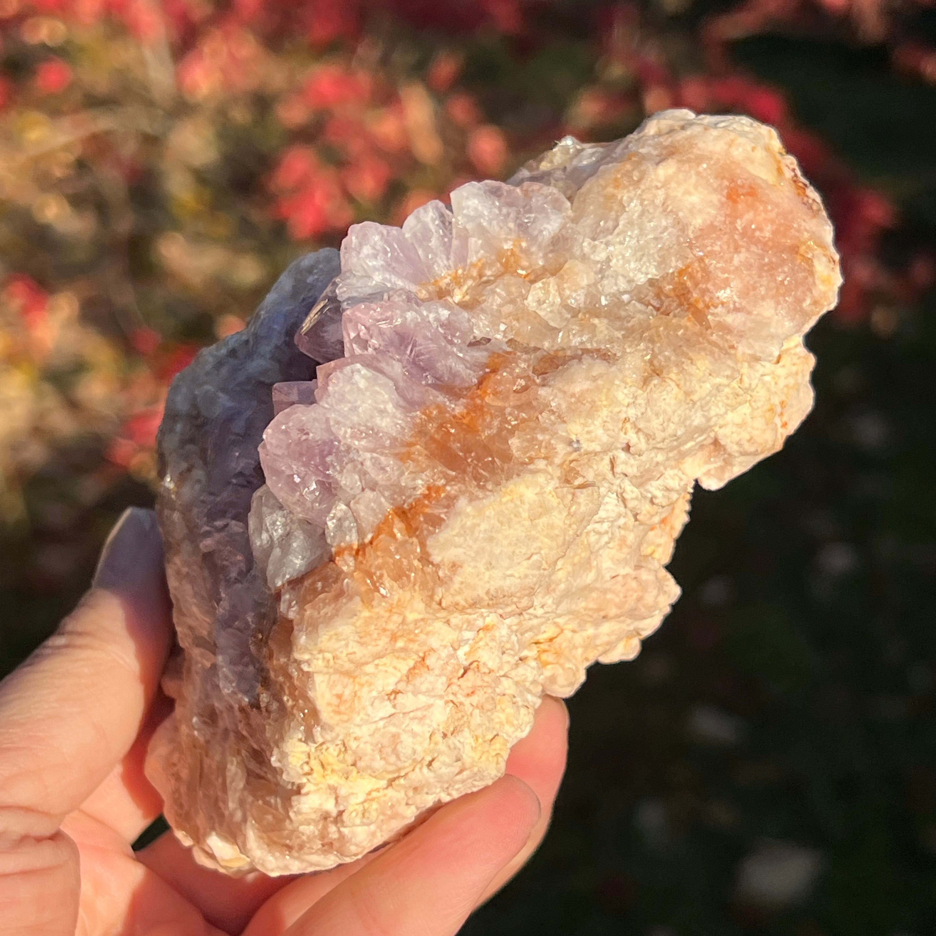 A lila kristályok közvetlenül az achát alapra nőttek, nyitott, ragyogó struktúrát alkotva, mintha a kőben virágoztak volna.