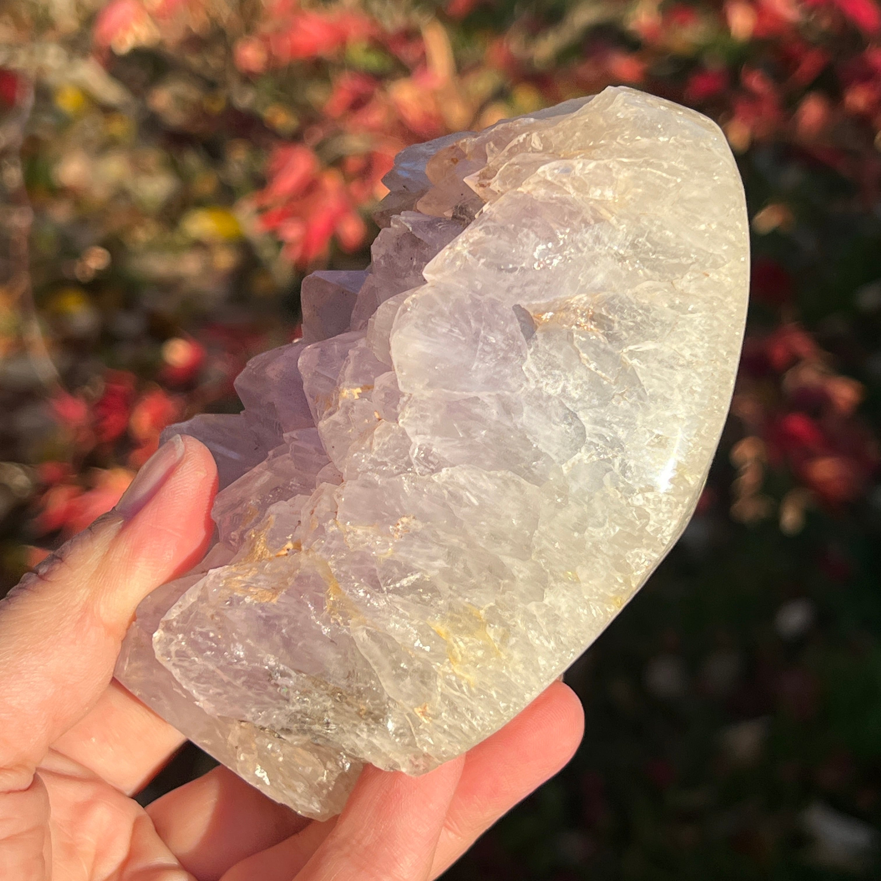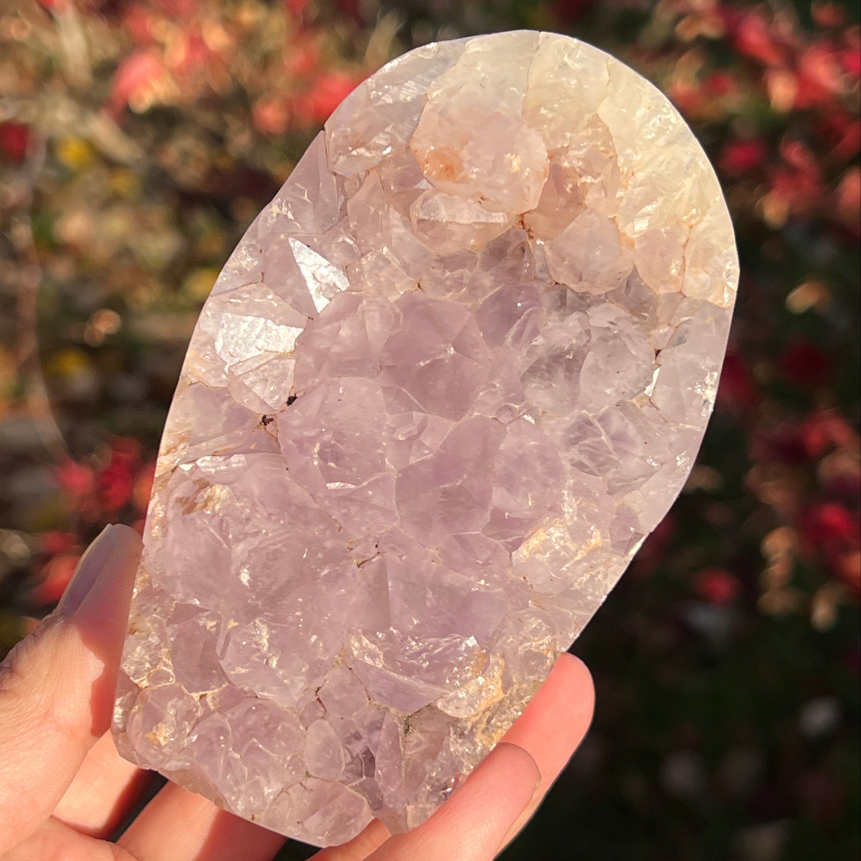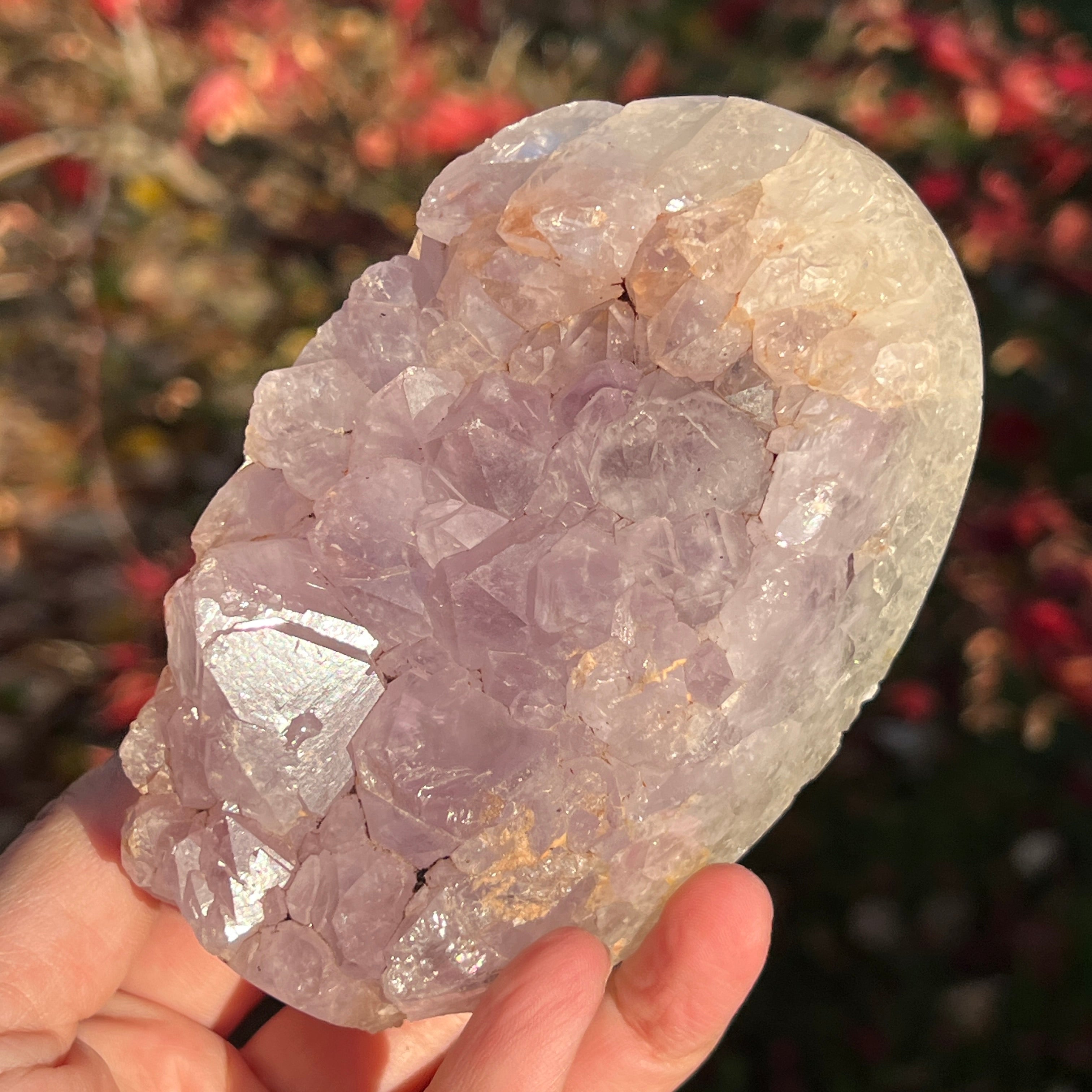 Ez az ametiszt kristályos achát ércvirág egy ritka természetes darab, mely a Föld mélyén keletkezett, ott, ahol az achát lágy vonalai találkoznak az ametiszt misztikus csillogásával.