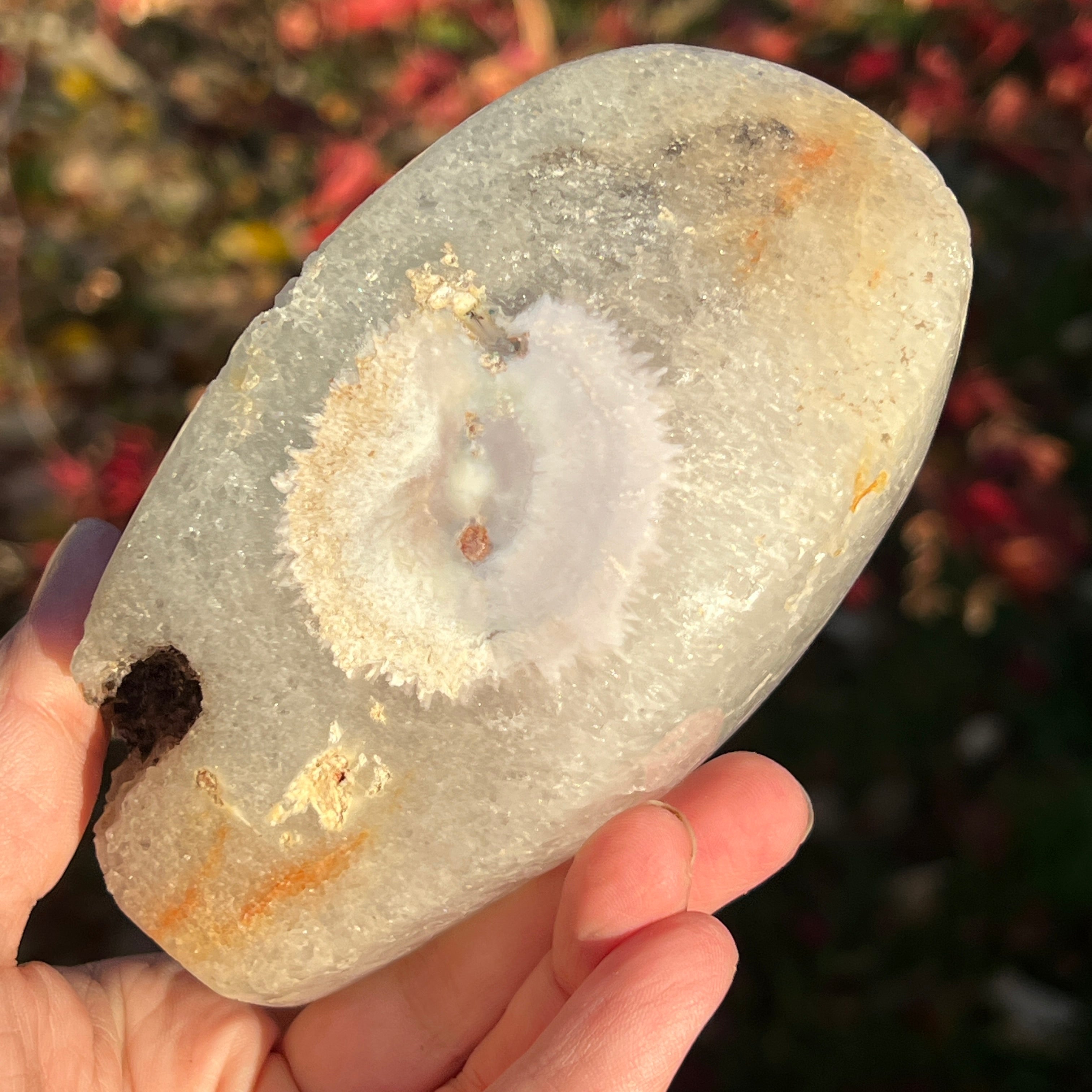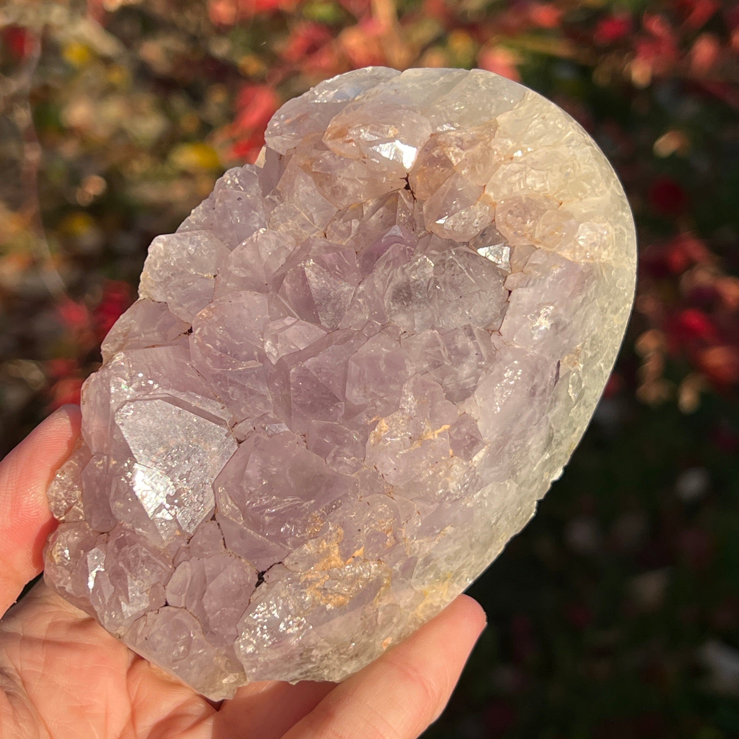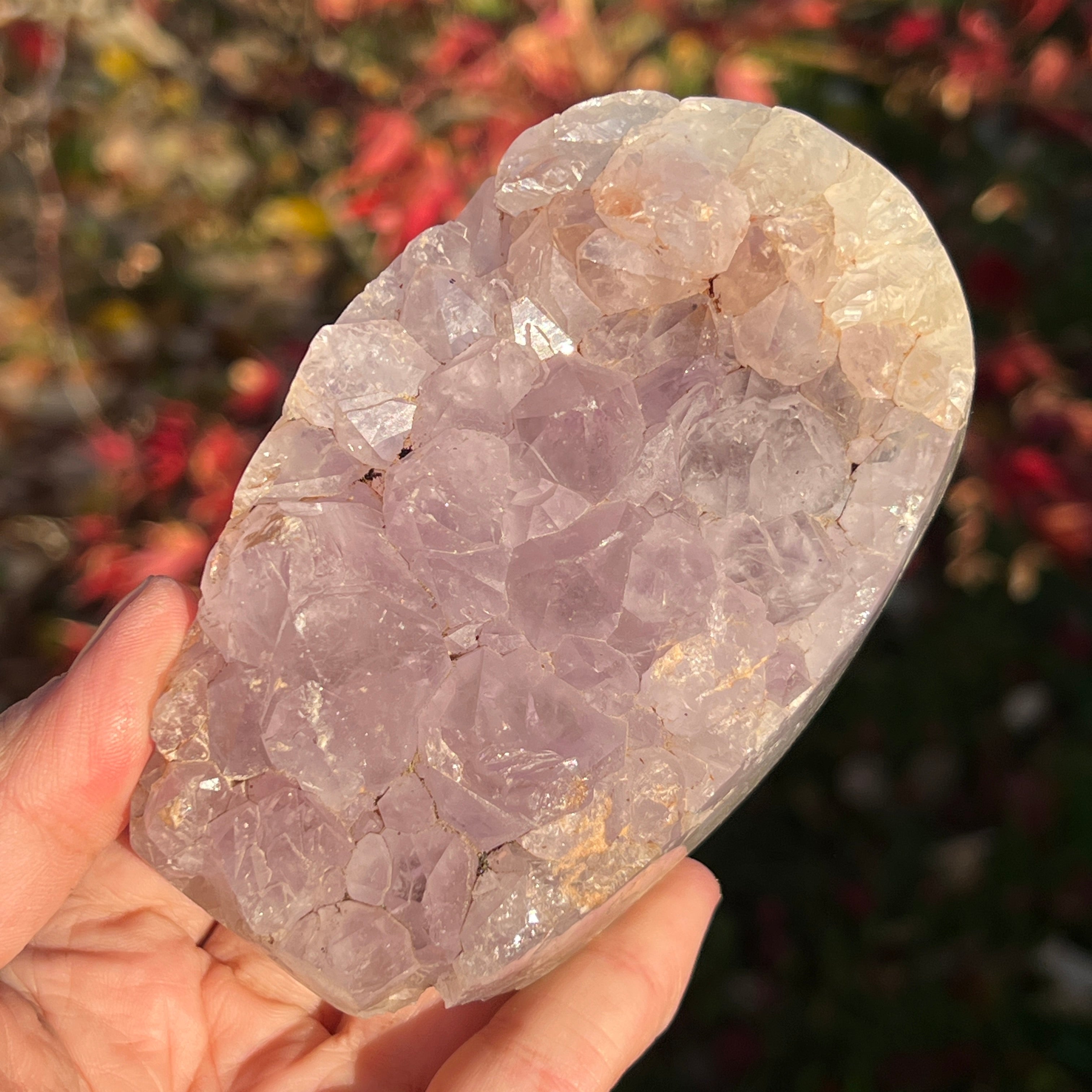 Ez az ametiszt kristályos achát ércvirág egy ritka természetes darab, mely a Föld mélyén keletkezett, ott, ahol az achát lágy vonalai találkoznak az ametiszt misztikus csillogásával.