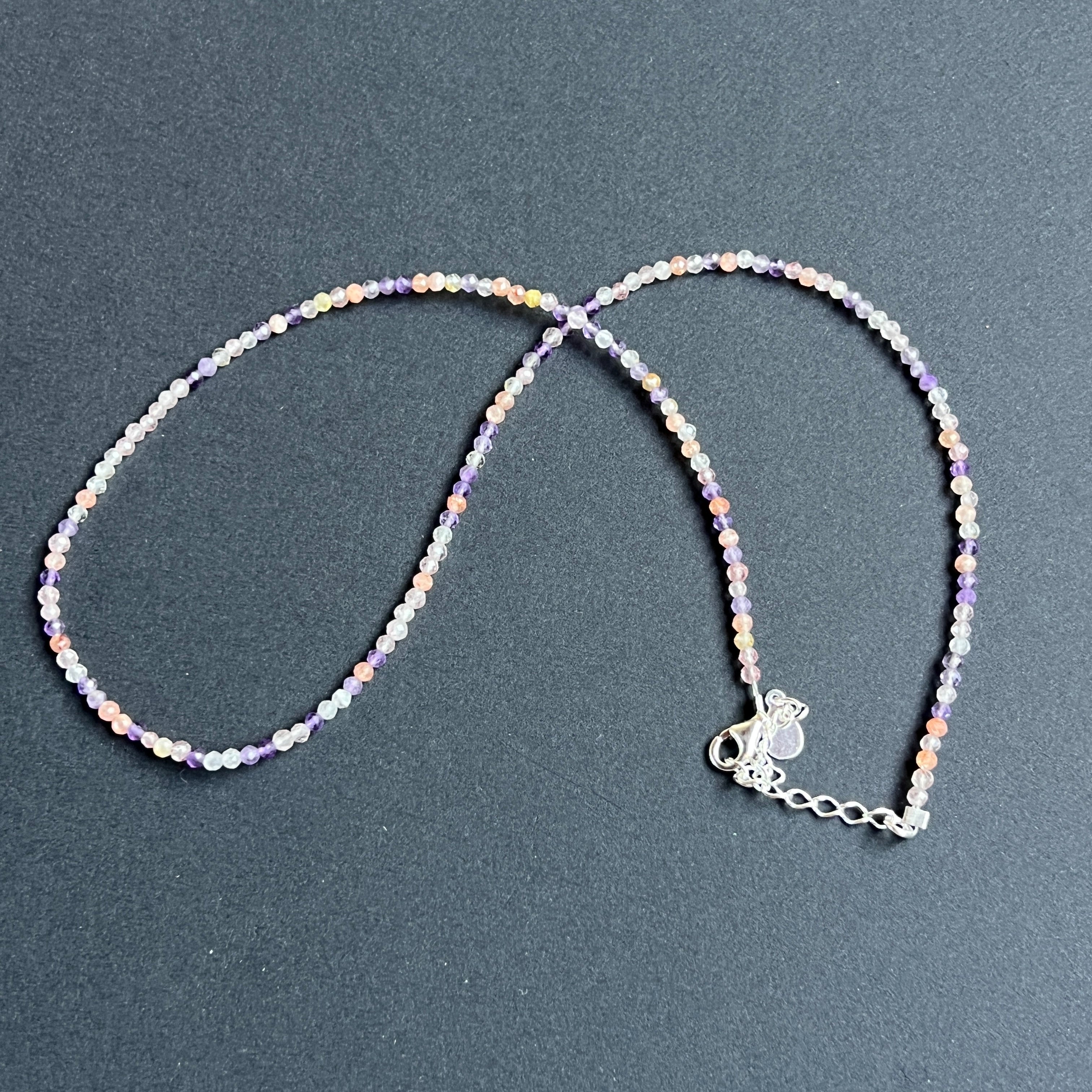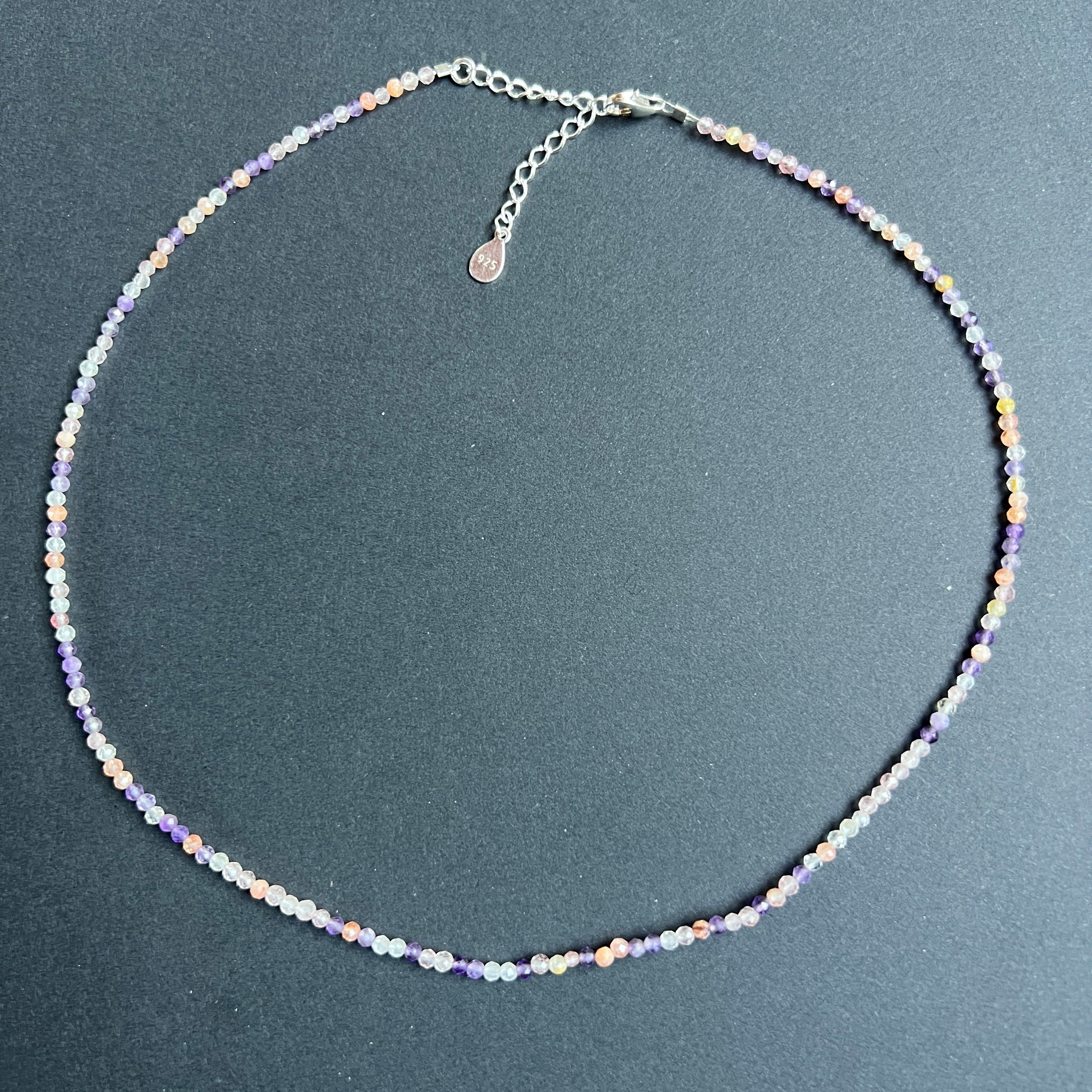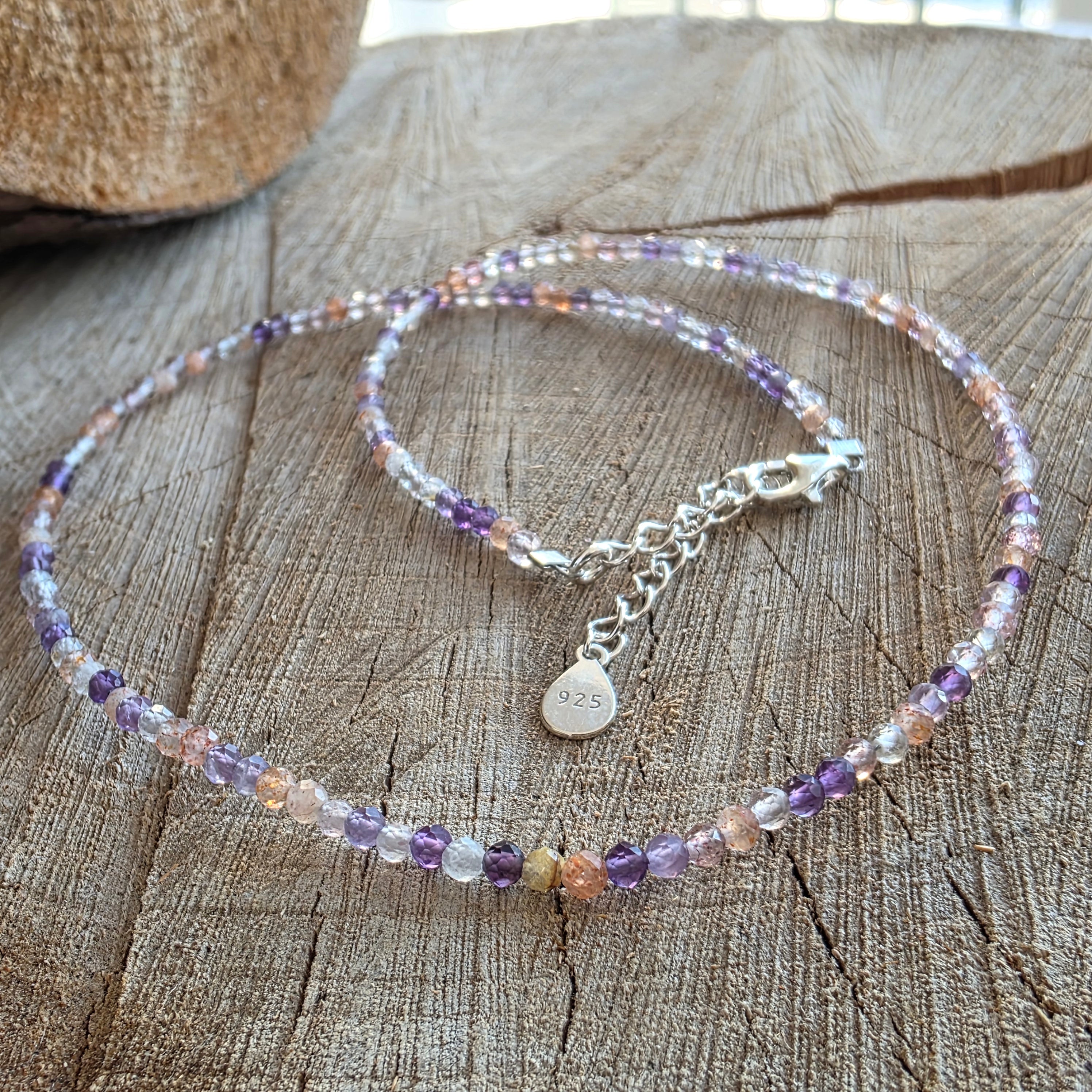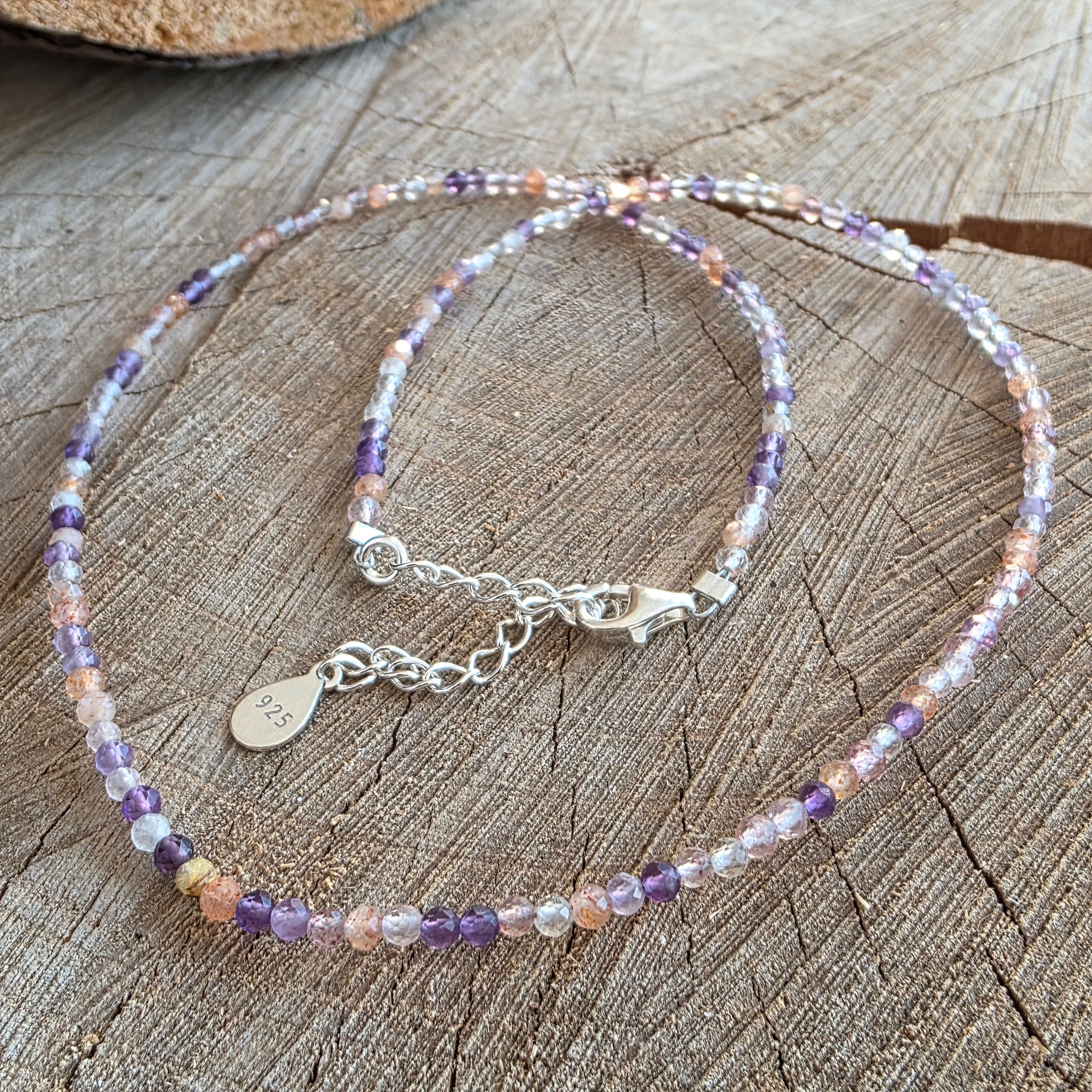 A szál harmonikus keverékéből áll, metszett 2,5 mm-es gyöngyökből, mindegyik gondosan csiszolva, hogy a fényt finom szögekből tükrözze. Az ametiszt lazító és introspektív lila árnyalatokat hoz, a rózsakvarc melegséget és szeretetet sugároz, a citrin a napfény szikráit szórja szét optimizmussal, míg a színtelen kvarc tisztán és világosan tartja a teret, mint egy mély lélegzet a gondolatok között.