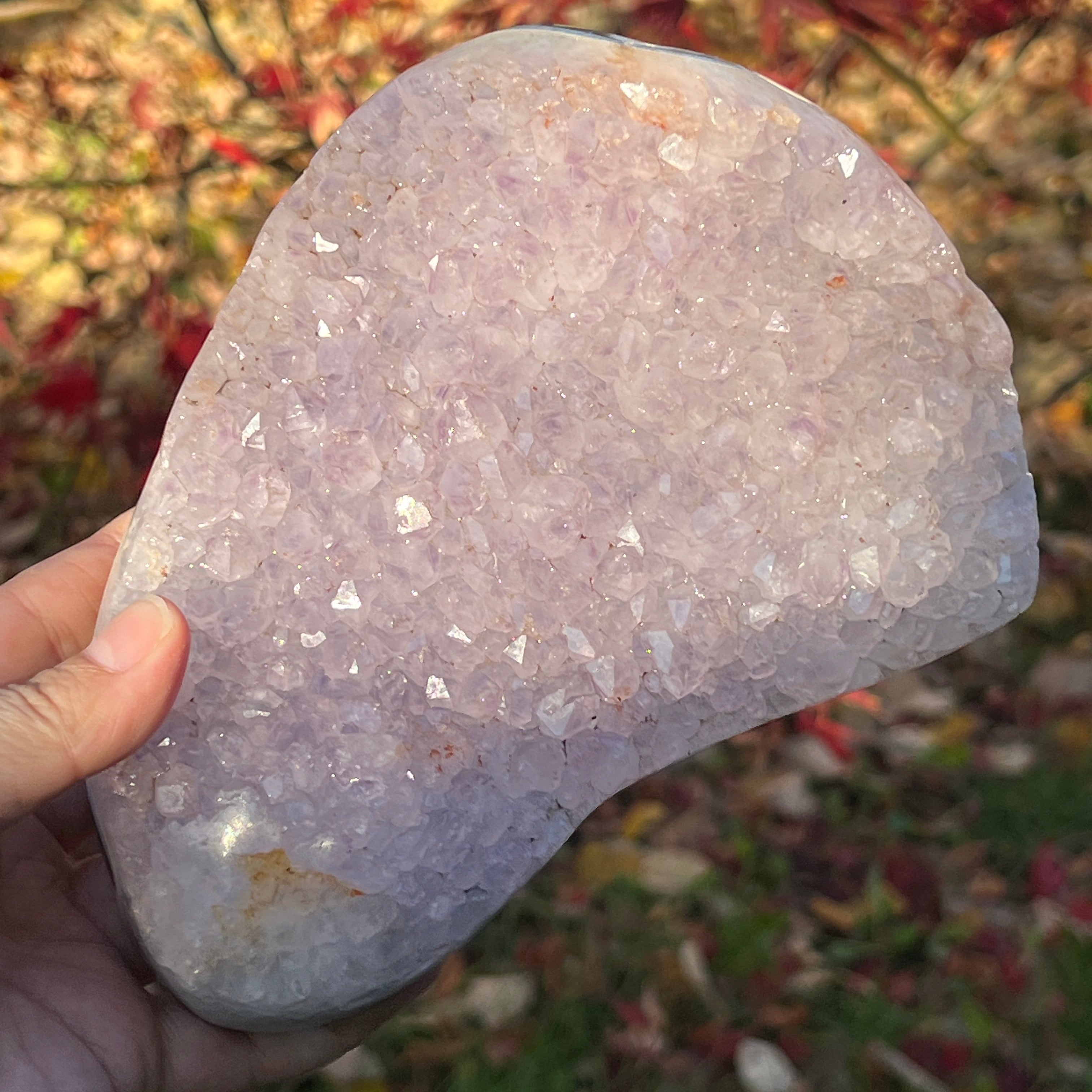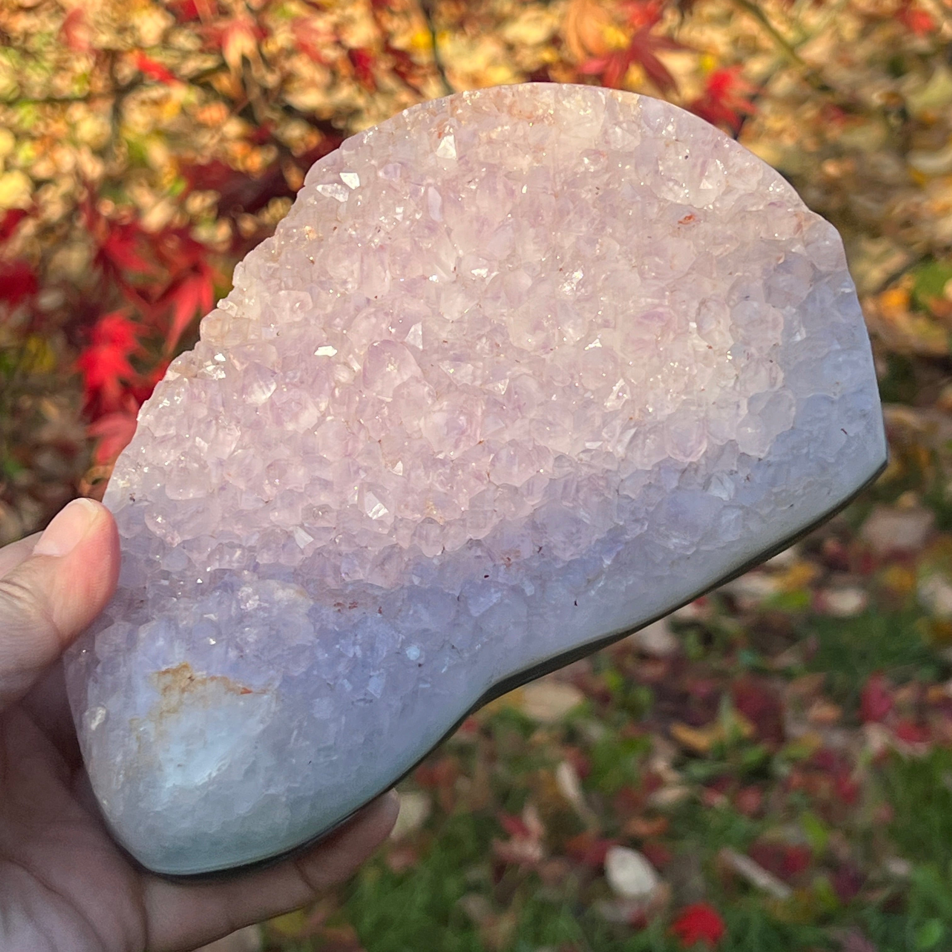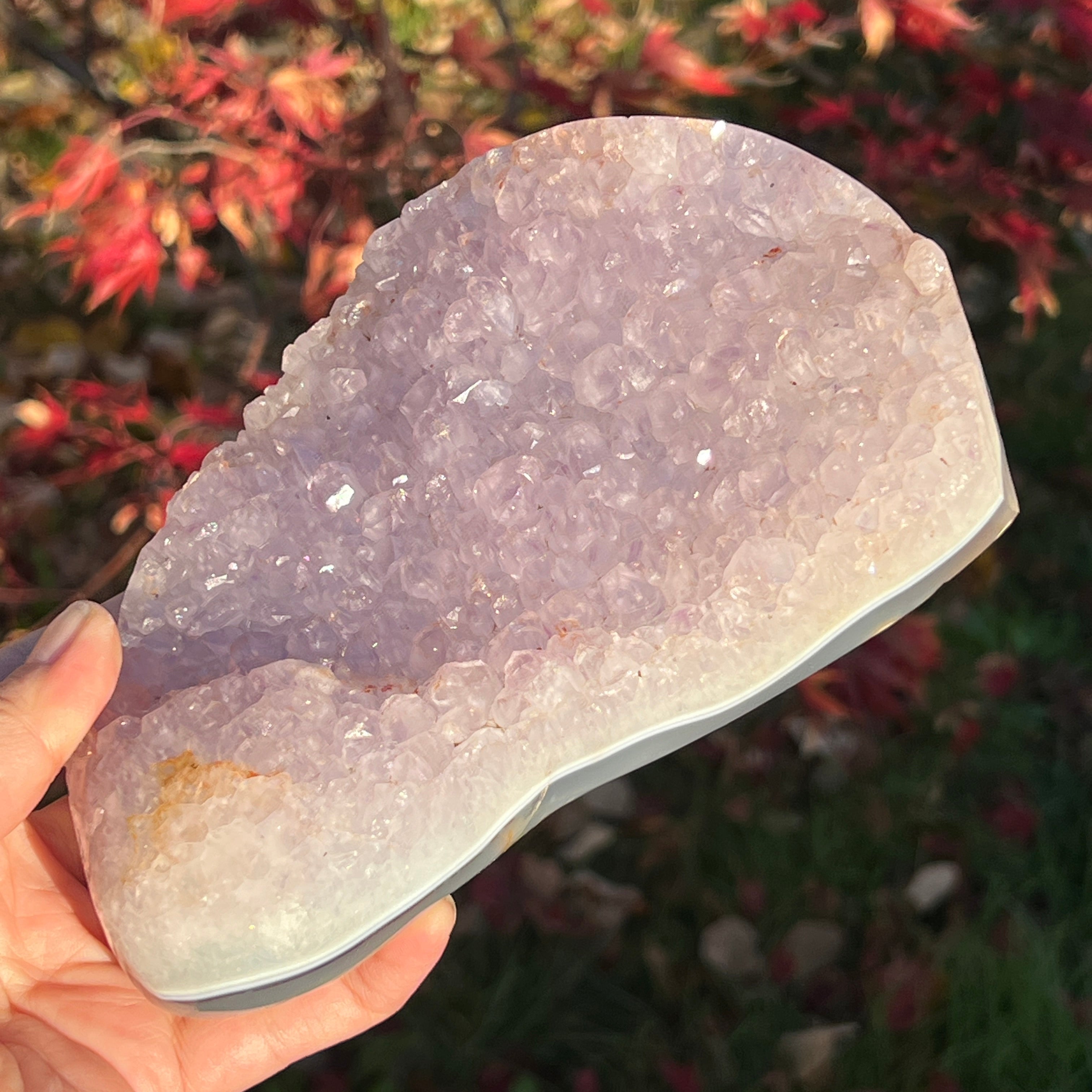 A lila kristályok közvetlenül az achát alapra nőttek, nyitott, ragyogó struktúrát alkotva, mintha a kőben virágoztak volna.
