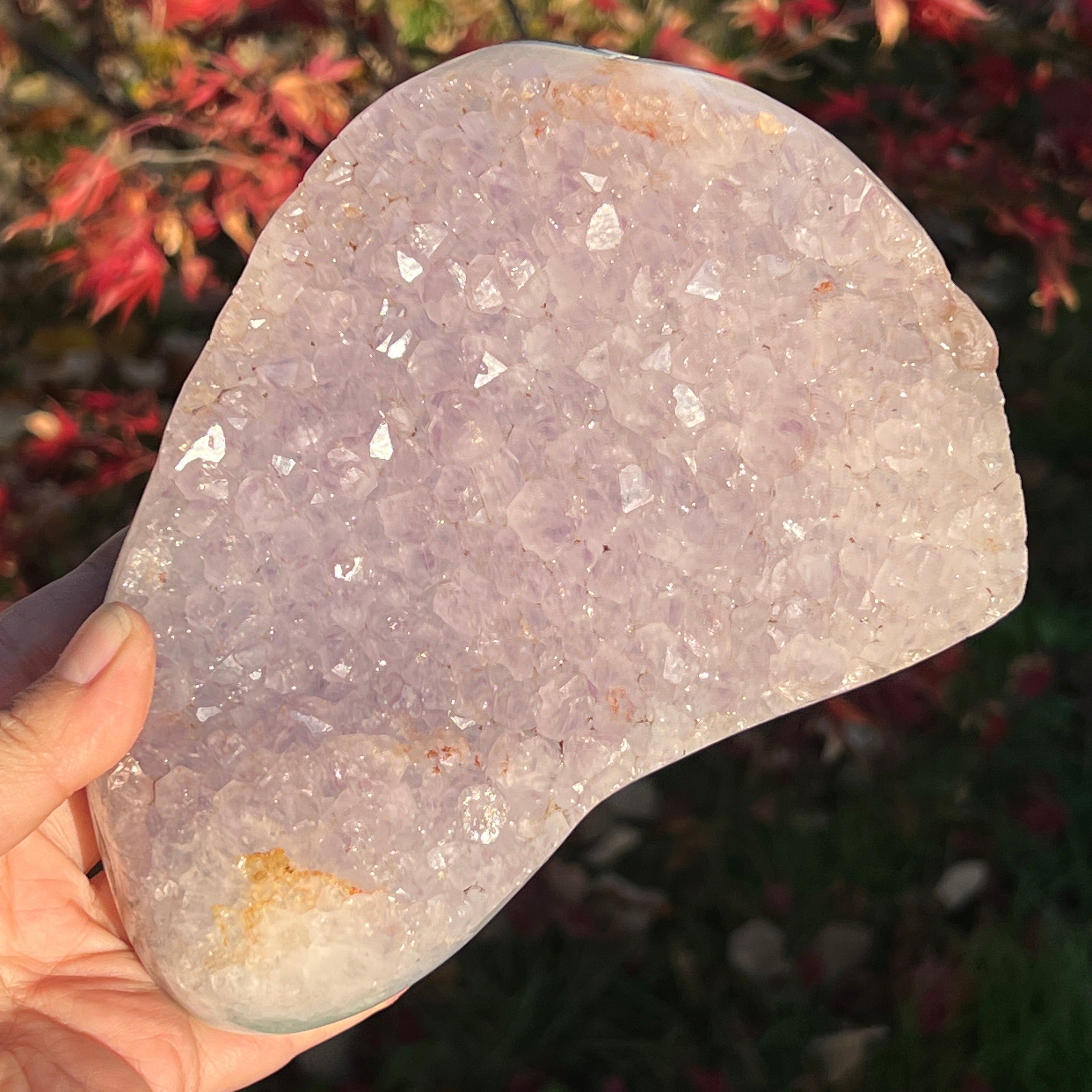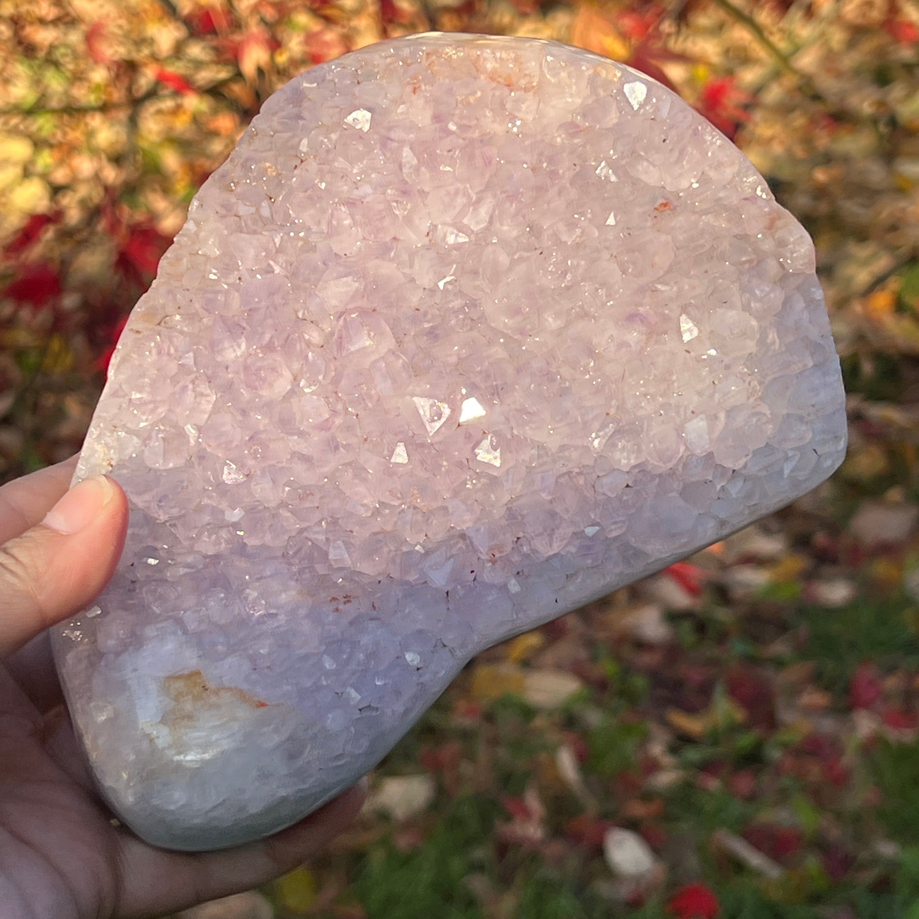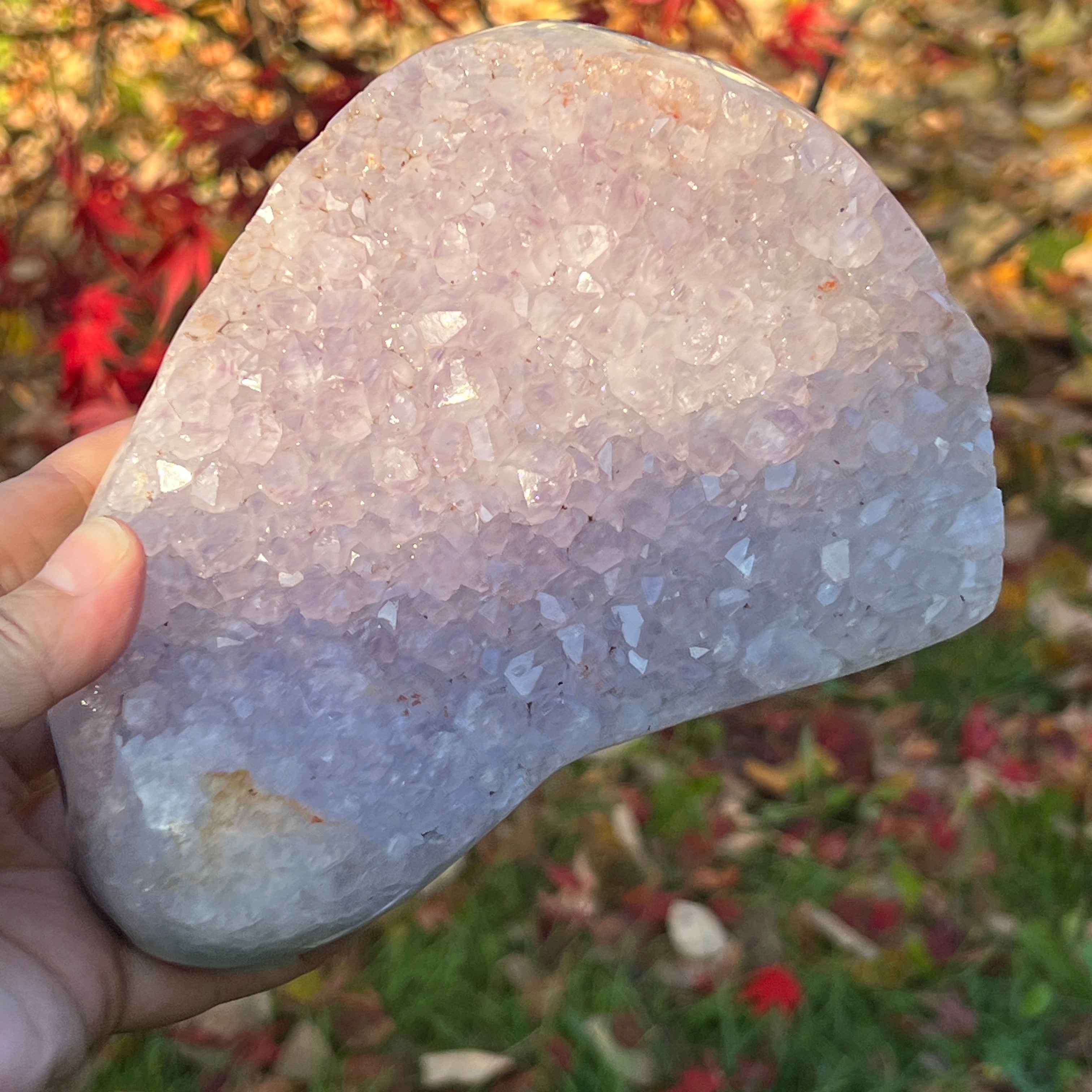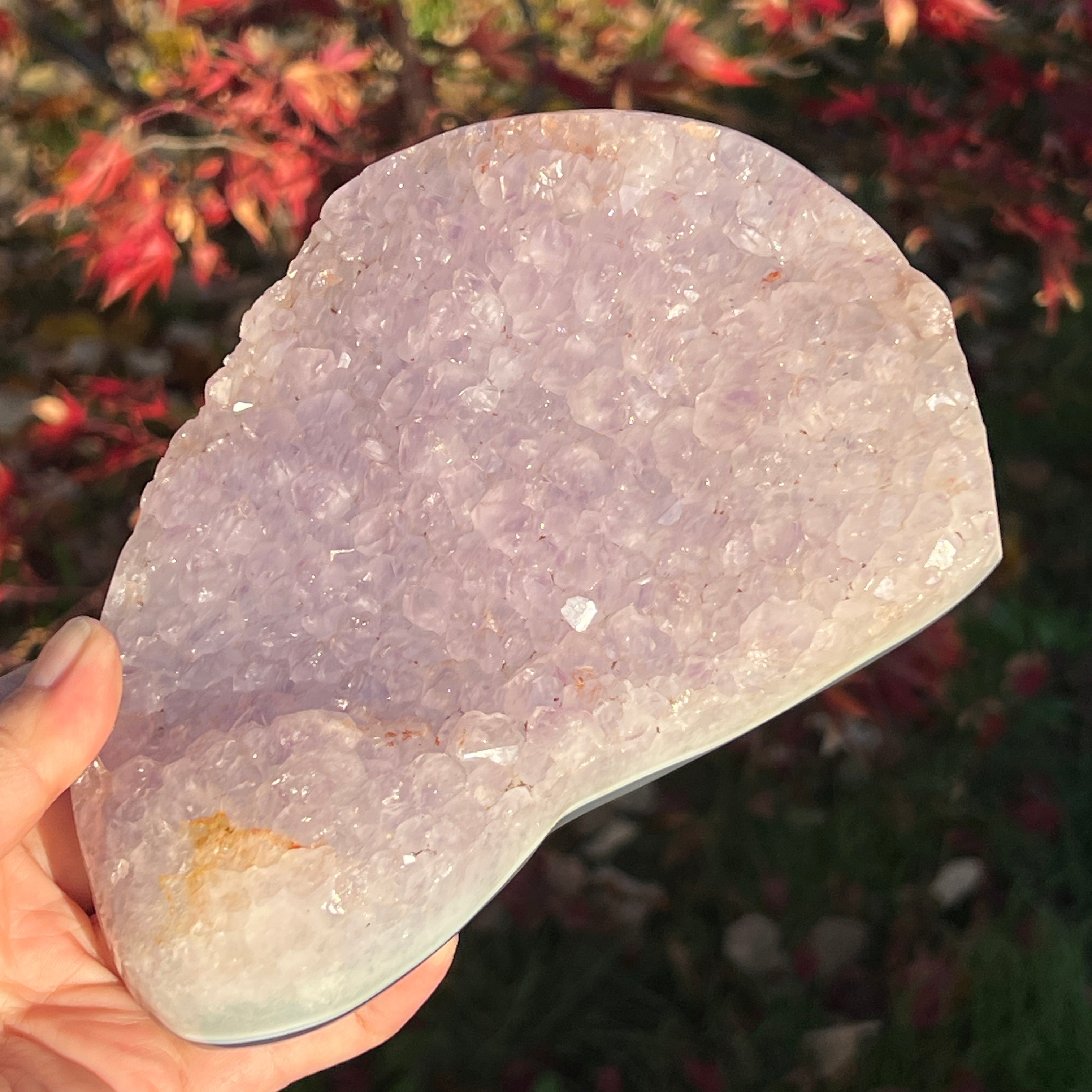 A lila kristályok közvetlenül az achát alapra nőttek, nyitott, ragyogó struktúrát alkotva, mintha a kőben virágoztak volna.