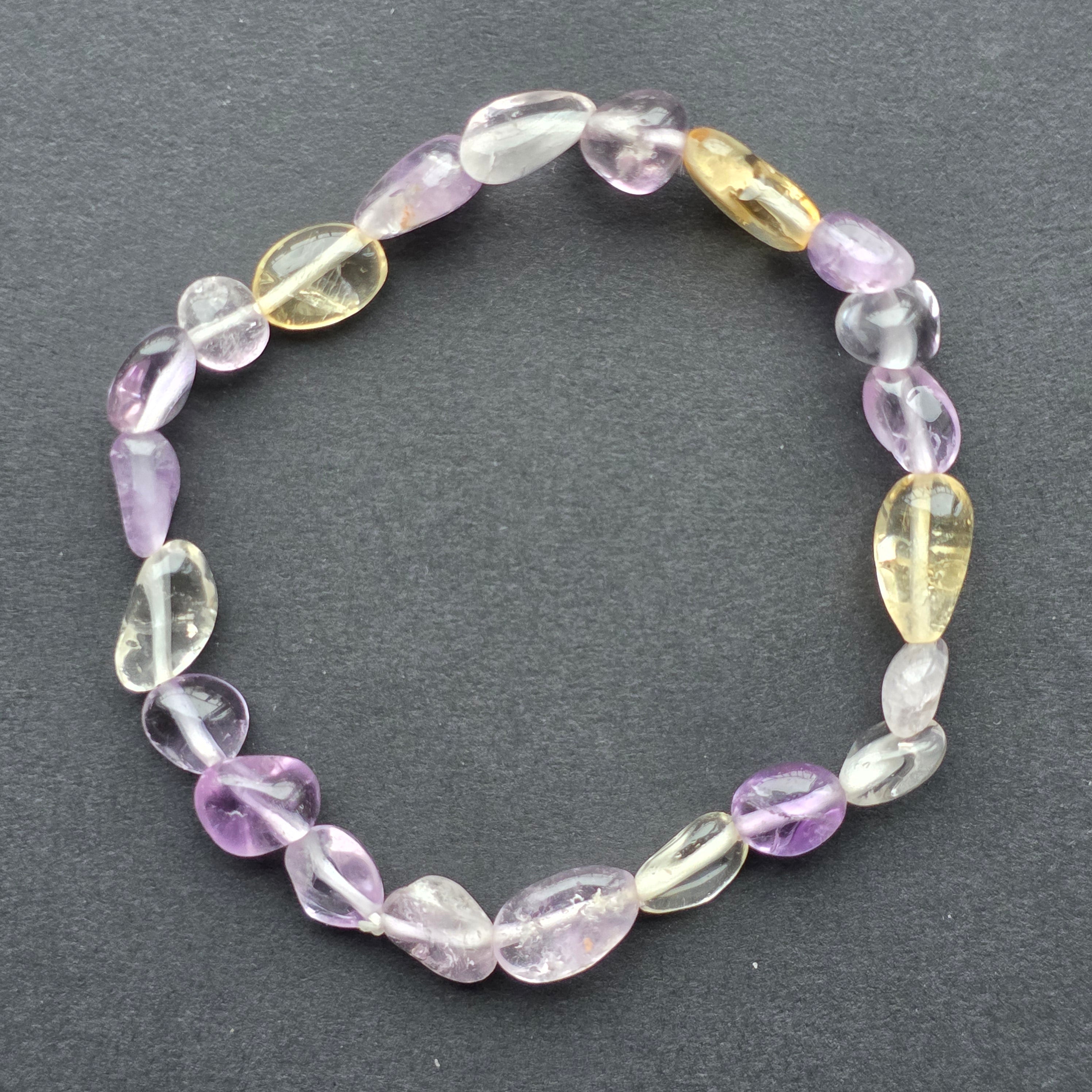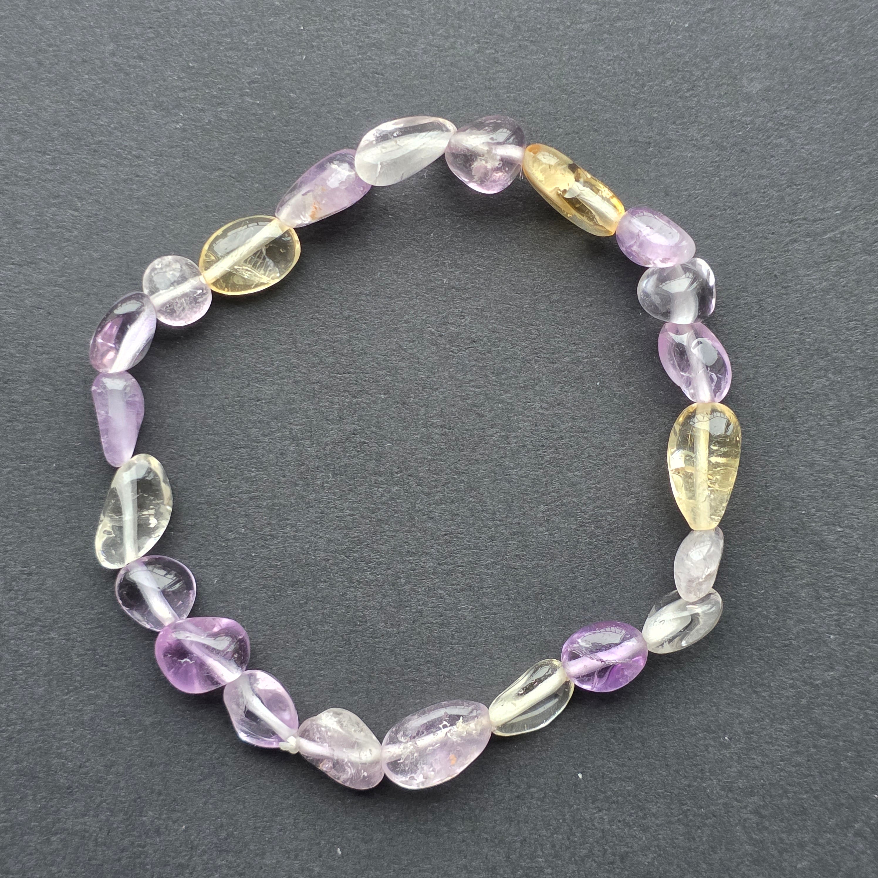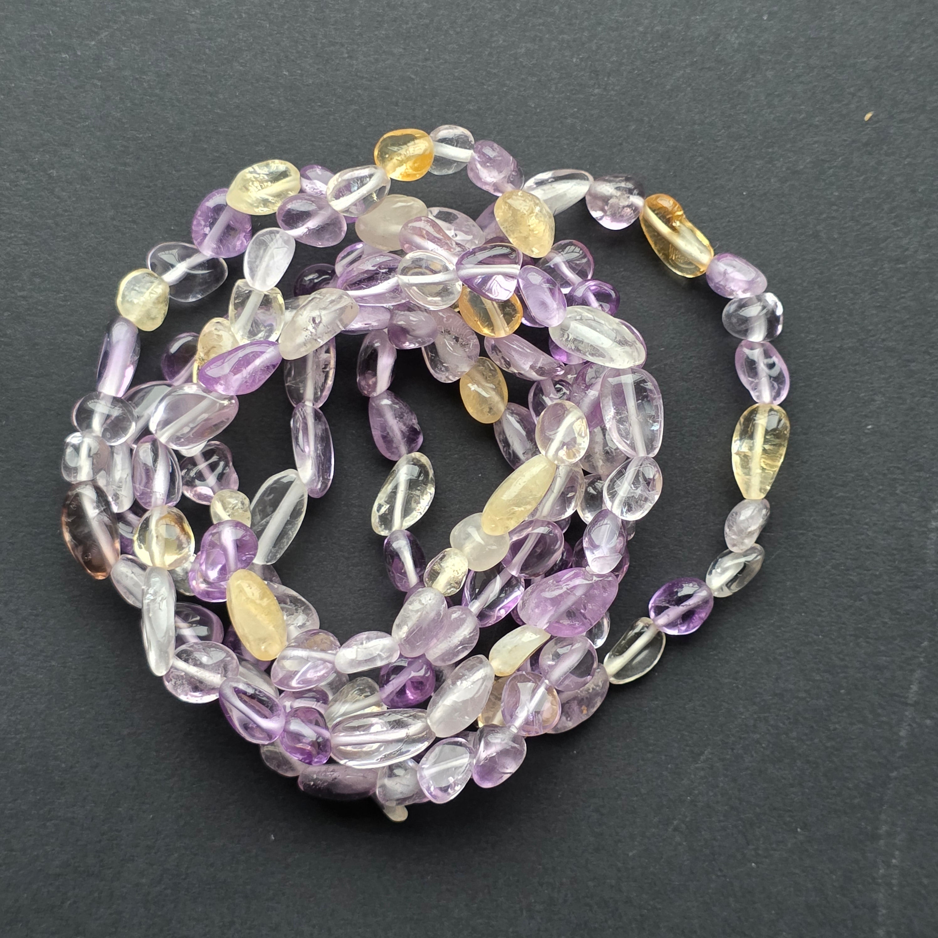 Az ametrin az egyik legelbűvölőbb természetes kő, amely egyetlen kristályban egyesíti a két energiát és két színt: az ametiszt mélyliláját és a citrin aranyló fényét. Ebben a karkötőben minden tumble kő megőrzi annak a geológiai átalakulásnak a nyomait, amely ezt a ritka kombinációt létrehozta – a nyugalom és a tisztaság, az intuíció és az életenergia tökéletes összefonódása.