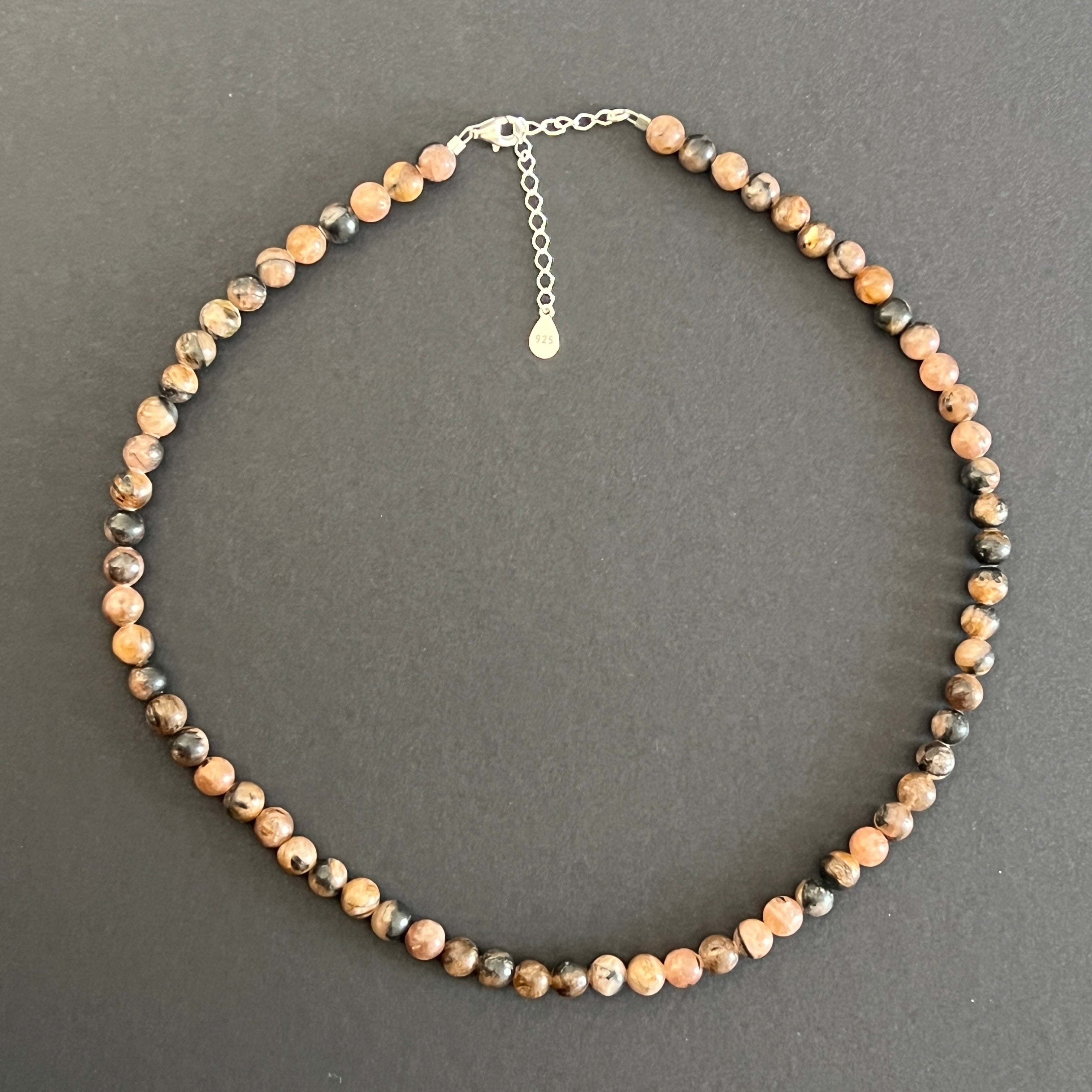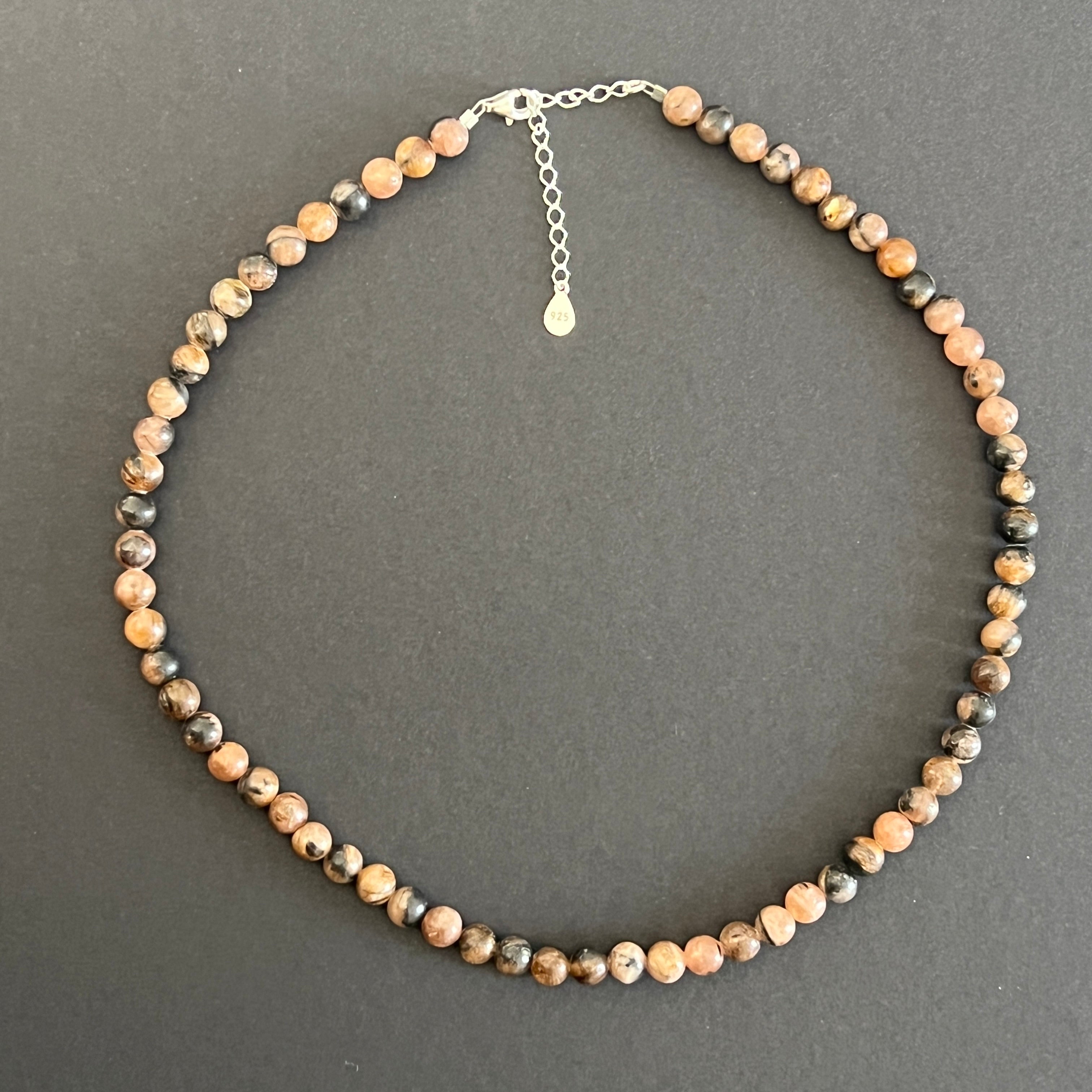 Egy nyaklánc, amely magában hordozza a szent és a titokzatos lenyomatát. A chiastolite, más néven "kereszt köve", természetes szerkezetében a védelem és az istenivel való kapcsolat ősi szimbólumát tárja fel. A 6 mm-es gyöngyök a barna, a szürke és az okker meleg tónusait átszövik, mindegyik a kő magjában rejtett keresztet hordoz, a világos és a sötét közötti egyensúly pecsétjeként.