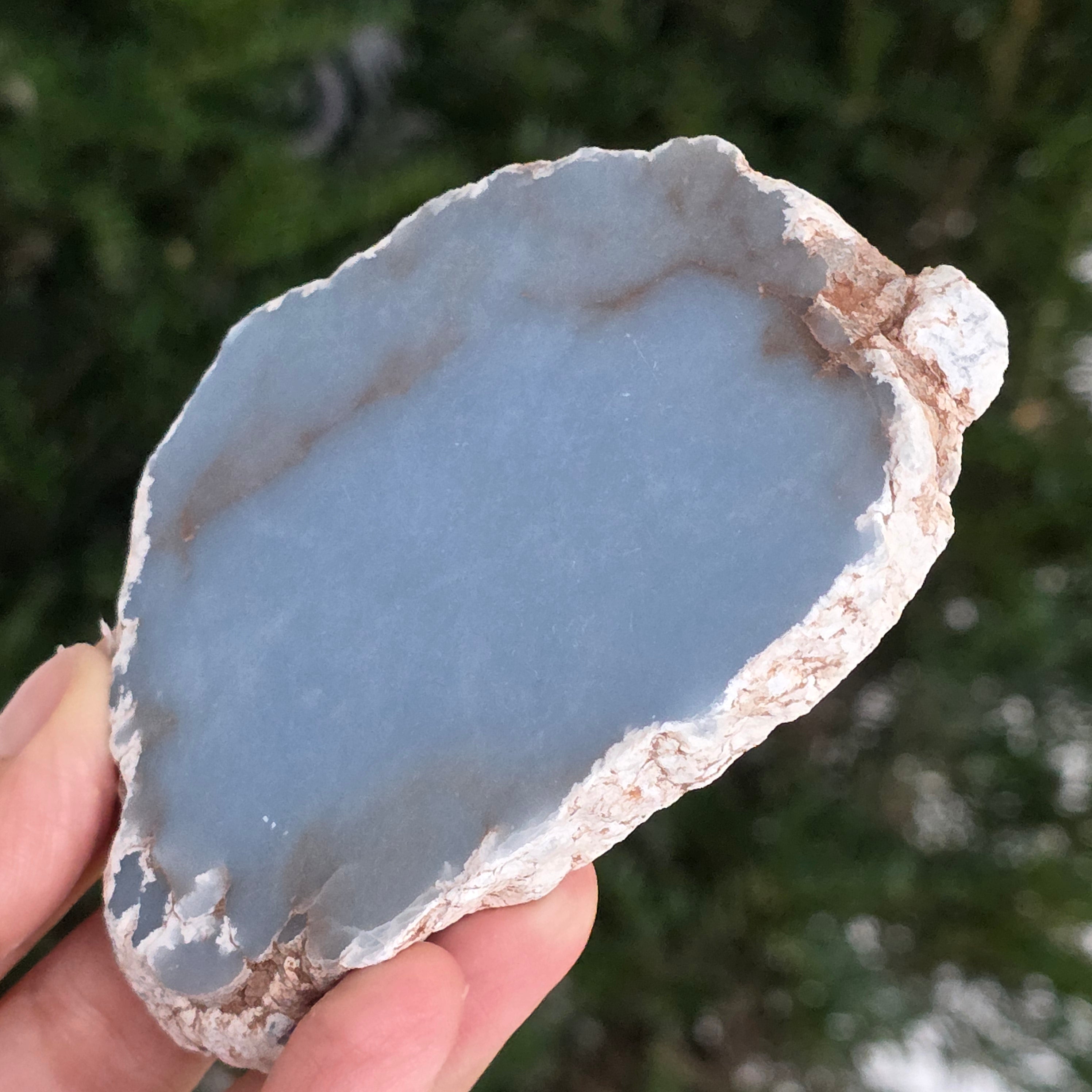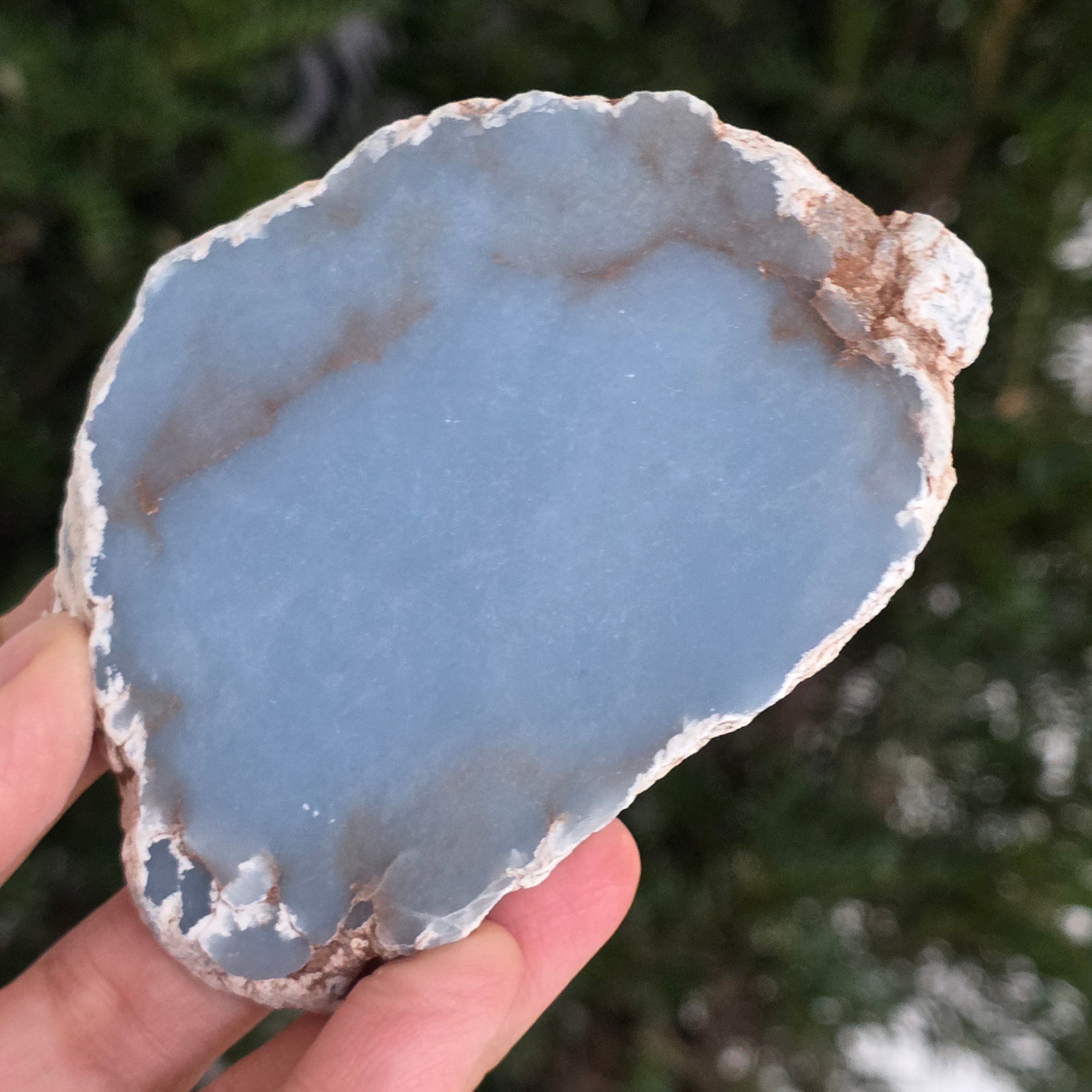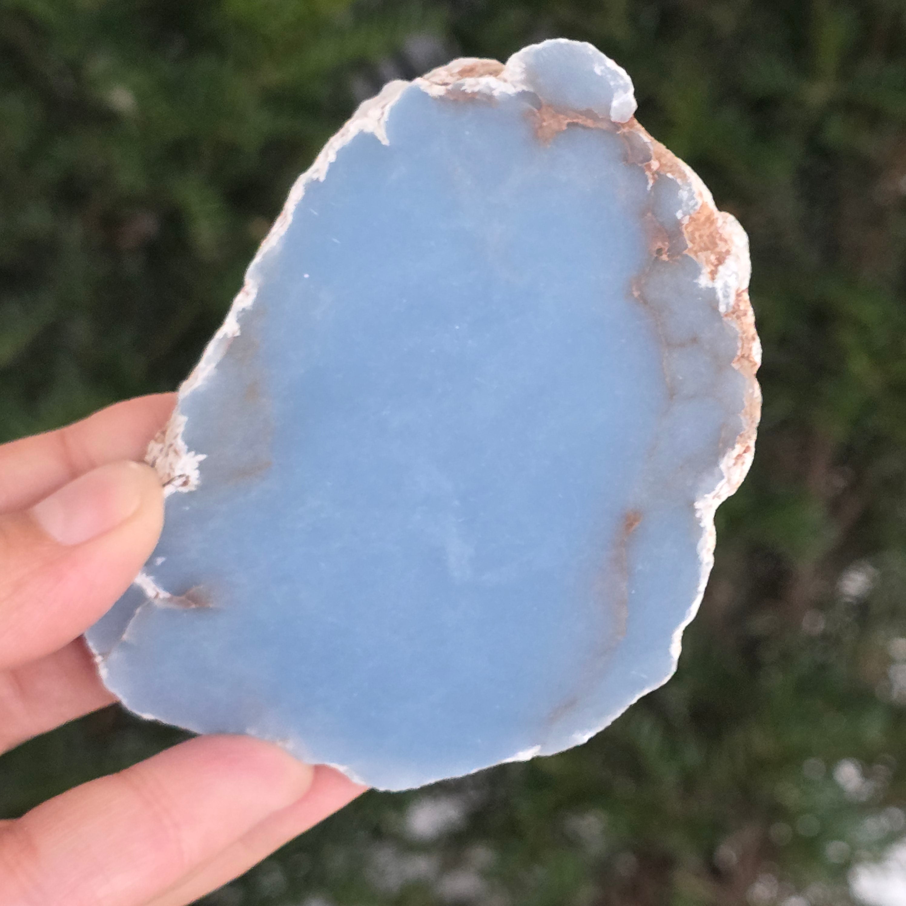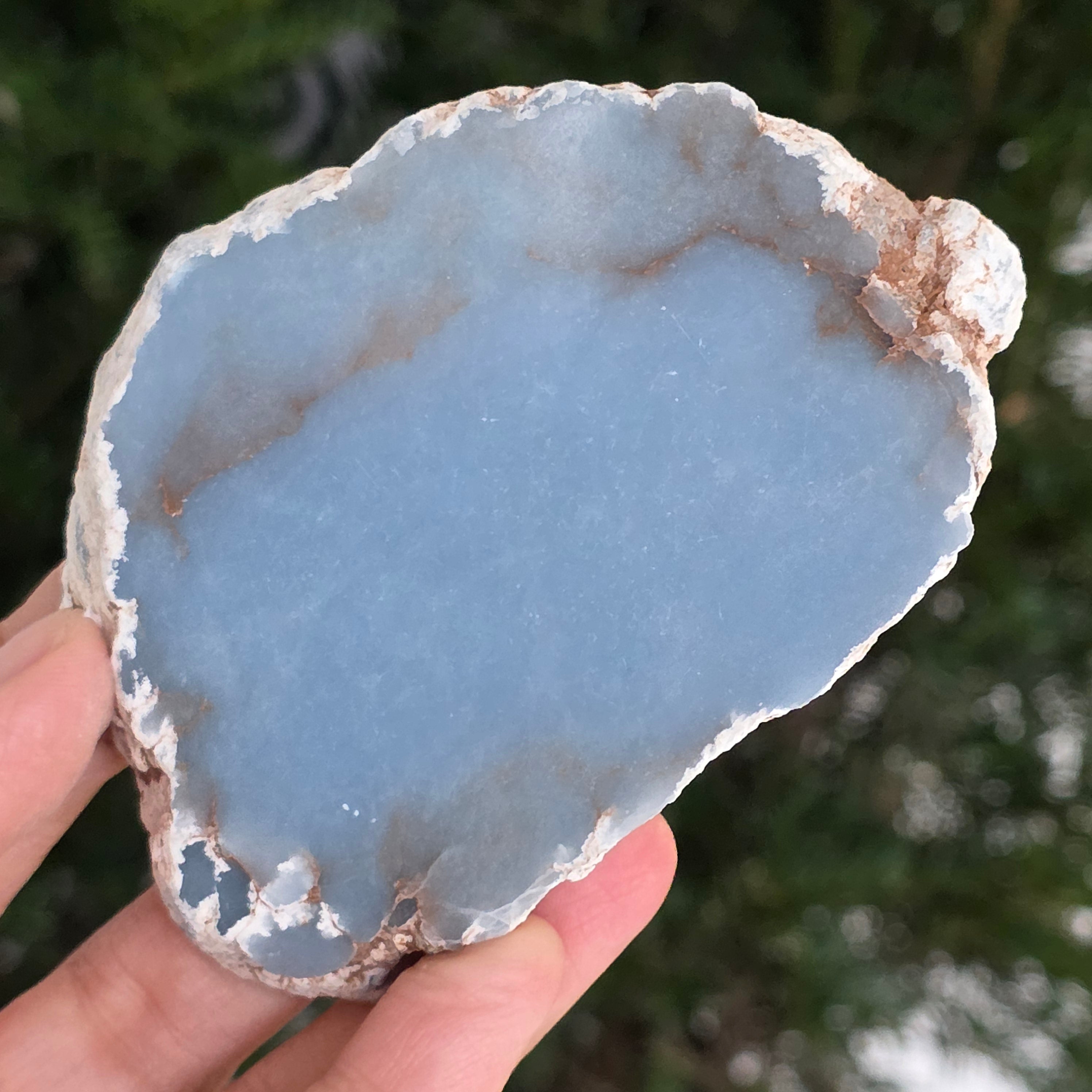Egy ritka darab, mintha az égbolt derengéséből származna. Ez a természetes angelit szeletfinom, tejkék színt tár fel, finom szürke és gyöngyházfehér árnyalatokkal átszőve. A sima felület és a matt textúra nyugalmat és tisztaságot áraszt – egy ásványi ékszer a belső békéhez és egyensúlyhoz.