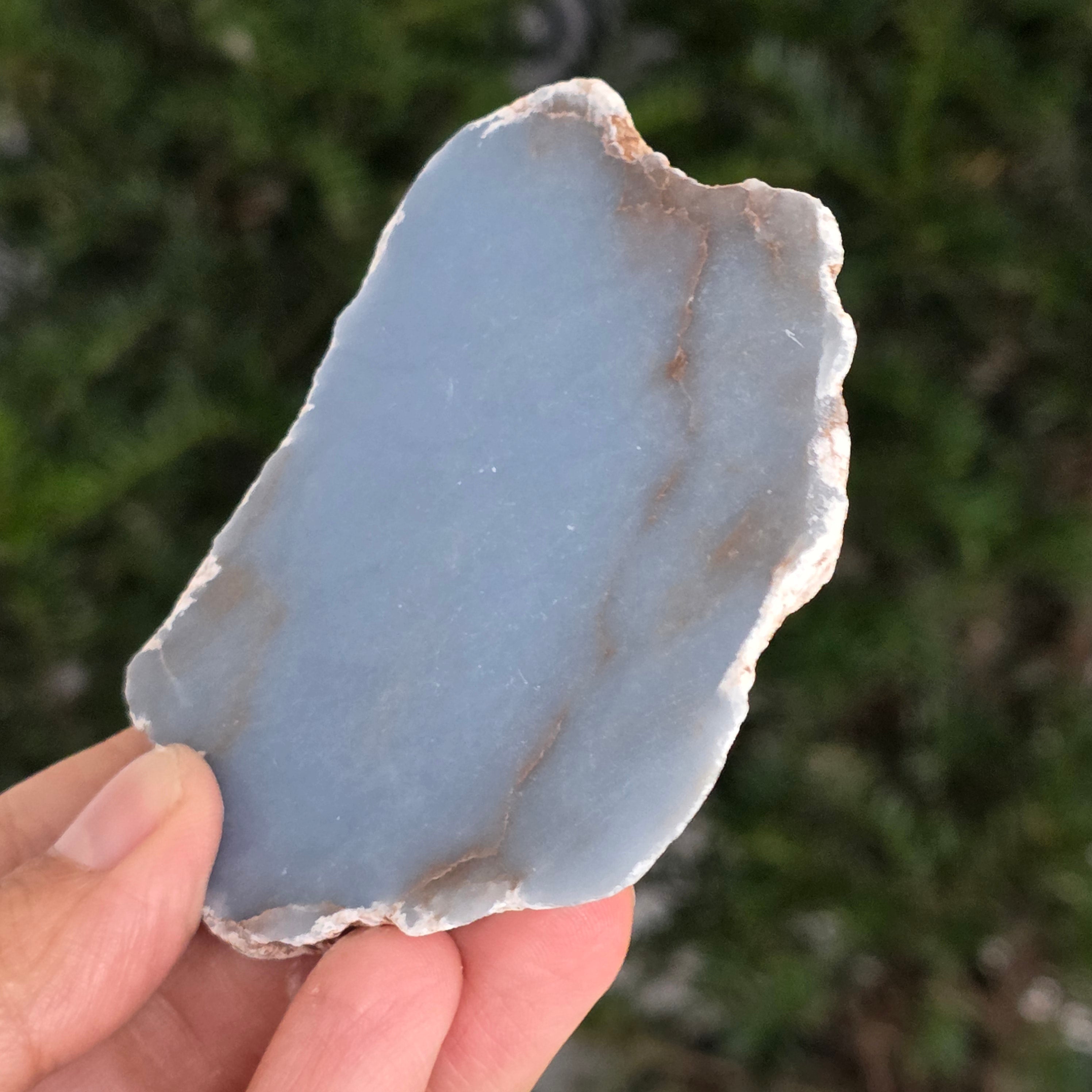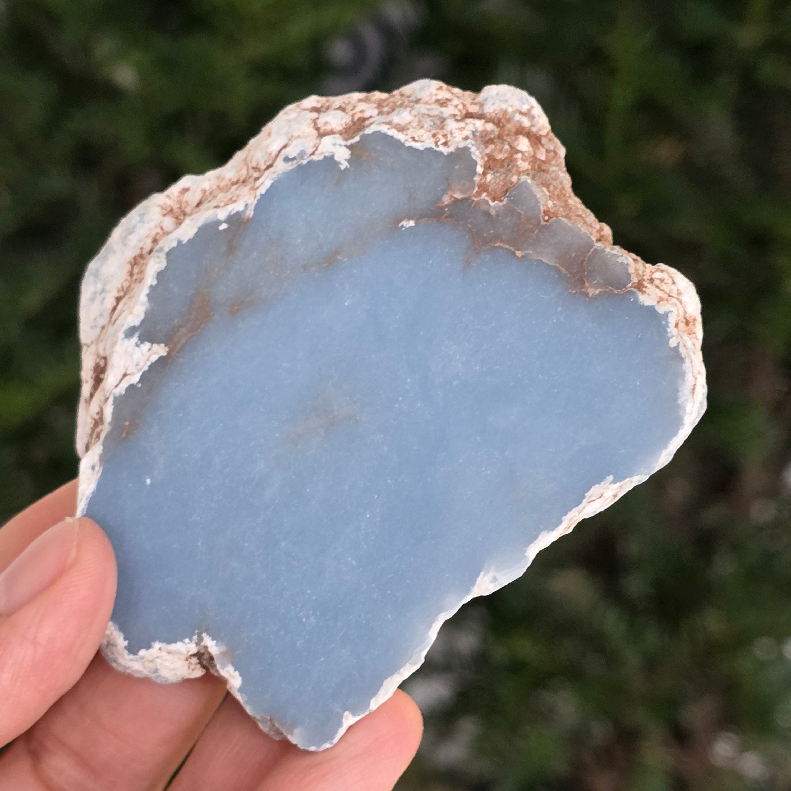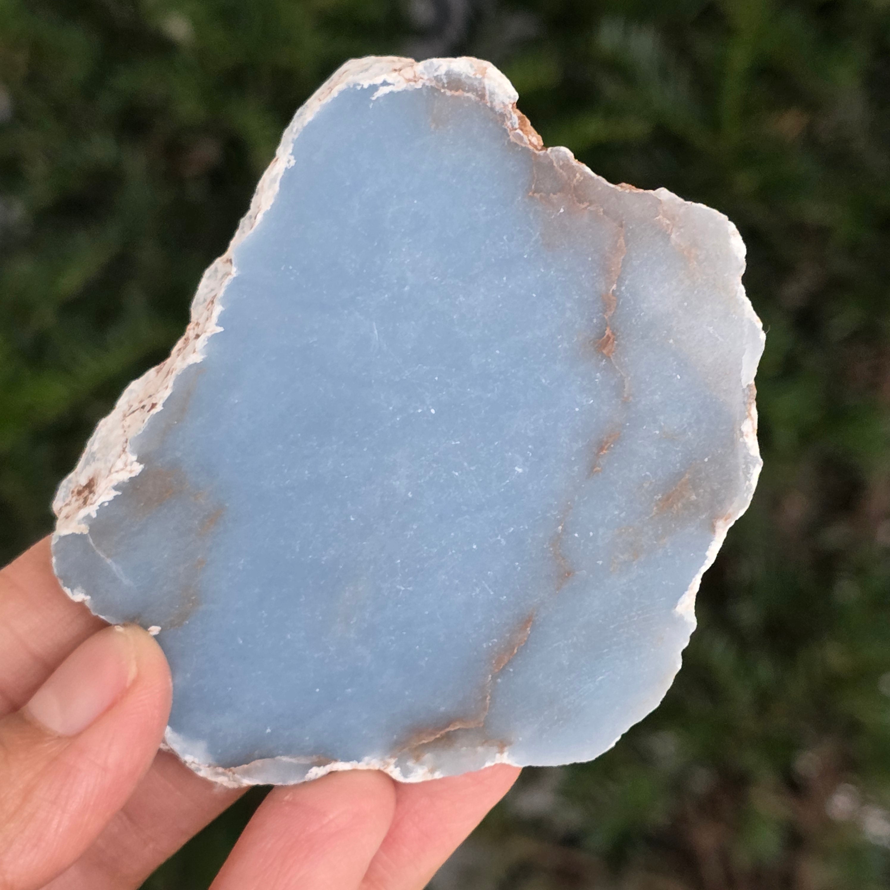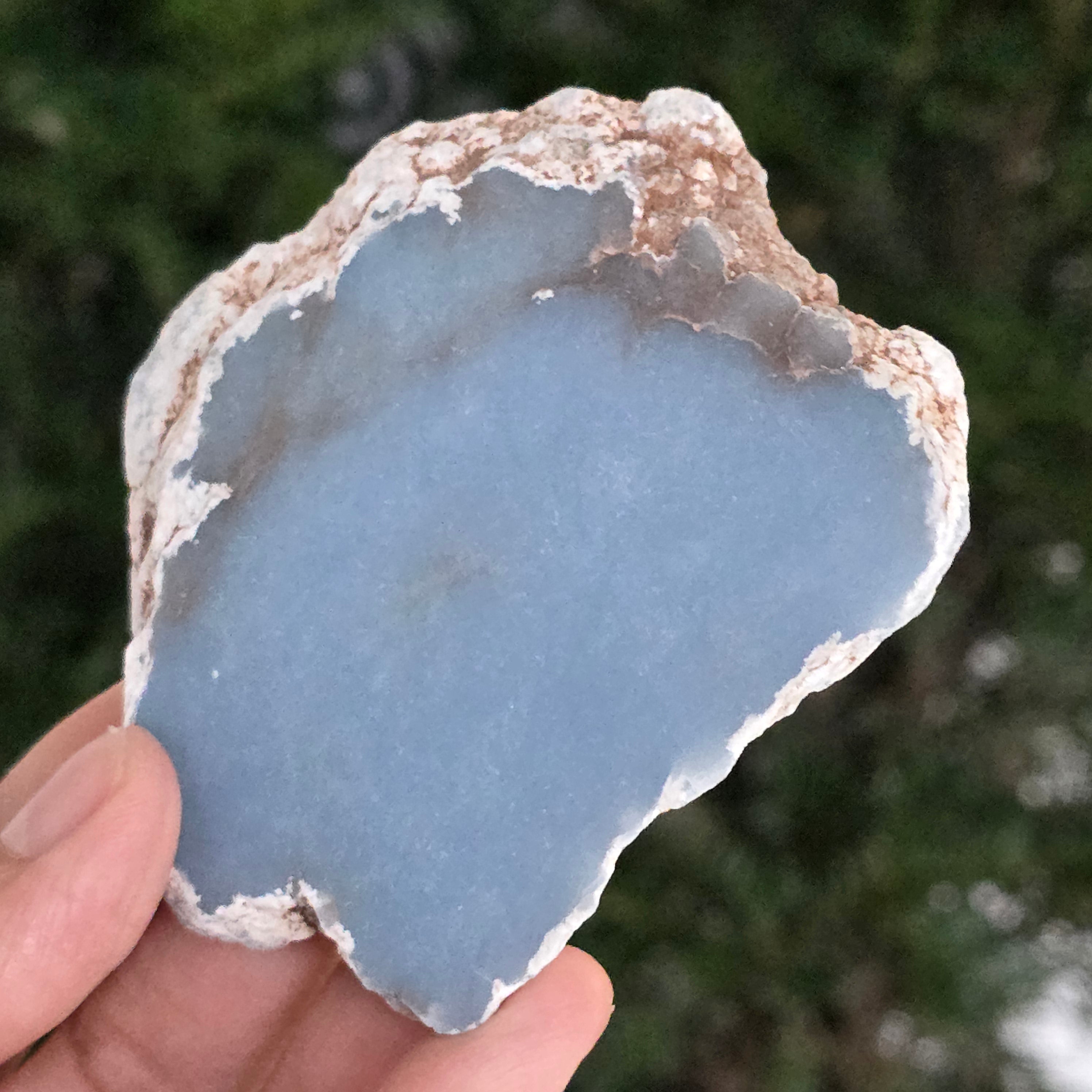 Egy ritka darab, mintha az ég tisztaságából származna. Ez a természetes angelit szeletfinom, tejkék színt tár fel, finom szürke és gyöngyház fehér árnyalatokkal átszőve. A sima felület és matt textúra nyugalmat és tisztaságot sugároz – egy ásványi ékszer a belső békéhez és egyensúlyhoz.