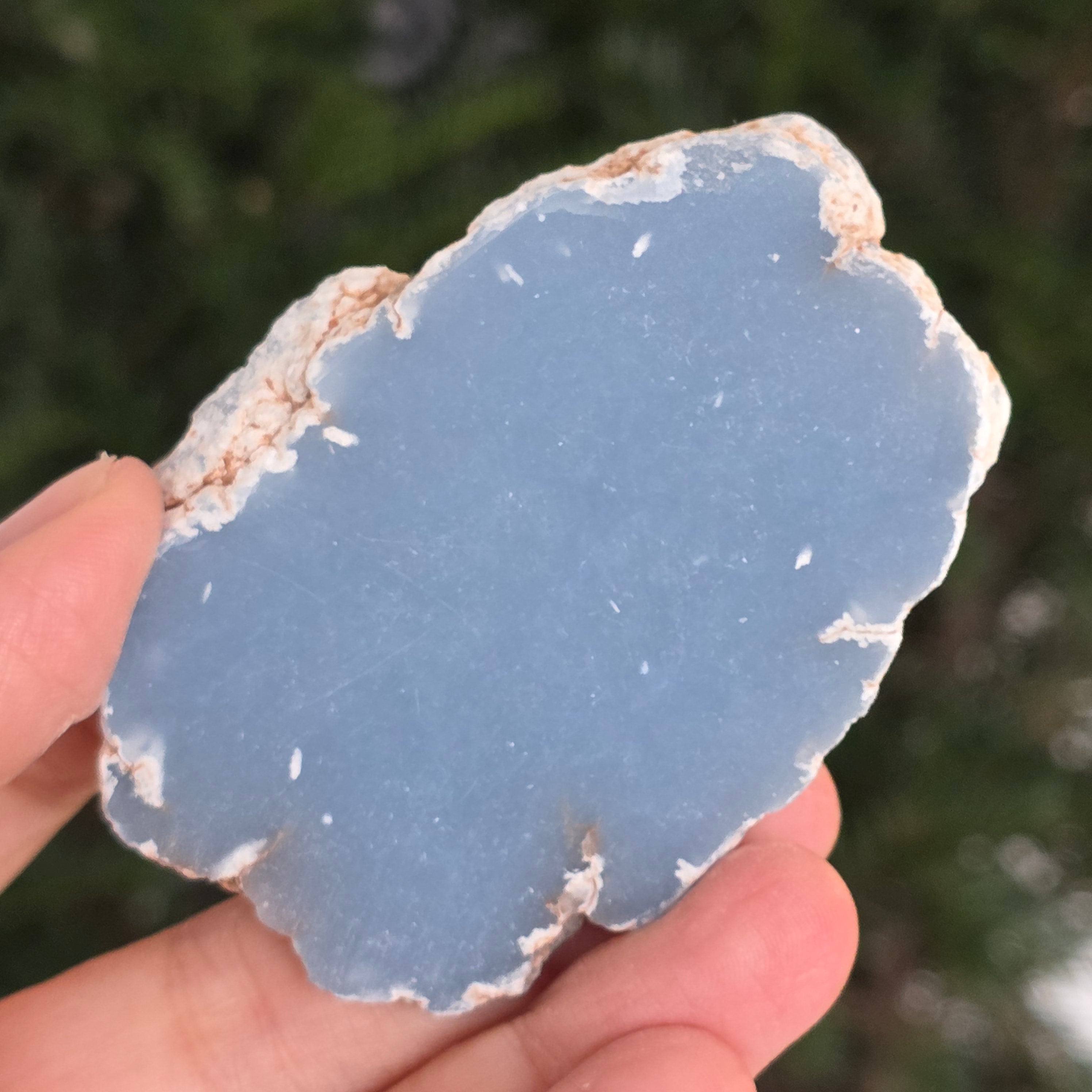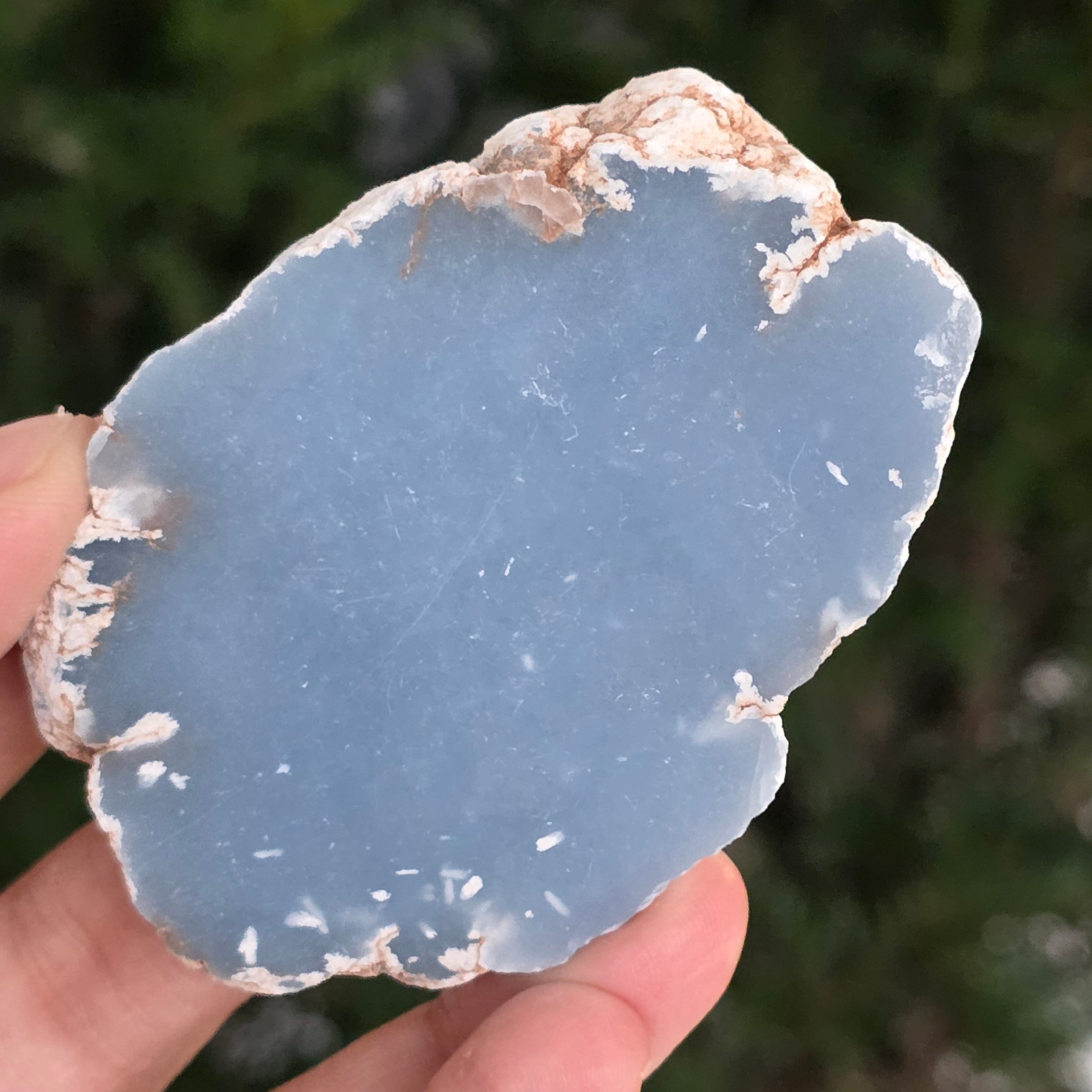 Egy ritka darab, mintha az égbolt kékjéből származna. Ez a természetes angelit szeletfinom, tejes kék színt tár fel, finom szürke és gyöngyházfehér árnyalatokkal. A sima felület és a matt textúra nyugalmat és tisztaságot sugároz – egy belső egyensúly és nyugalom ásványi ékszere.