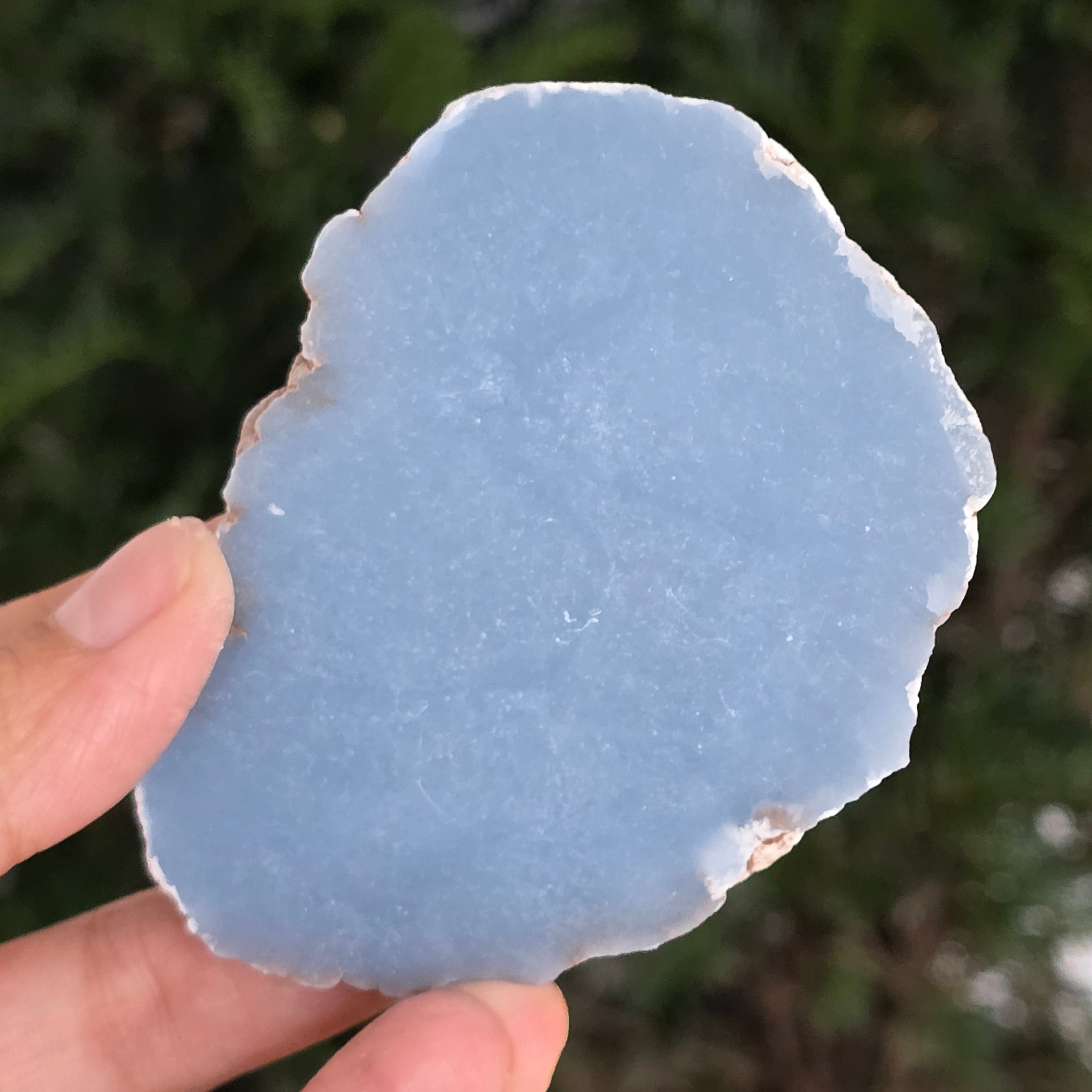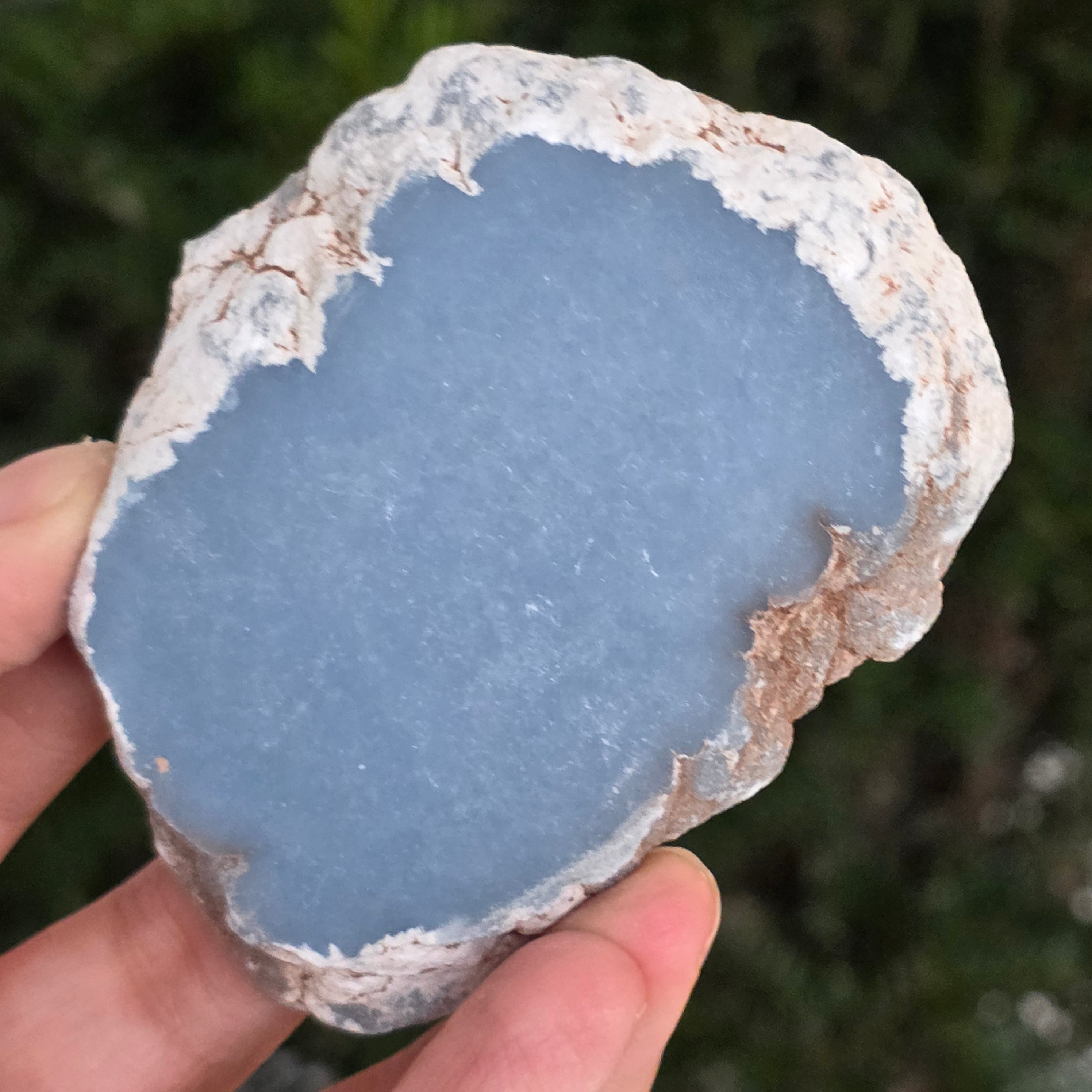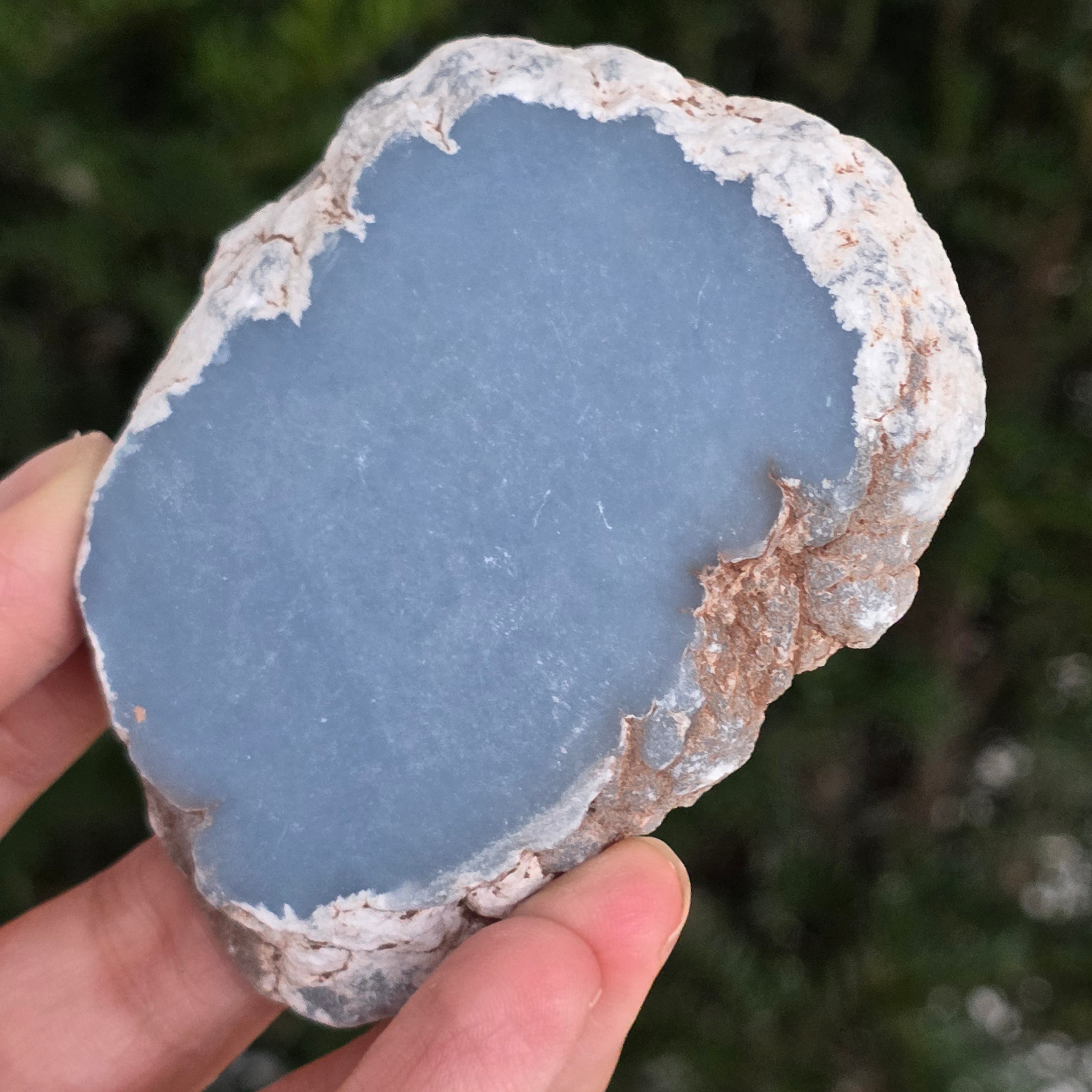 Egy ritka darab, amely mintha az ég tisztaságából származna. Ez a természetes angelit szeletfinom, tejkék színt tár fel, finom szürke és gyöngyházfehér árnyalatokkal. A sima felület és a matt textúra nyugalmat és tisztaságot sugároz – egy ásványi ékszer a belső békéhez és egyensúlyhoz.