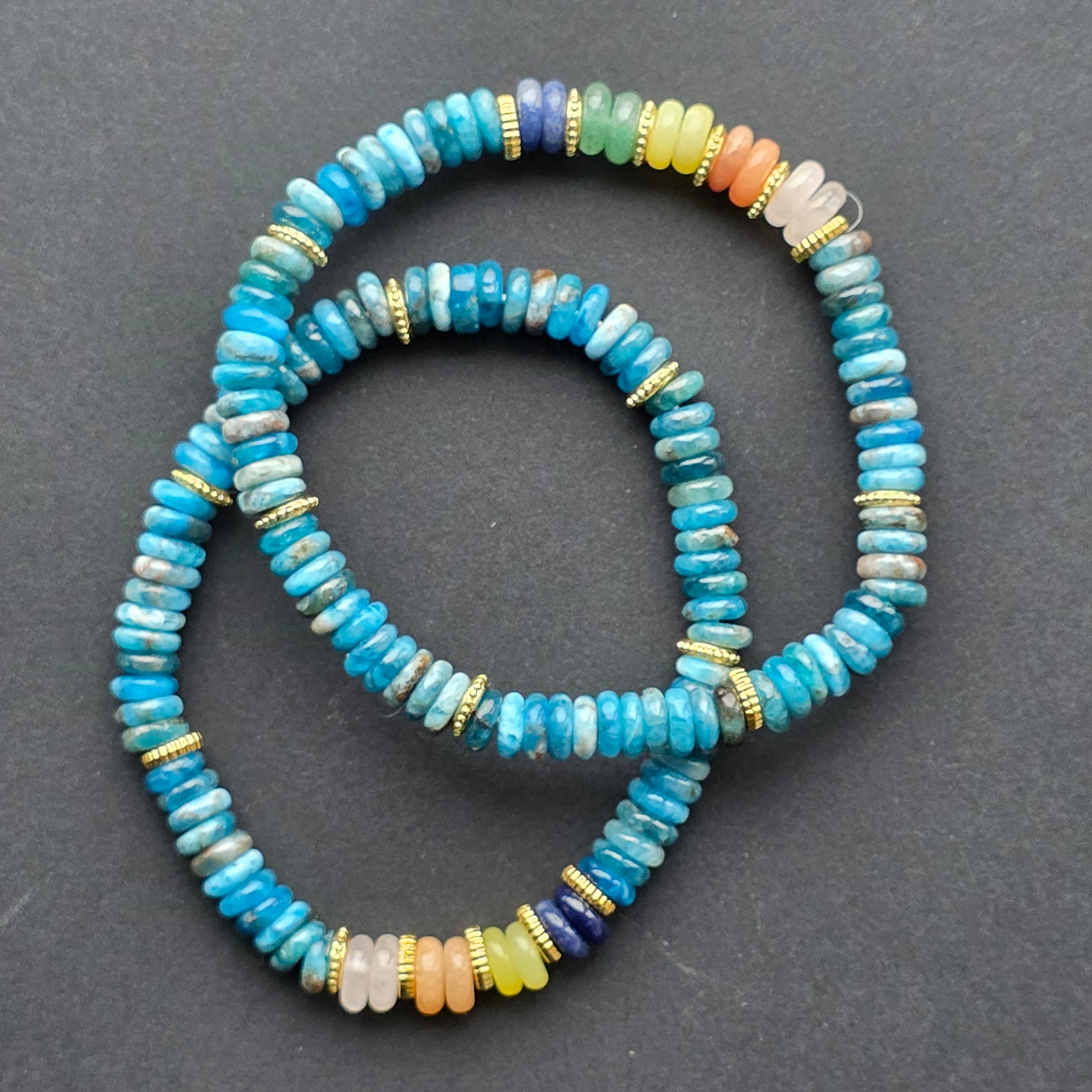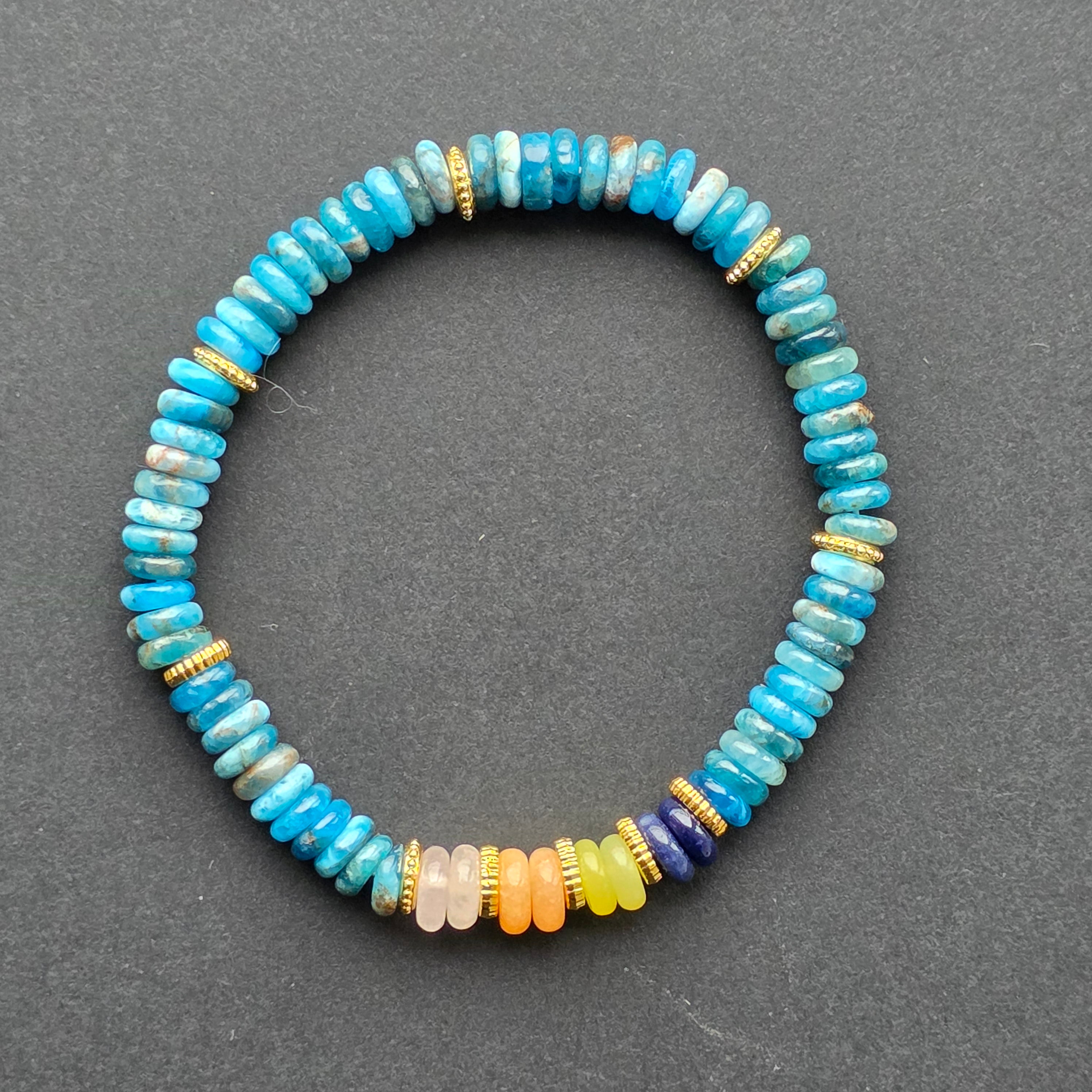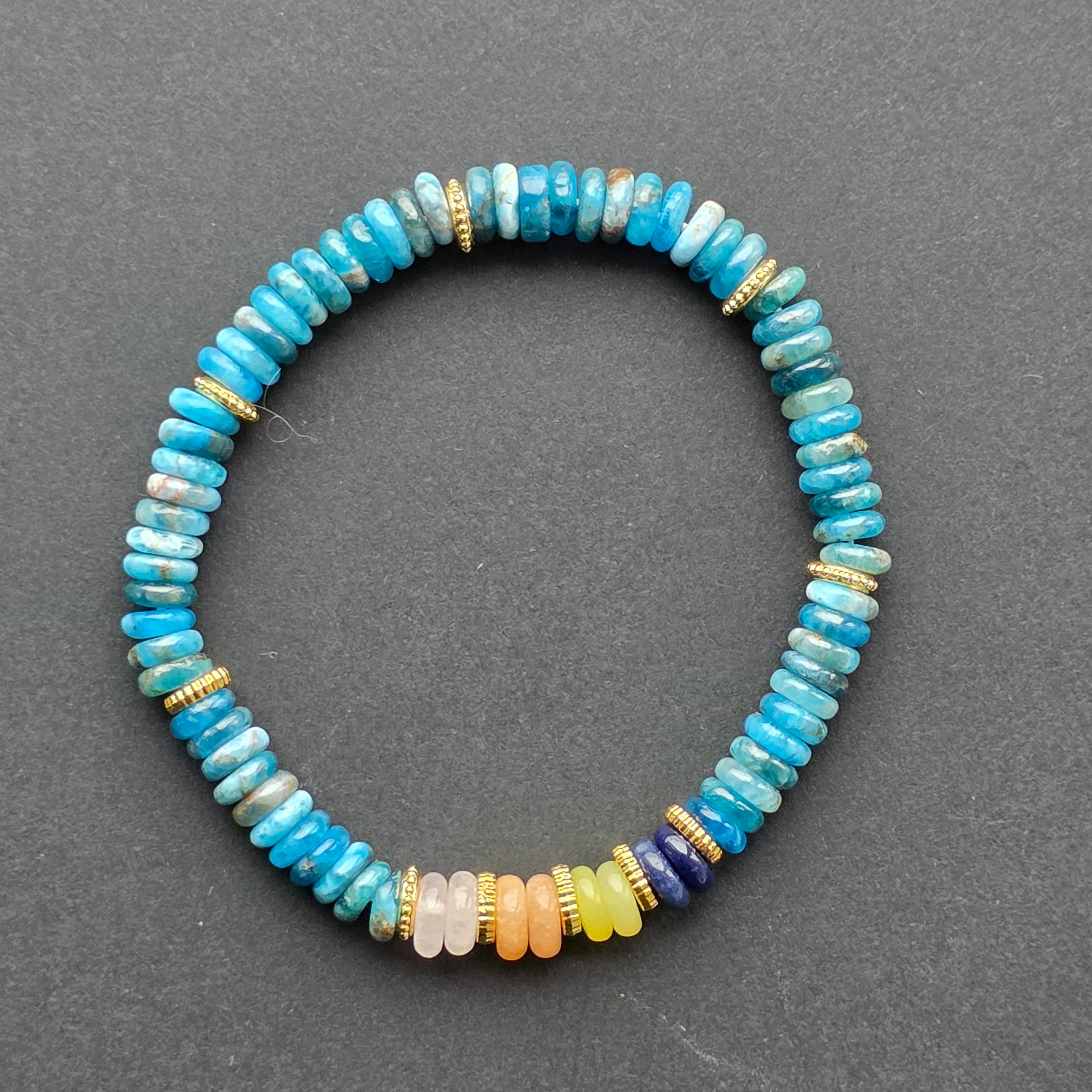 Az apatitot tiszta és inspiráló energiája miatt értékelik, és ebben a karkötőben frissességet és folyékonyságot sugárzó darabká válik. Az intenzív kék modern hangulatot kölcsönöz neki, könnyen viselhető minden nap, de kellően kifejező ahhoz, hogy kitűnjön.