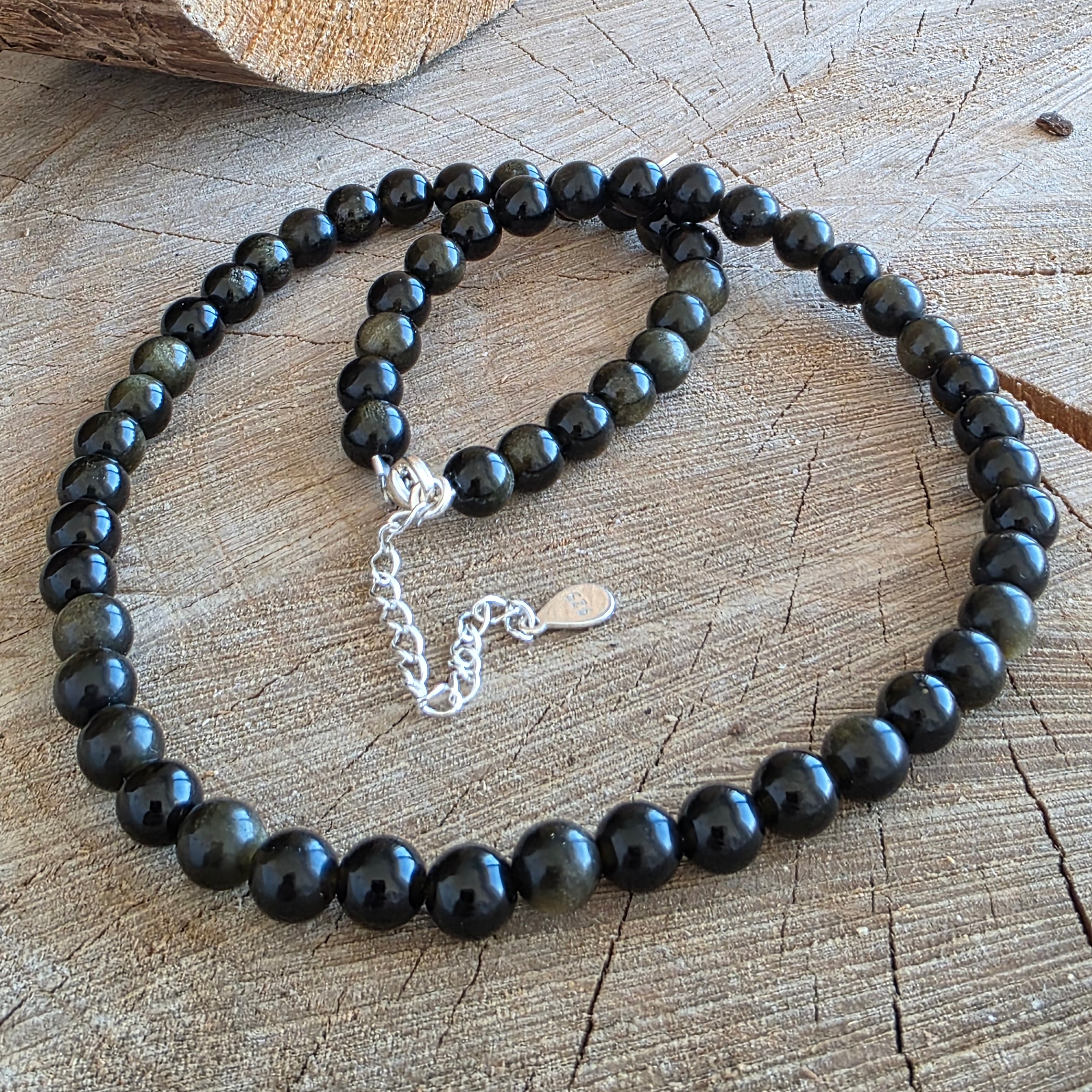 Egy finom és intenzív nyaklánc, 8 mm-es fekete obszidián gömbökből készült, amelyek egy finom, de jól definiált vonalat hoznak létre a nyak körül. A mély fekete szín diszkrét üvegfényével finom, szinte grafikus visszfényeket kap, modern és kiegyensúlyozott hatást kölcsönözve az ékszernek. A gyöngyök kicsi mérete megőrzi a minimalista dizájnt, kiemelve a forma tisztaságát és a vizuális világosságot.