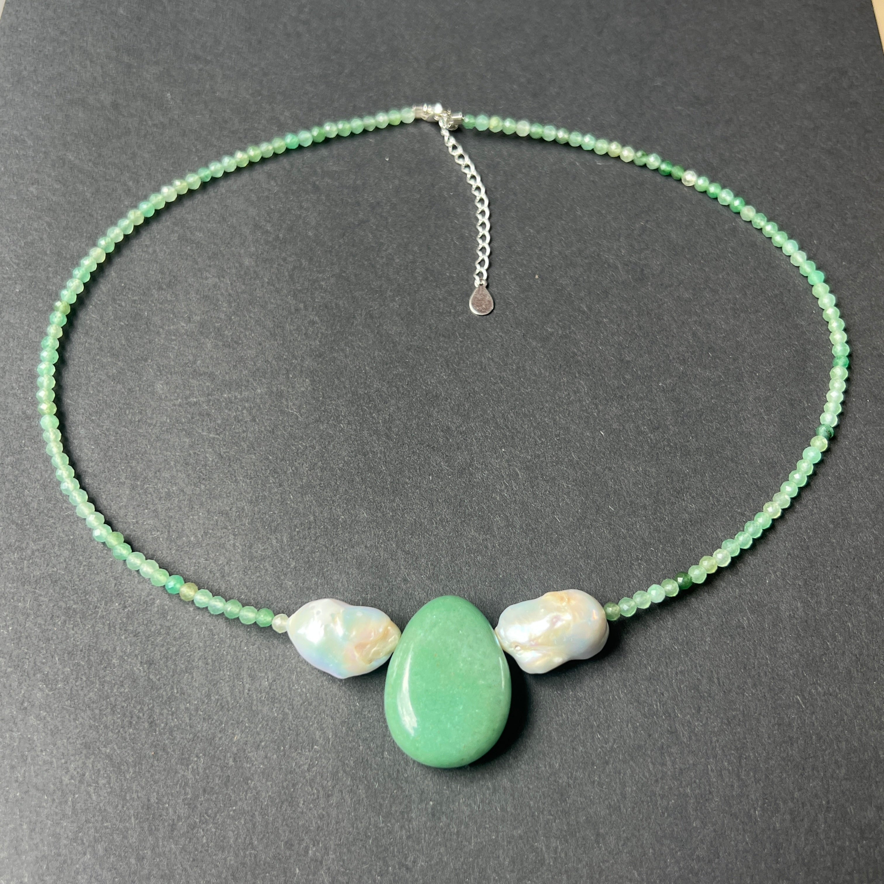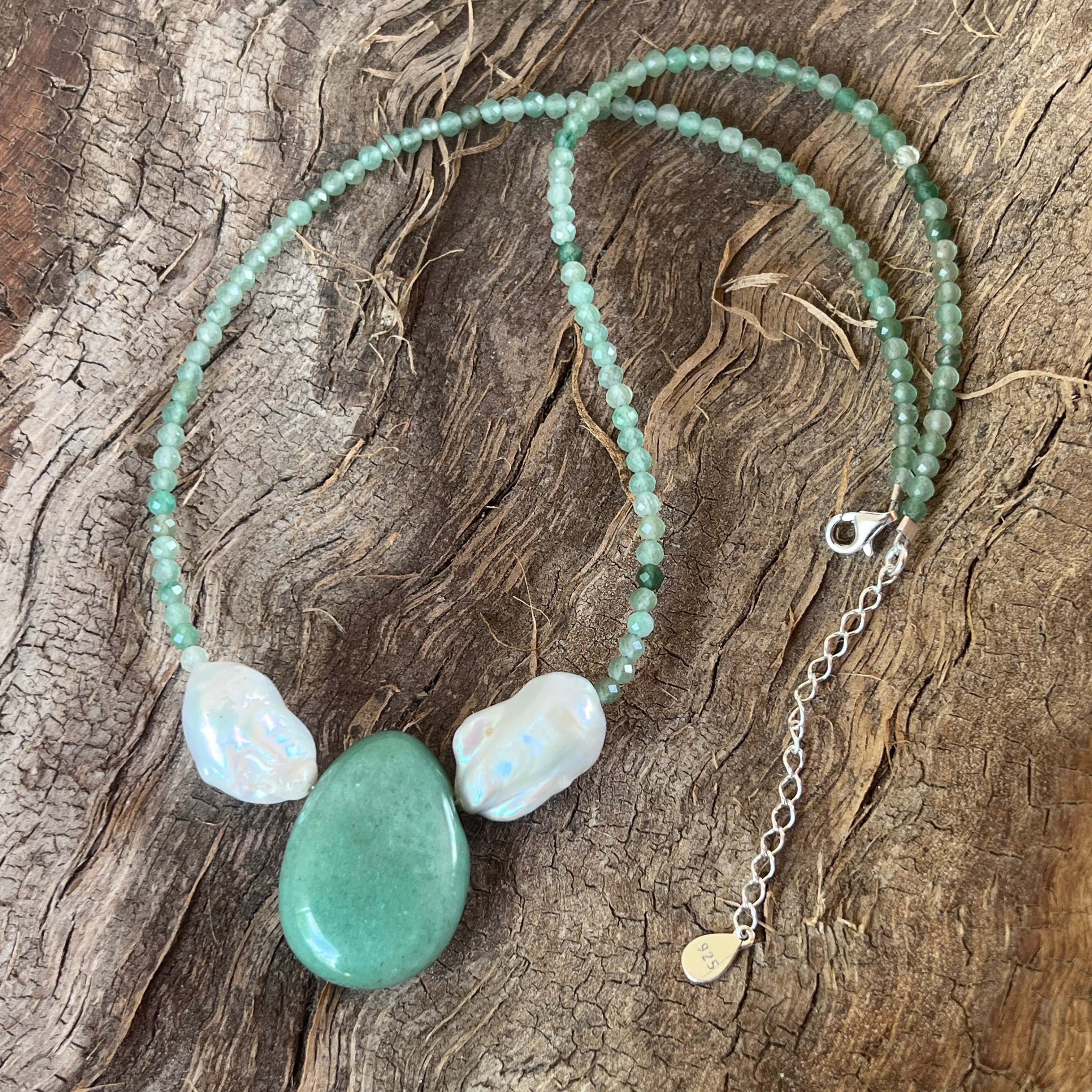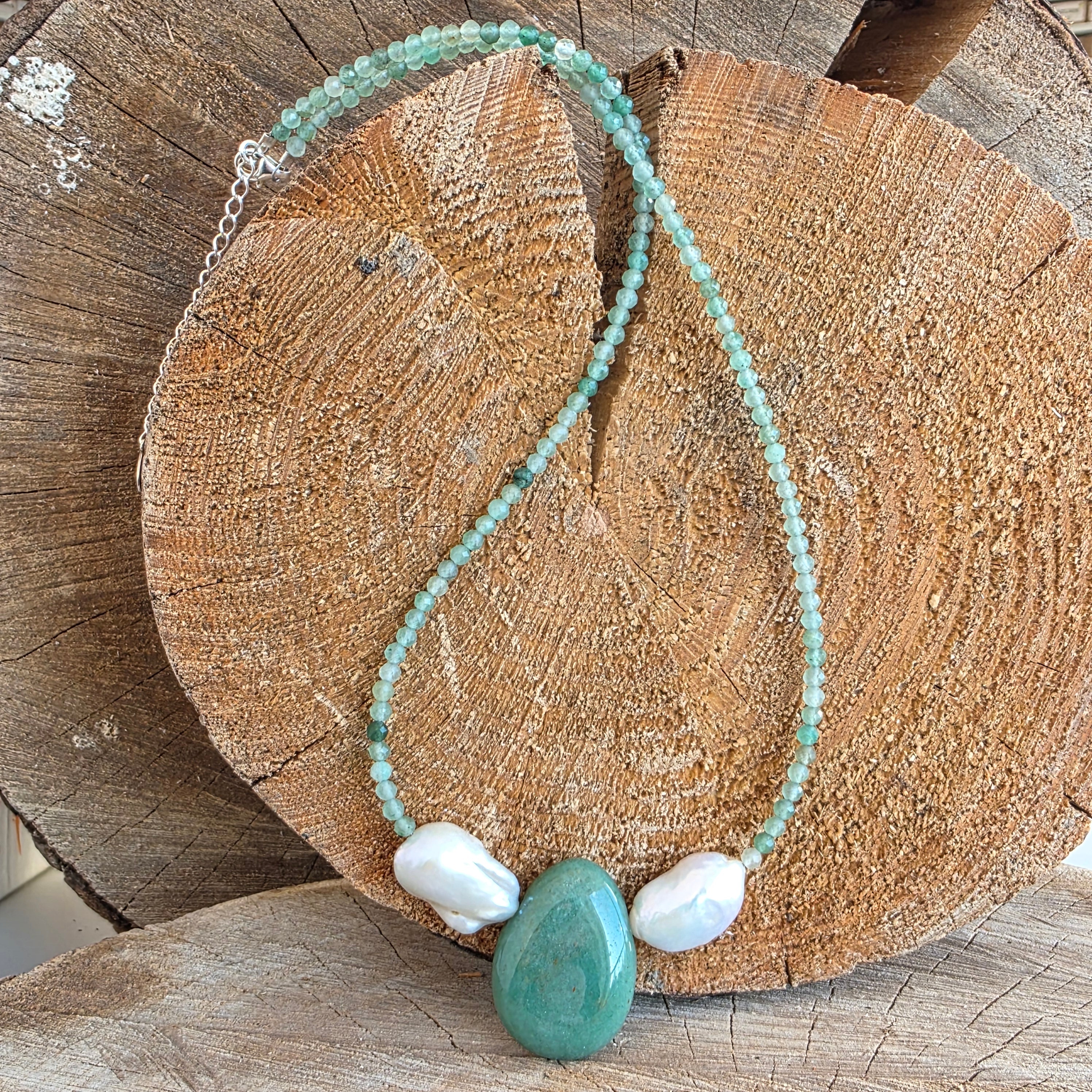 Az alkotás központjában egy 3 cm-es csepp alakú aventurin medál adja a súlyt és a szándékot, növekedés, szerencse és frissesség rezgését hozva magával. Két természetes gyöngy kiemeli az eleganciát, összekapcsolva a földet a vízzel, az értelemet az intuícióval, a nőiességet az élet zöld erejével.
