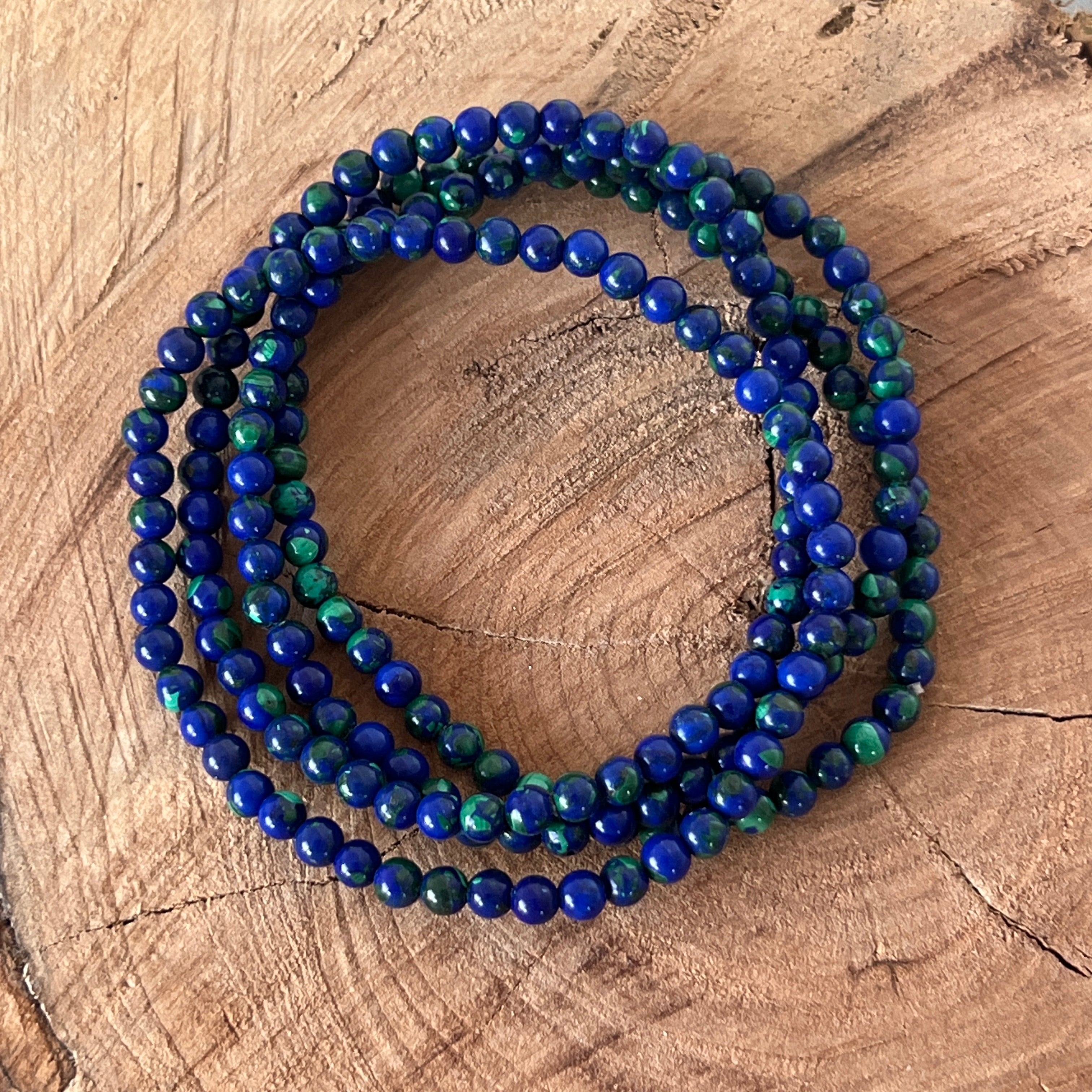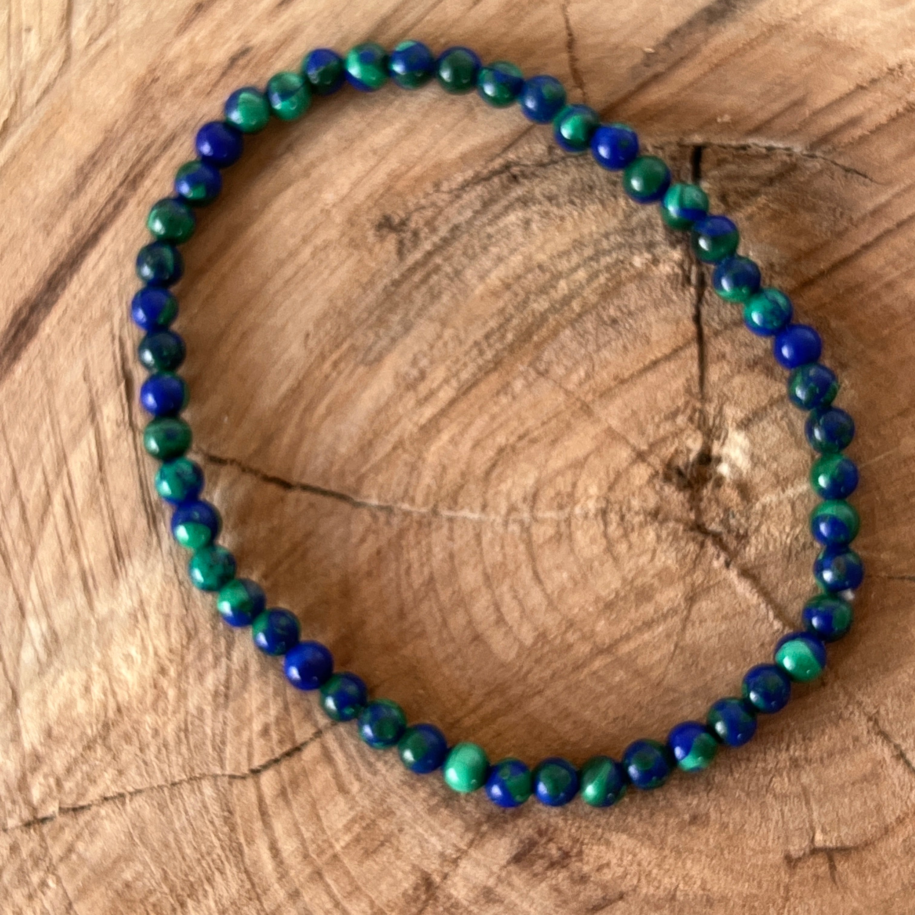 Ez az extra azurit és malachit karkötő a változás és az egyensúly két drágakövét kombinálja. Az azurit mély kék árnyalataival ismert szellemi tisztaság és intuíció kövének, míg a malachit intenzív zöldjével a védelem, átalakulás és a szív megnyitása.