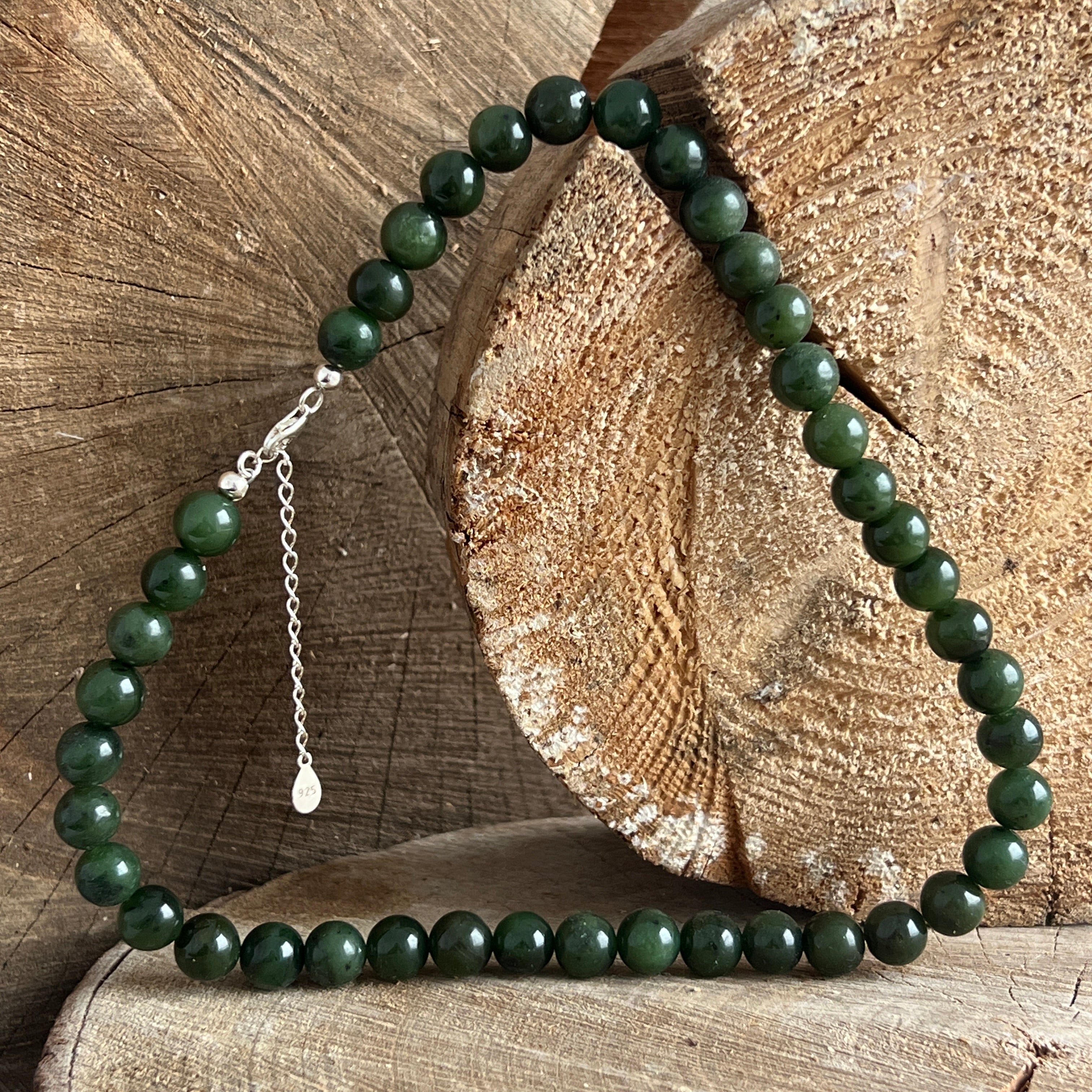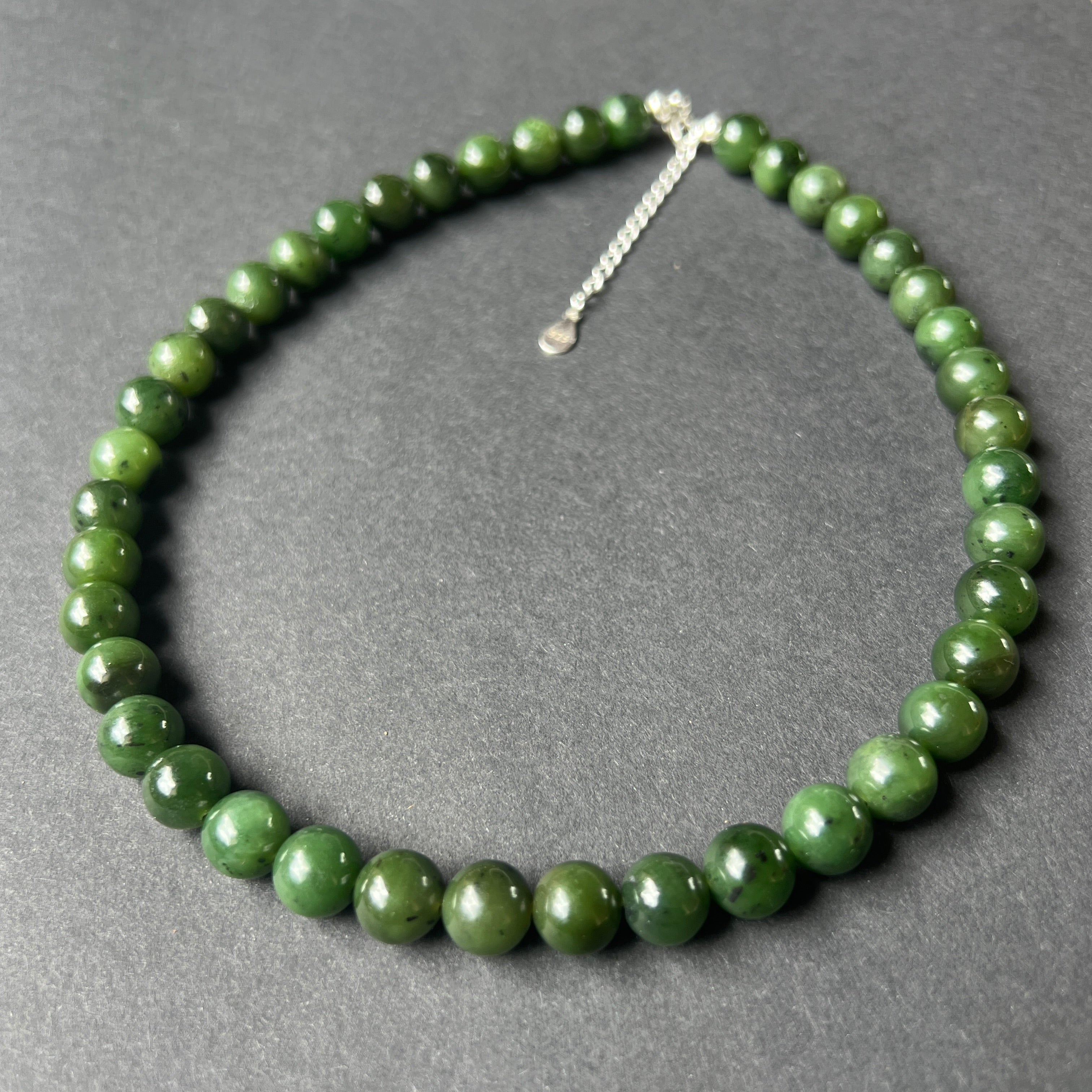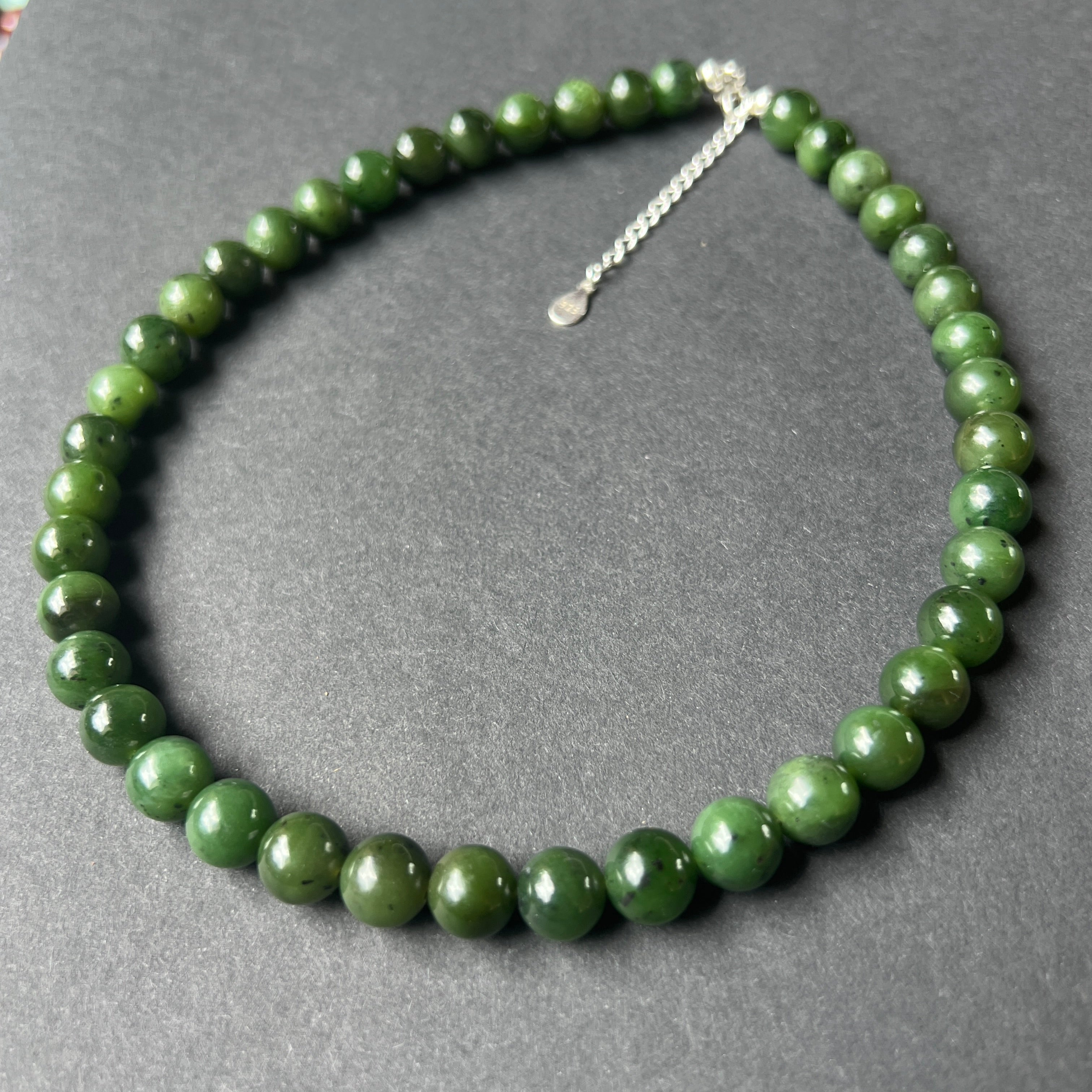 Egy jelenléttel, erővel és csendes nemességgel bíró nyaklánc – 10 mm-es, gömbölyű zöld nefrit jade gyöngyökből készült, amelyek mindegyike a természet és a hagyomány nyugodt leheletét hordozza magában.